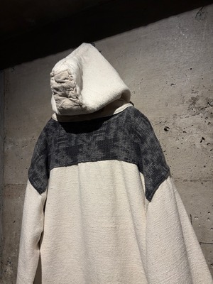 柔らかな生成りのボディに、切り替えを効かせたプルオーバーフーディ。