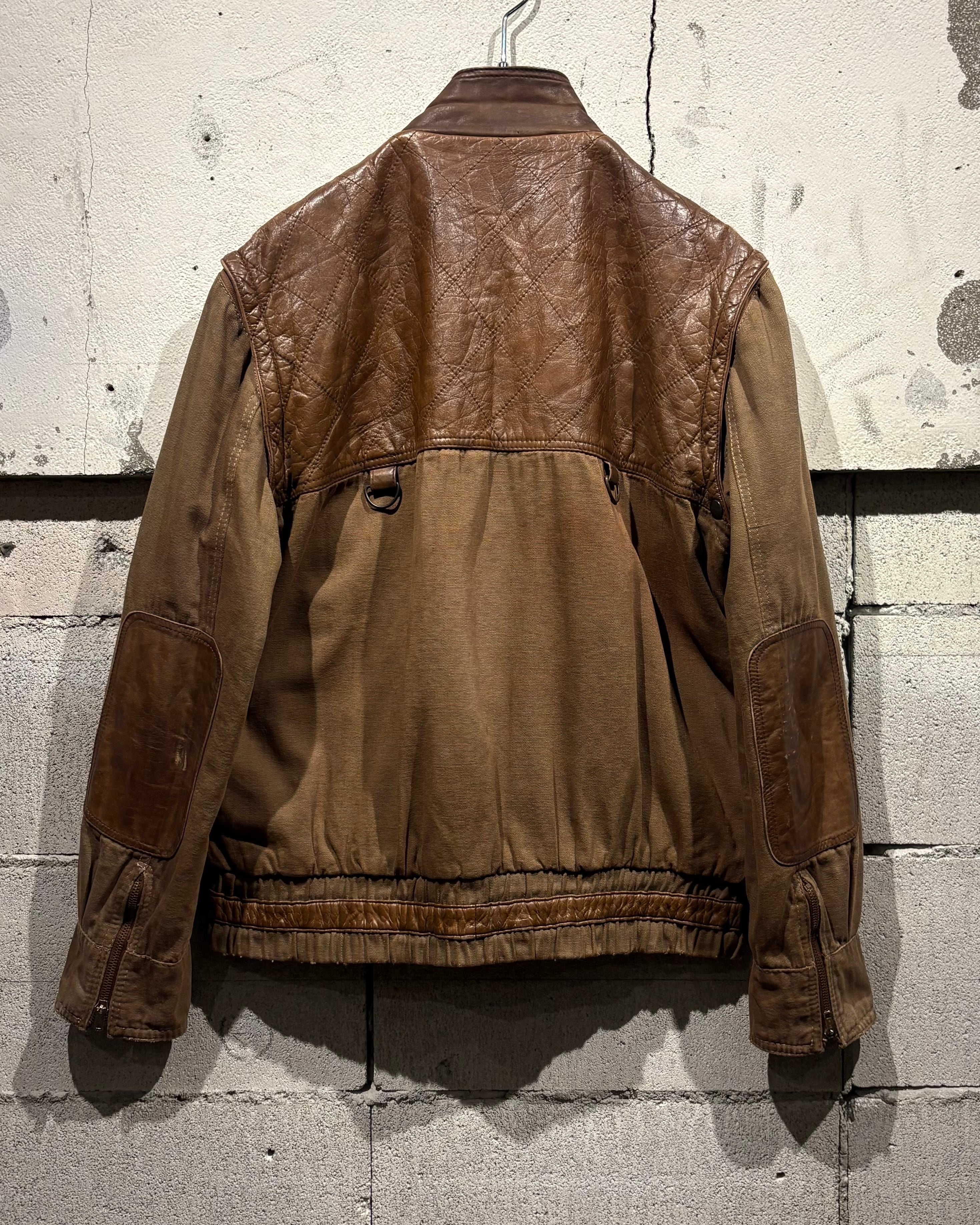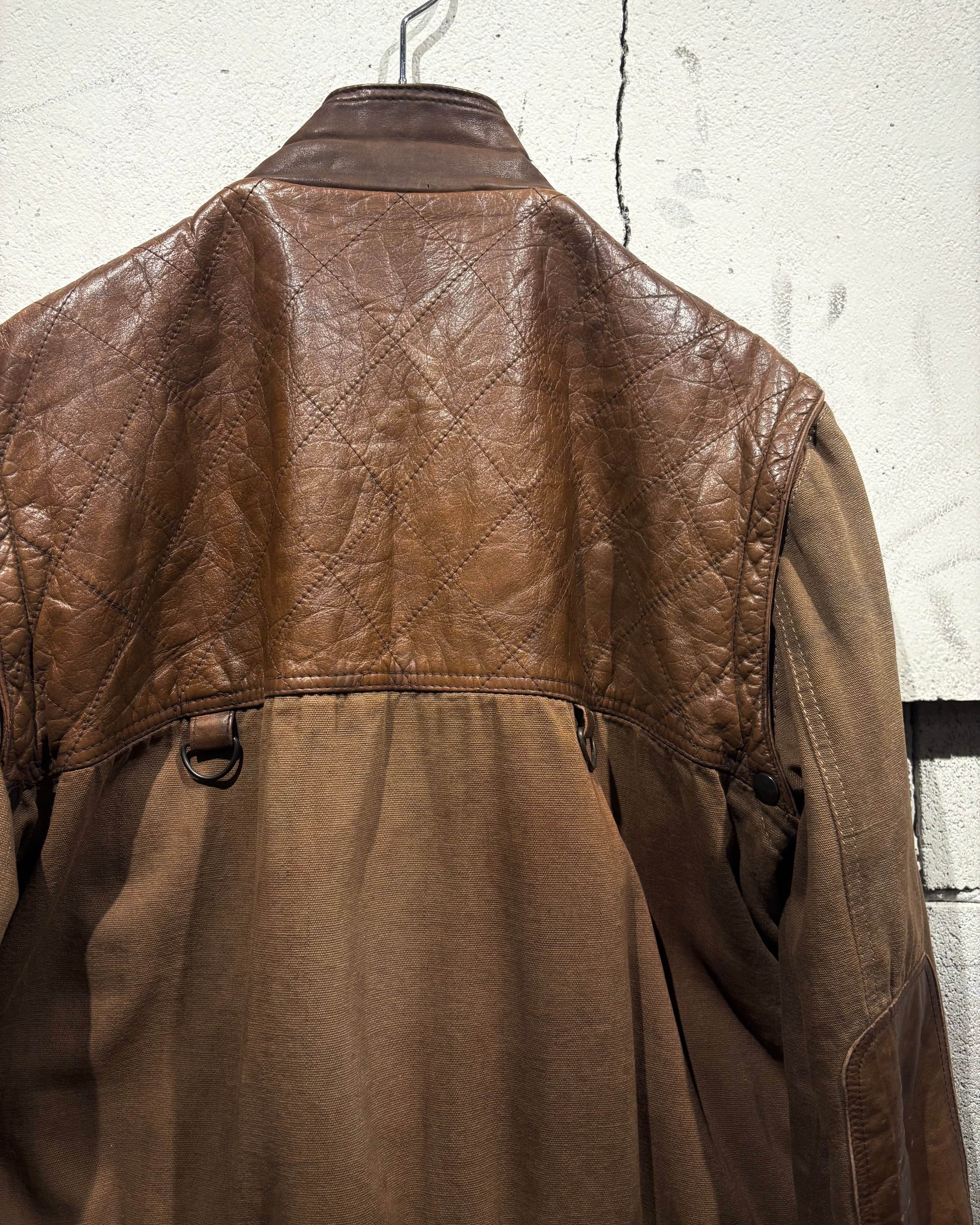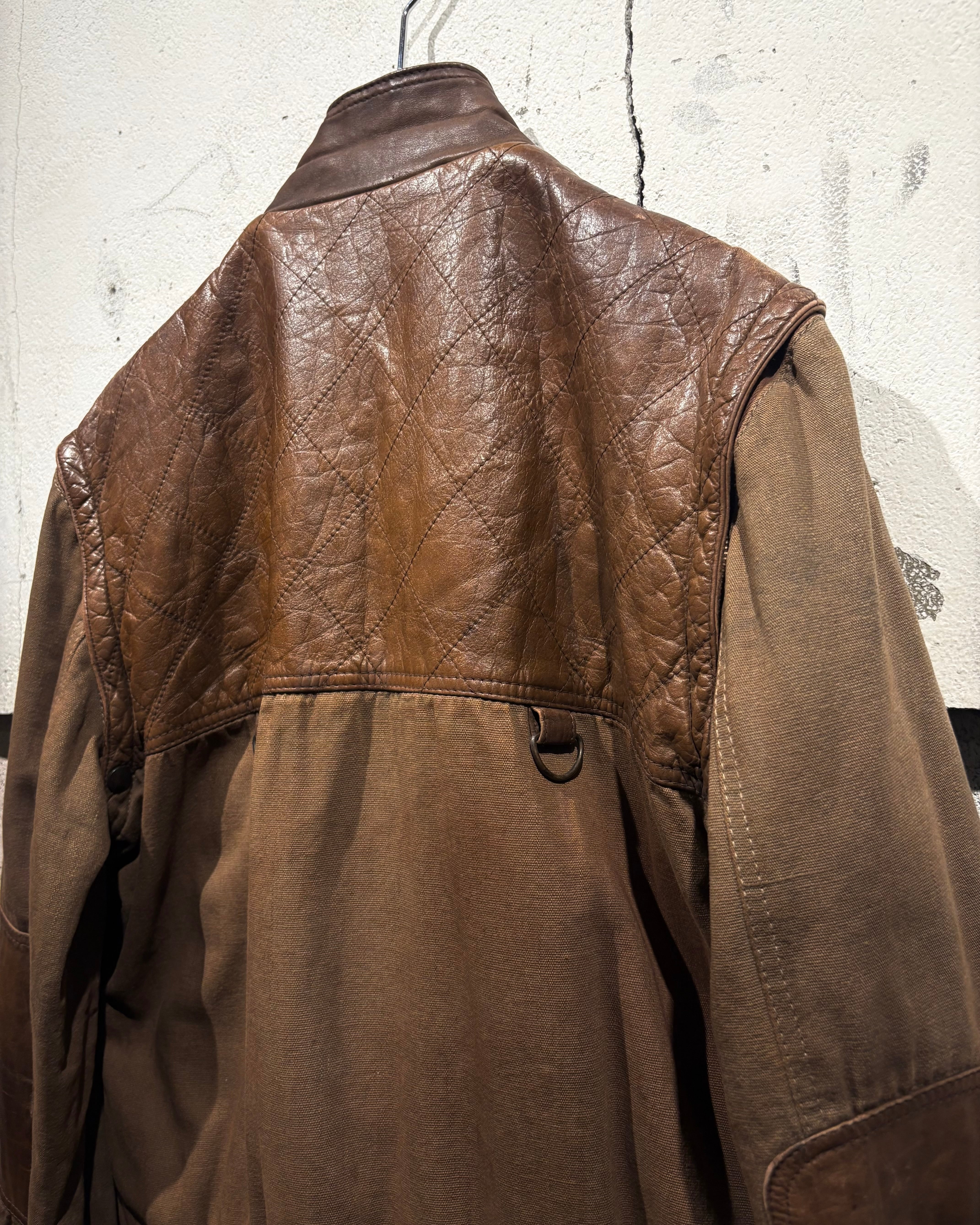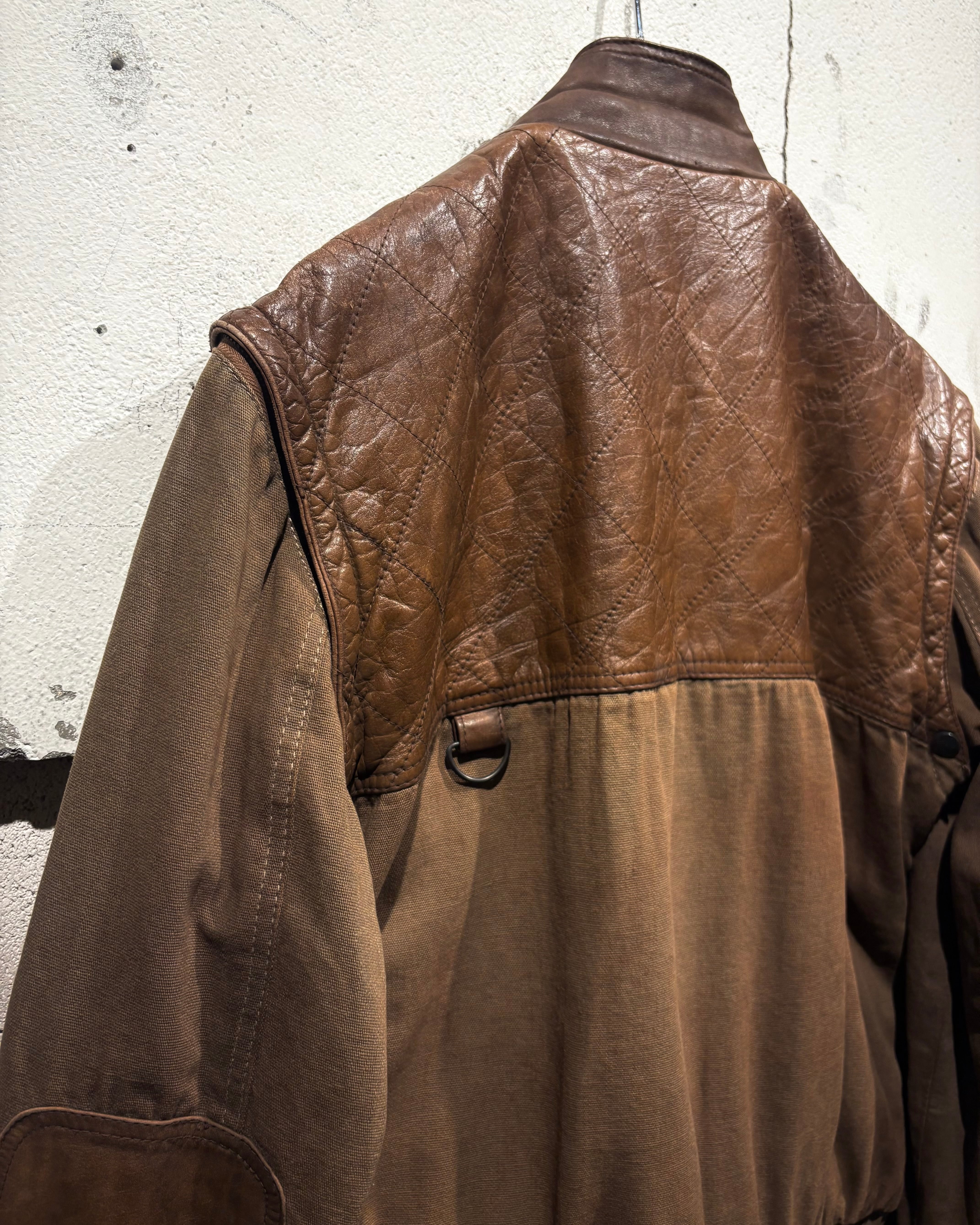 ハリのあるブラウンボディにレザーを大胆に切り替えた、ハンティングモチーフのジャケット。