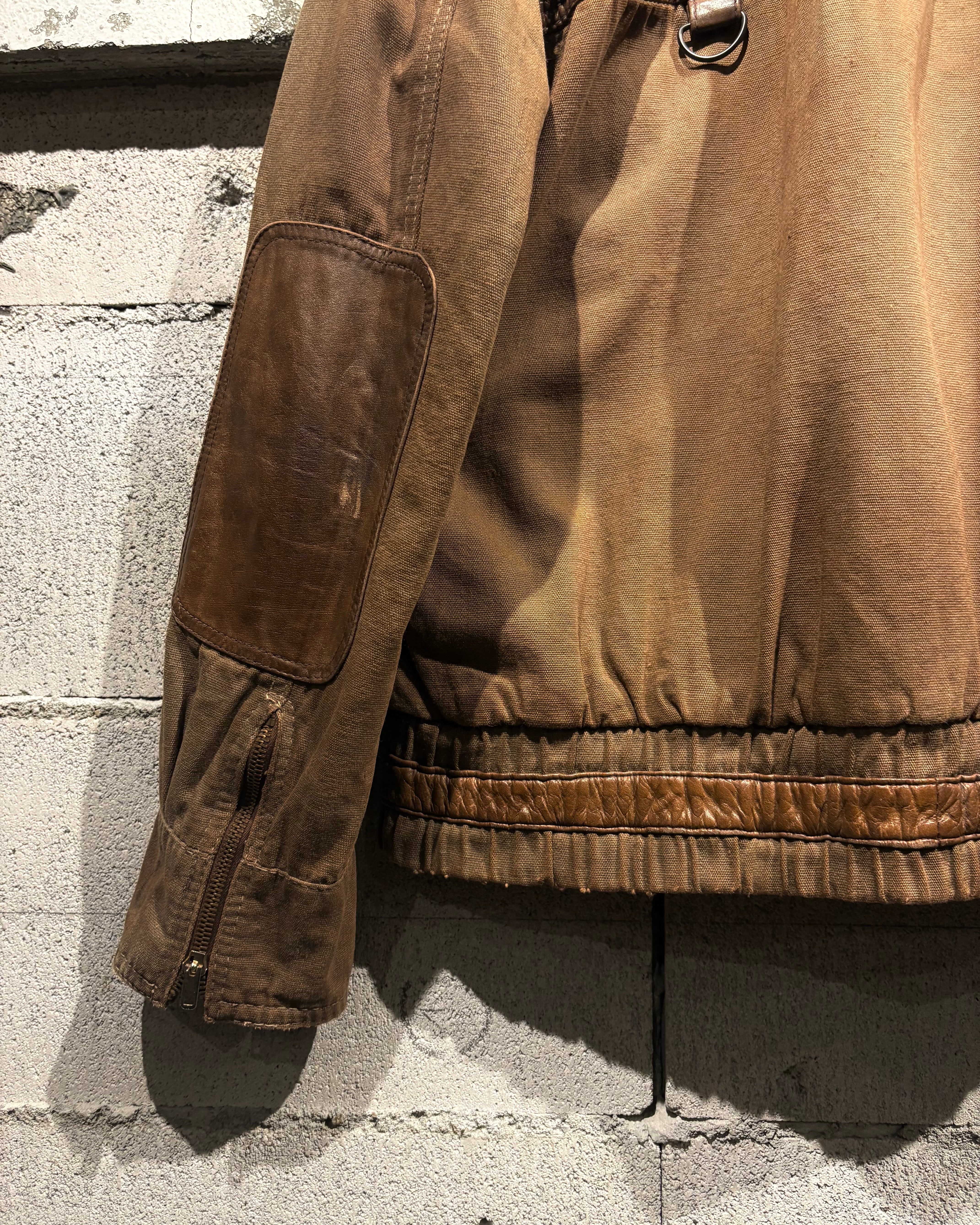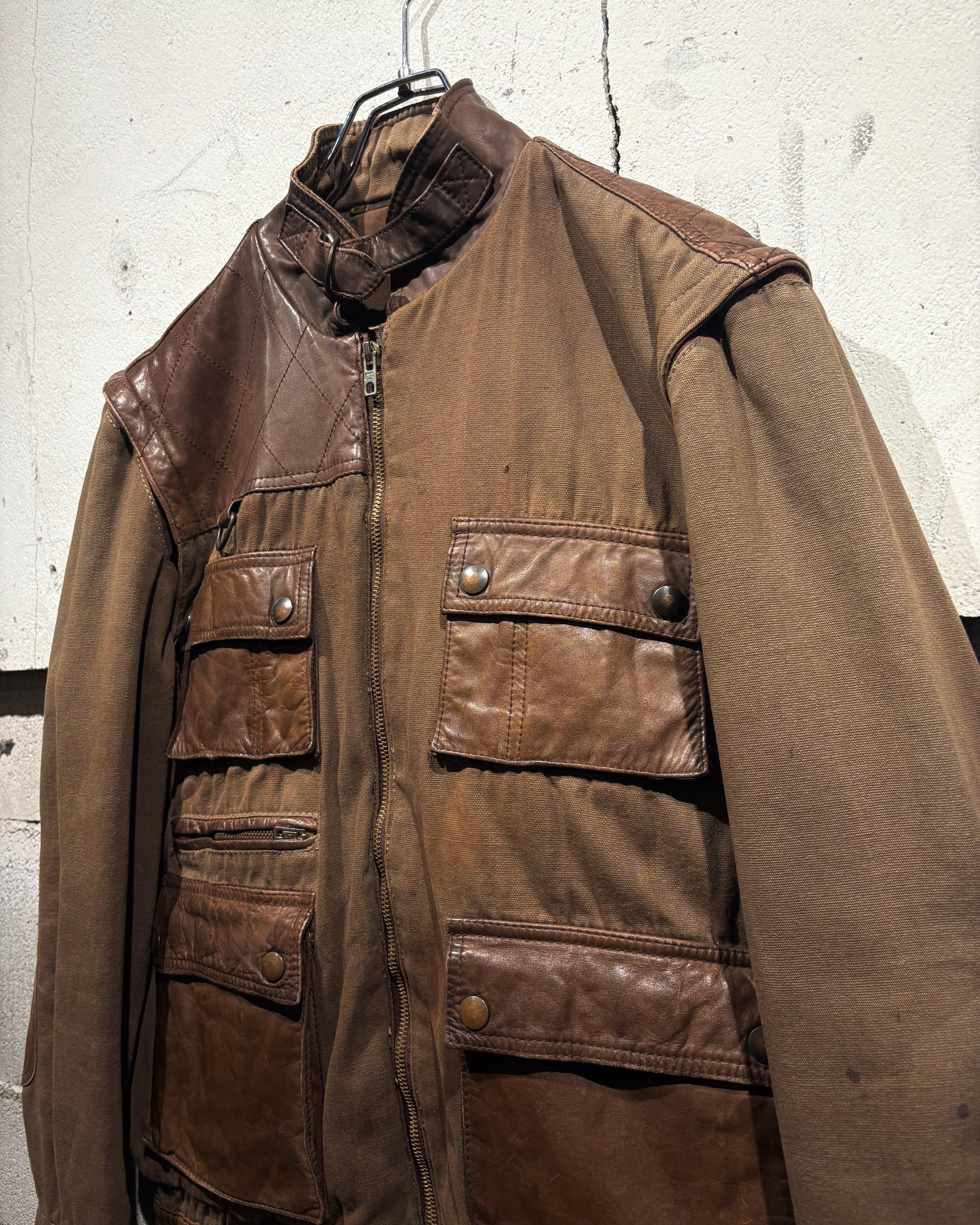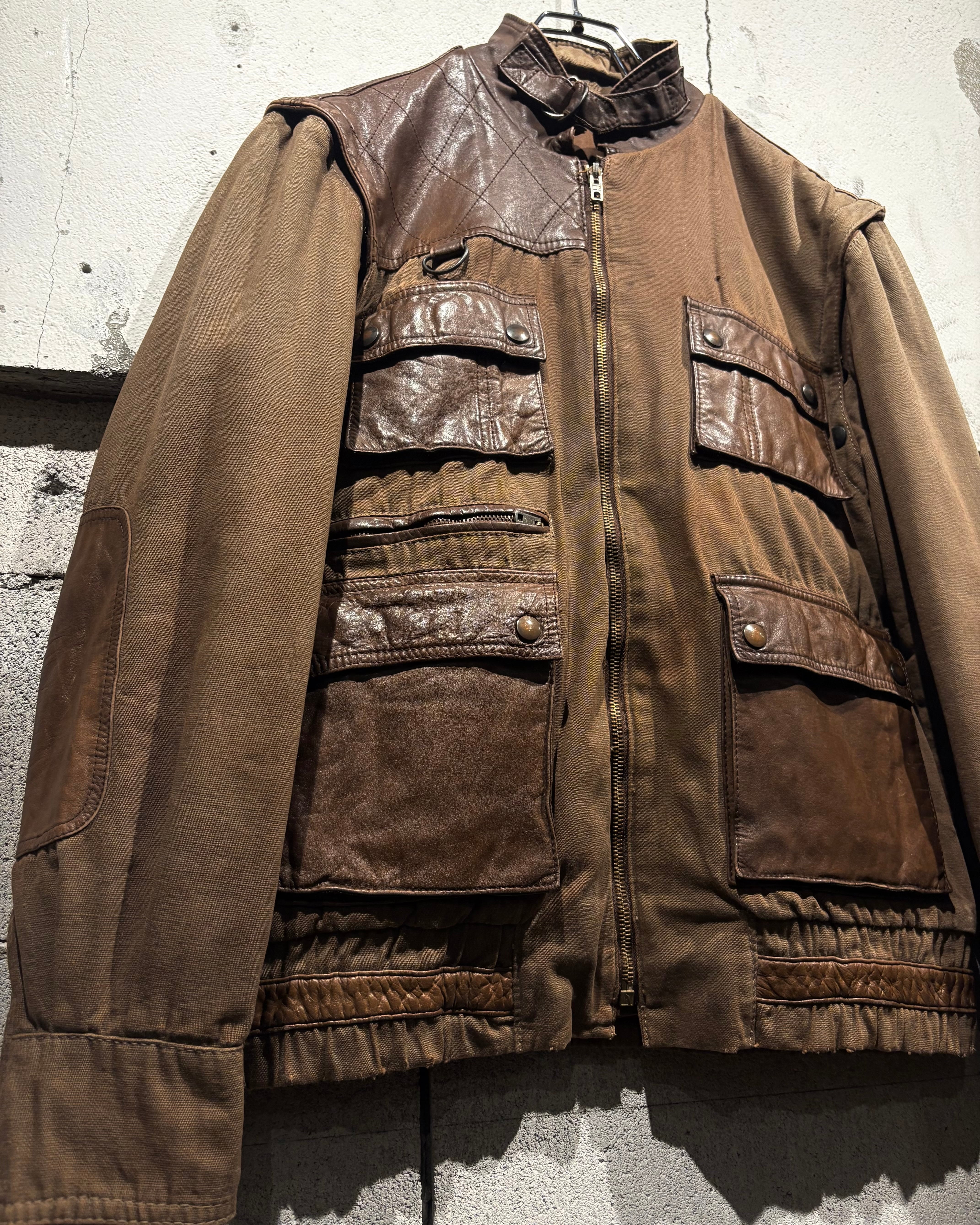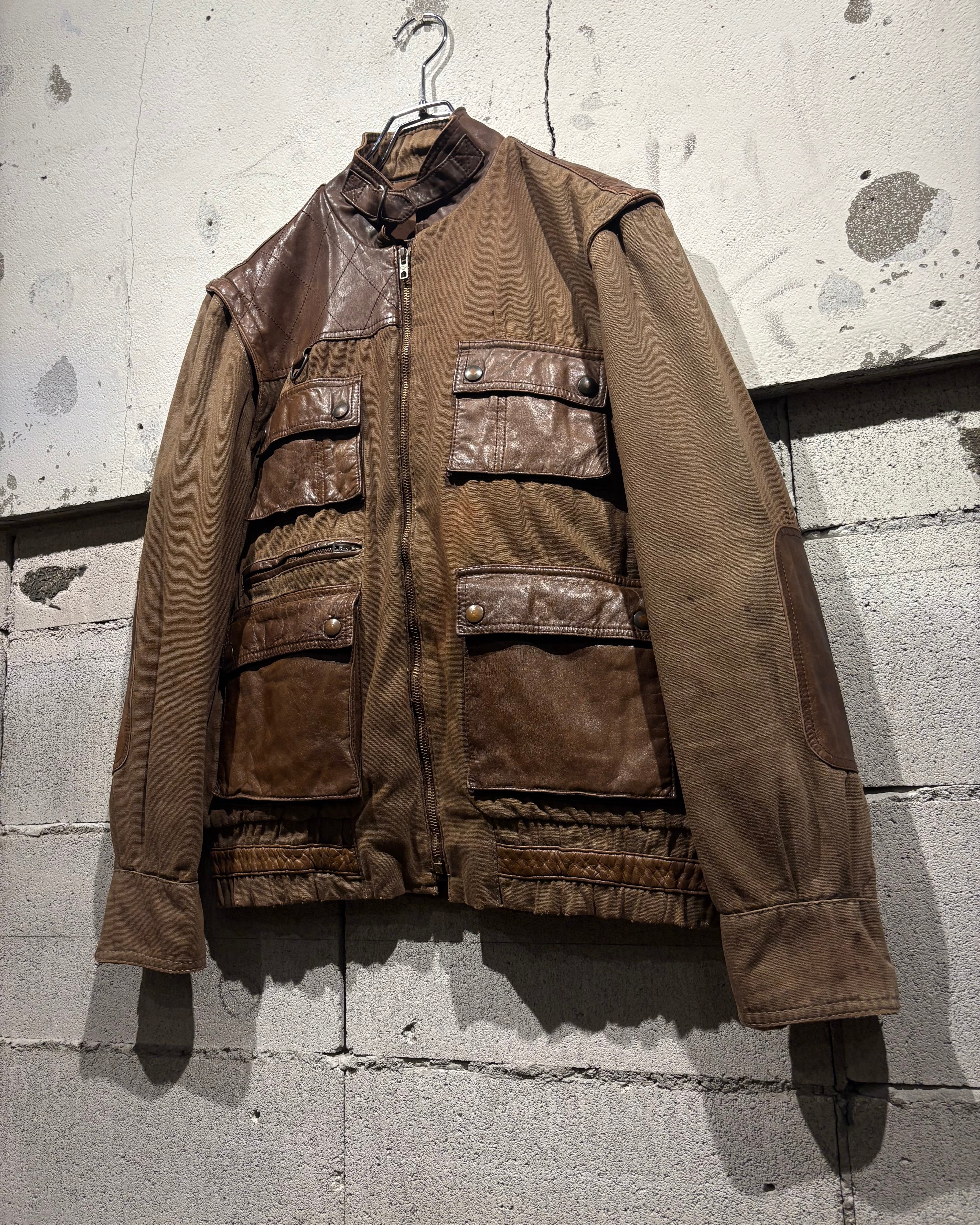ハリのあるブラウンボディにレザーを大胆に切り替えた、ハンティングモチーフのジャケット。