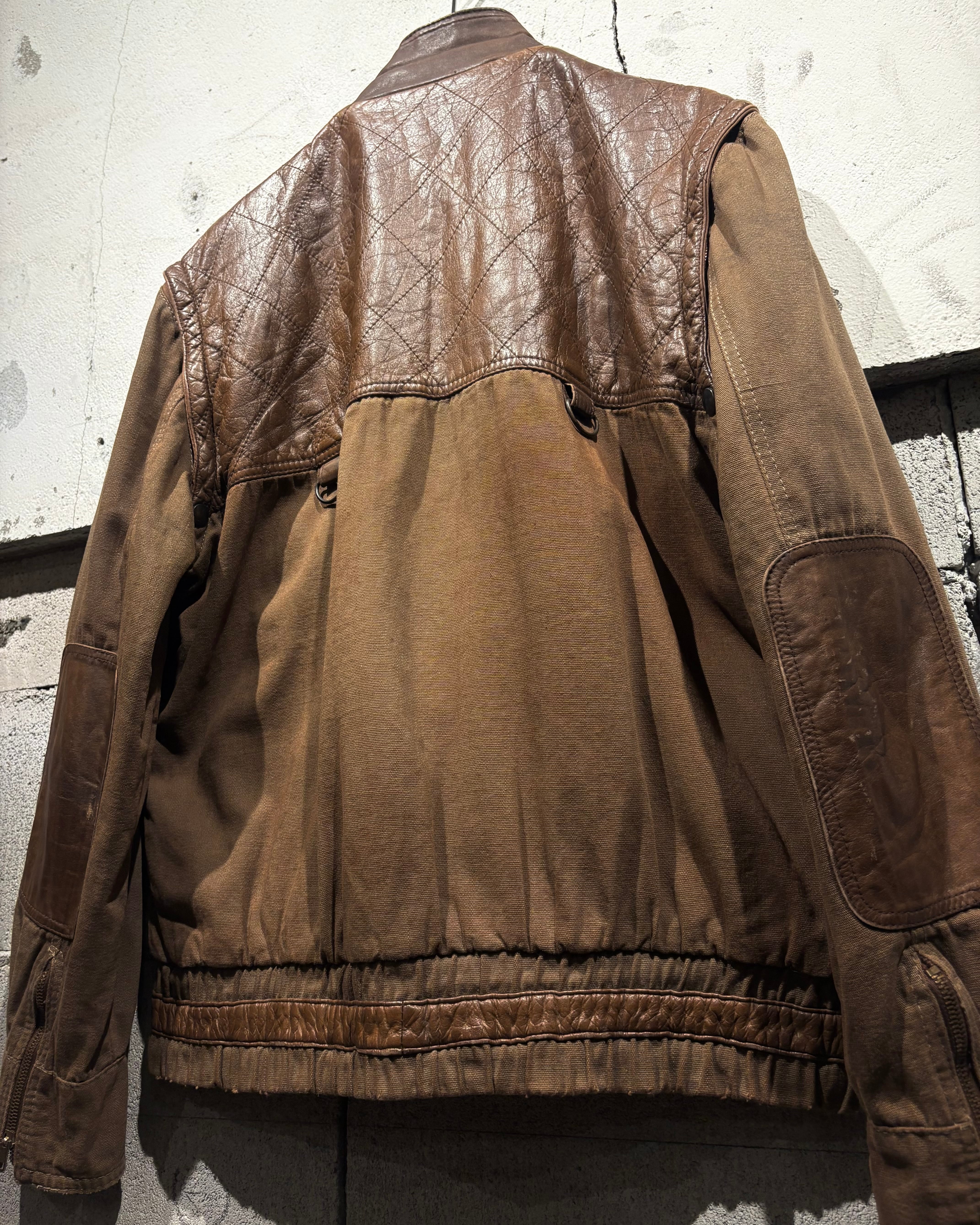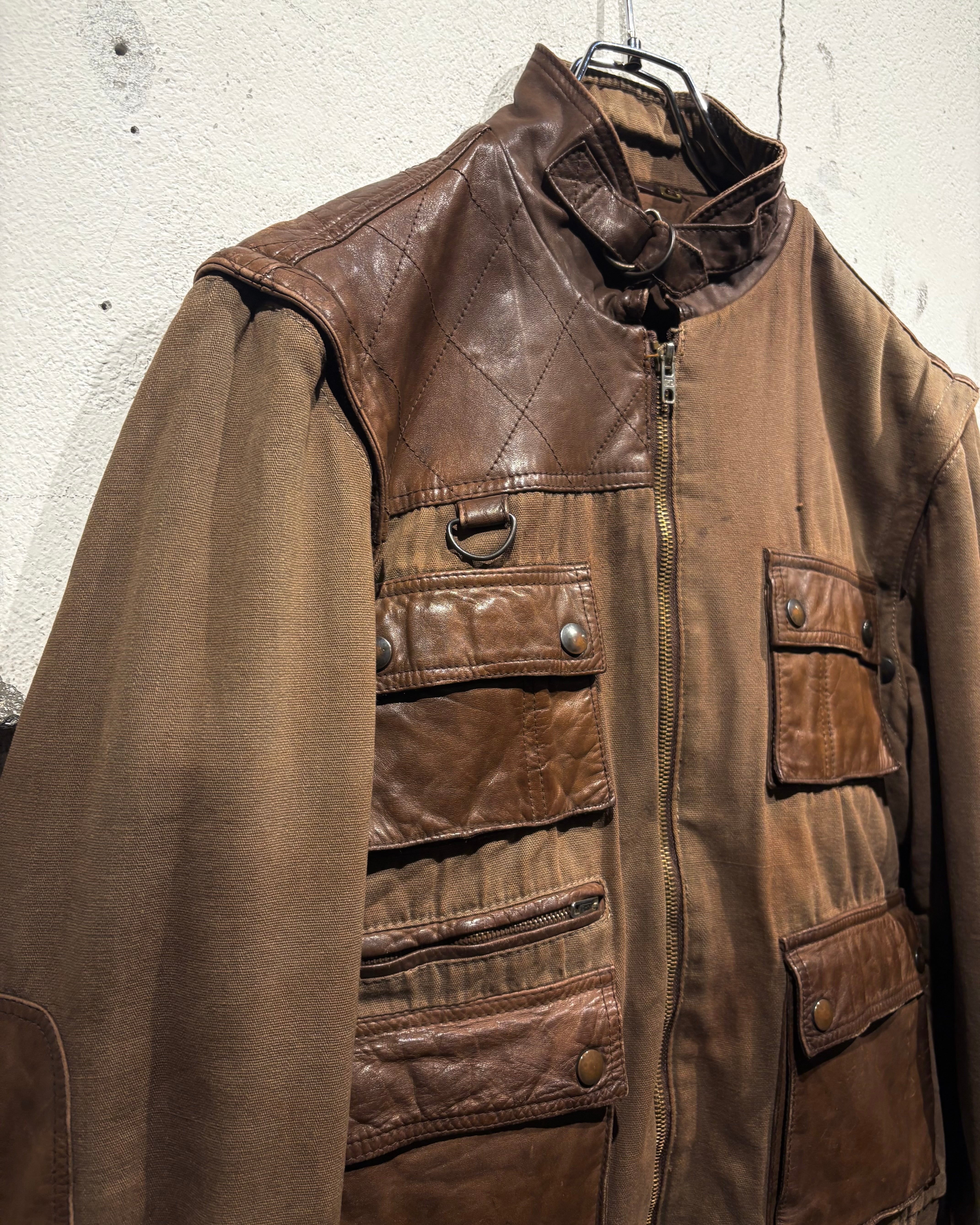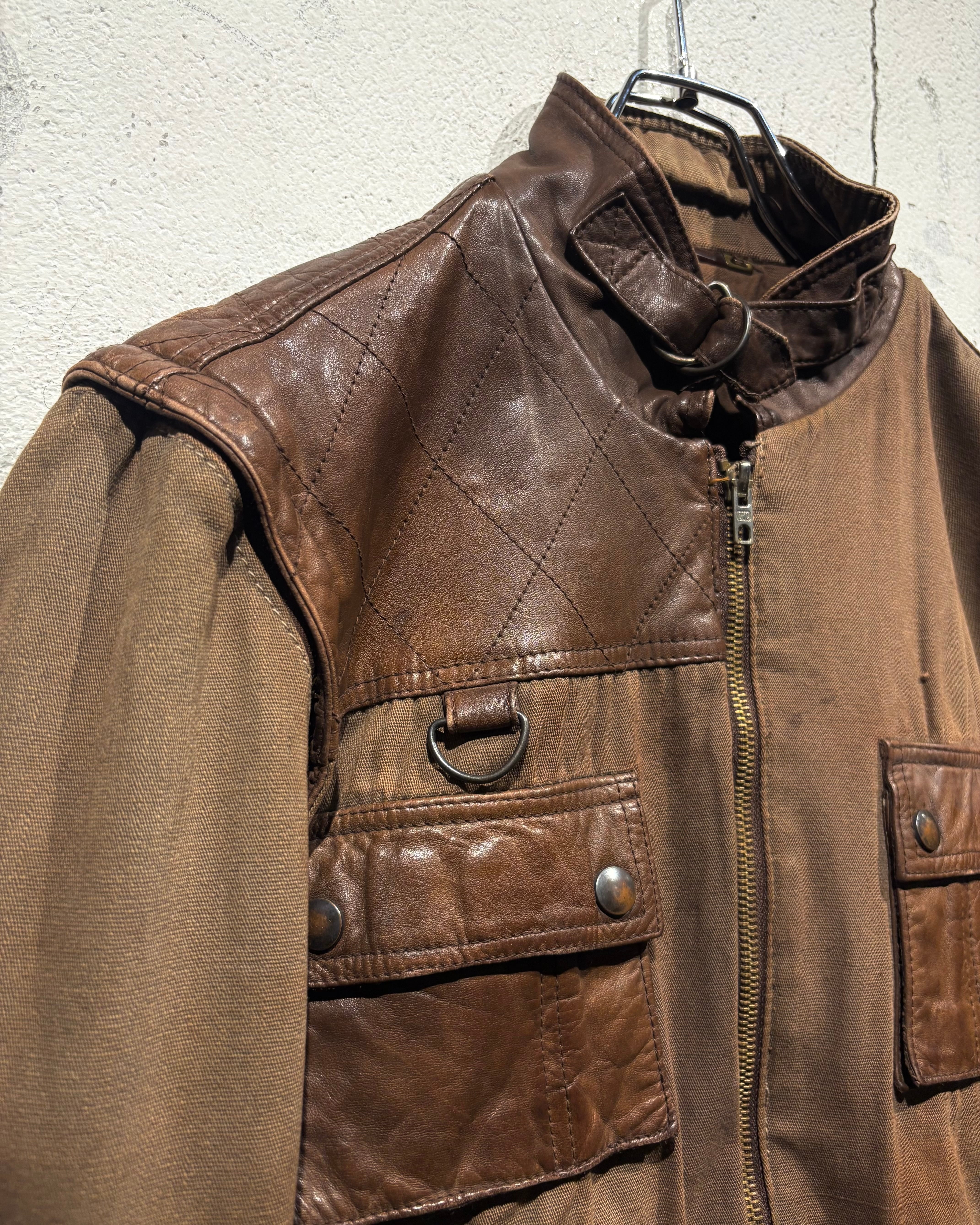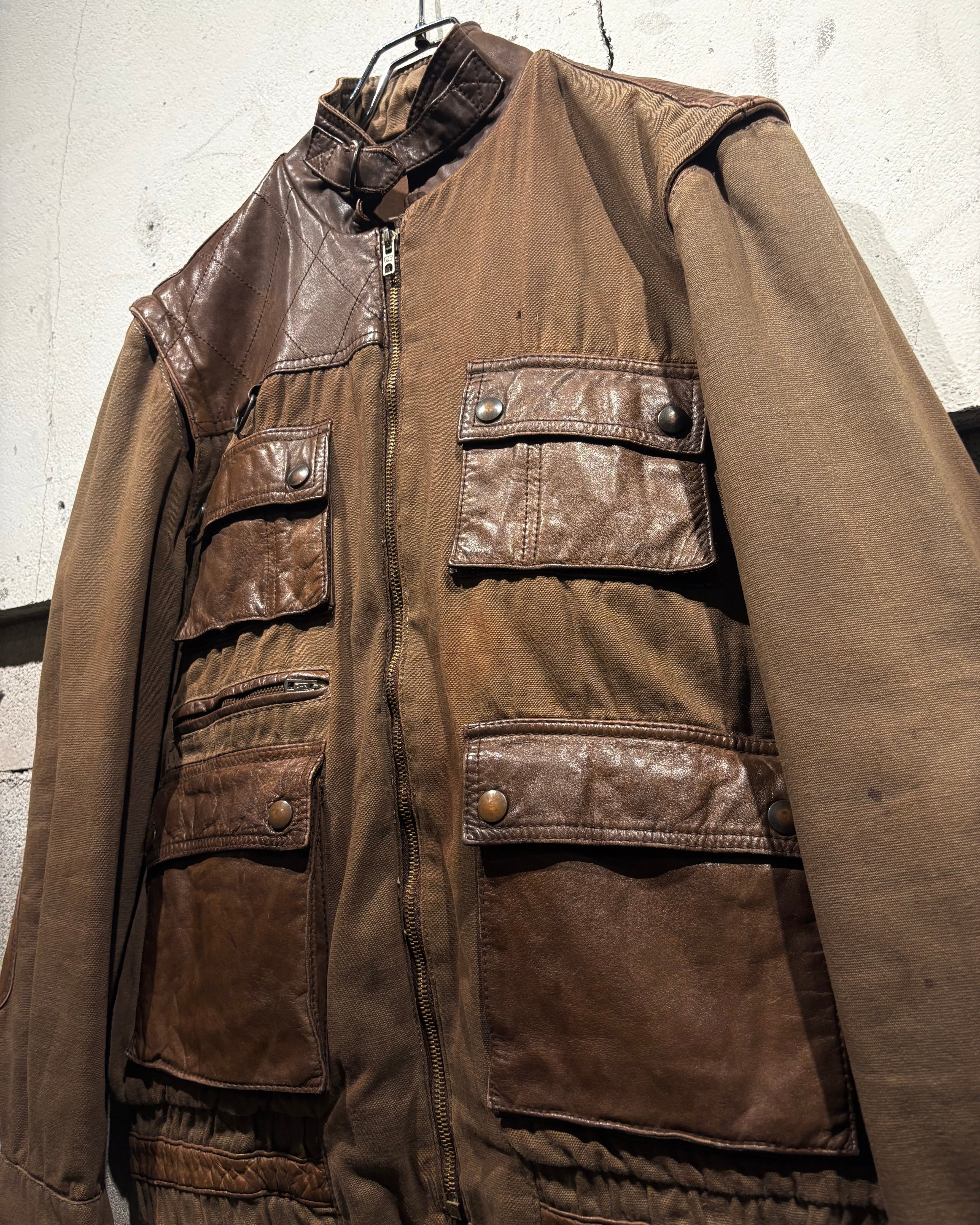 ハリのあるブラウンボディにレザーを大胆に切り替えた、ハンティングモチーフのジャケット。