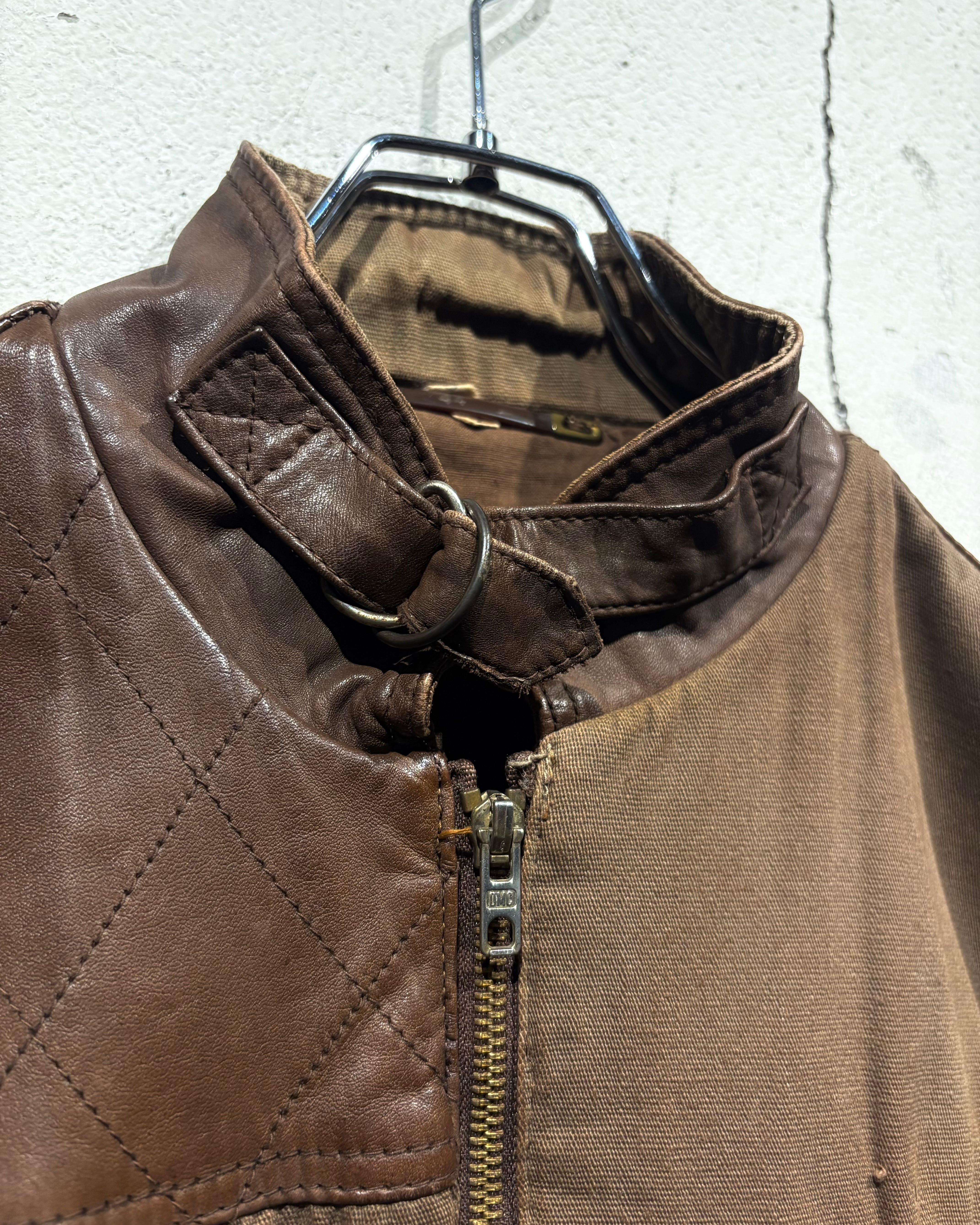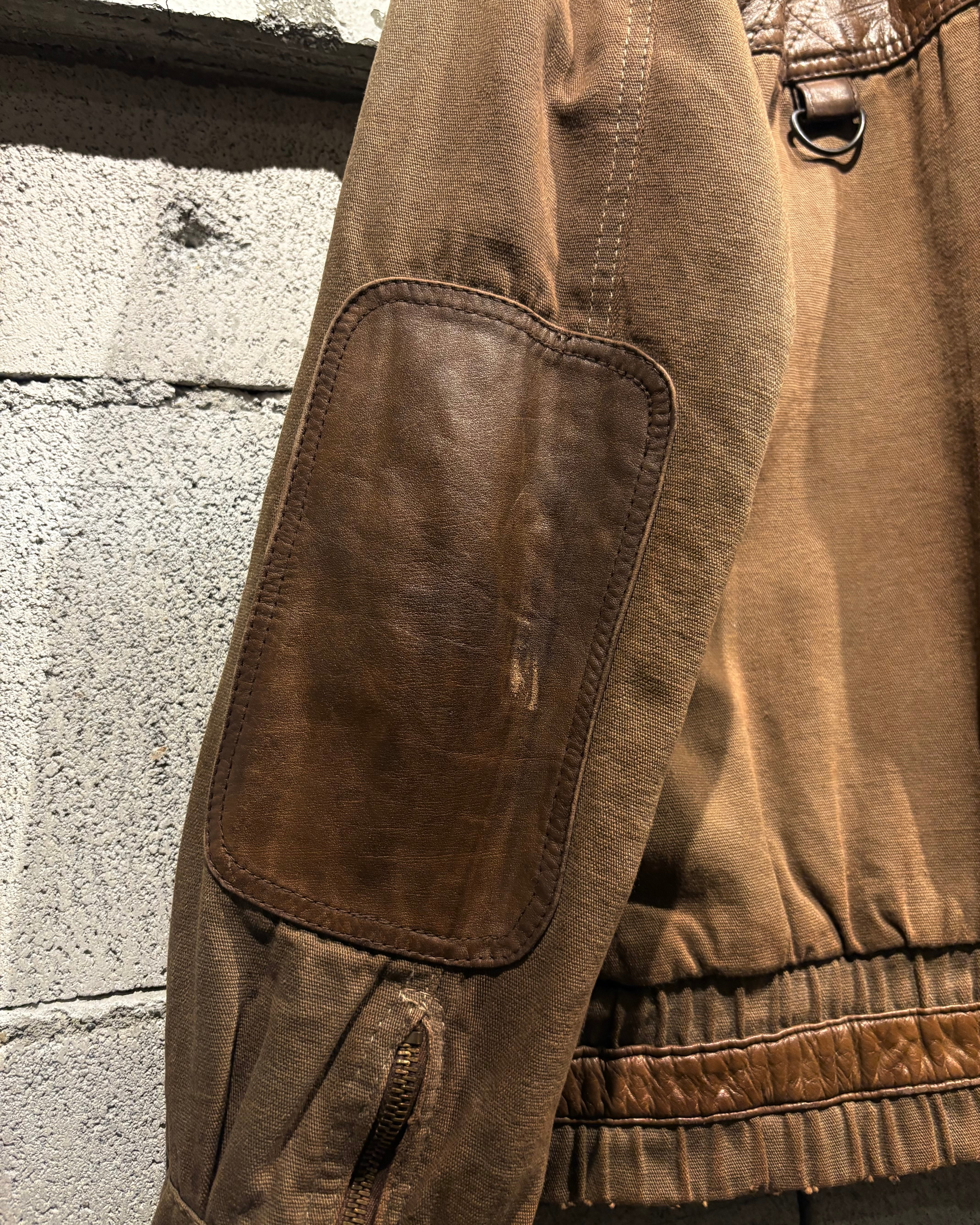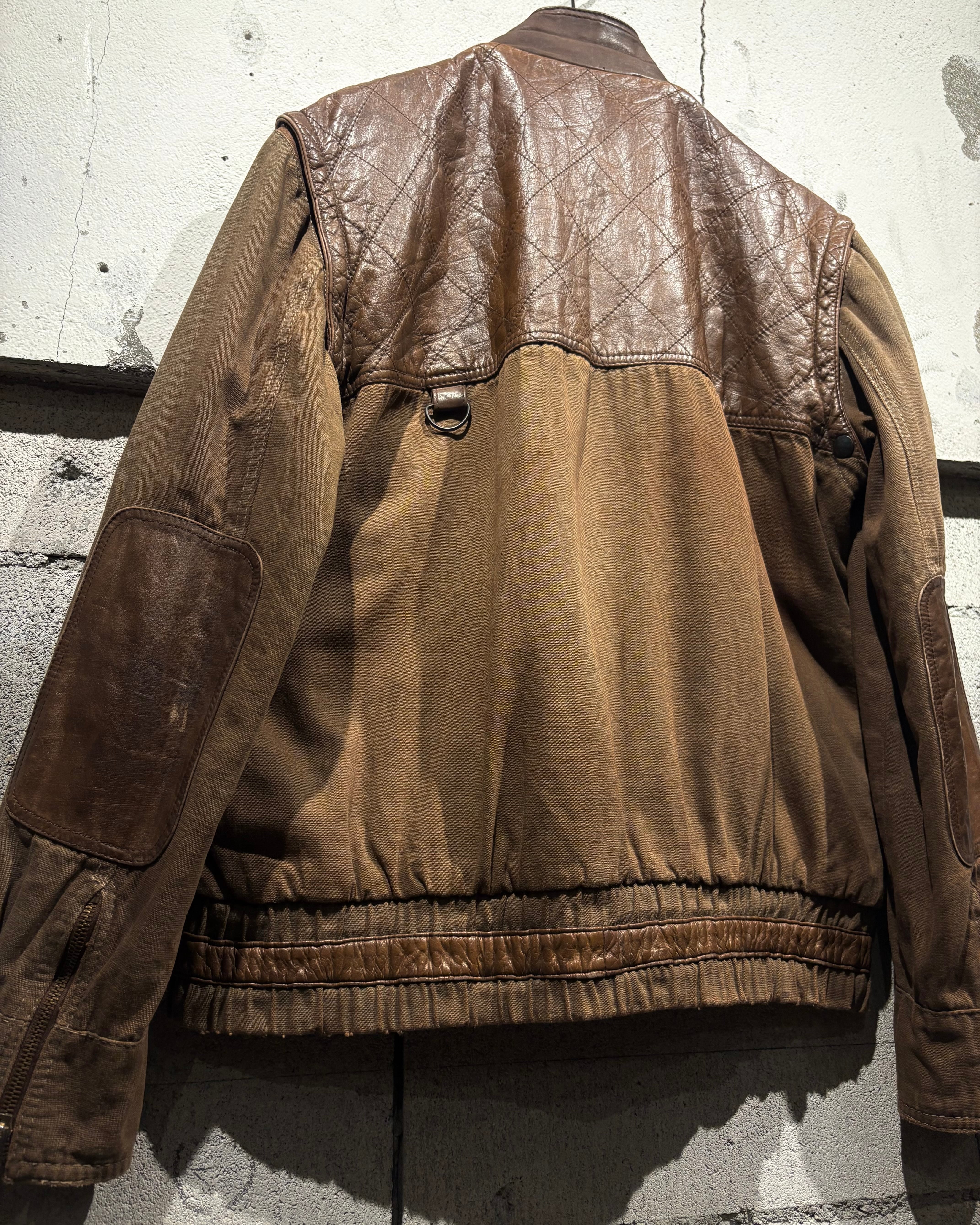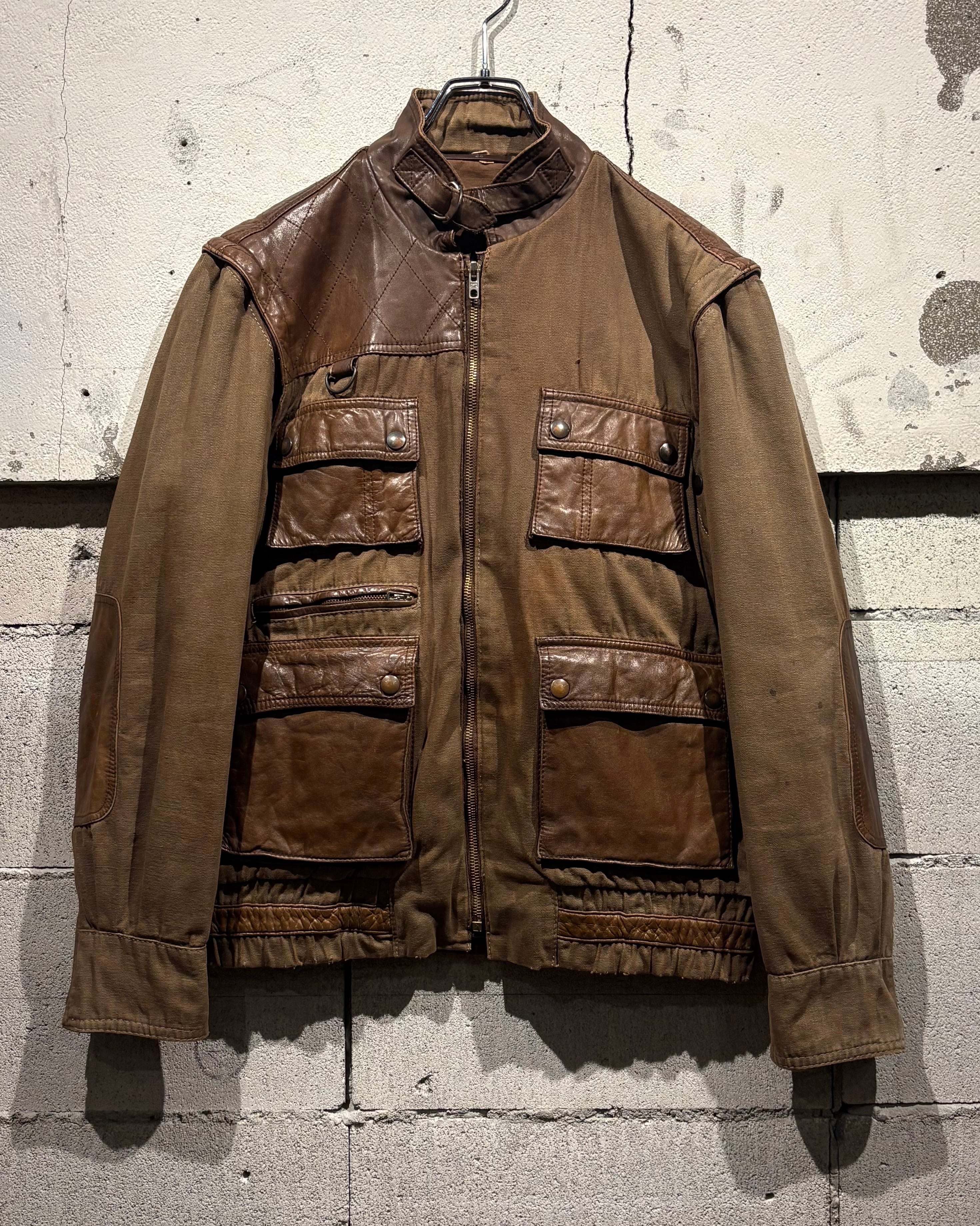 ハリのあるブラウンボディにレザーを大胆に切り替えた、ハンティングモチーフのジャケット。
