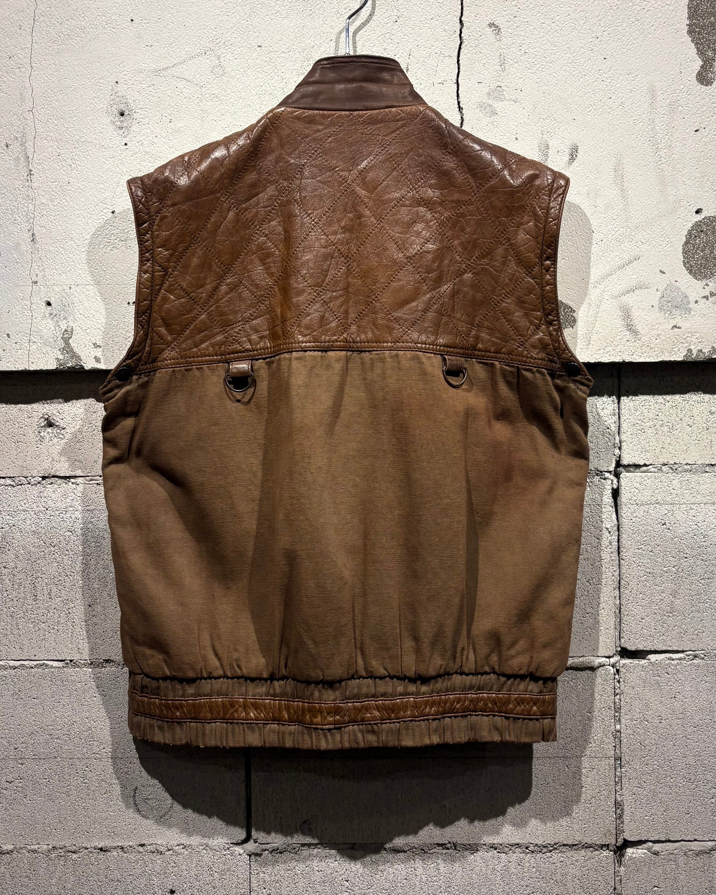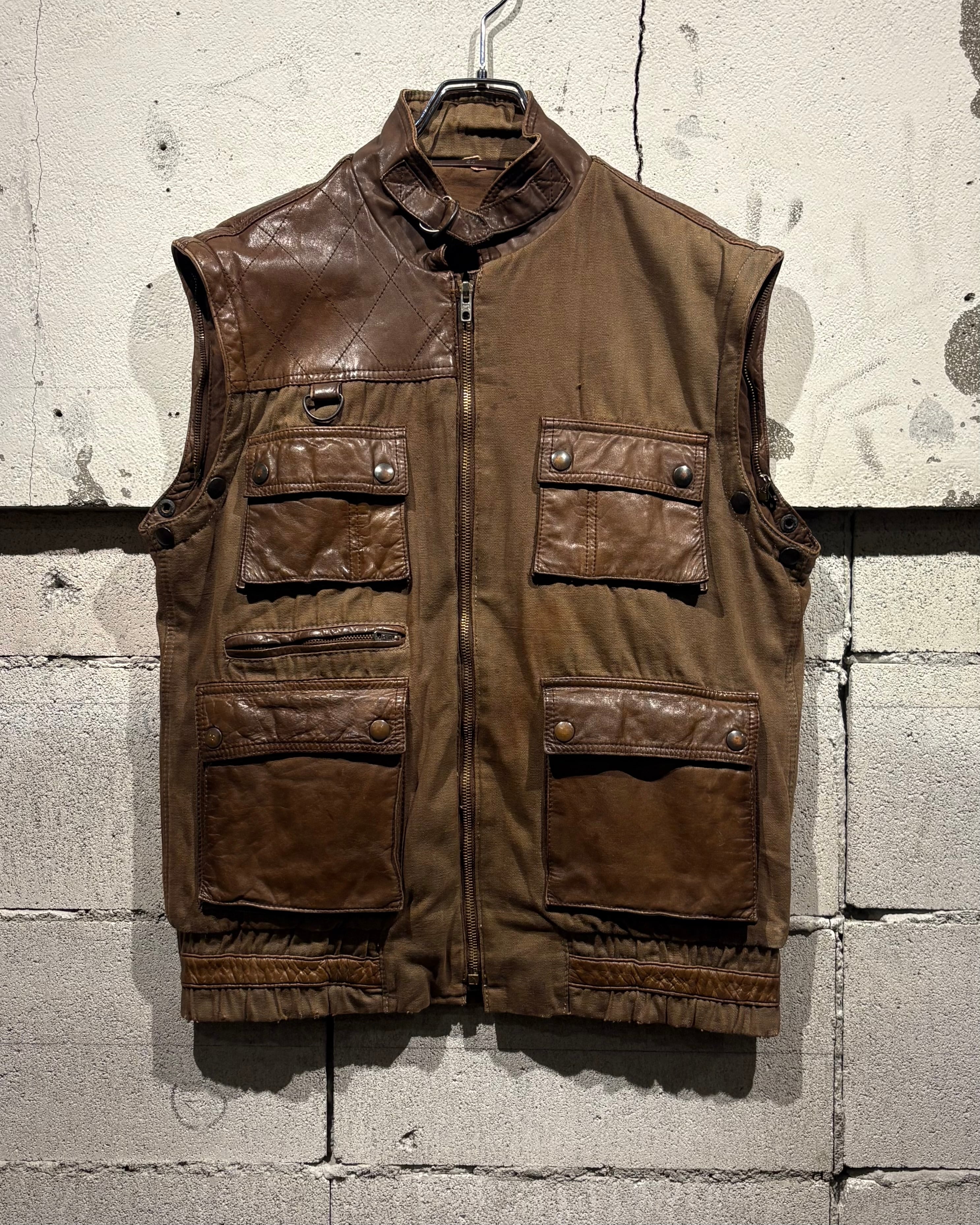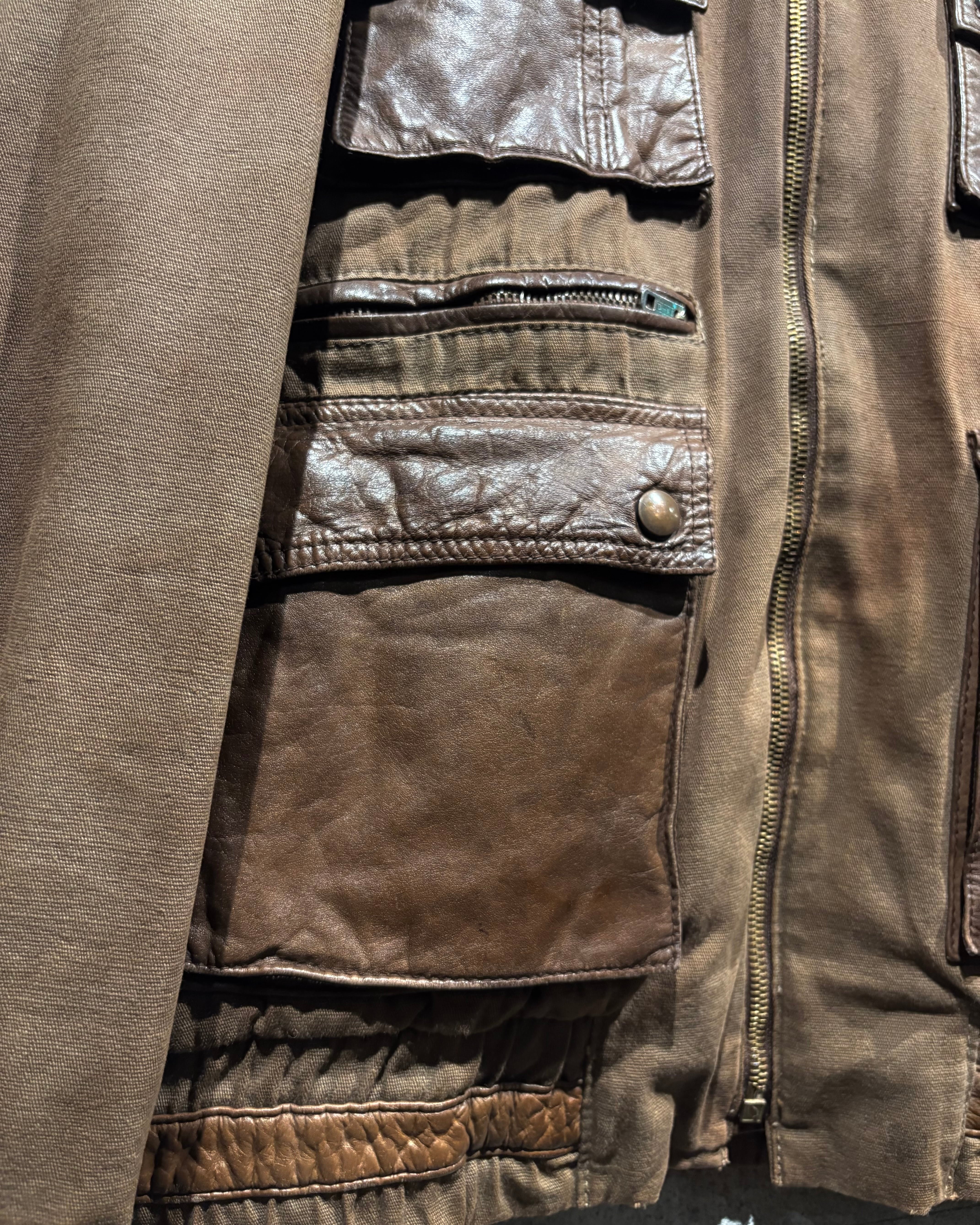 コットンのタフなファブリックをベースに、肩やポケットへ上質なブラウンレザーをドッキング。フラップポケット、ジップポケット、Dカンを配置し、随所にハンティングのディテールが落とし込まれています。