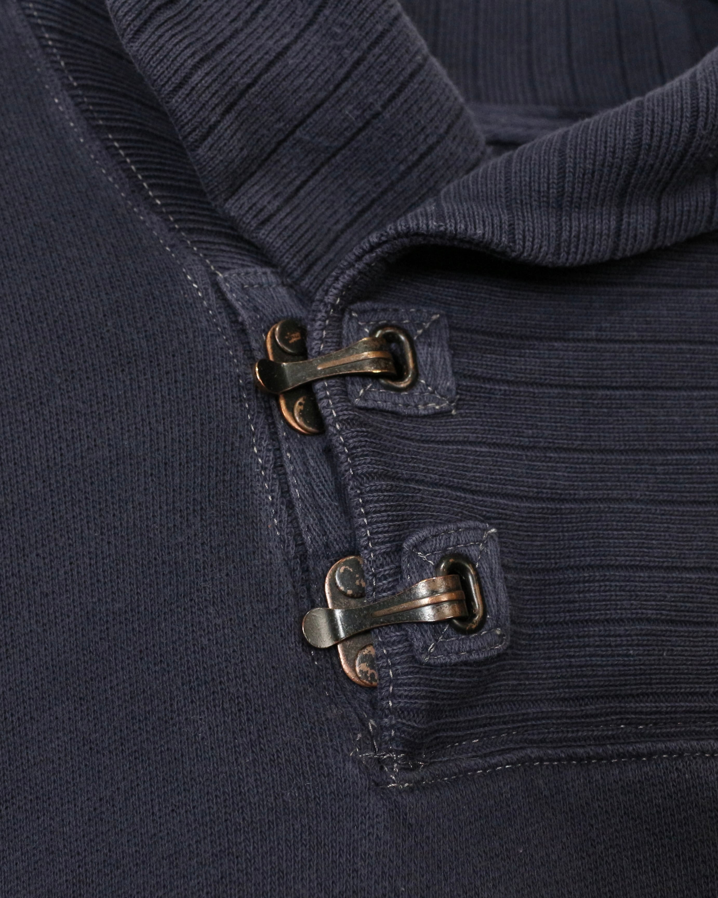 落ち着いたネイビーボディをベースに、首元にはボリューム感のあるショールカラーを配置。さらにメタルフック仕様の留め具をあしらい、ベーシックなルックスの中に個性が宿っています。