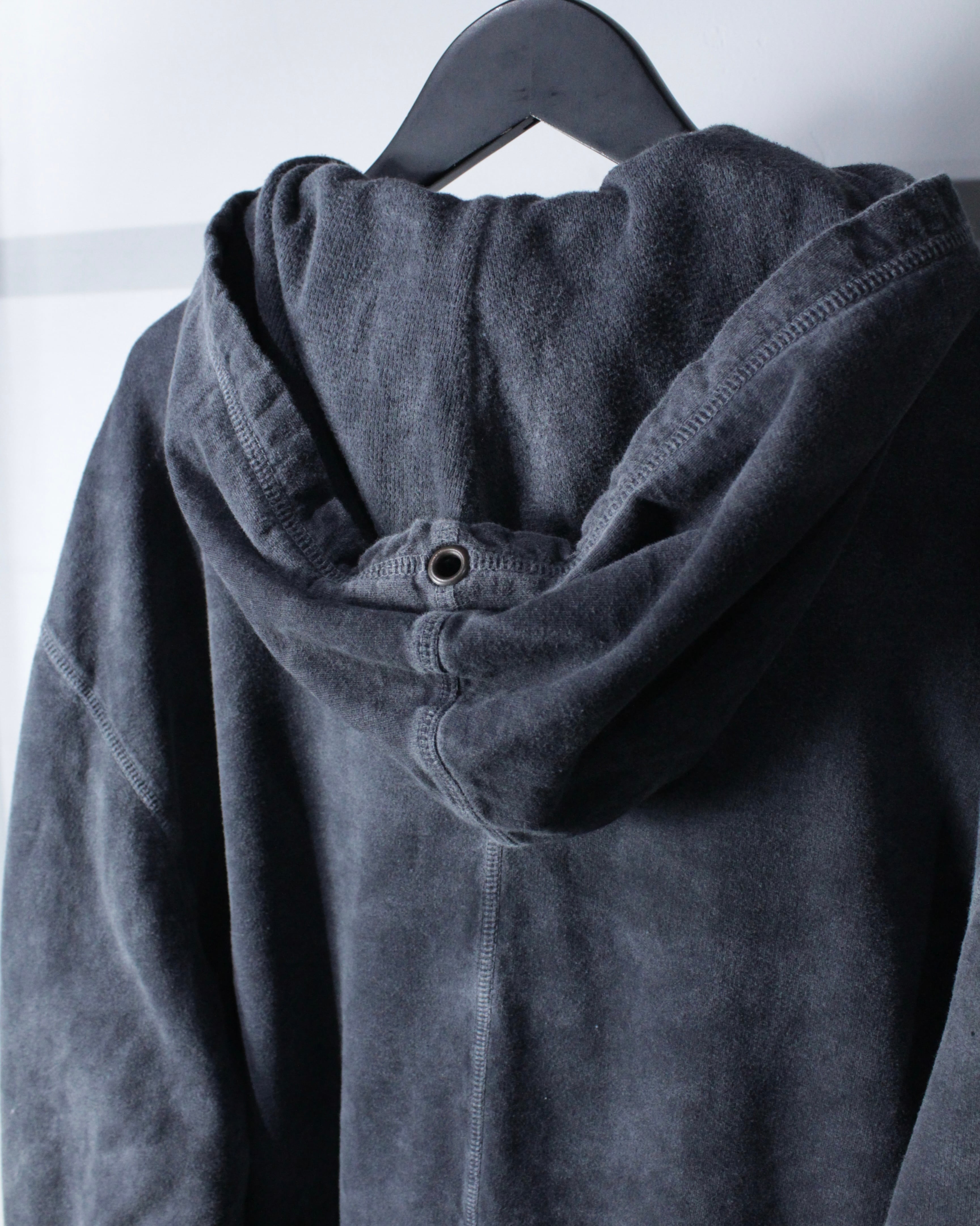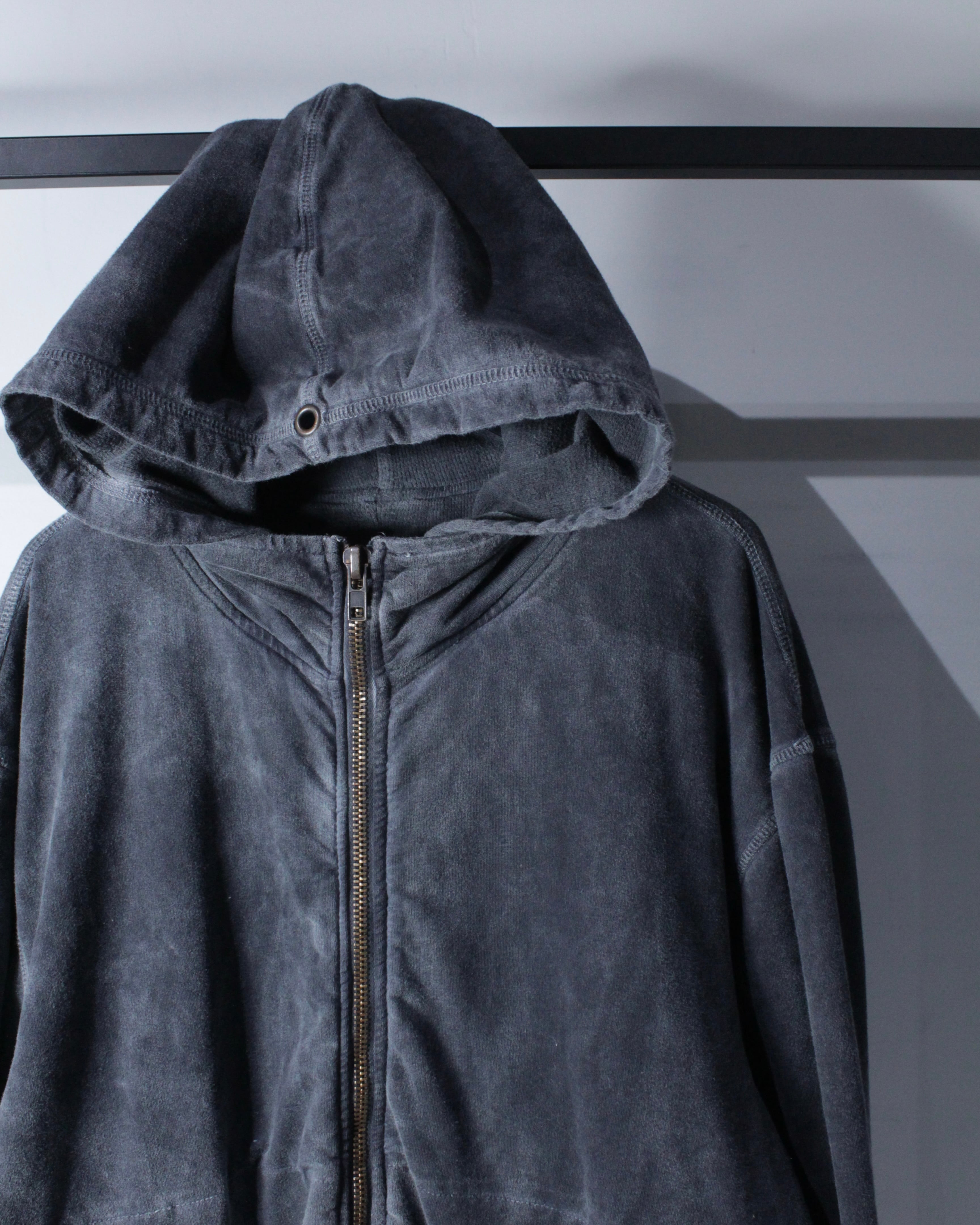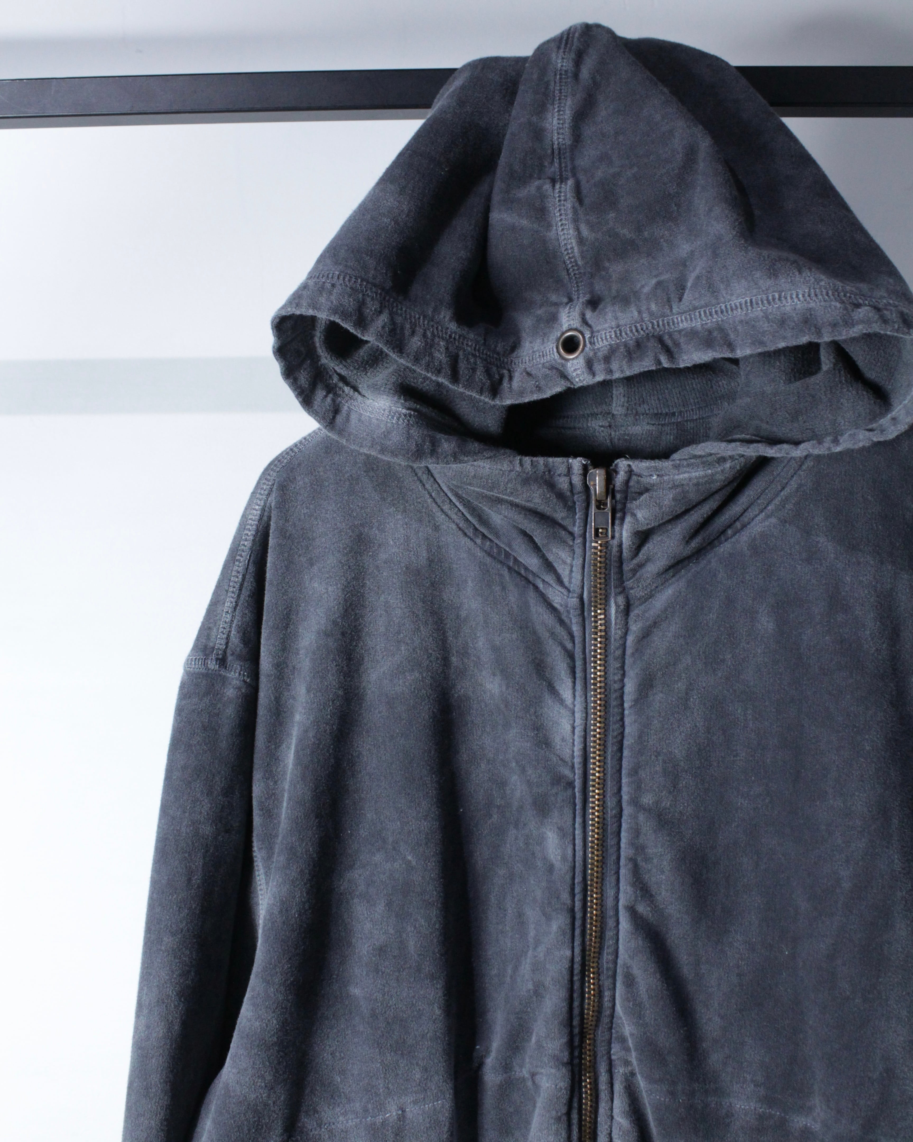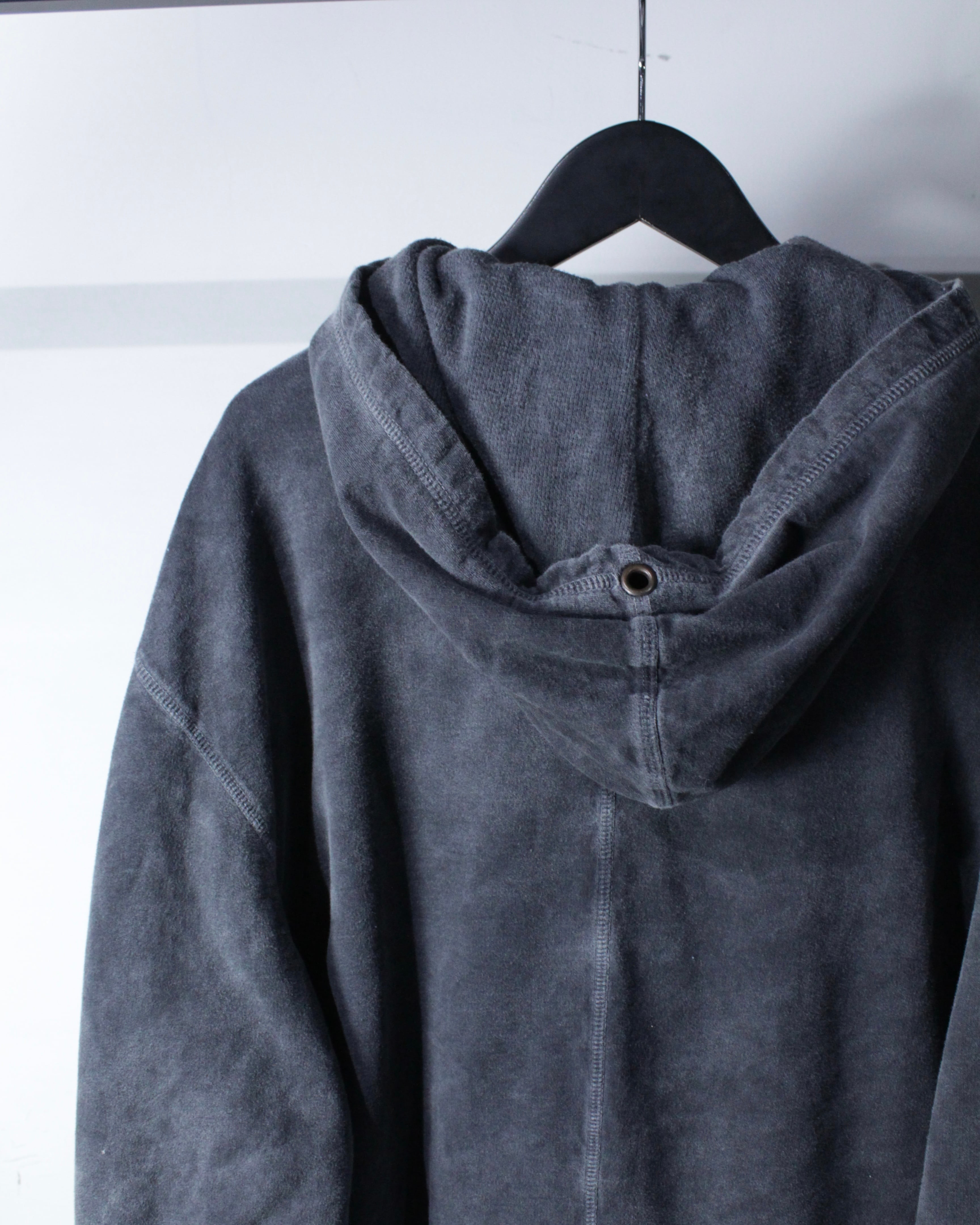 余計な装飾を削ぎ落とし、フェードという経年変化そのものをデザインとして成立させた一着。スタイリングのベースとしても主役としても活躍する、ジップアップフーディの逸品です。