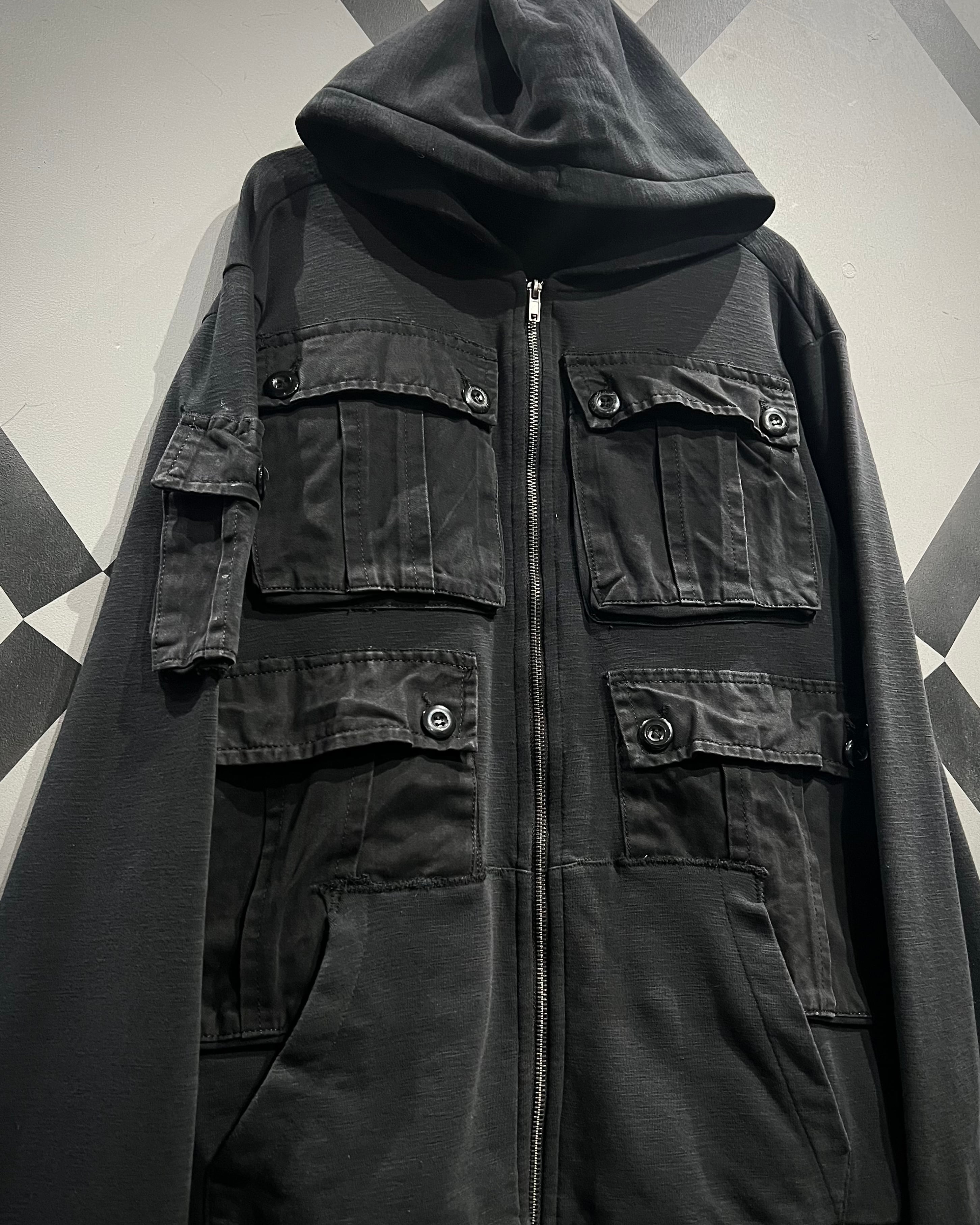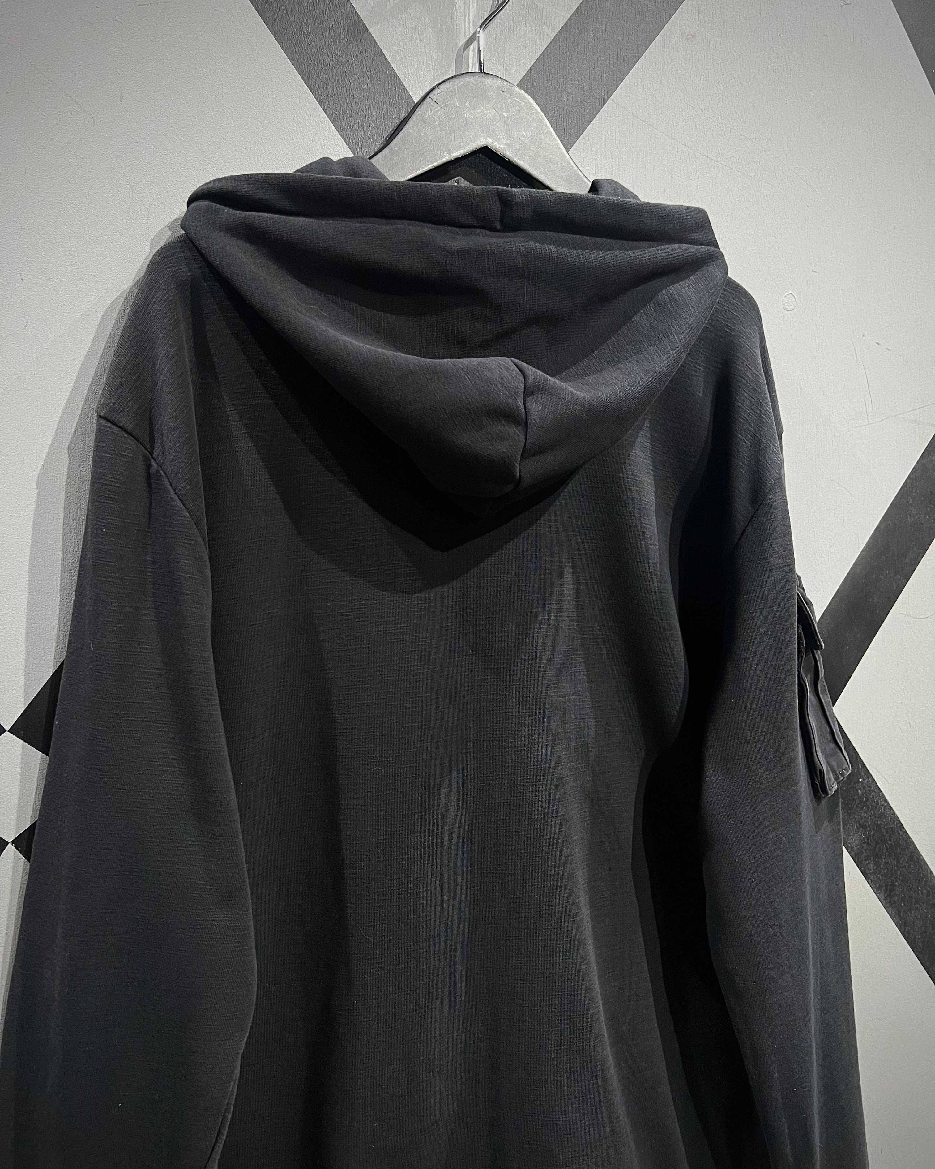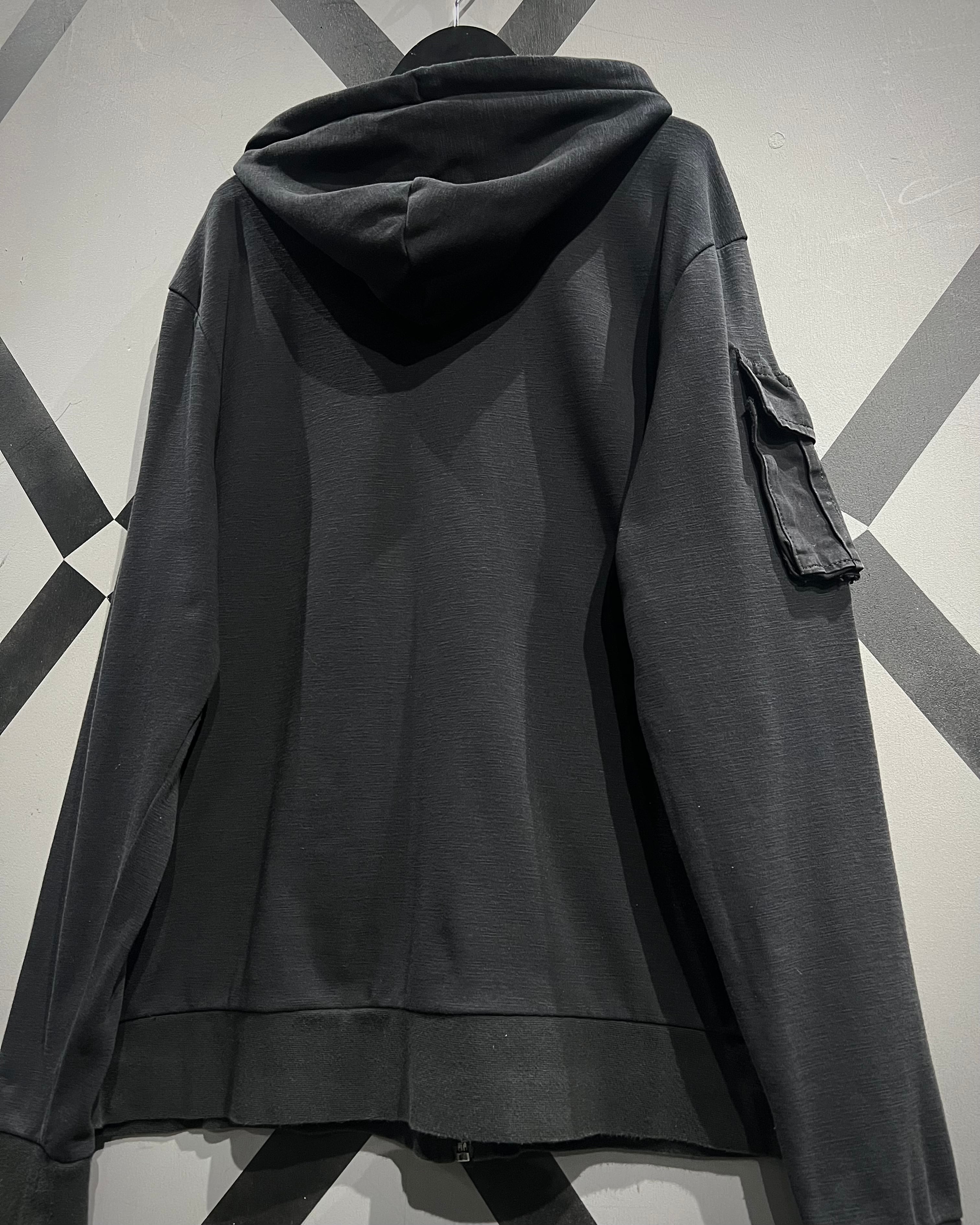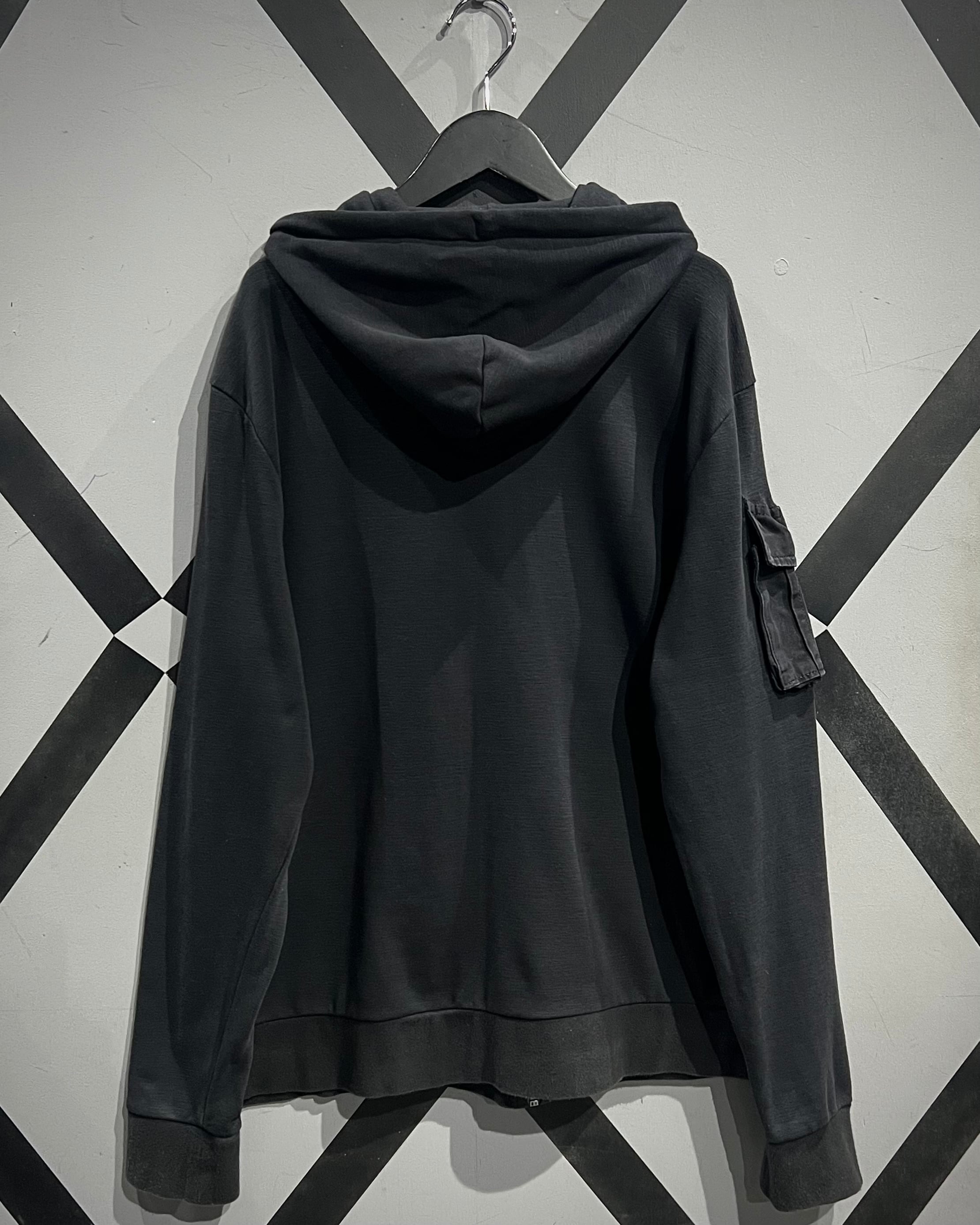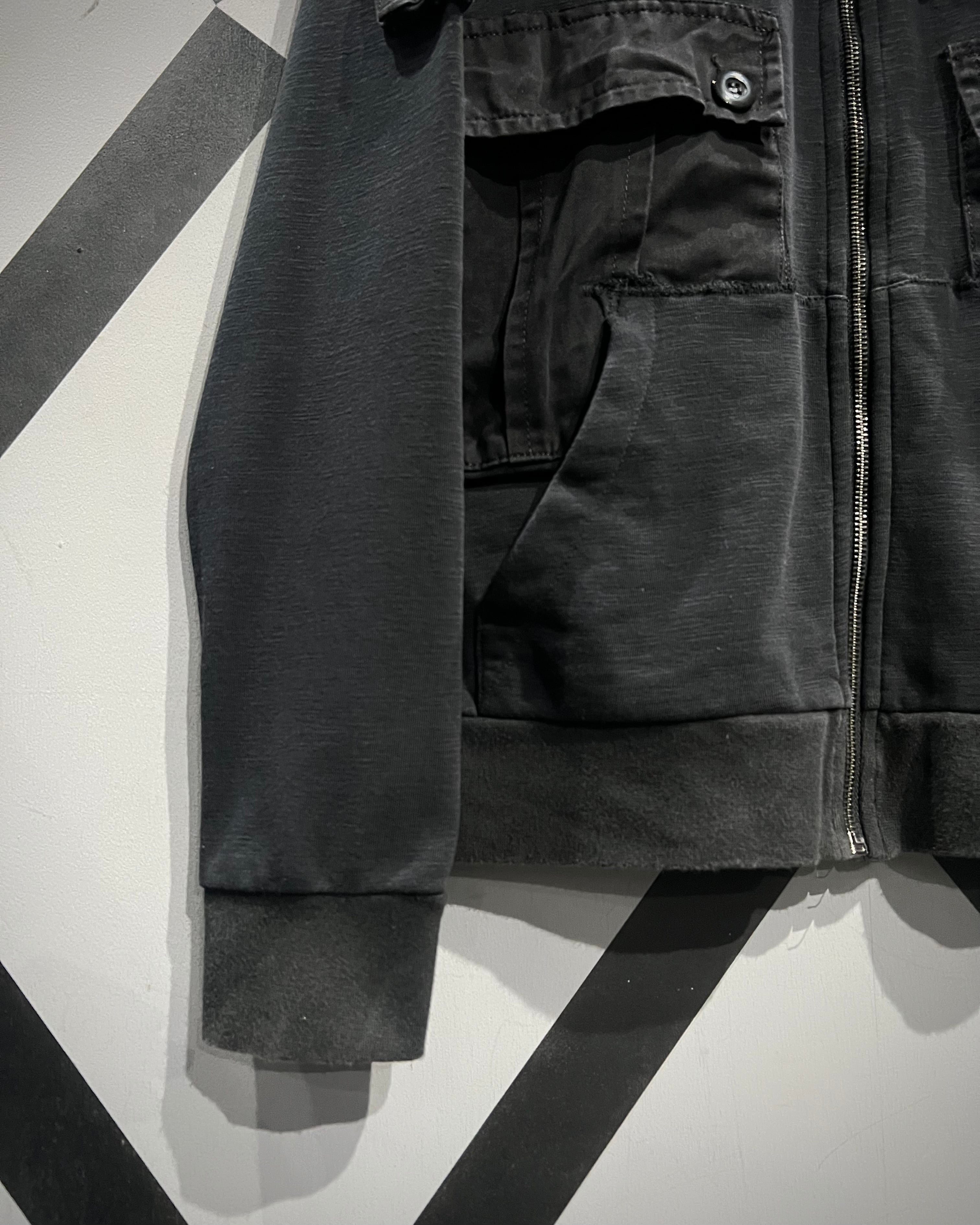 柔らかく滑らかなブラックスウェットをベースに、ミリタリーライクなディテールを落とし込んだジップアップフーディ。