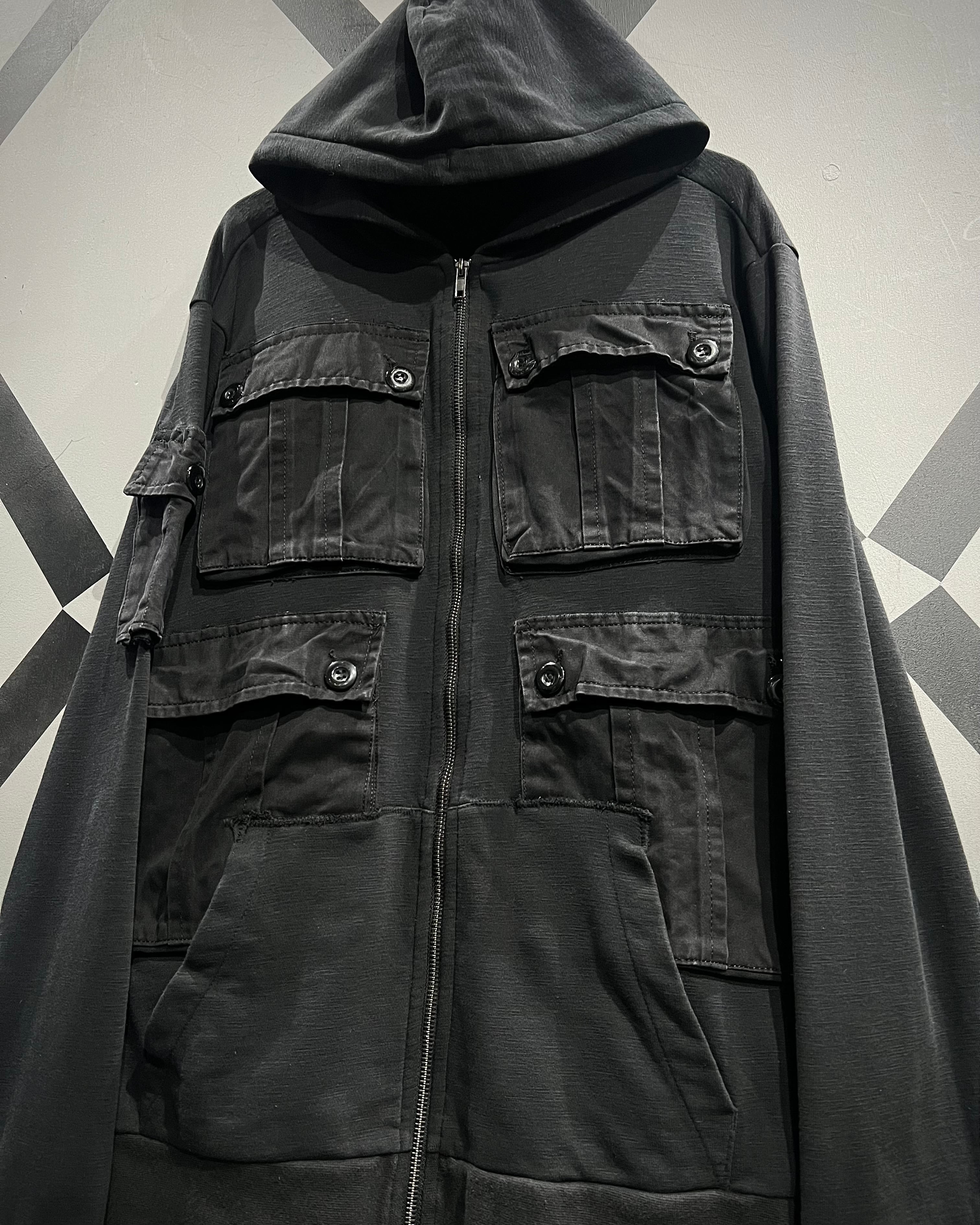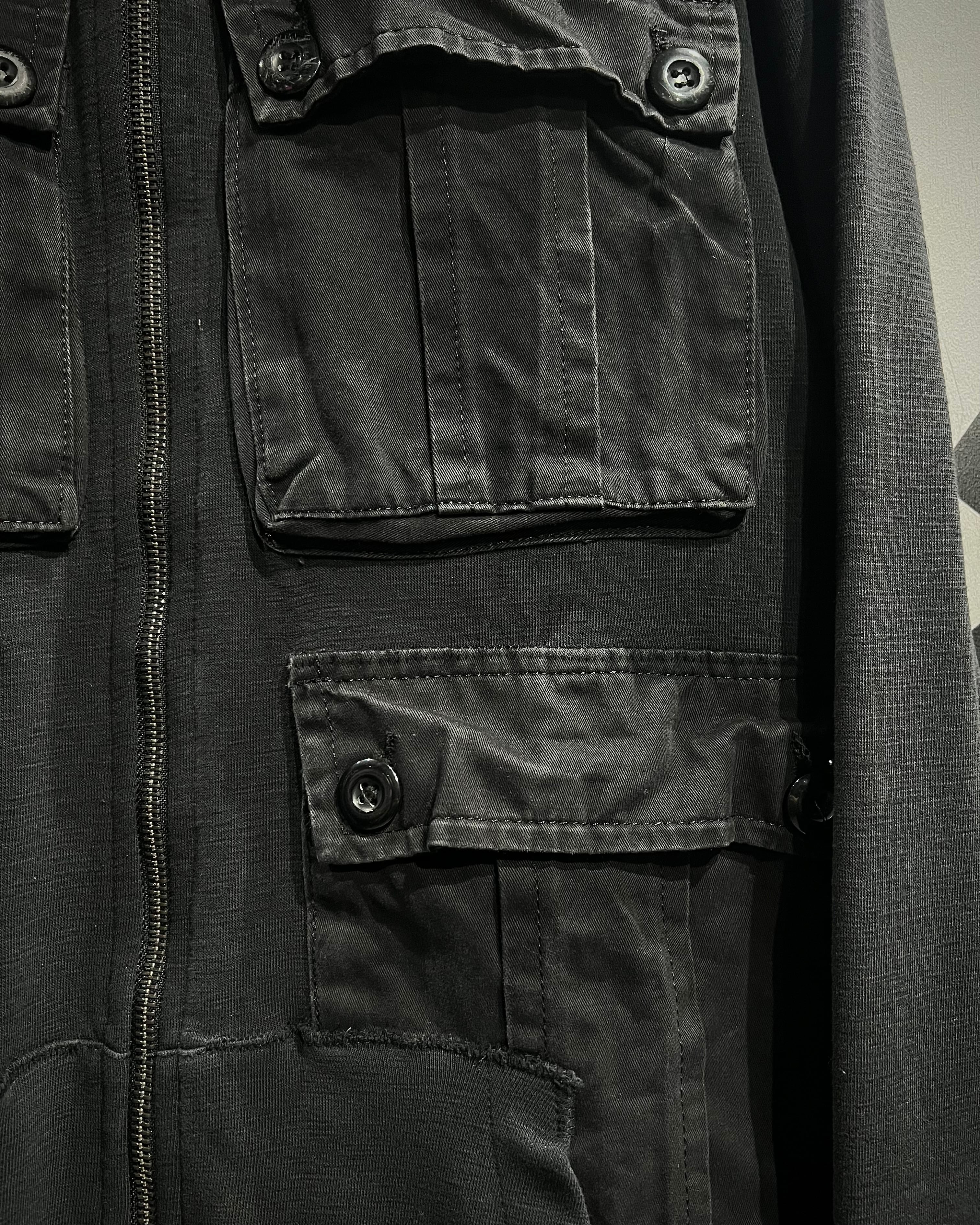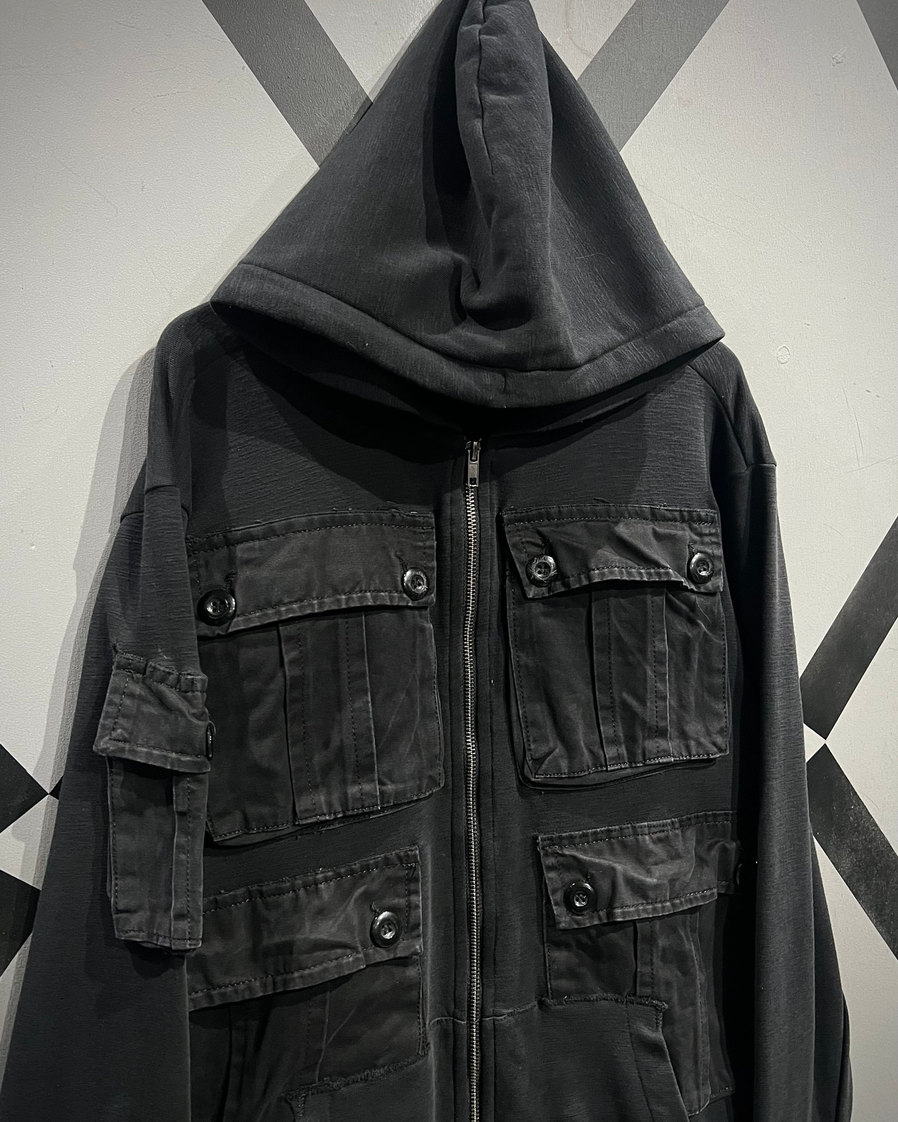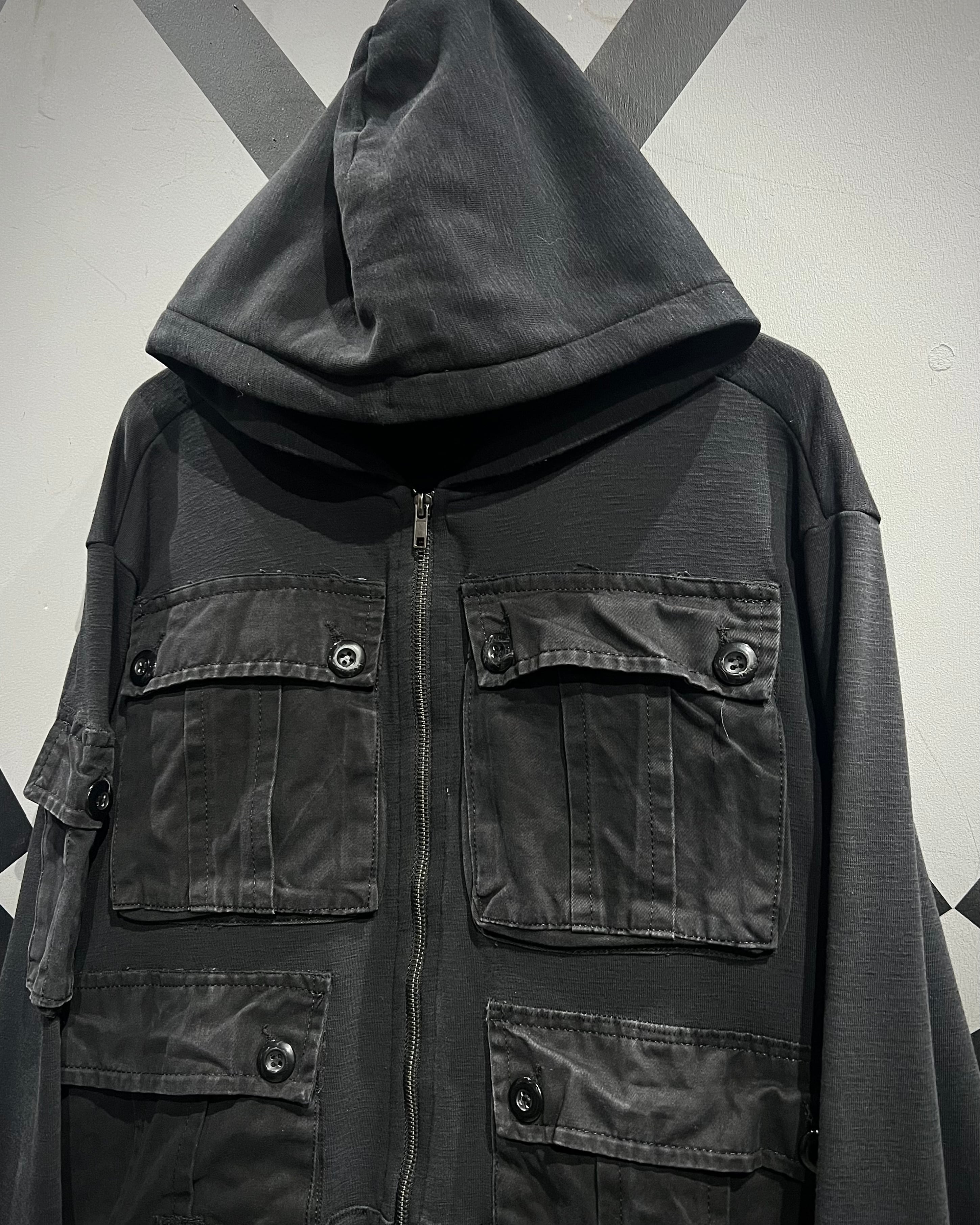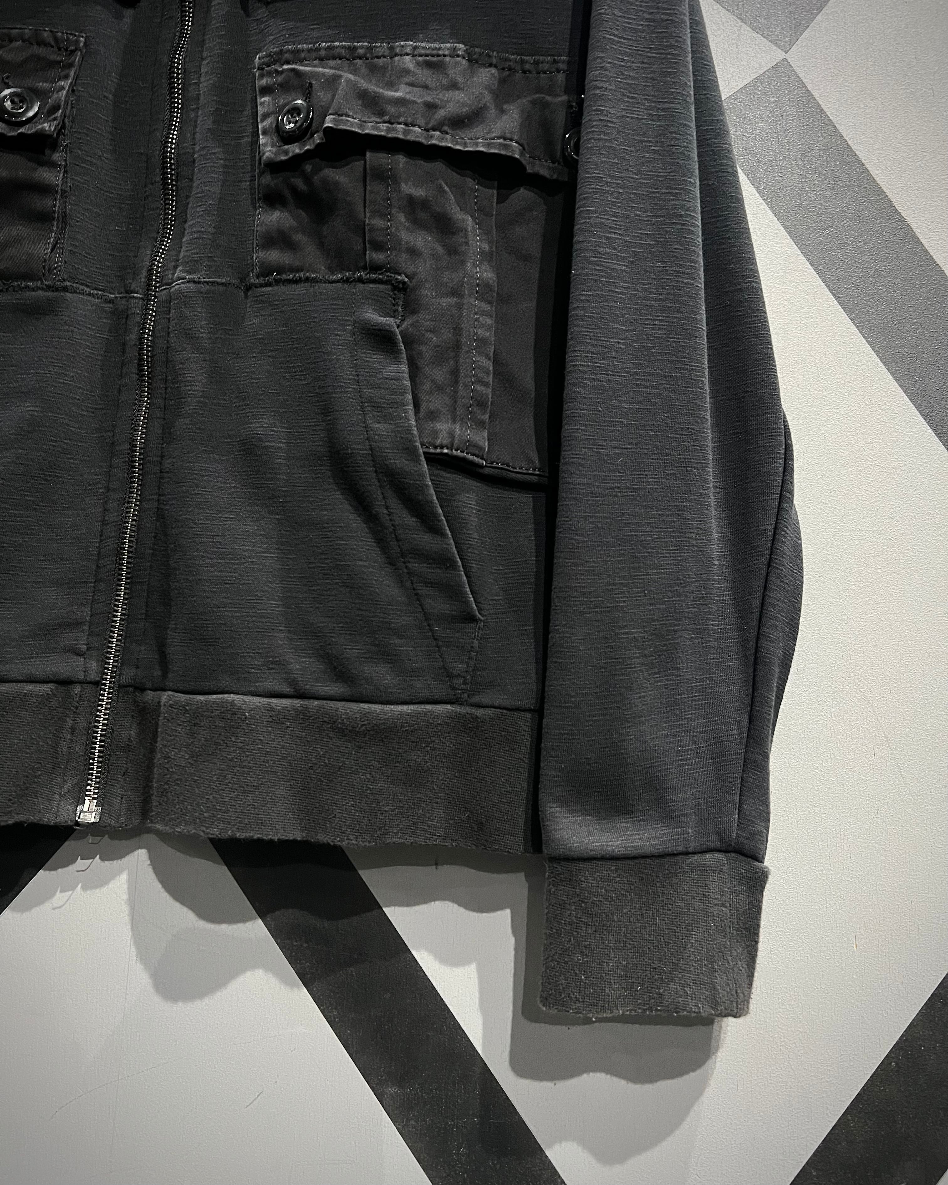 柔らかく滑らかなブラックスウェットをベースに、ミリタリーライクなディテールを落とし込んだジップアップフーディ。