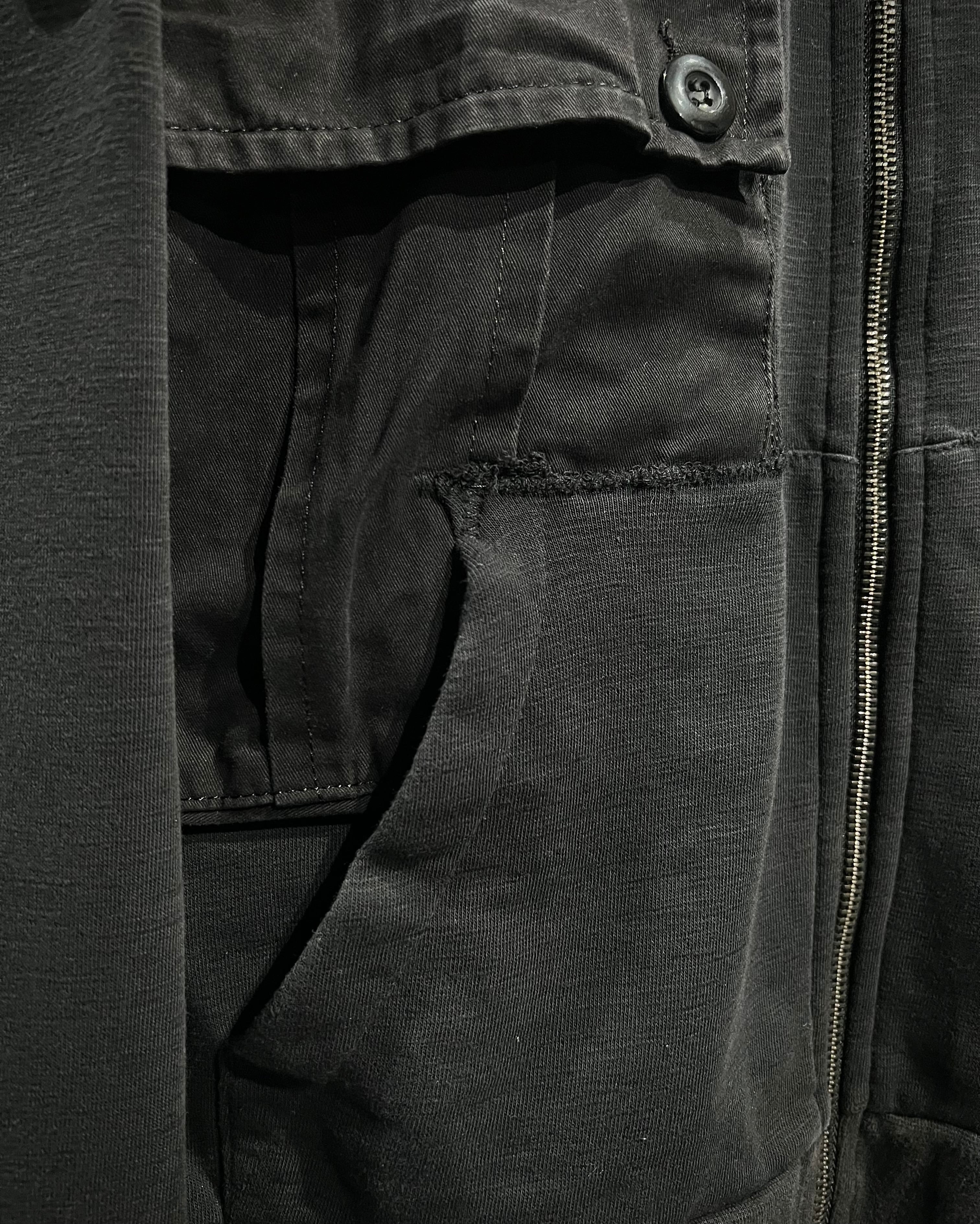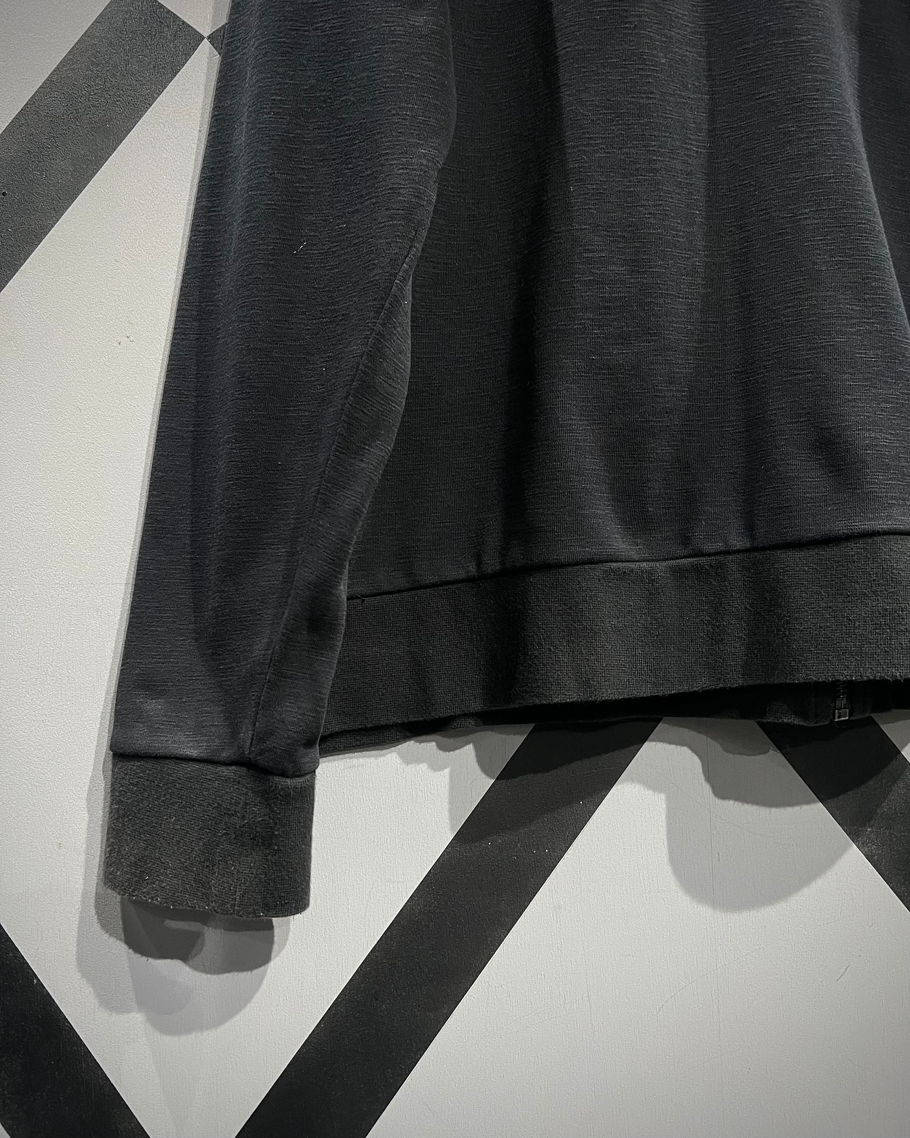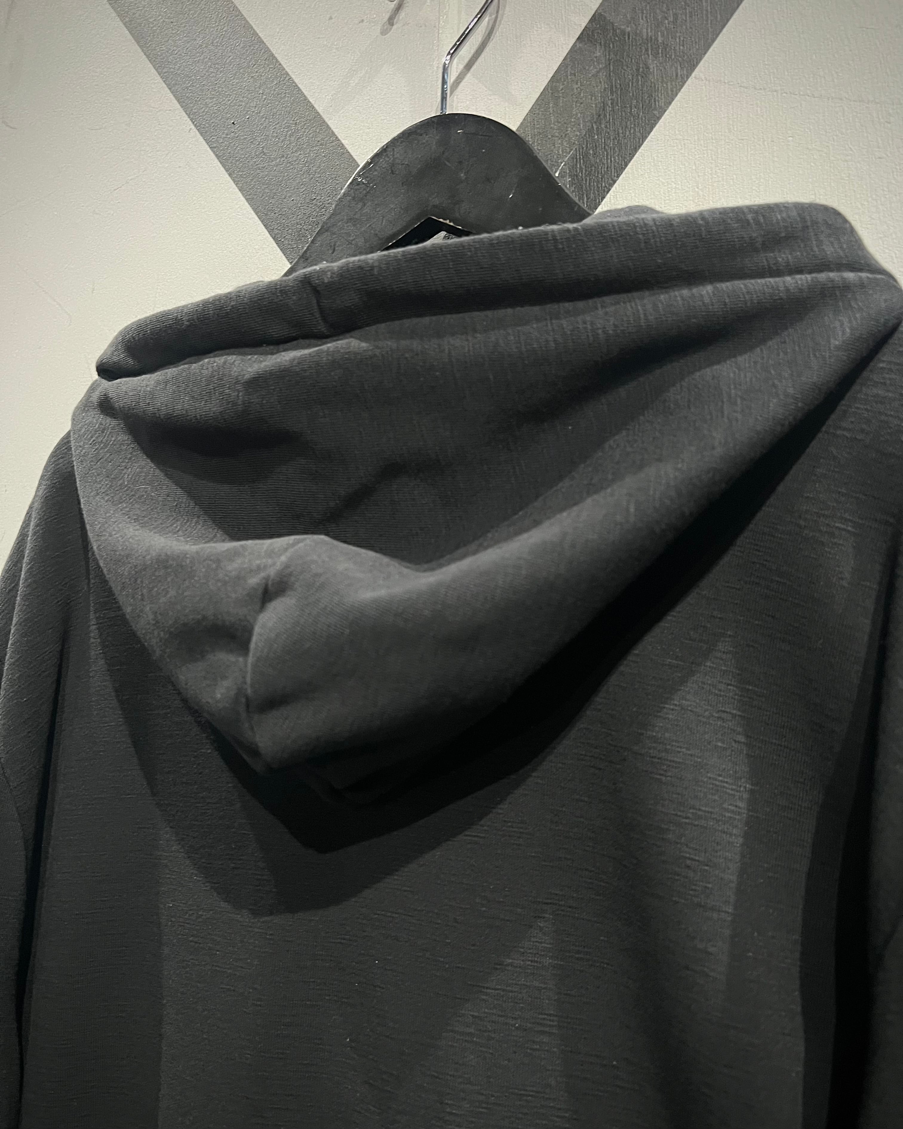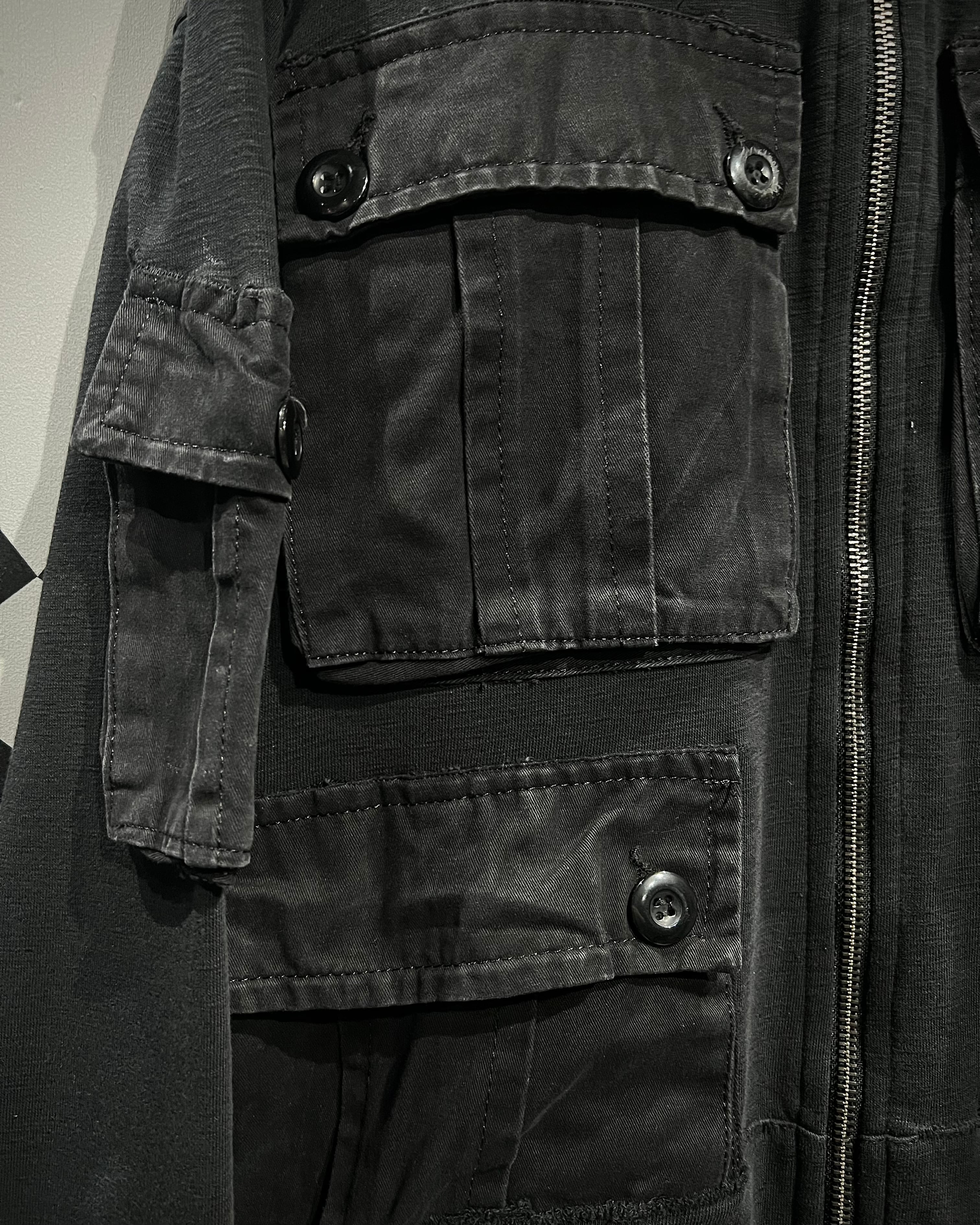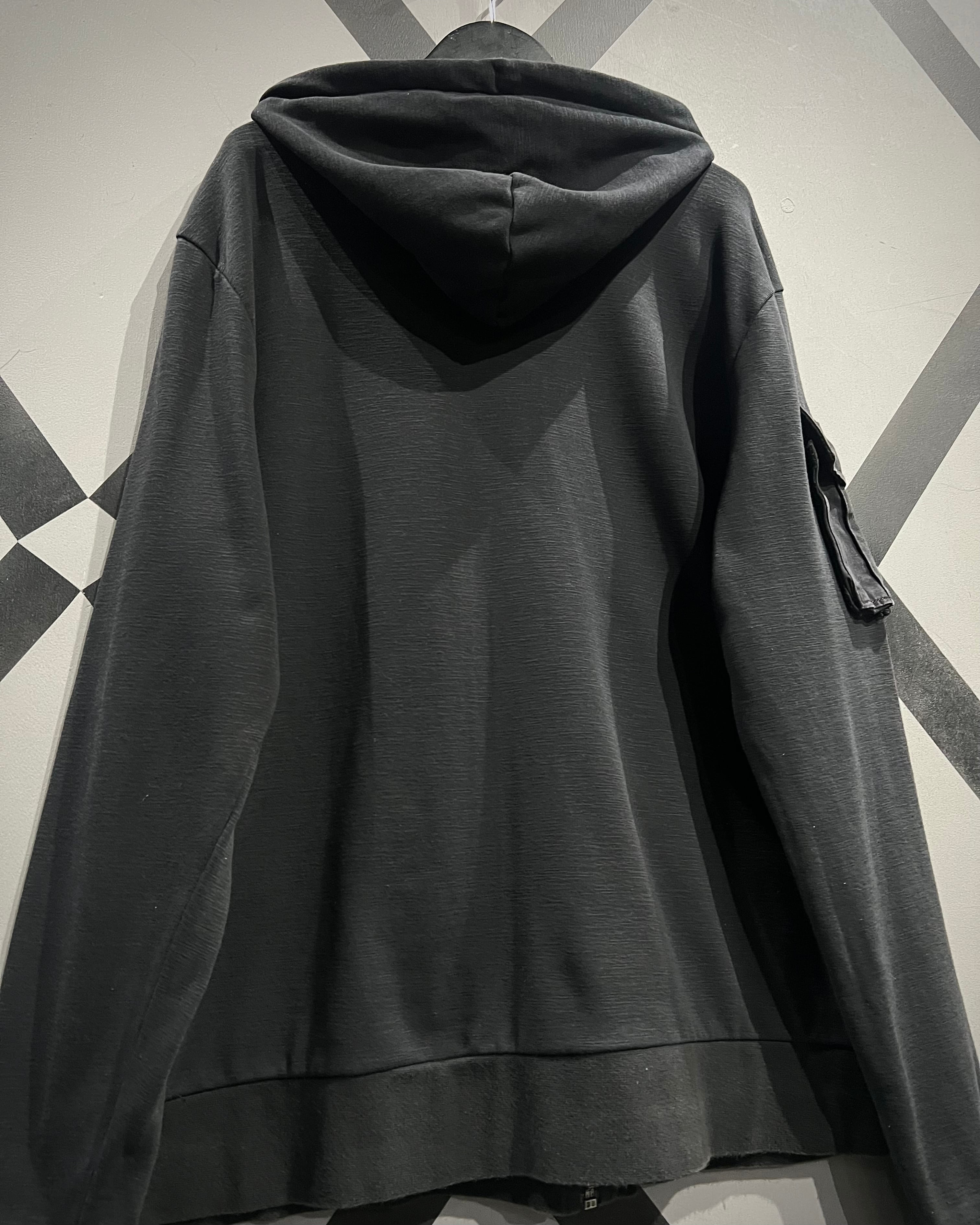 柔らかく滑らかなブラックスウェットをベースに、ミリタリーライクなディテールを落とし込んだジップアップフーディ。