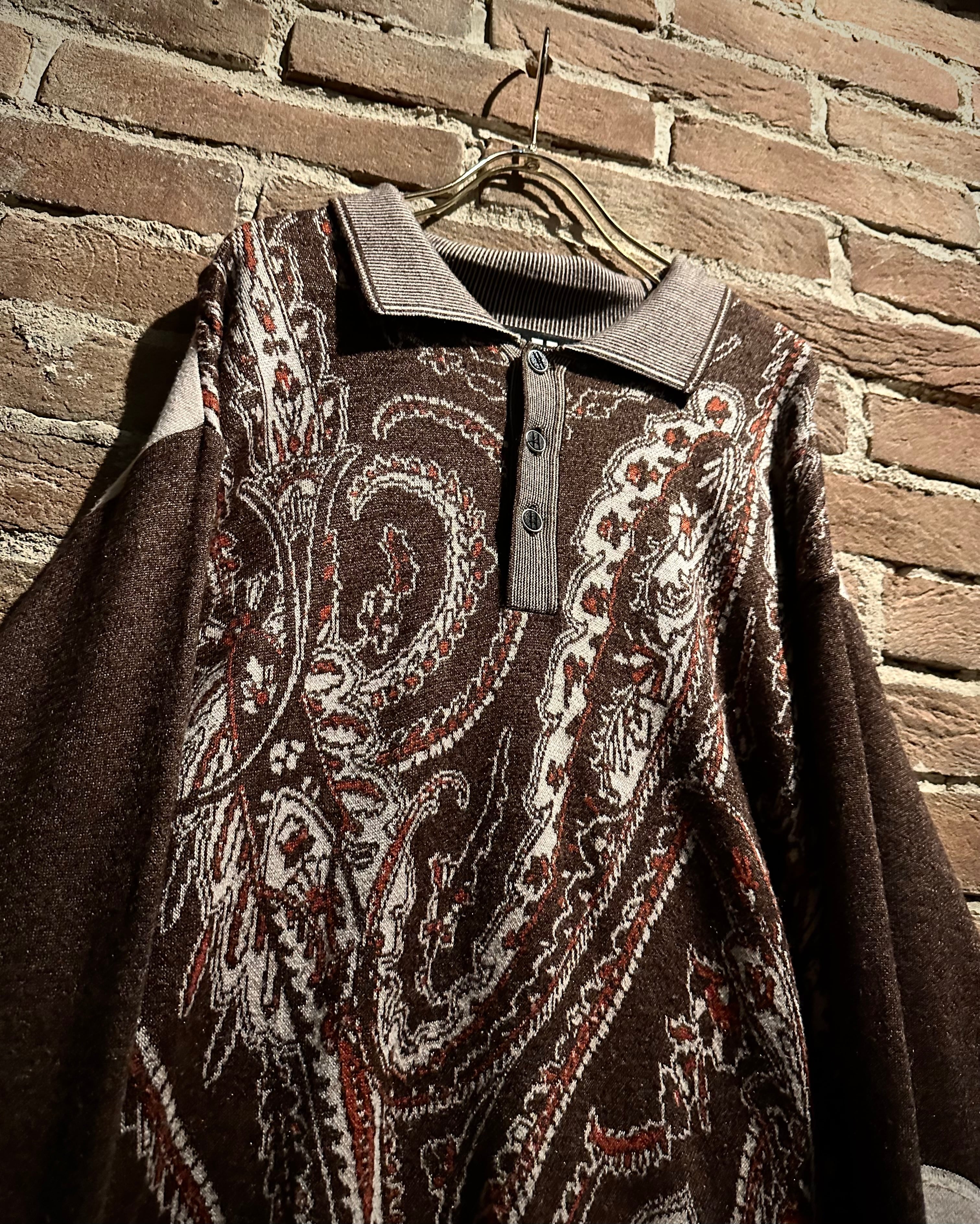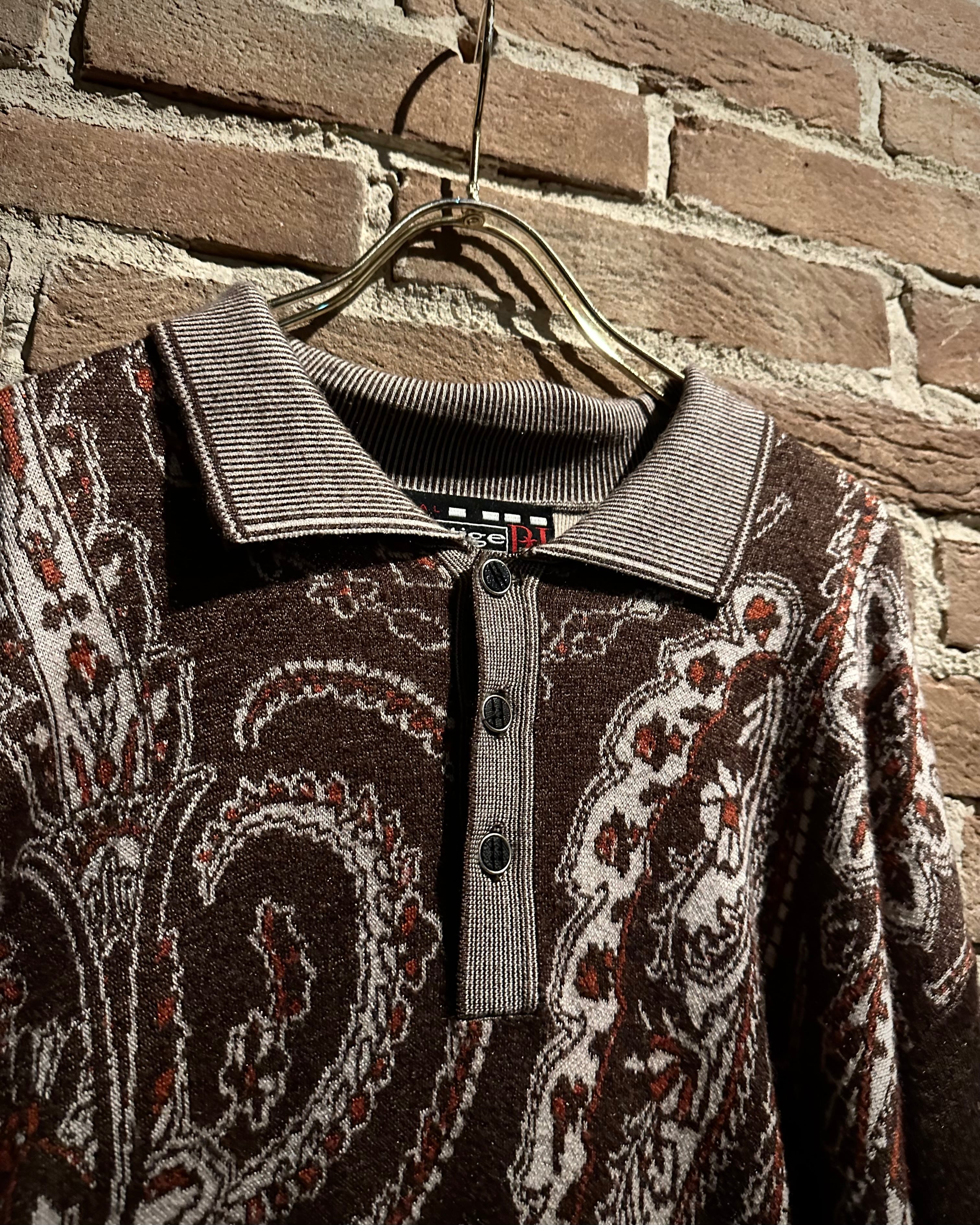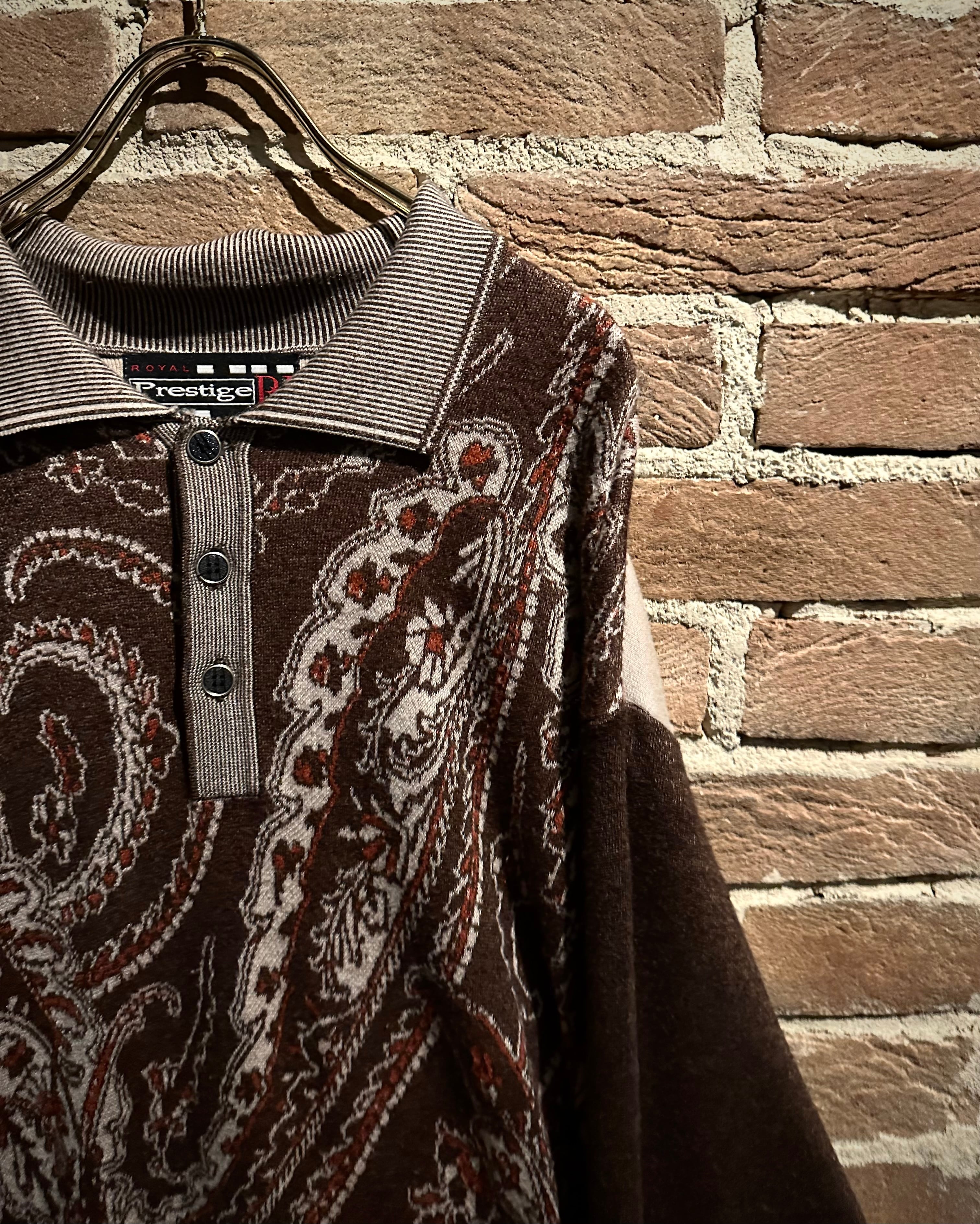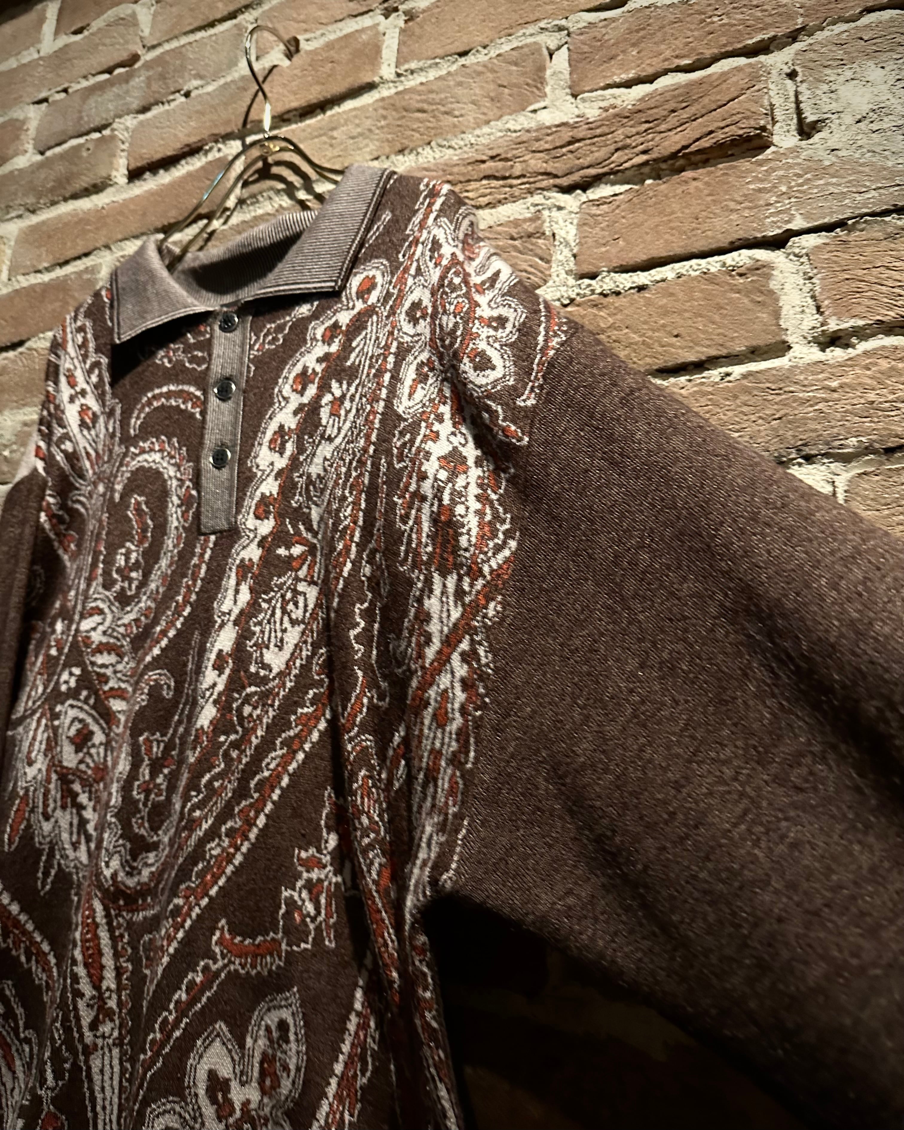 落ち着きのあるブラウンのボディに、非常に美しいペイズリー柄模様を載せたニットポロ。