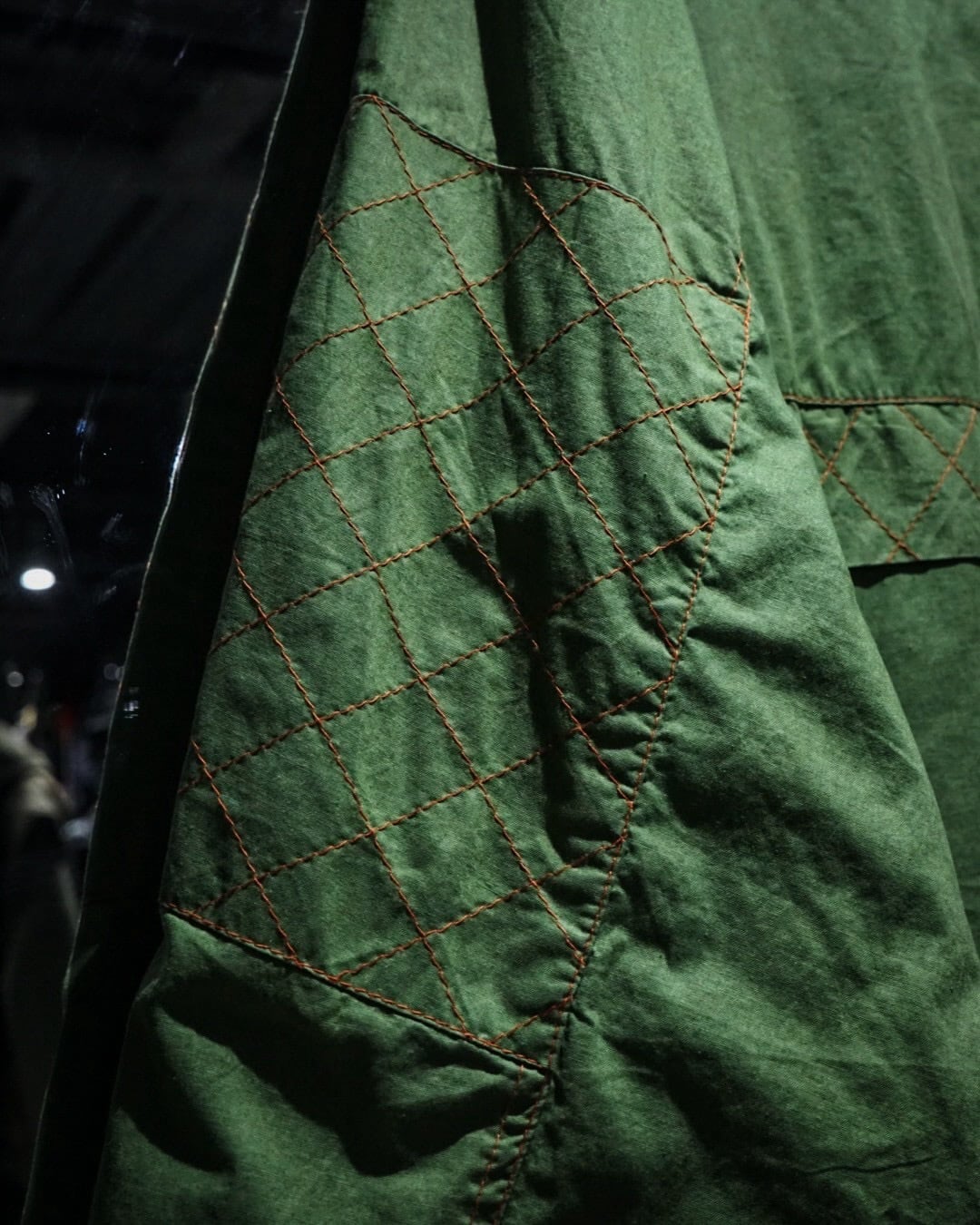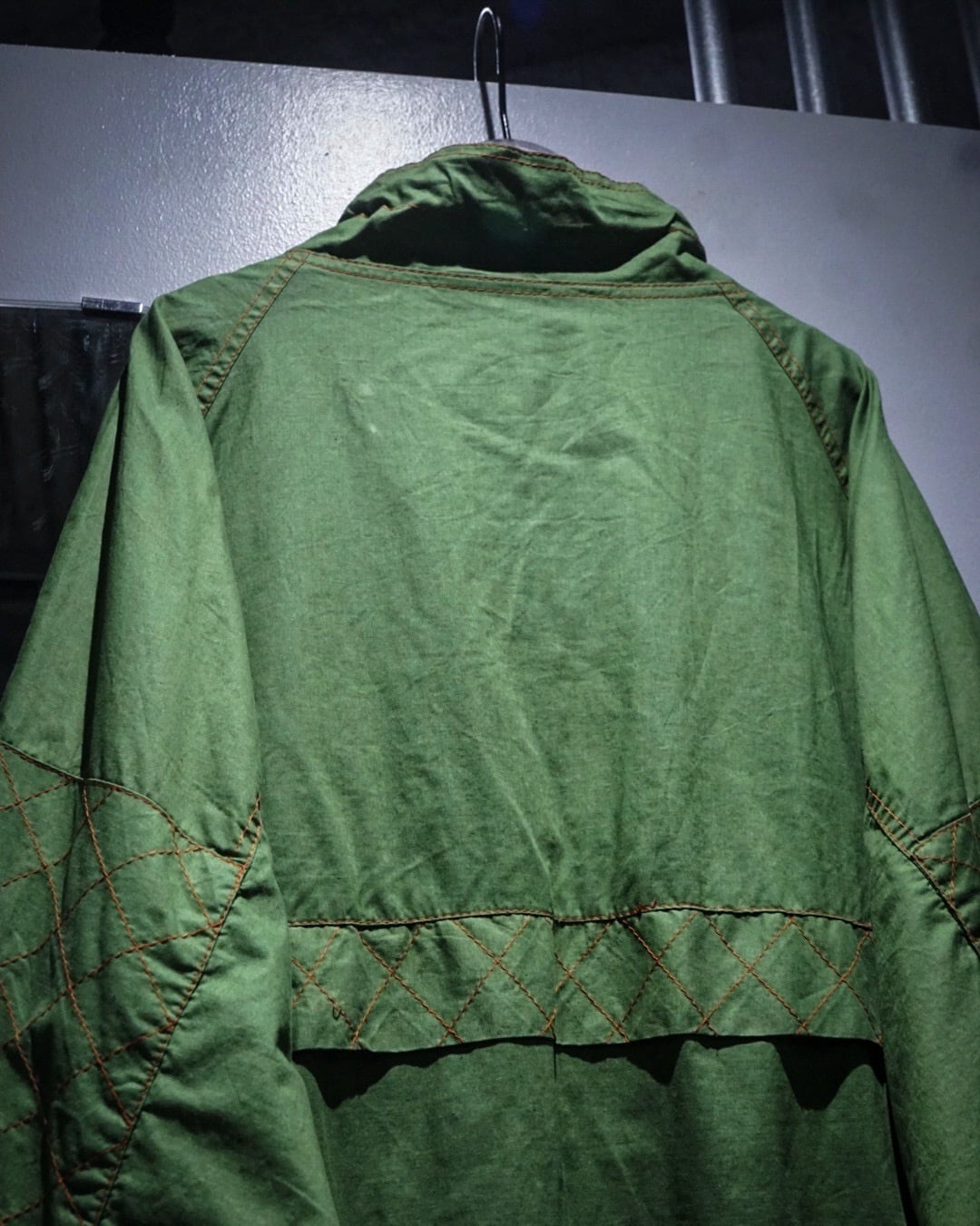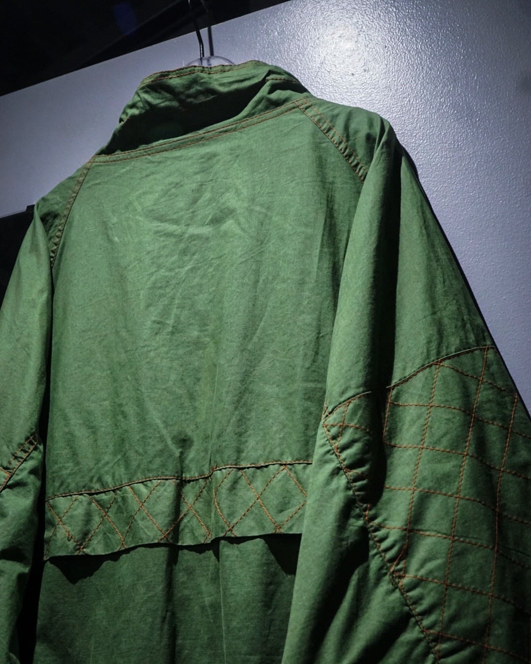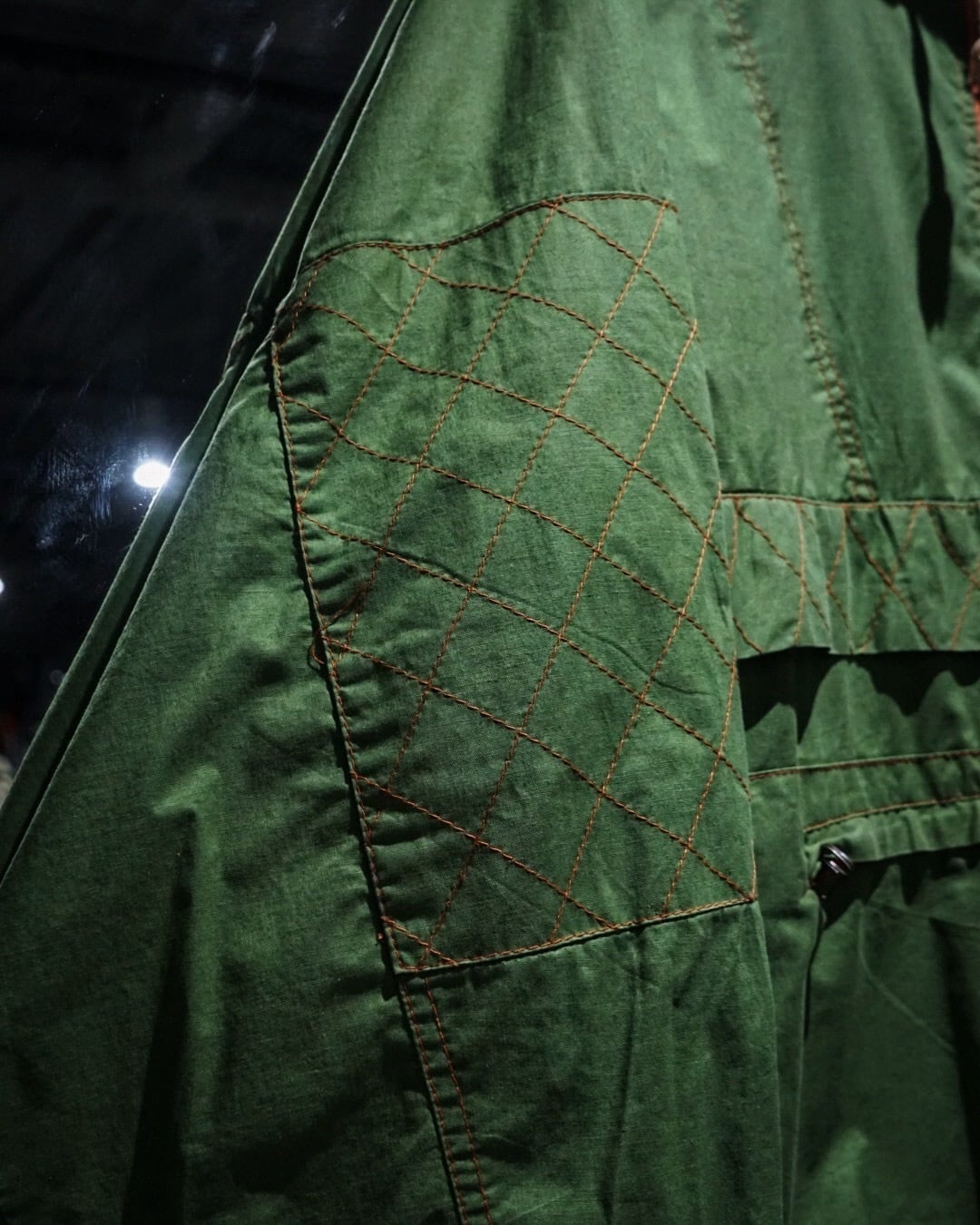アーム部分にはダイヤ状のキルティングステッチを施し、補強とデザインを兼ね備えたアクセントに。さらに裏地にはビビッドなオレンジカラーを採用したダブルフェイスで、表地のグリーンとのコントラストが非常に映える、作り込みの細やかさにも服好きの心がくすぐられます。