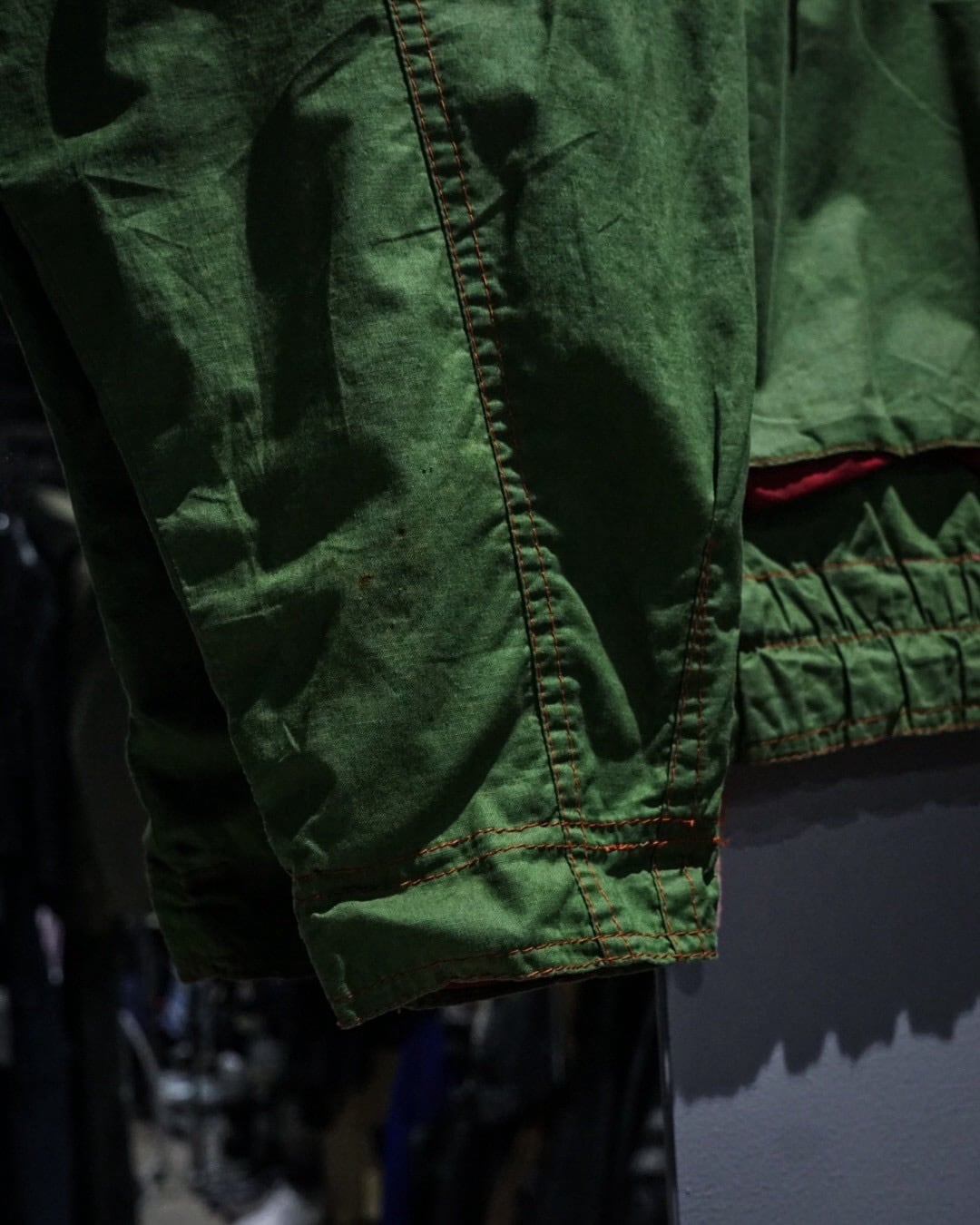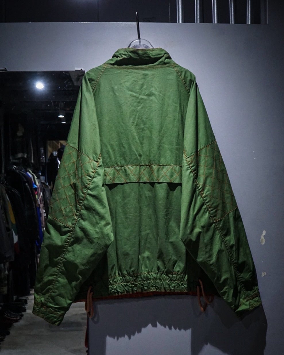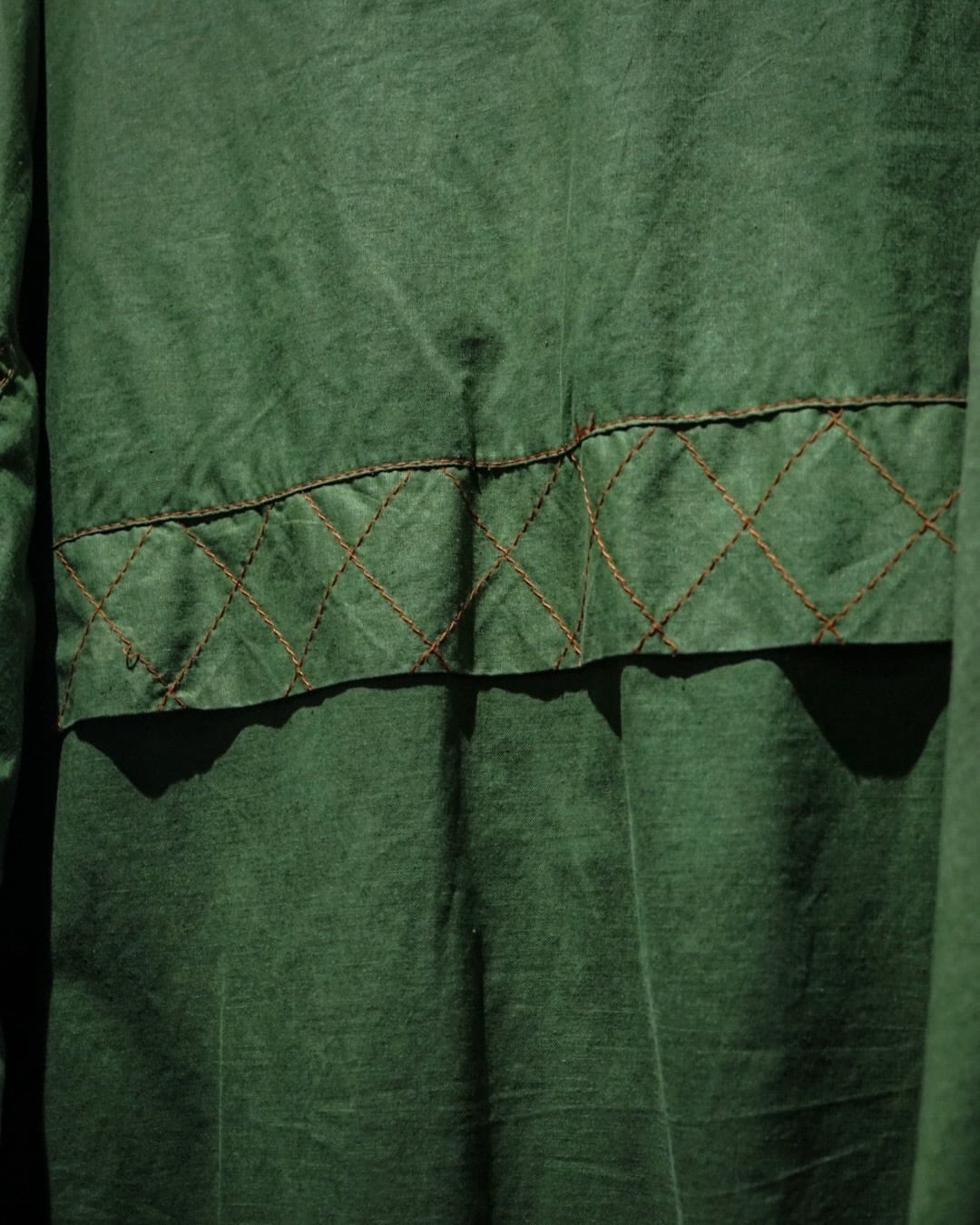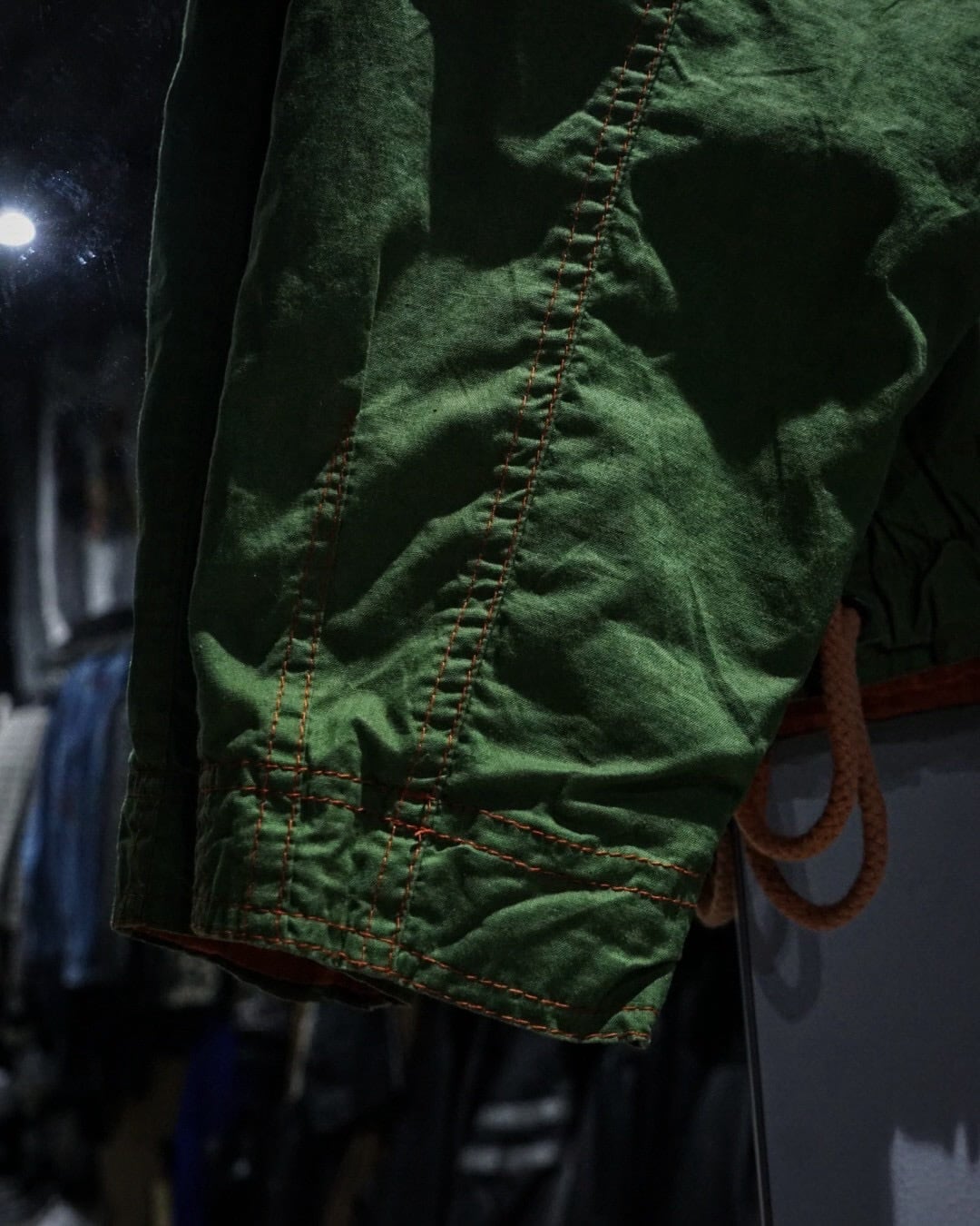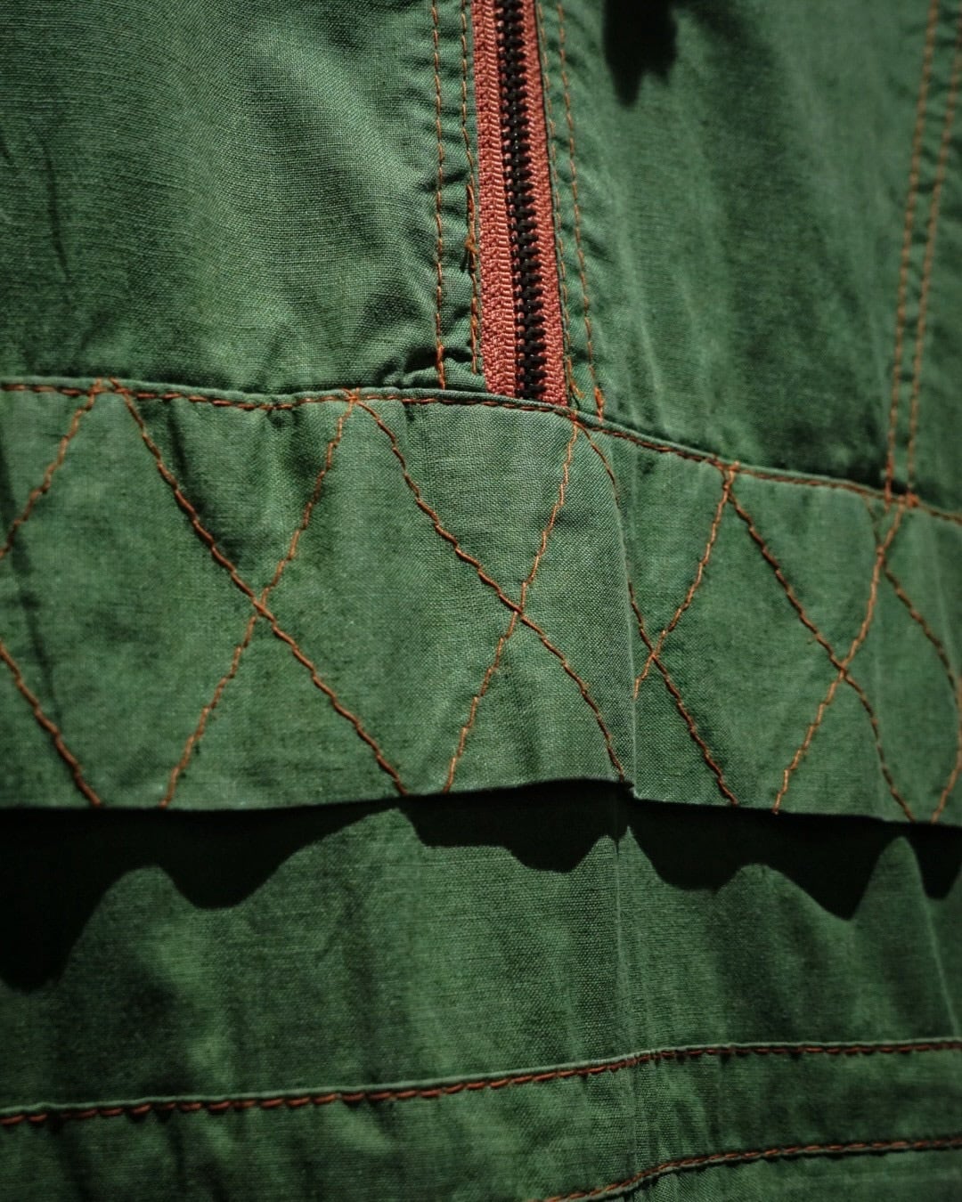 アーム部分にはダイヤ状のキルティングステッチを施し、補強とデザインを兼ね備えたアクセントに。さらに裏地にはビビッドなオレンジカラーを採用したダブルフェイスで、表地のグリーンとのコントラストが非常に映える、作り込みの細やかさにも服好きの心がくすぐられます。
