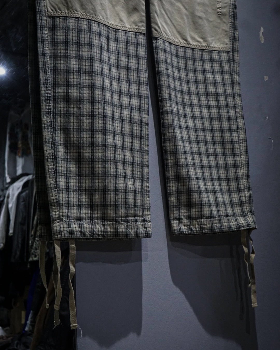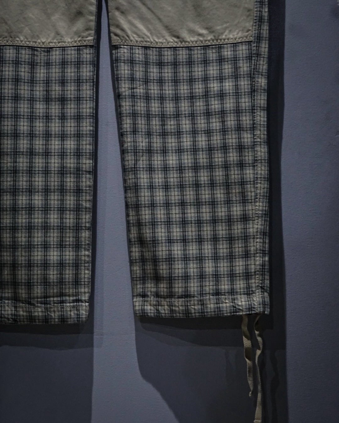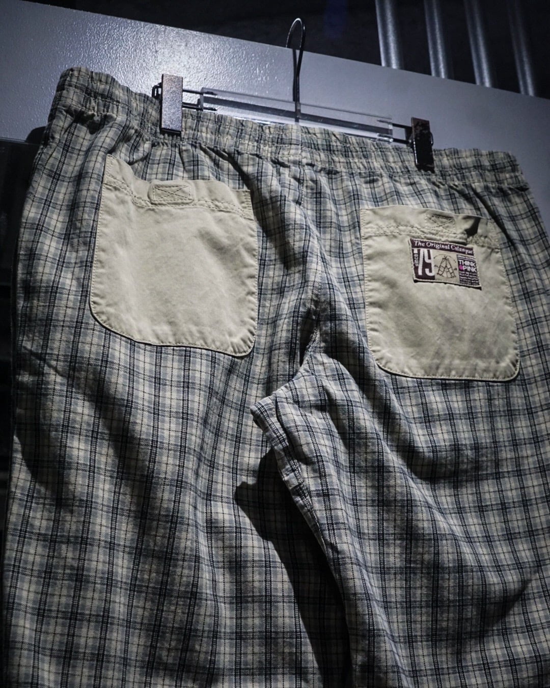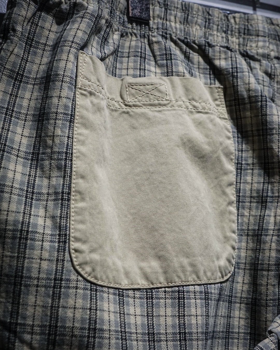 最大の特徴は膝部分に施されたダブルニー仕様。ベージュの切り替えで補強されたワークウェア由来のディテールながら、チェックとの組み合わせによってどこか都会的な印象に仕上がっています。さらにバックポケットにも同様の切り替えを配置し、全体のデザインバランスを整えた作り込みも秀逸。