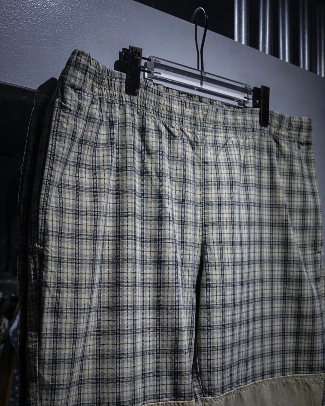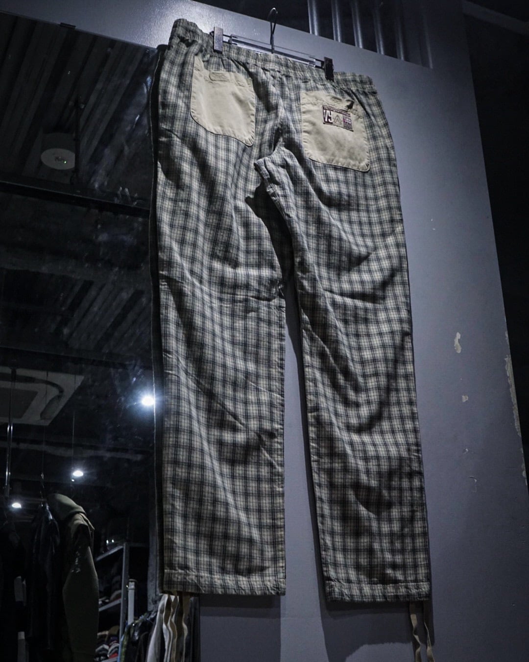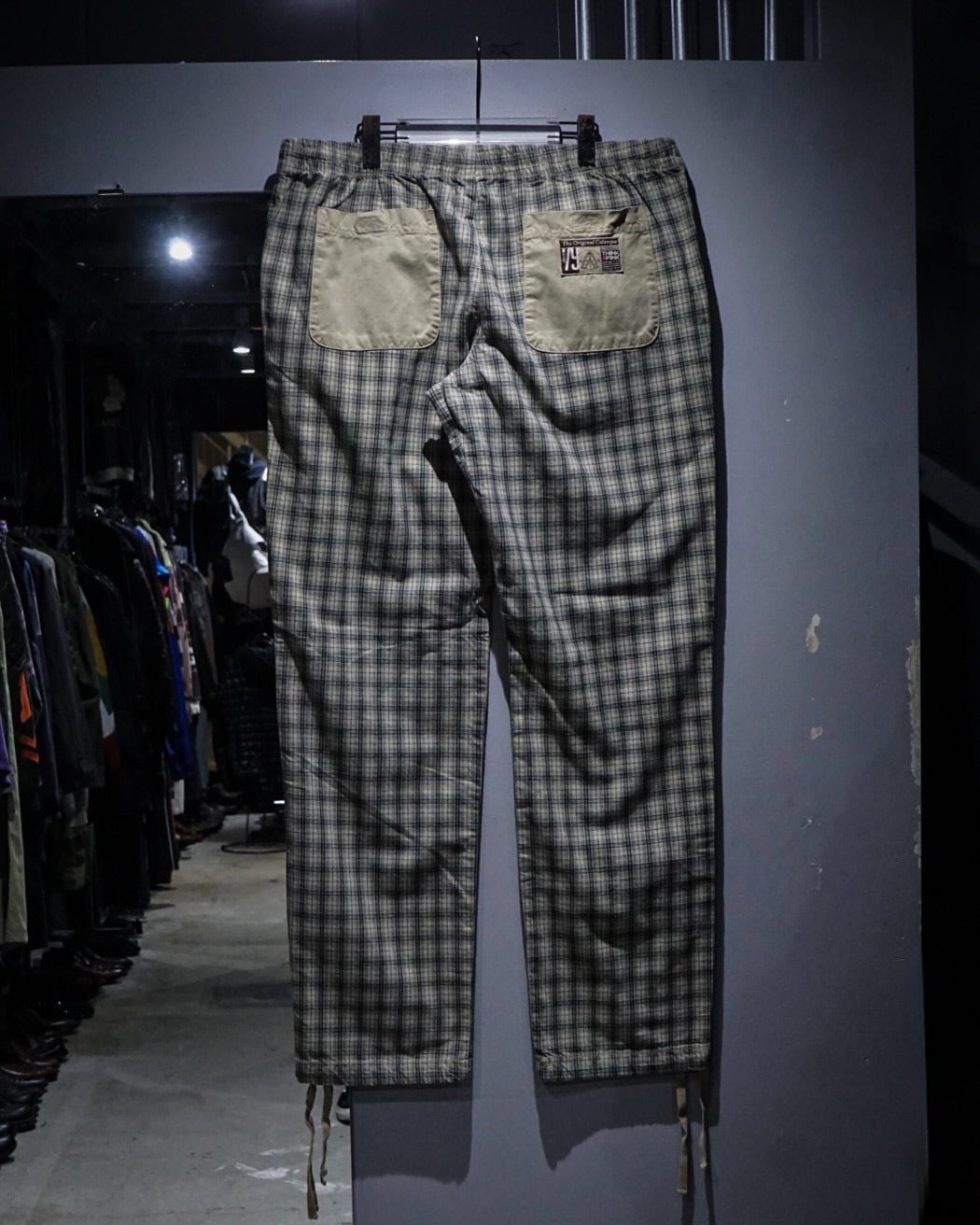 最大の特徴は膝部分に施されたダブルニー仕様。ベージュの切り替えで補強されたワークウェア由来のディテールながら、チェックとの組み合わせによってどこか都会的な印象に仕上がっています。さらにバックポケットにも同様の切り替えを配置し、全体のデザインバランスを整えた作り込みも秀逸。