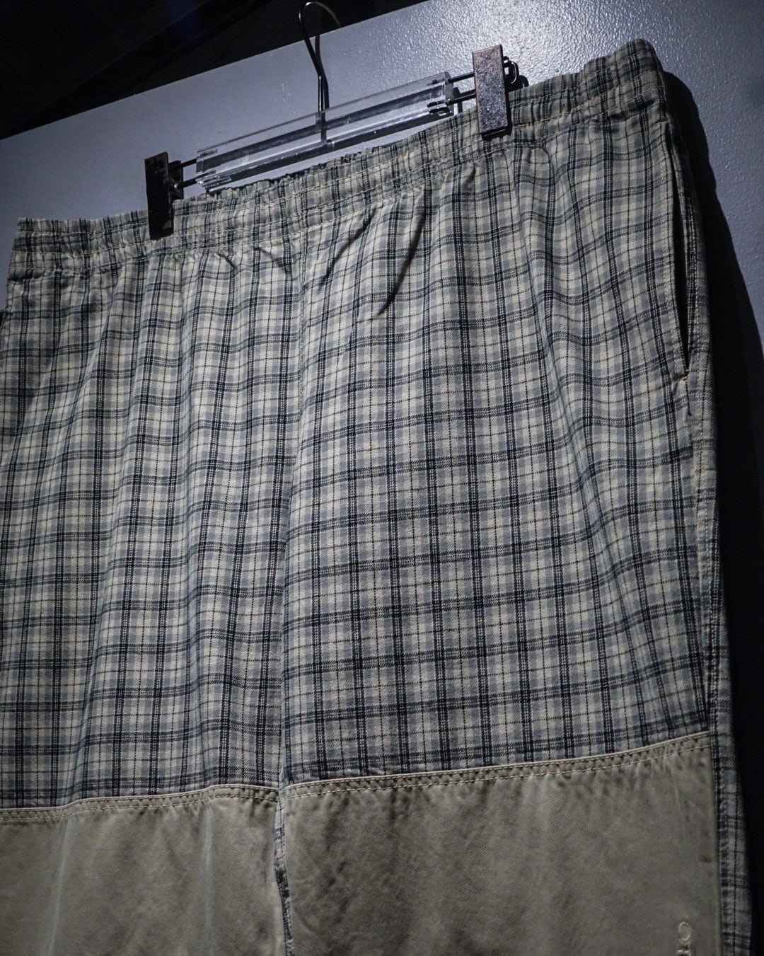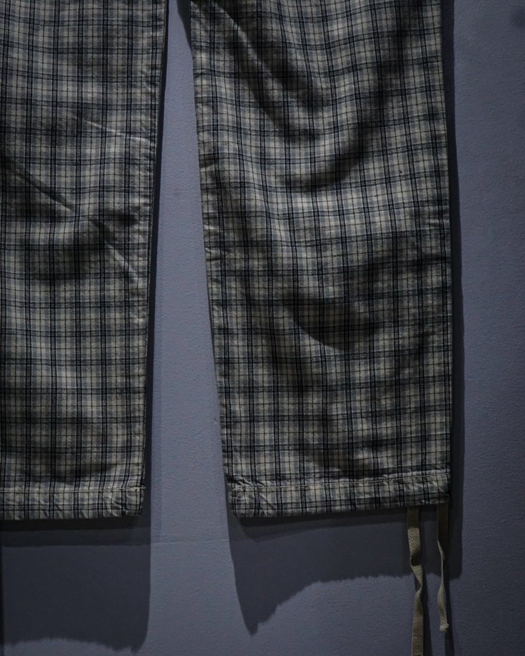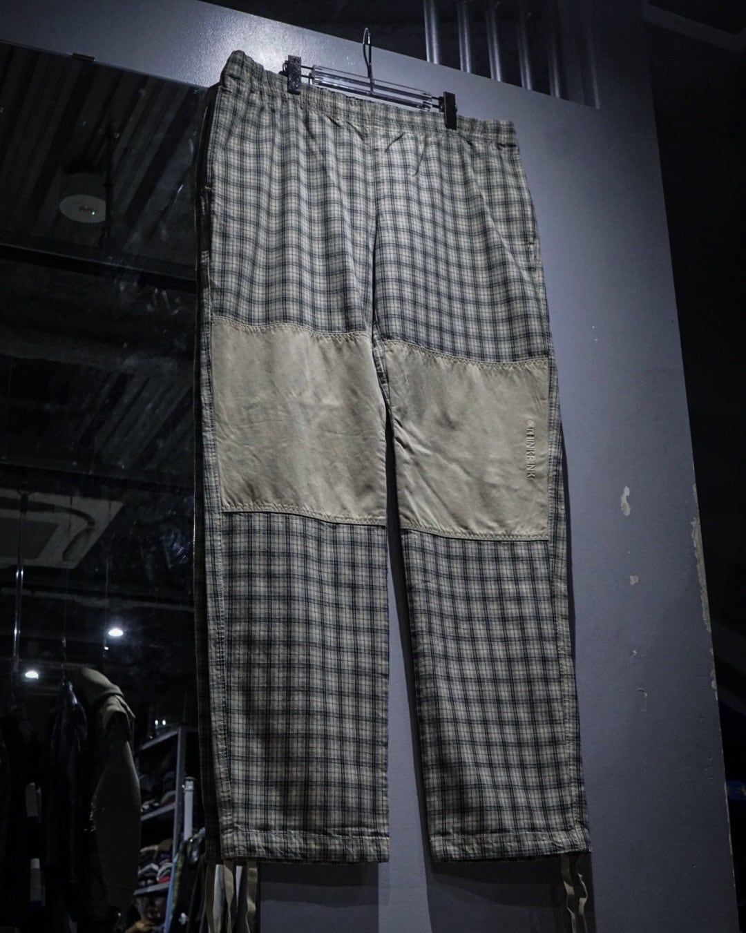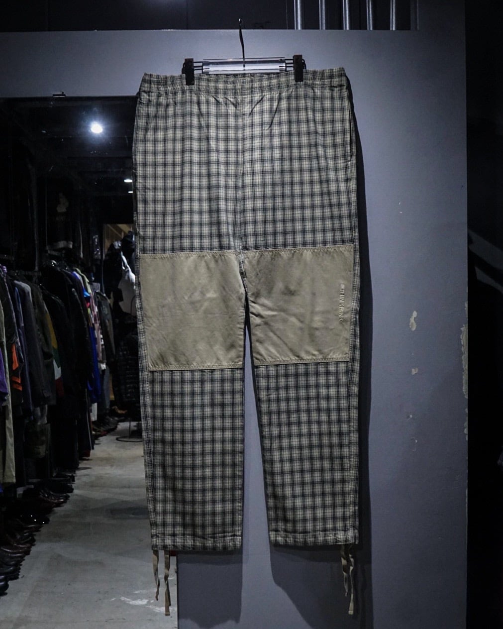 最大の特徴は膝部分に施されたダブルニー仕様。ベージュの切り替えで補強されたワークウェア由来のディテールながら、チェックとの組み合わせによってどこか都会的な印象に仕上がっています。さらにバックポケットにも同様の切り替えを配置し、全体のデザインバランスを整えた作り込みも秀逸。