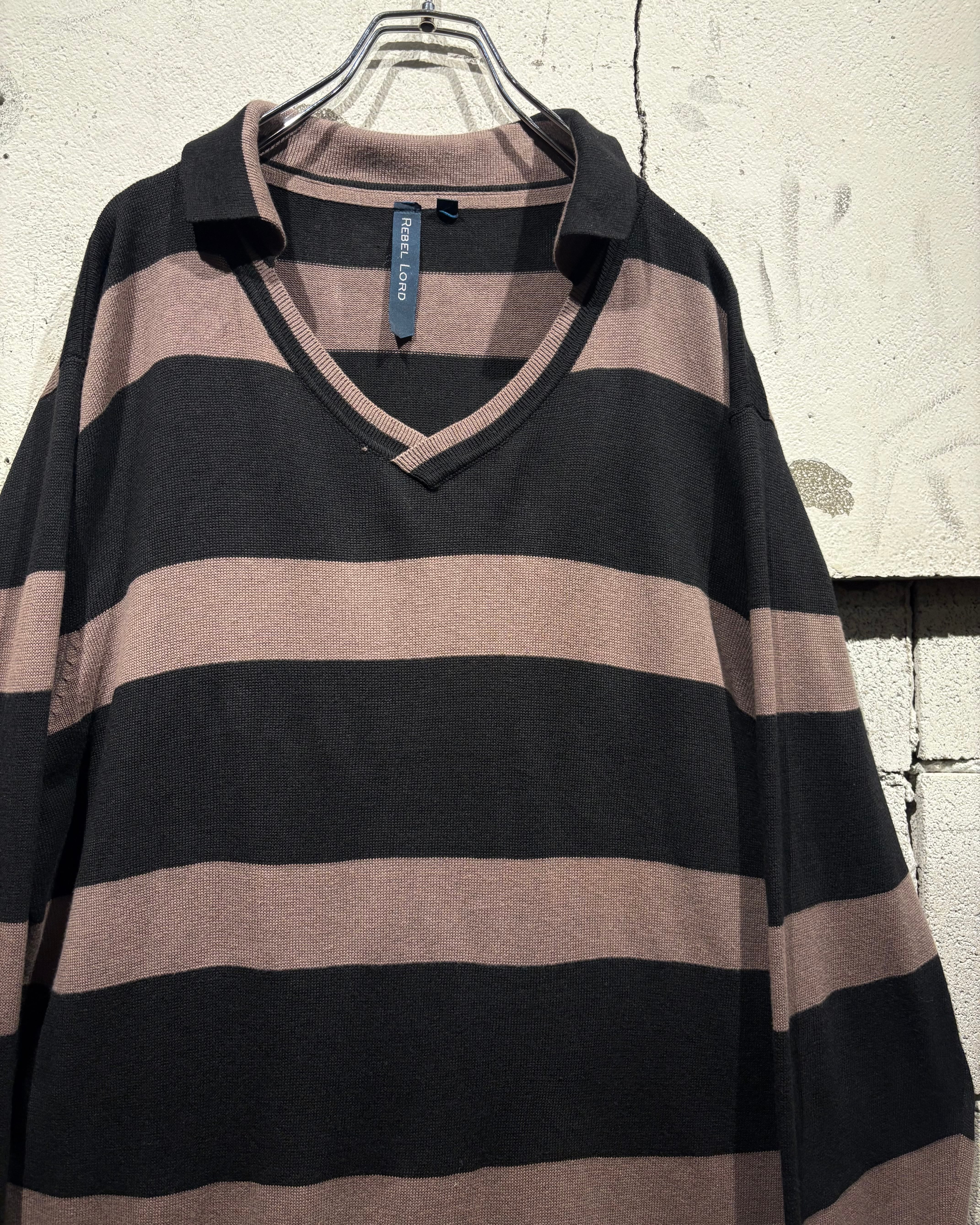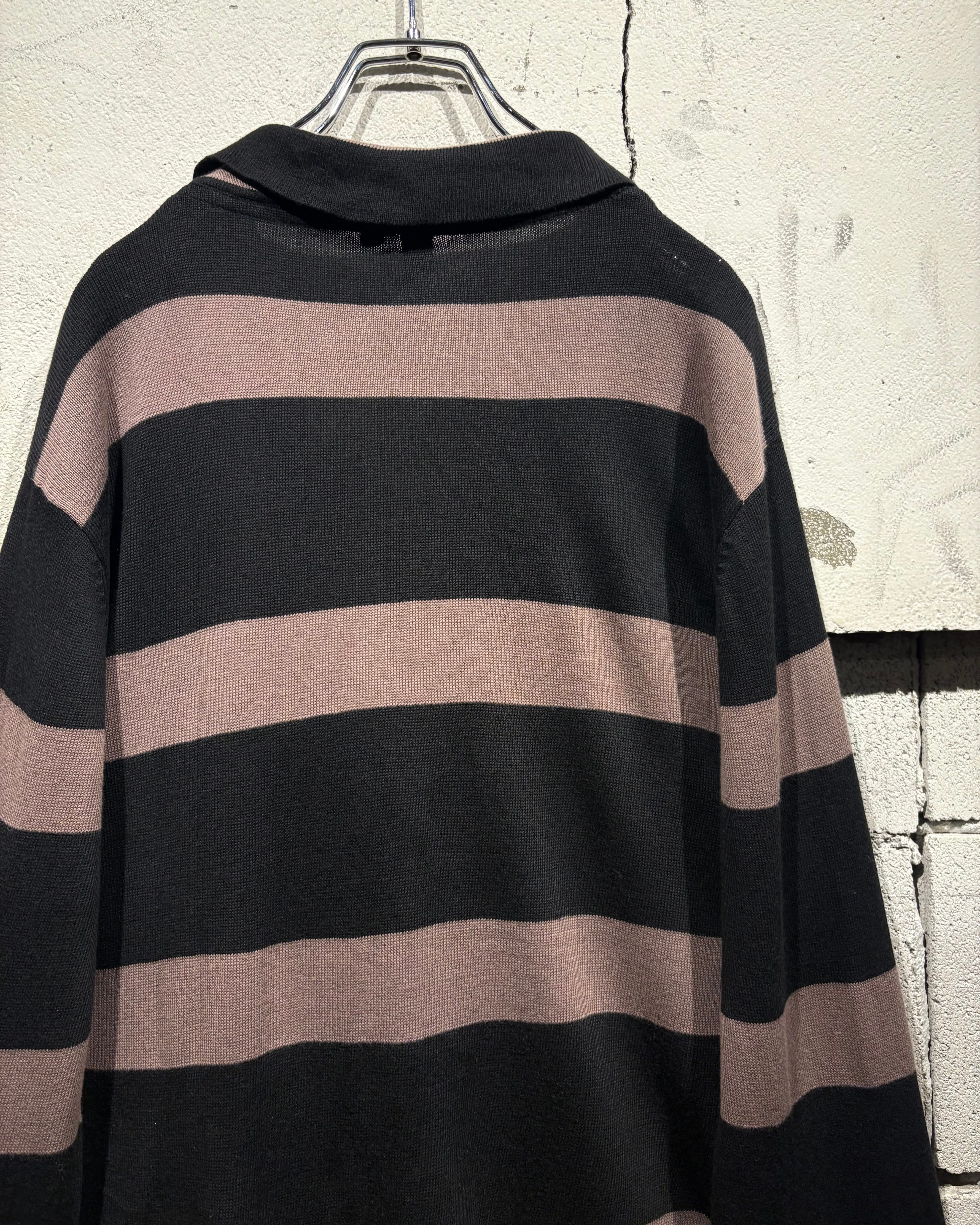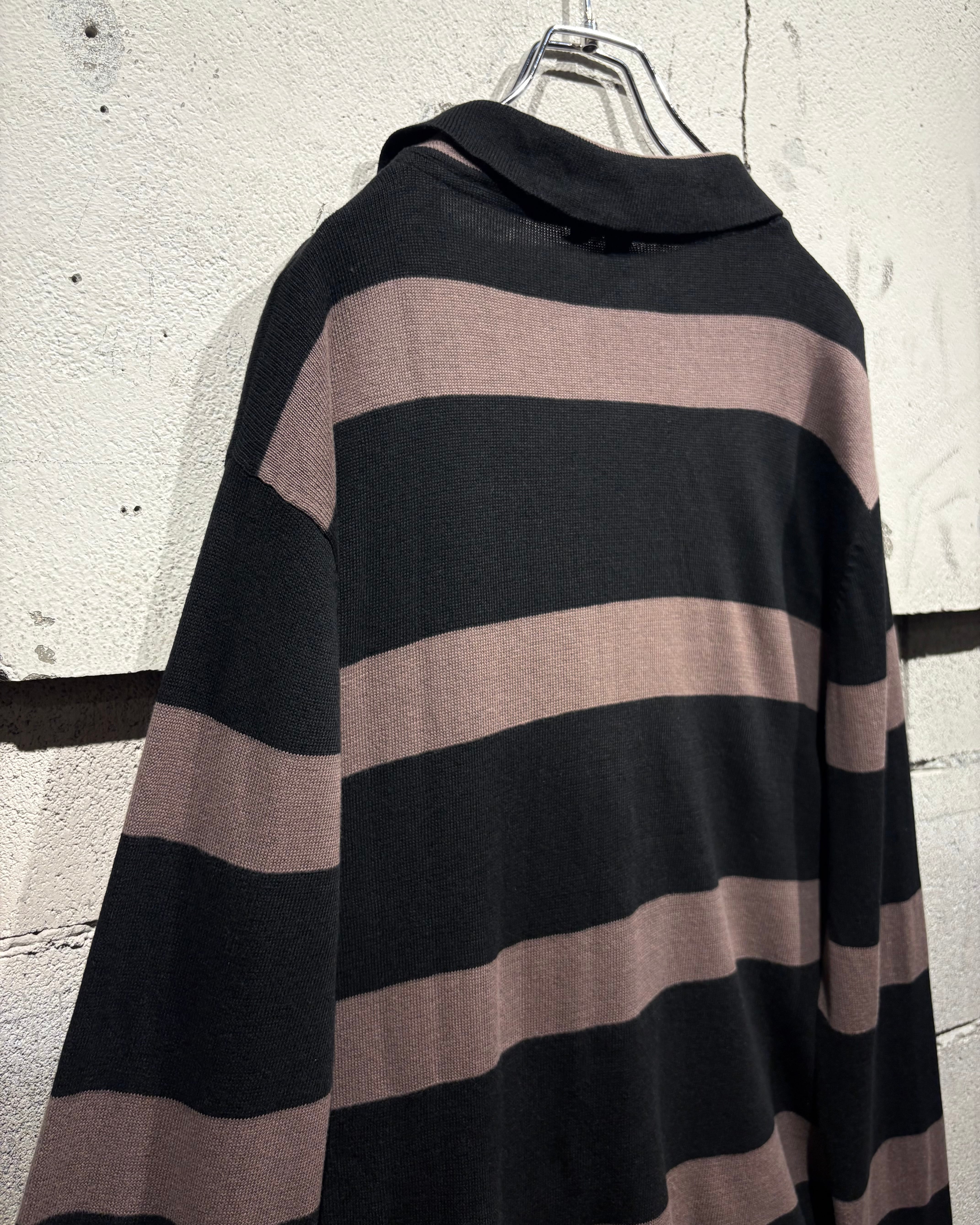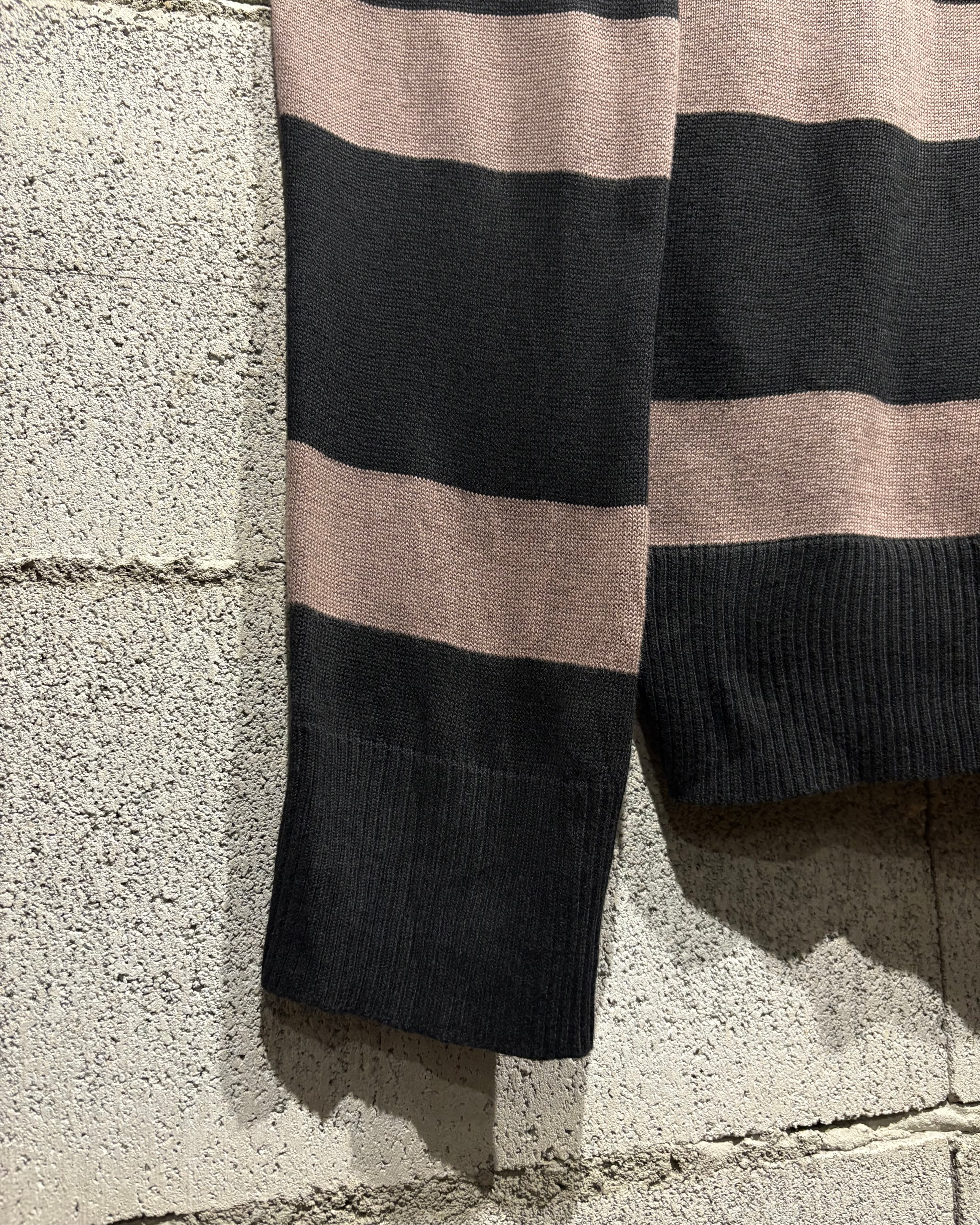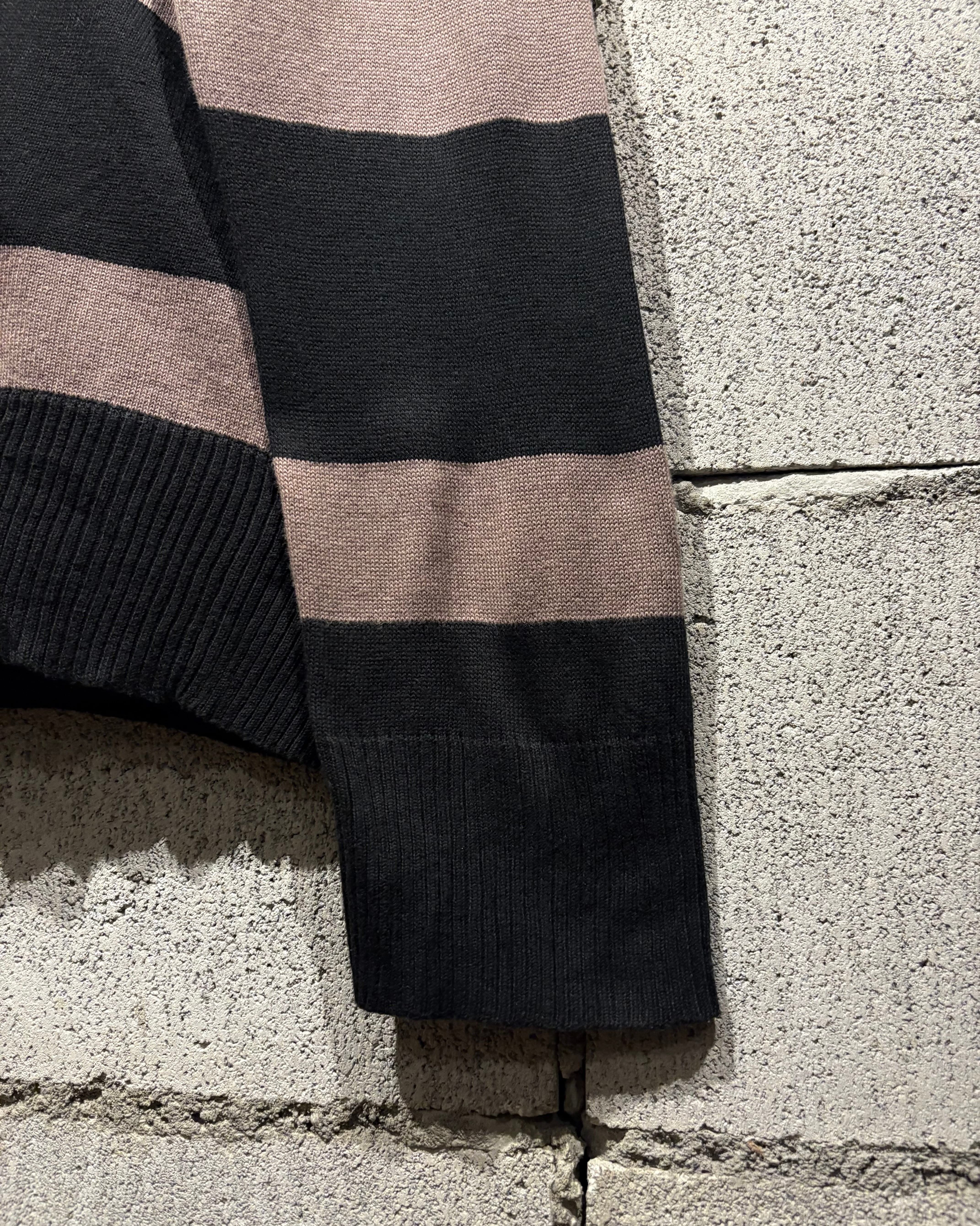 ブラックをベースにブラウンがかったスモーキーなカラーを組み合わせたボーダーパターンで、太めのピッチで表現されたボーダーがインパクトを持ちながらも、落ち着いた色味によってスタイリングに馴染みやすい仕上がりとなっています。