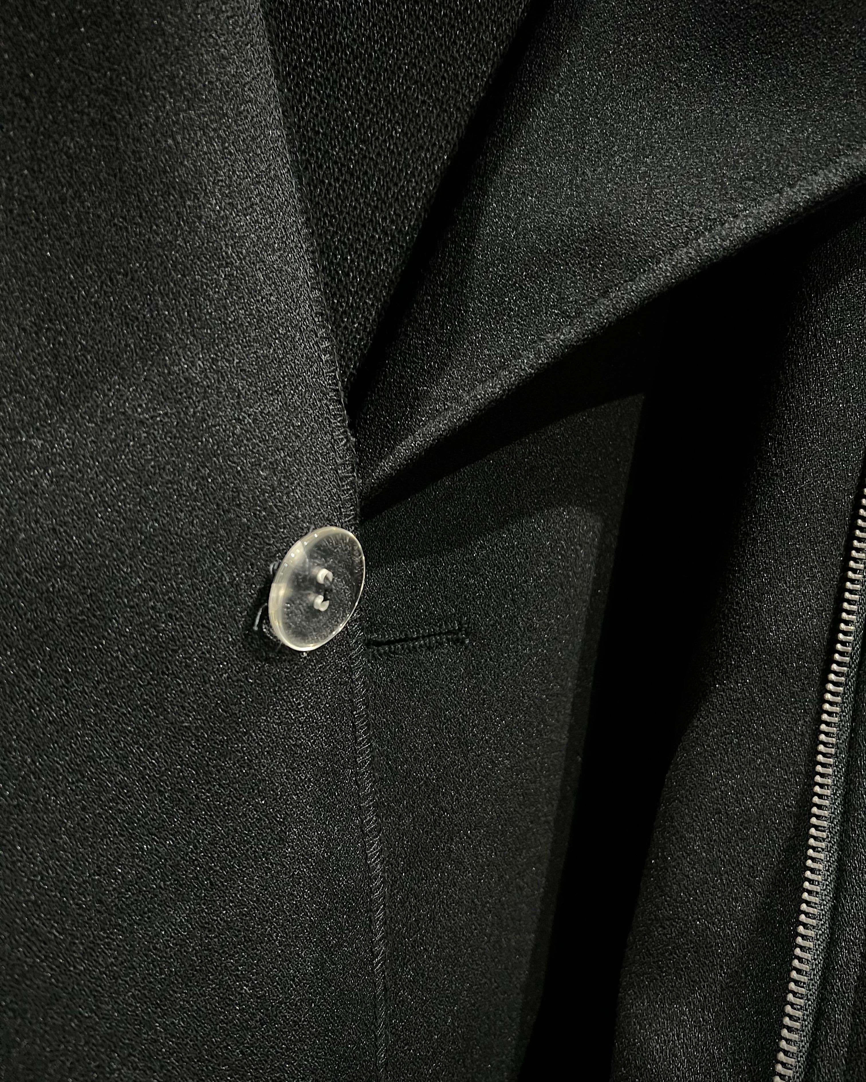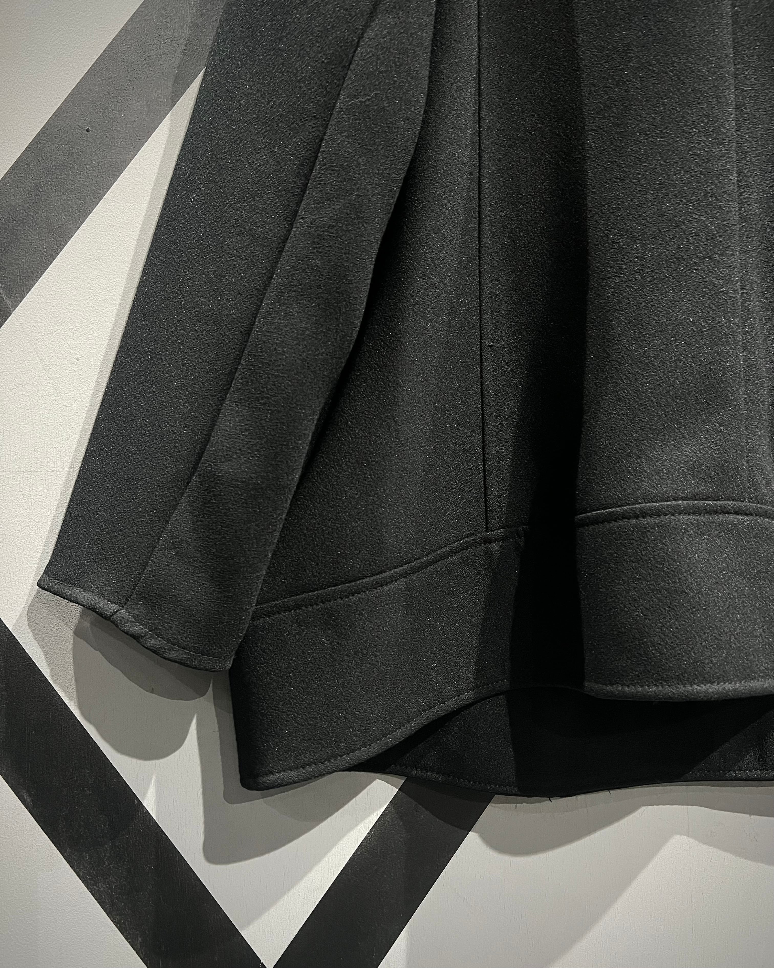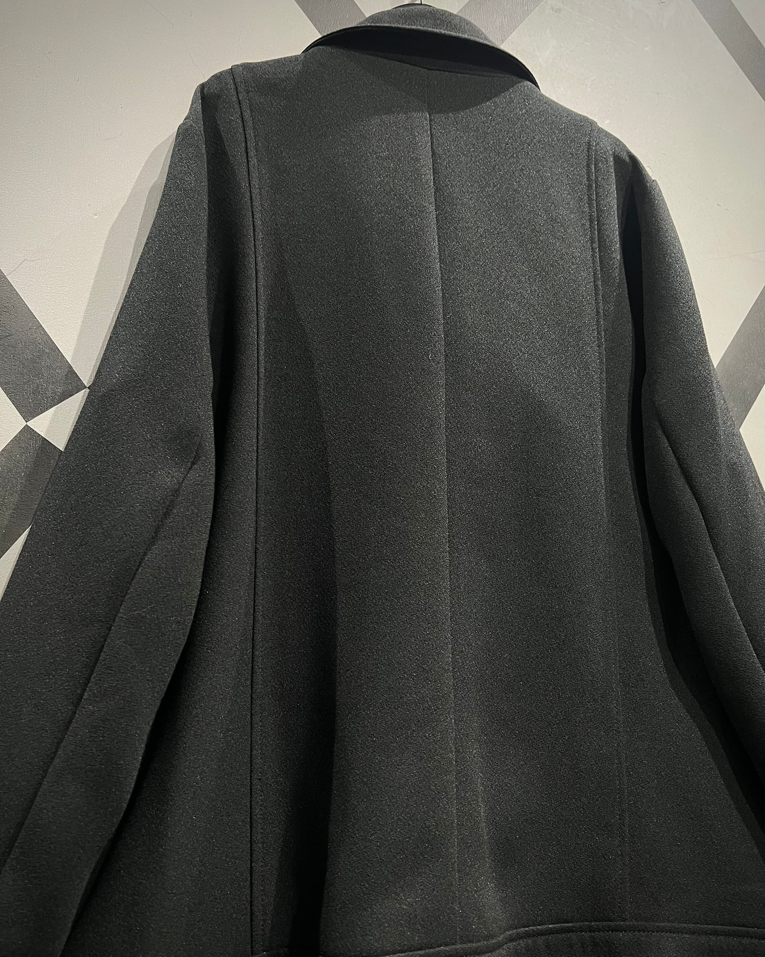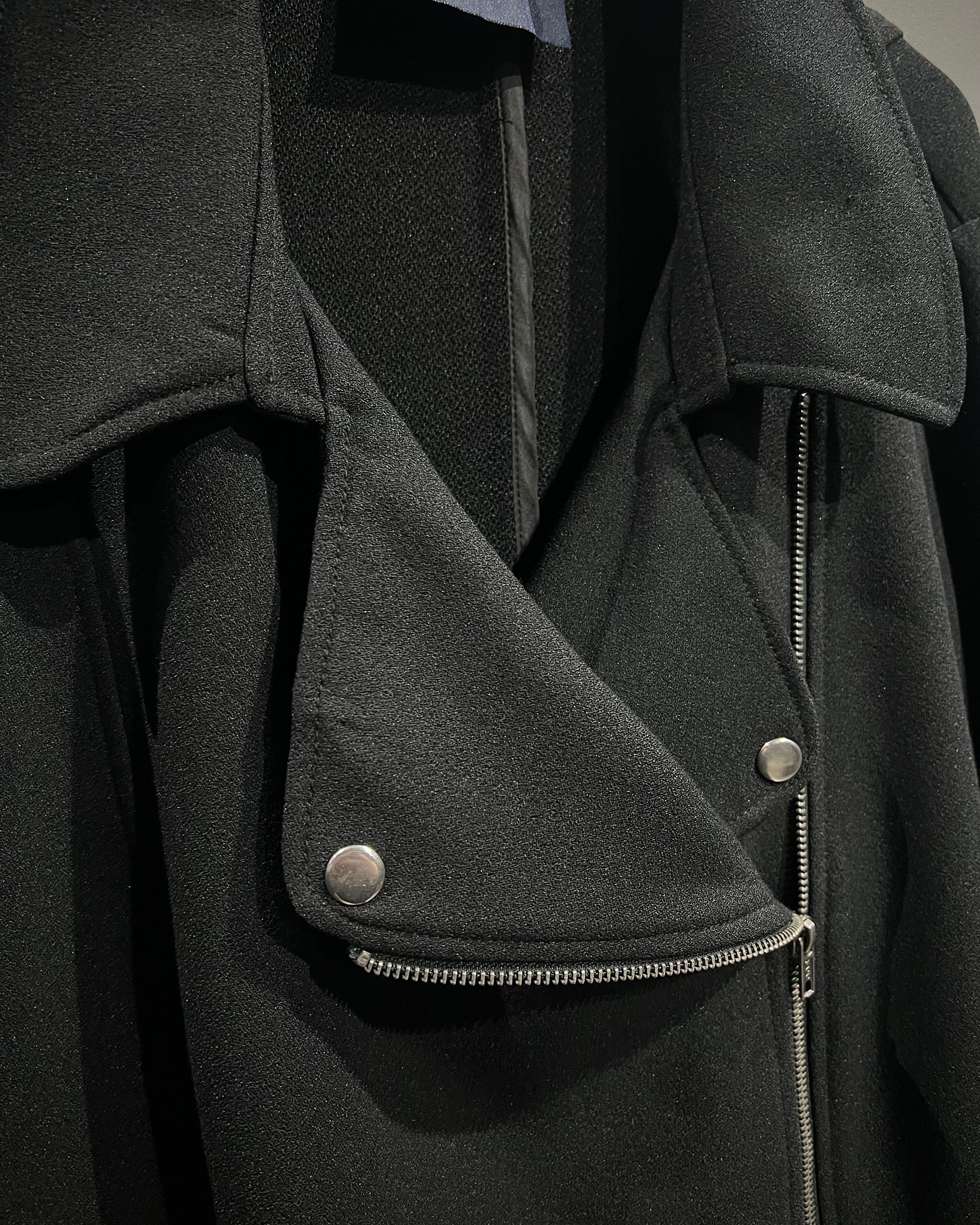 大ぶりのラペルにアシンメトリーに走るジップ、スナップなど、ライダース特有のディテールをしっかりと踏襲しながらも、素材感によって洗練された印象に。