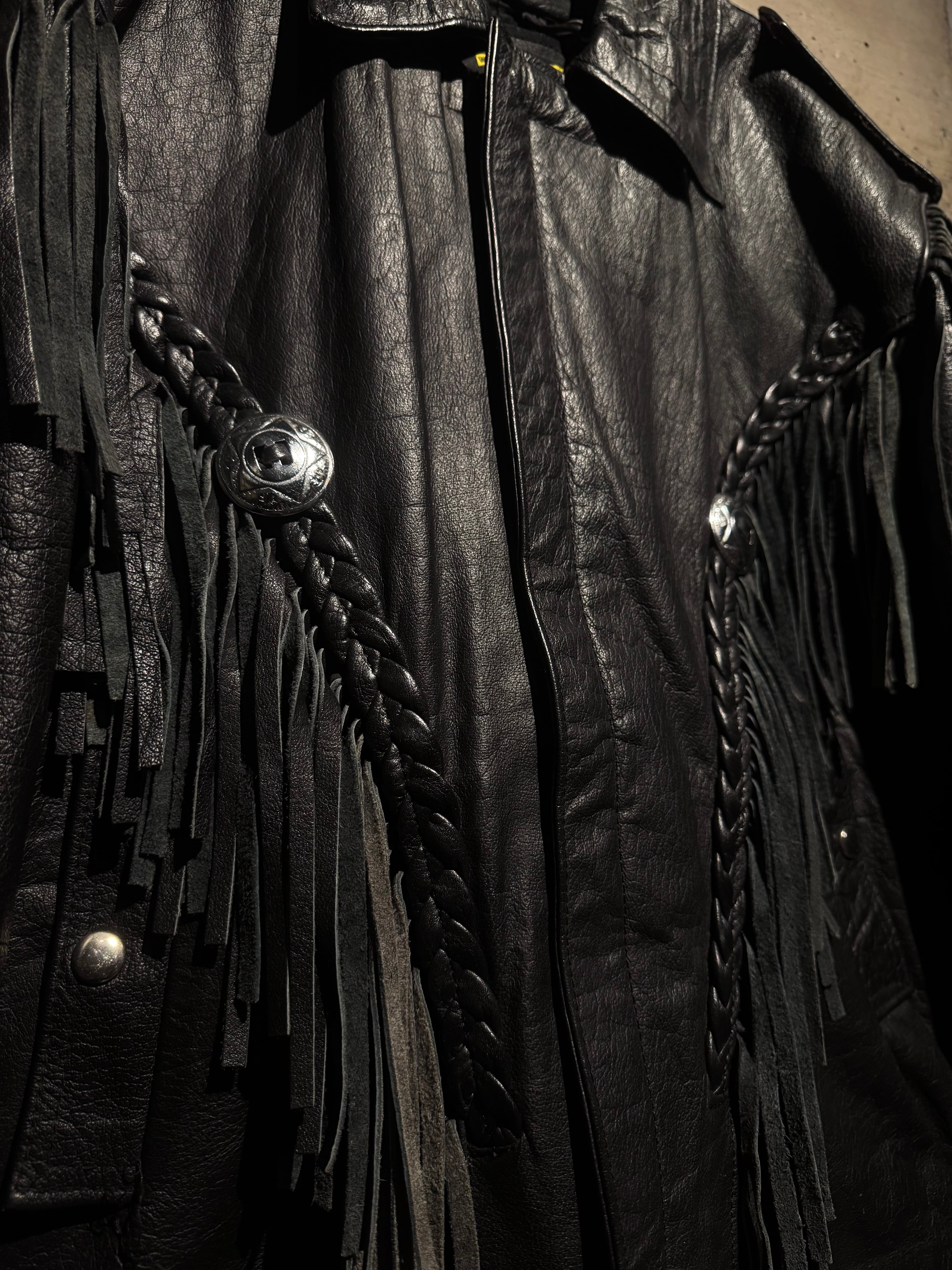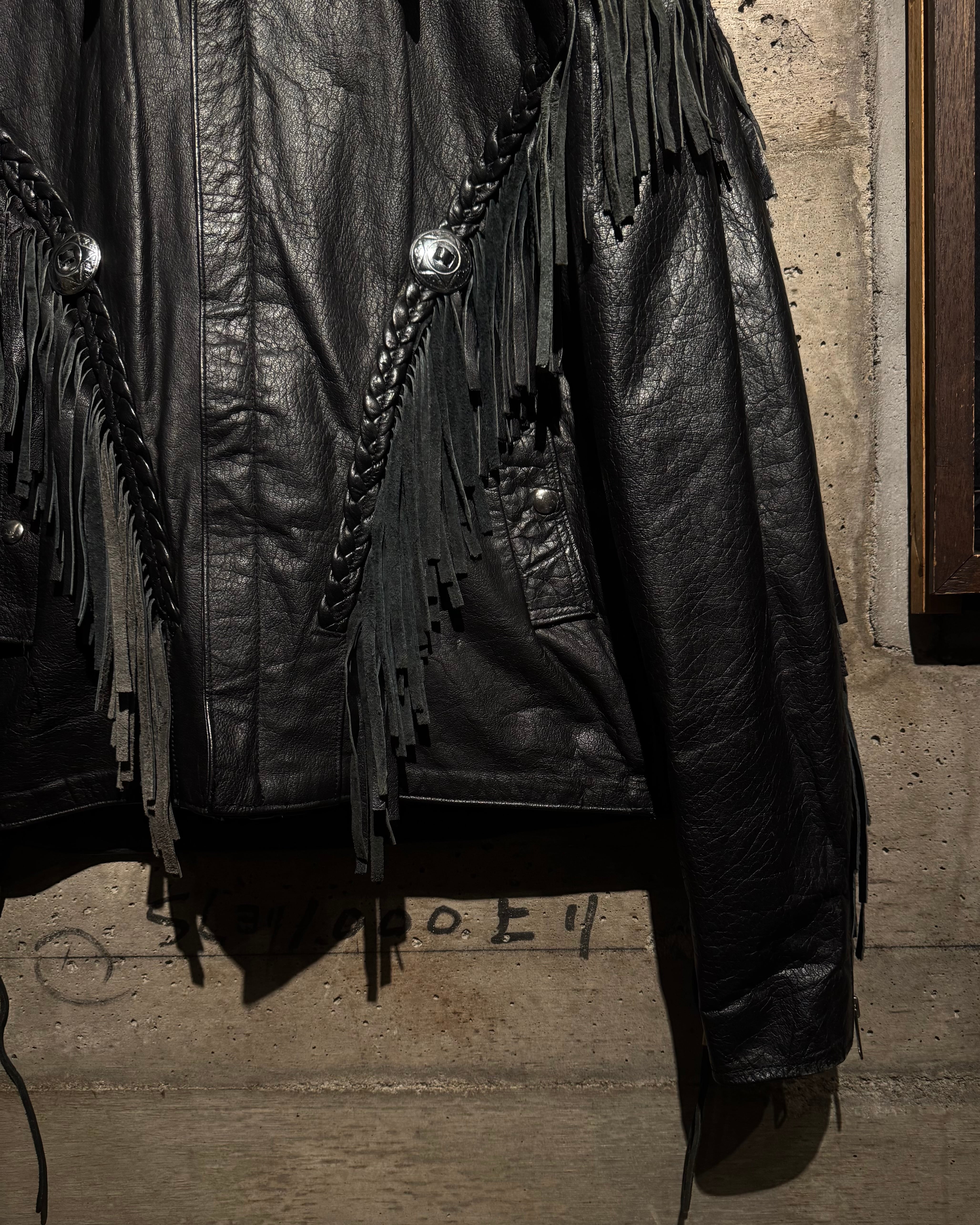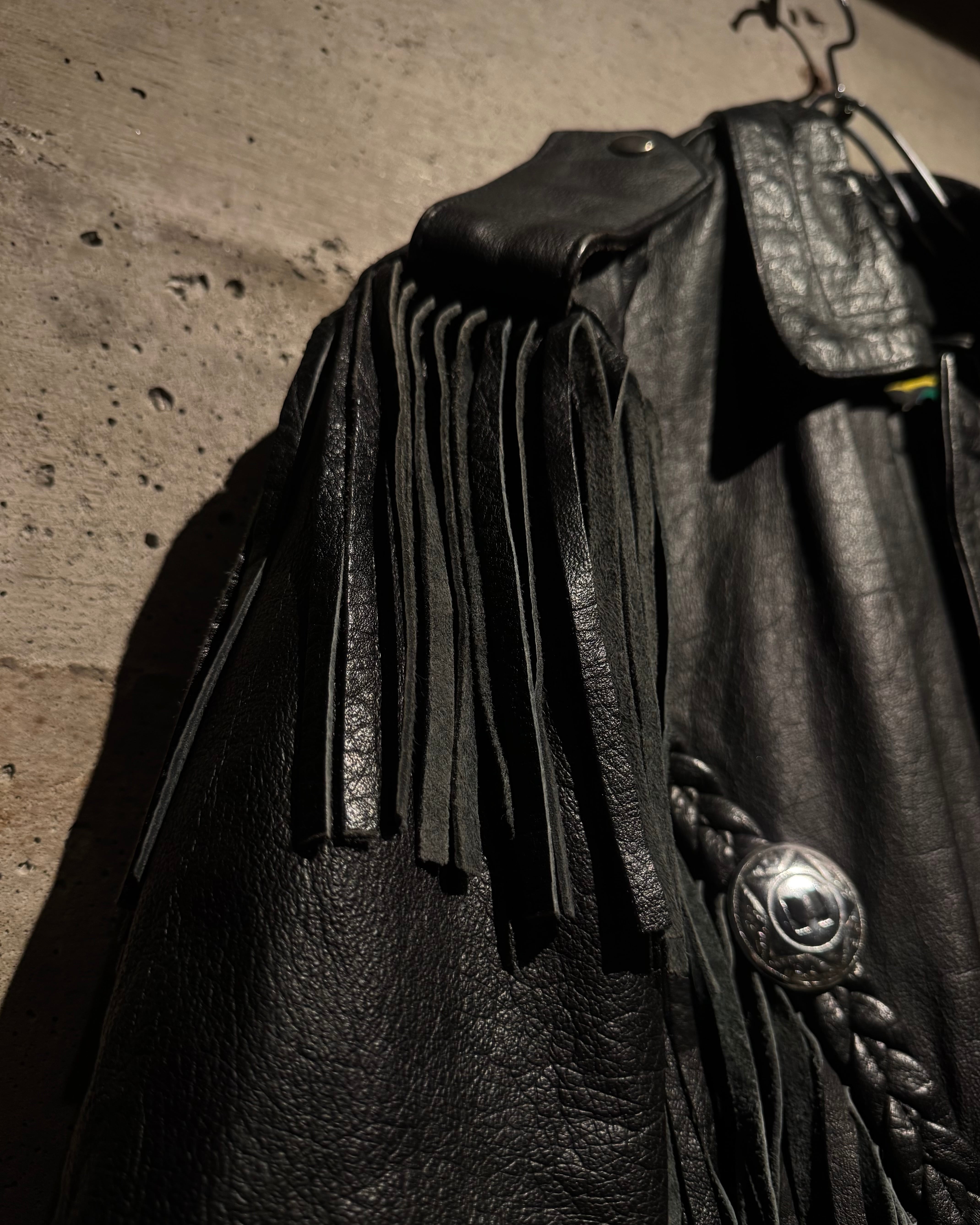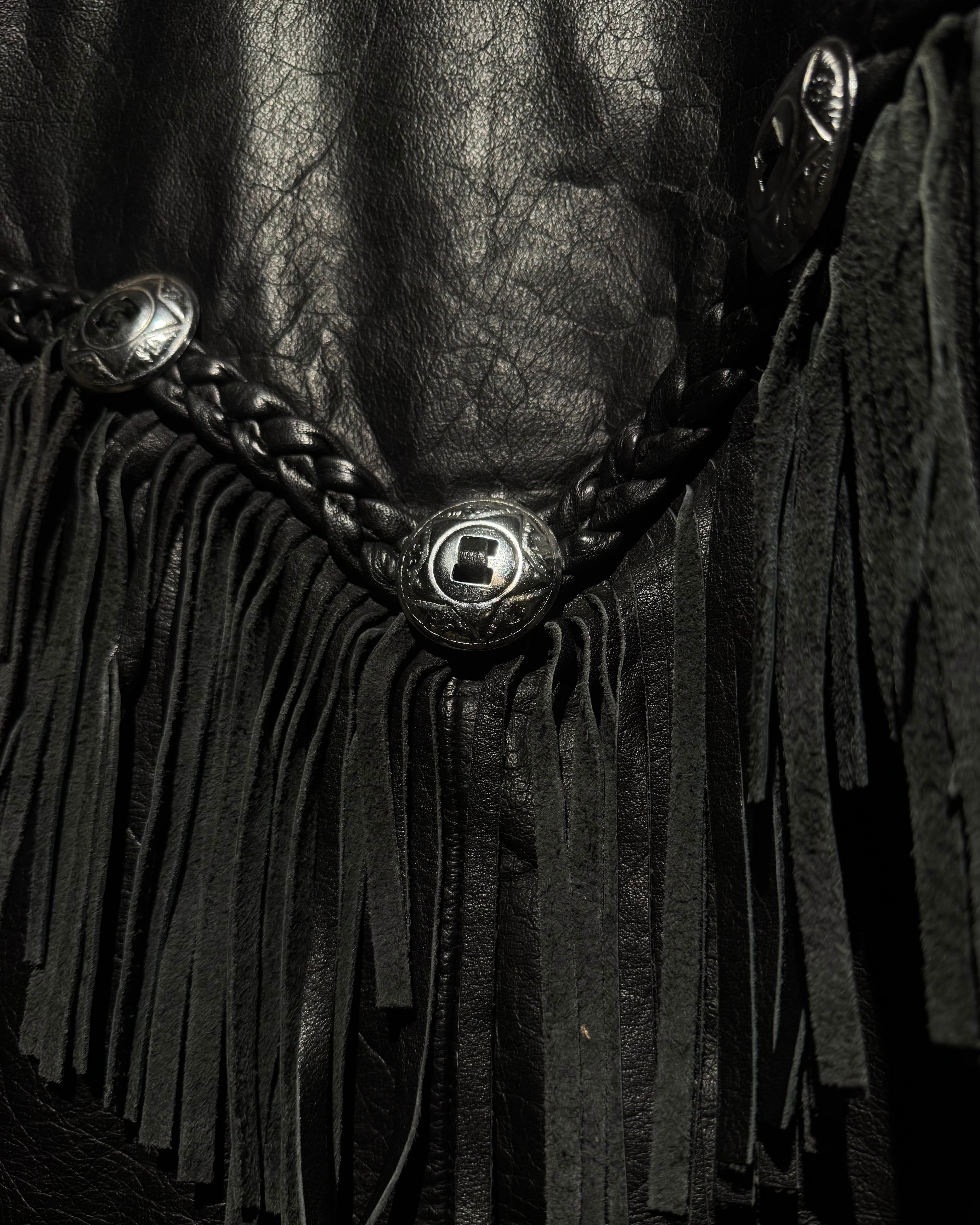 重厚なブラックレザーをボディに使用し、フロントから袖、背面にかけて施された大胆なフリンジ、レザーブレードとコンチョボタンを組み合わせたウエスタンディテールが抜群の存在感を放ちます。