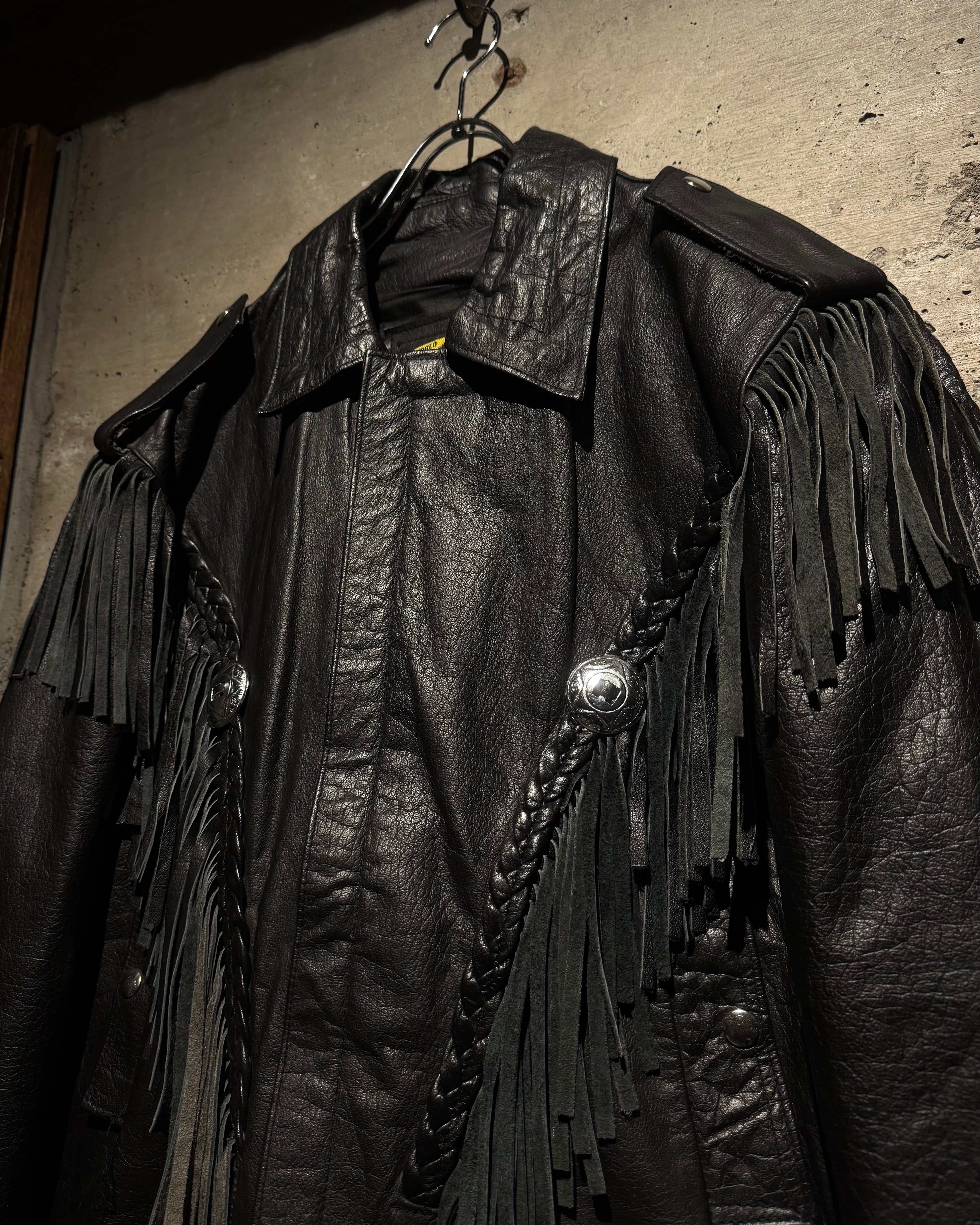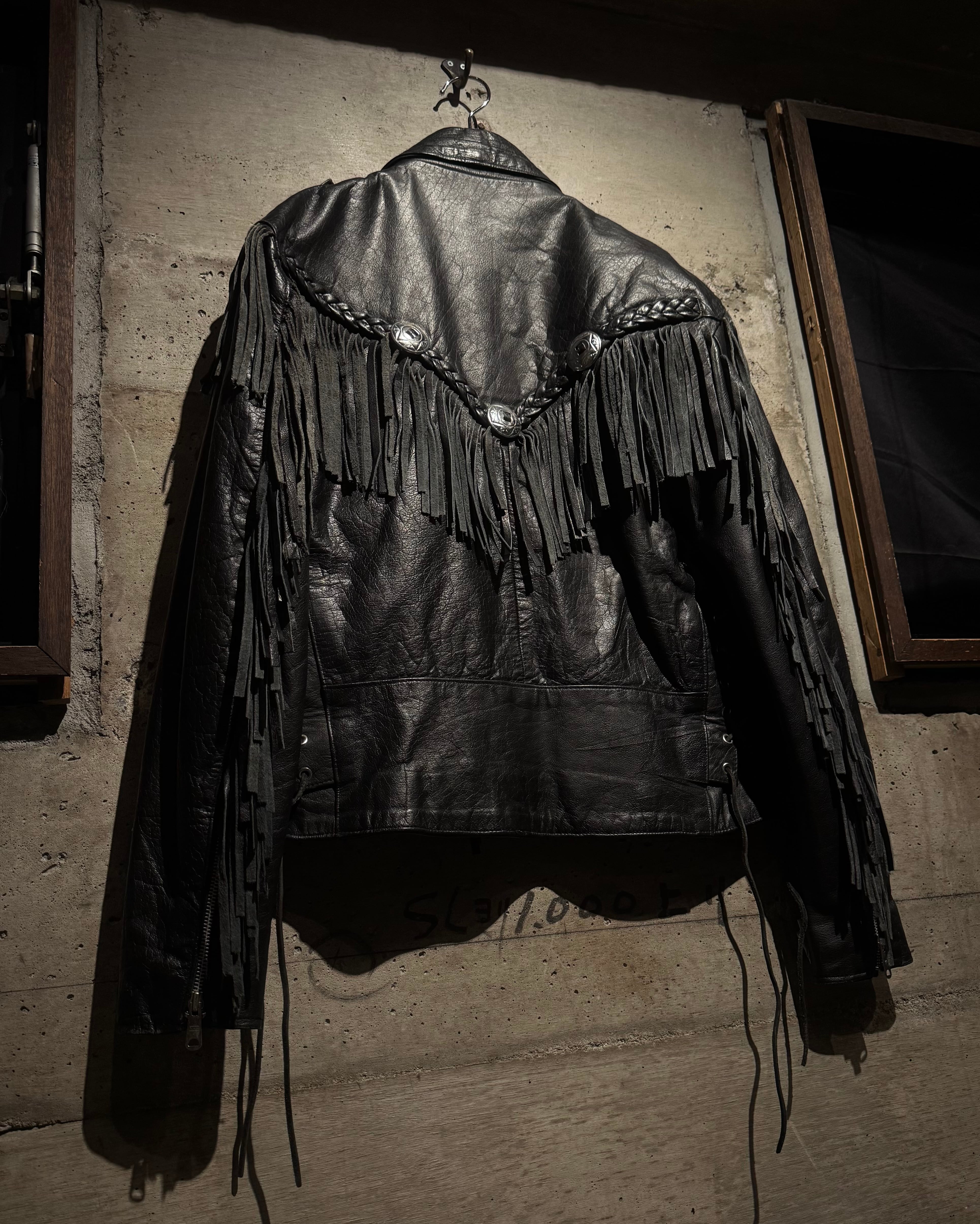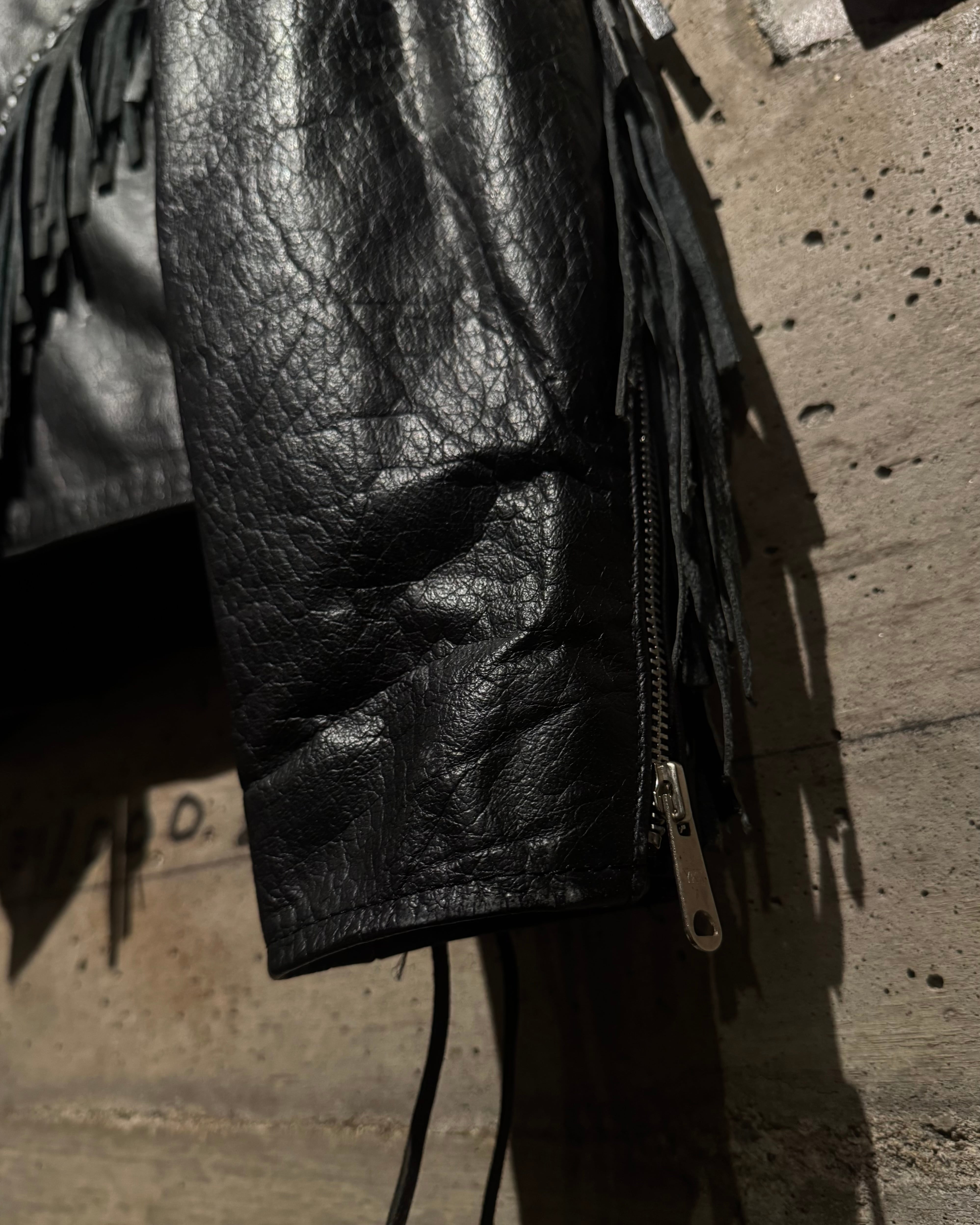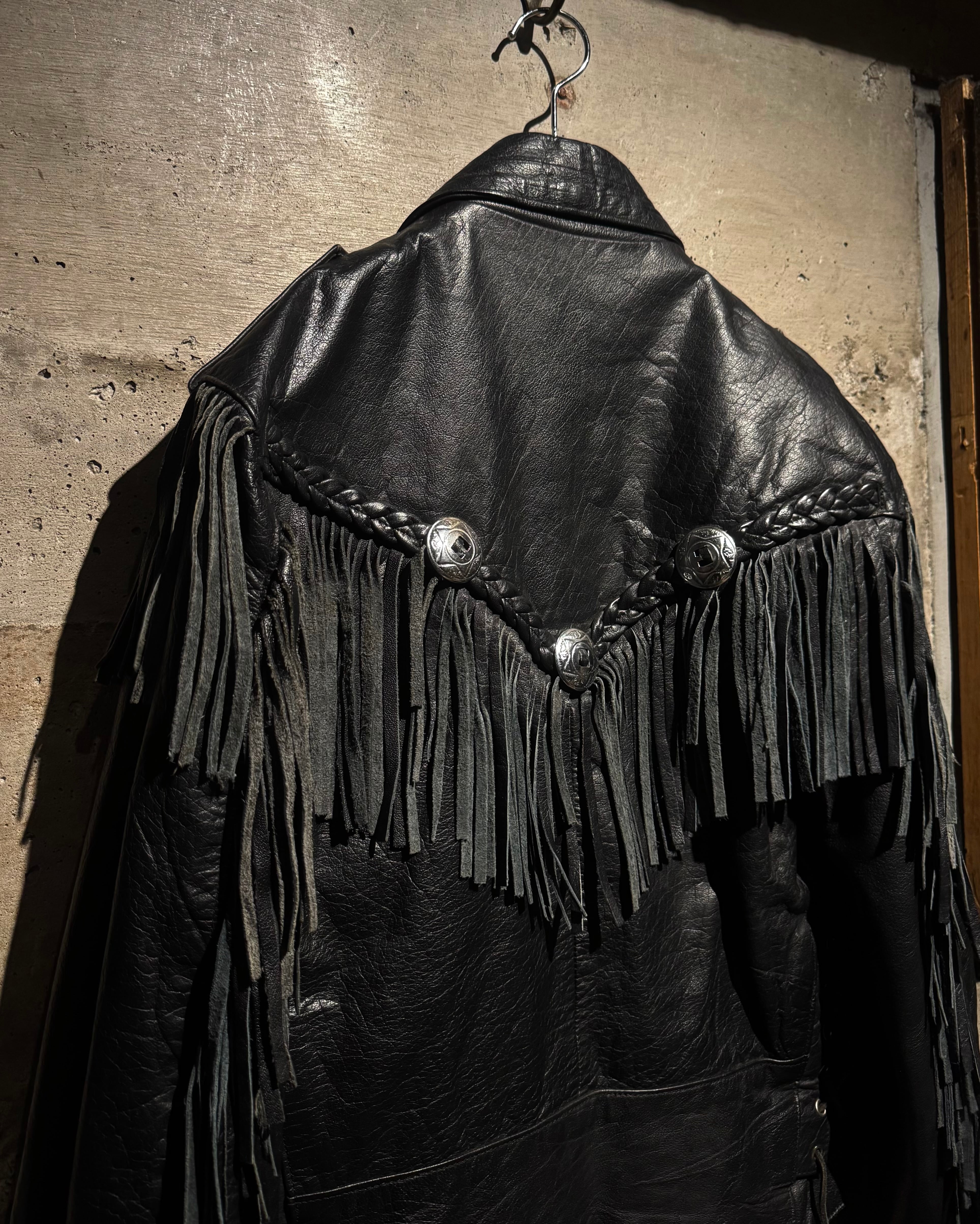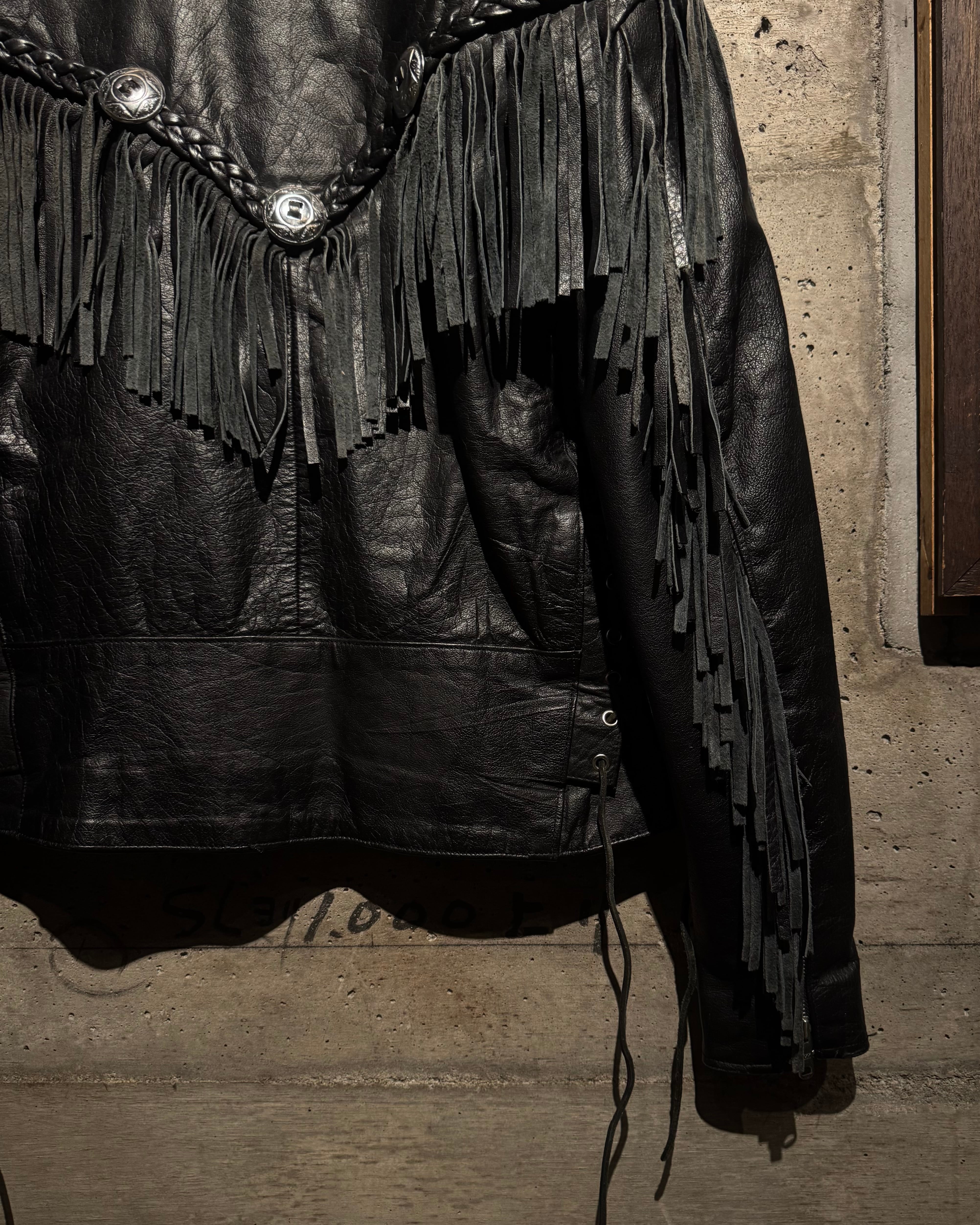 重厚なブラックレザーをボディに使用し、フロントから袖、背面にかけて施された大胆なフリンジ、レザーブレードとコンチョボタンを組み合わせたウエスタンディテールが抜群の存在感を放ちます。