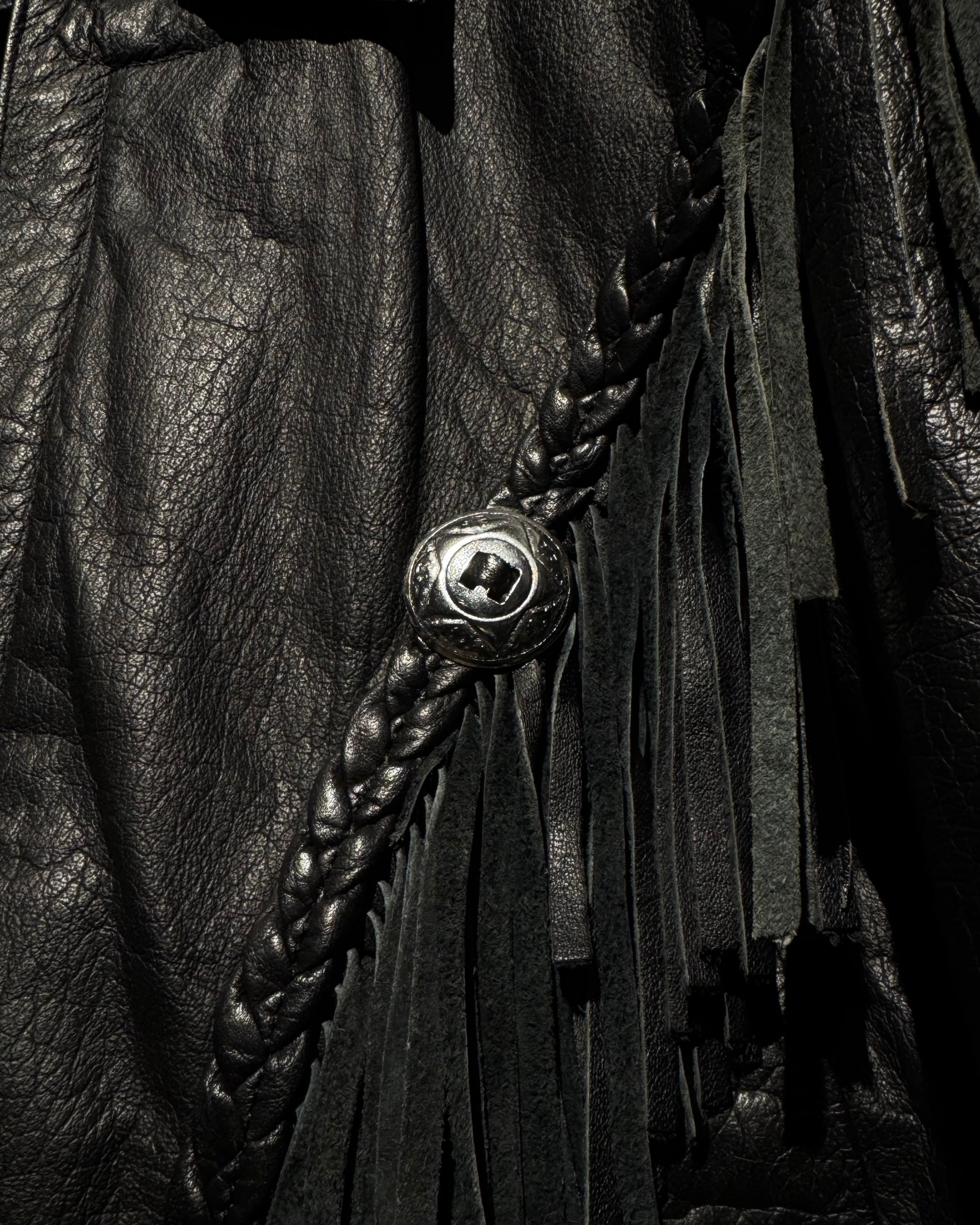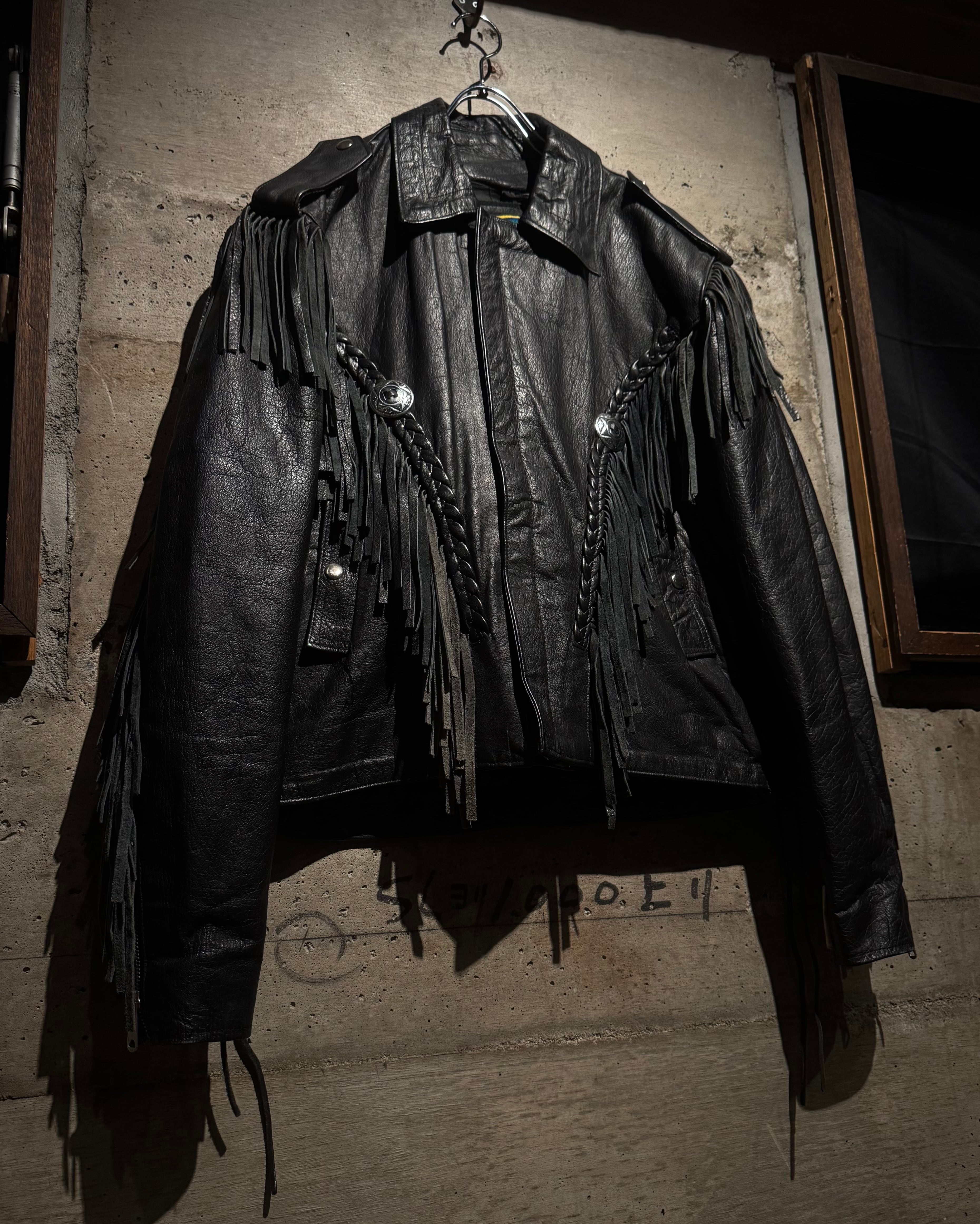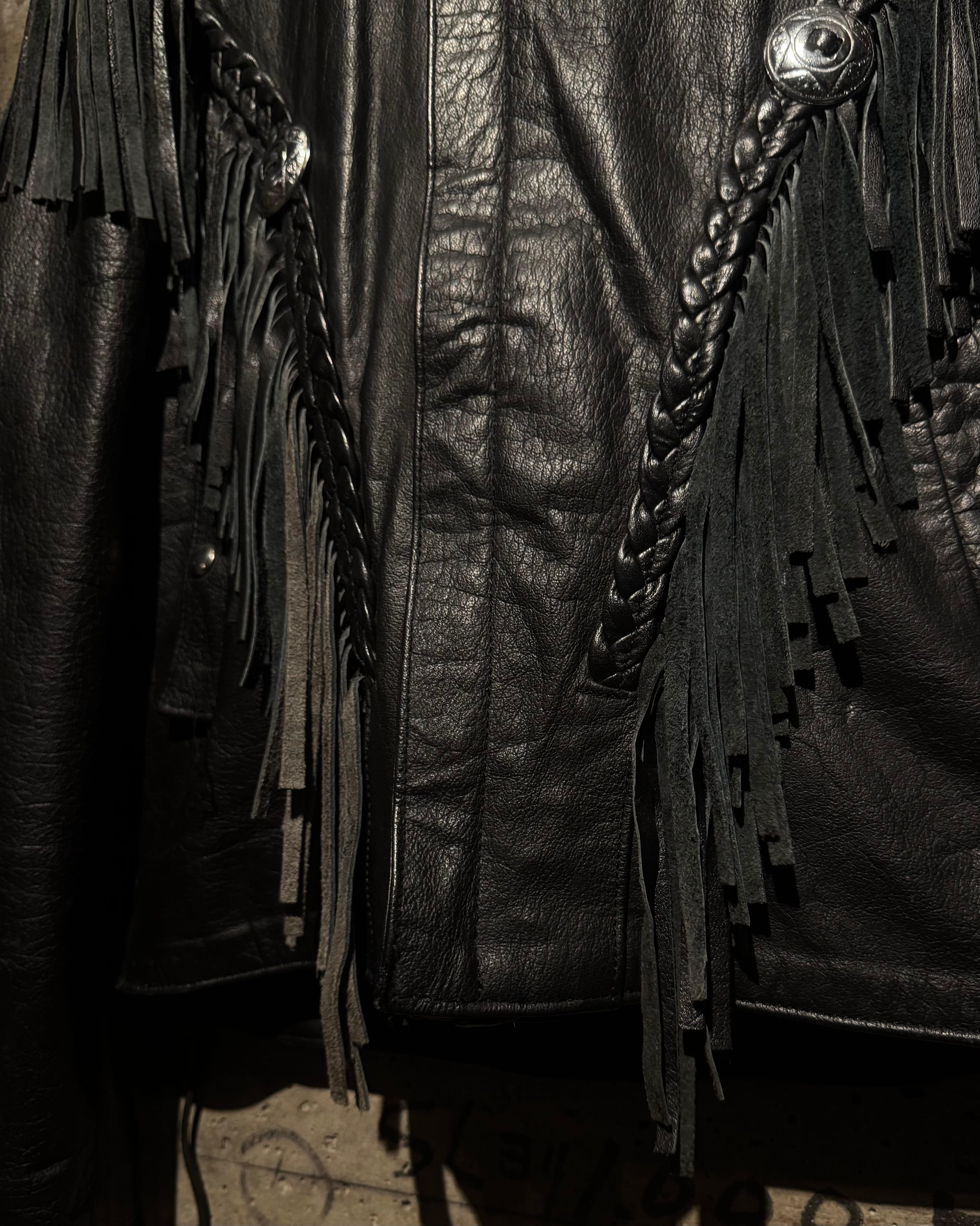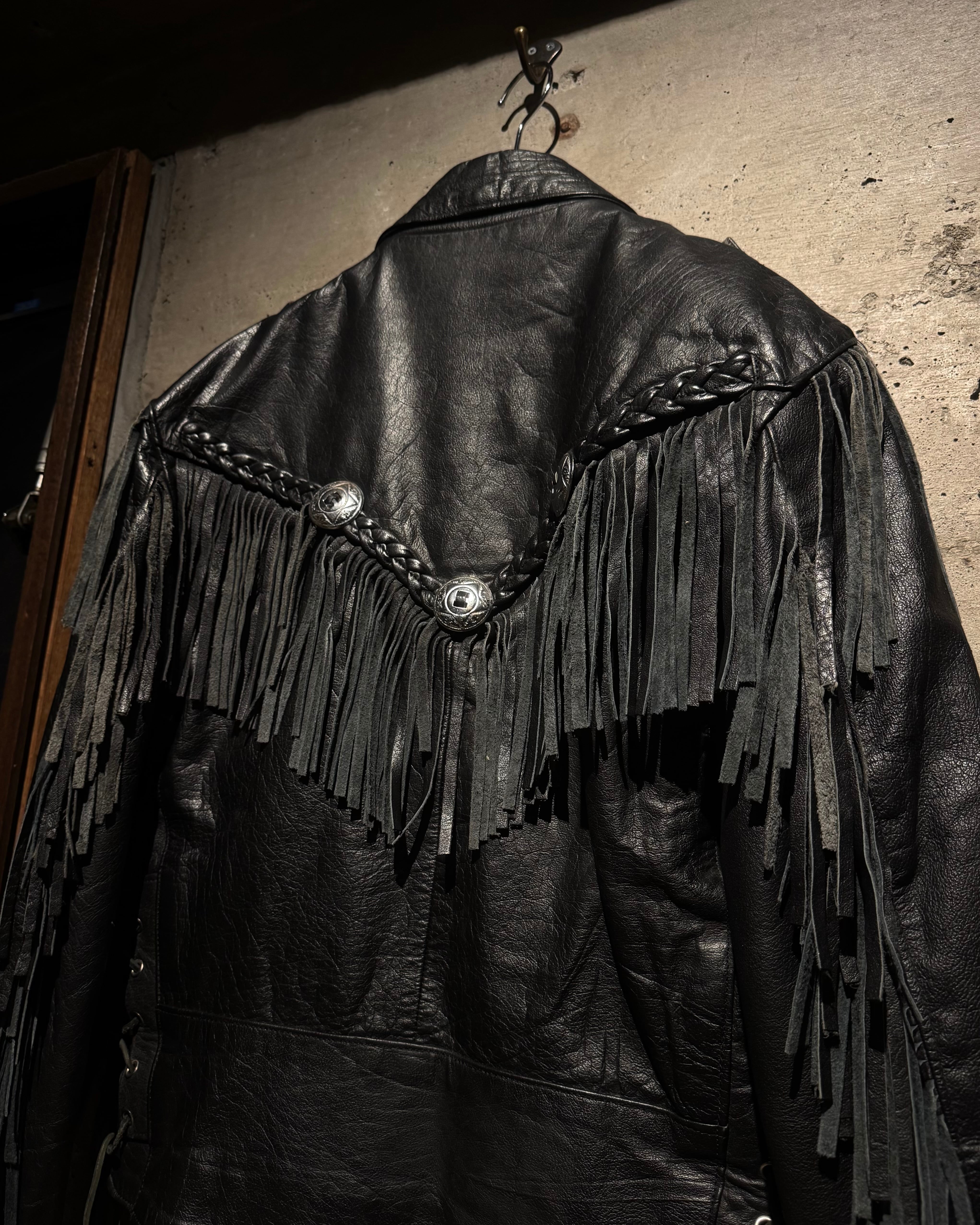 重厚なブラックレザーをボディに使用し、フロントから袖、背面にかけて施された大胆なフリンジ、レザーブレードとコンチョボタンを組み合わせたウエスタンディテールが抜群の存在感を放ちます。