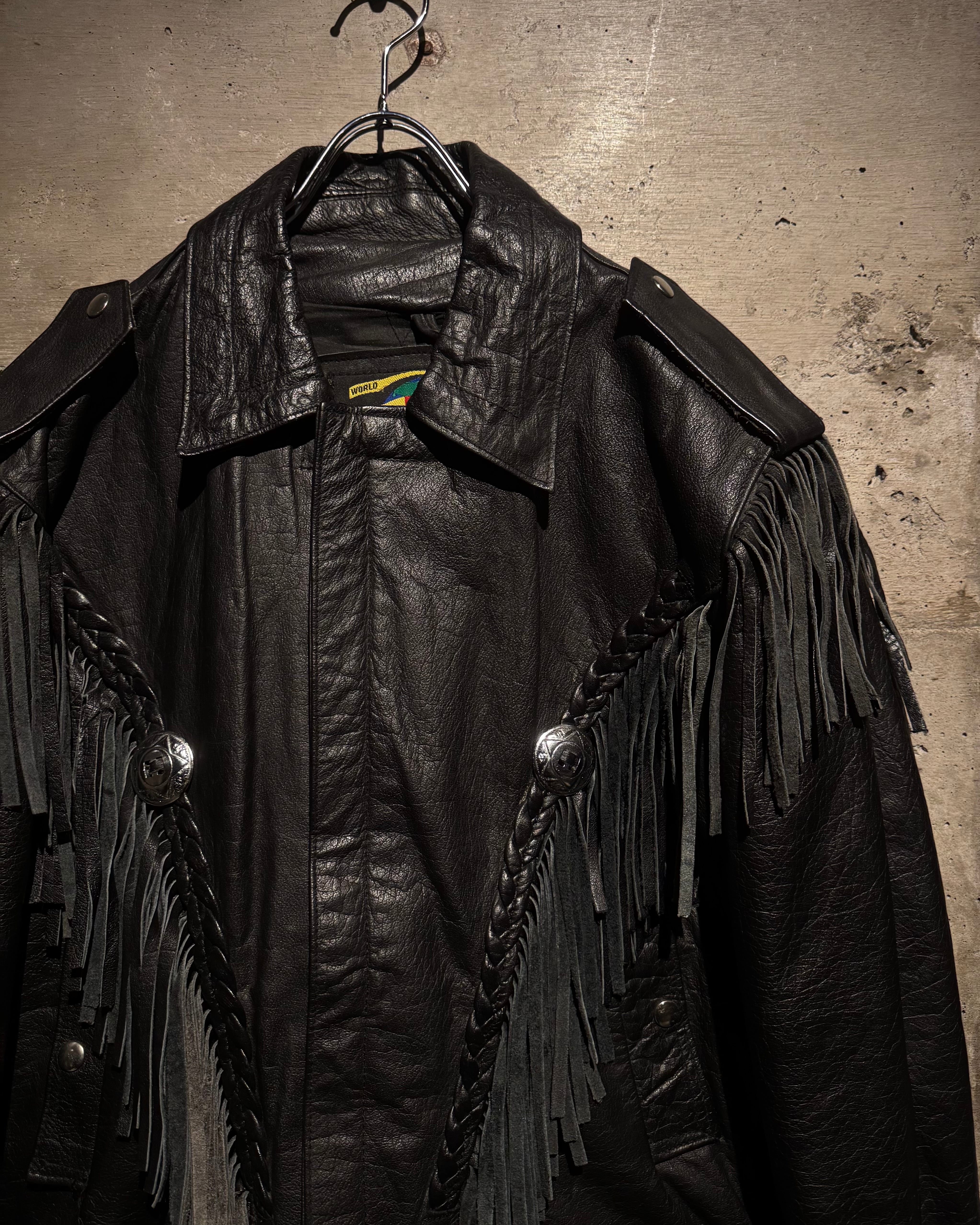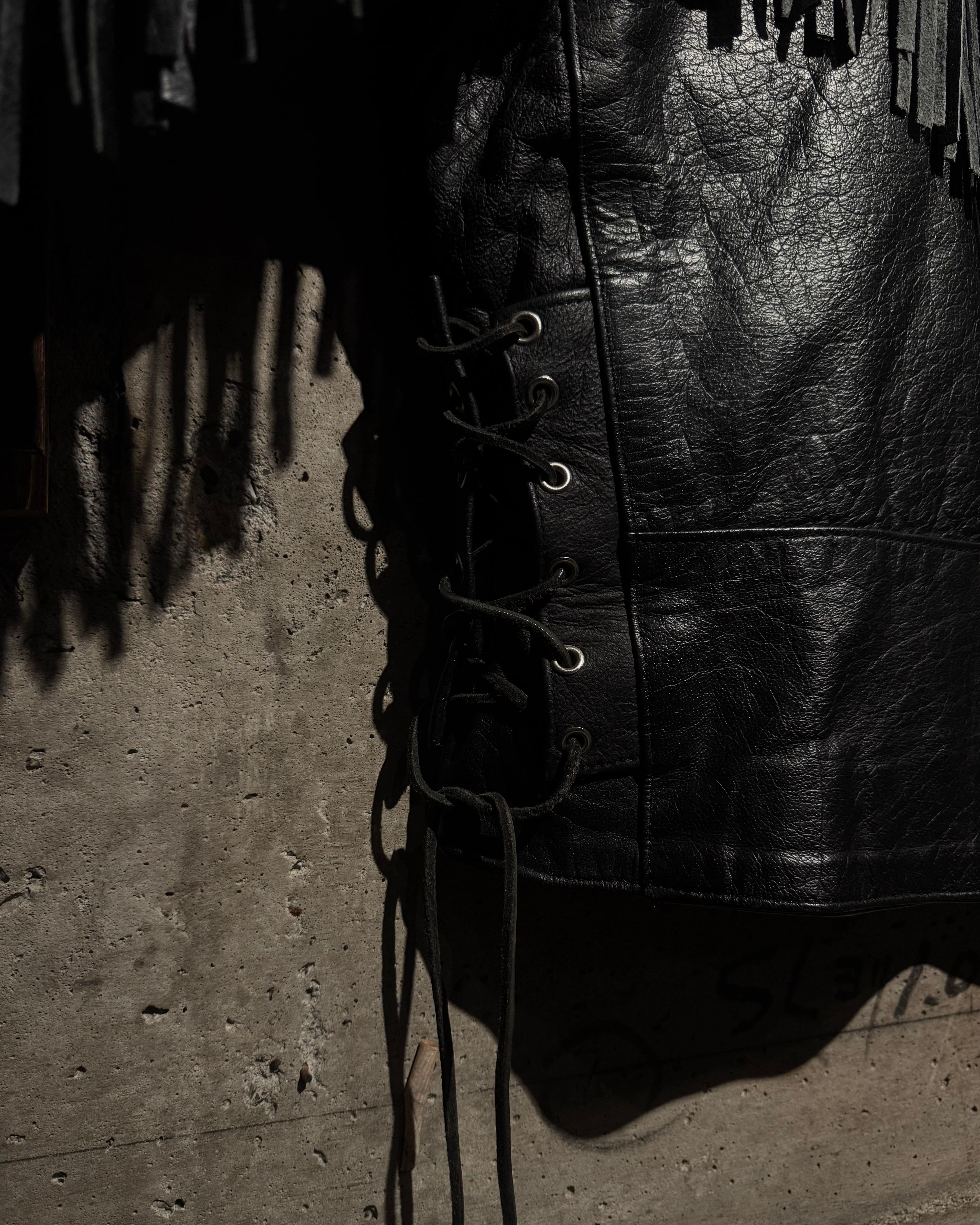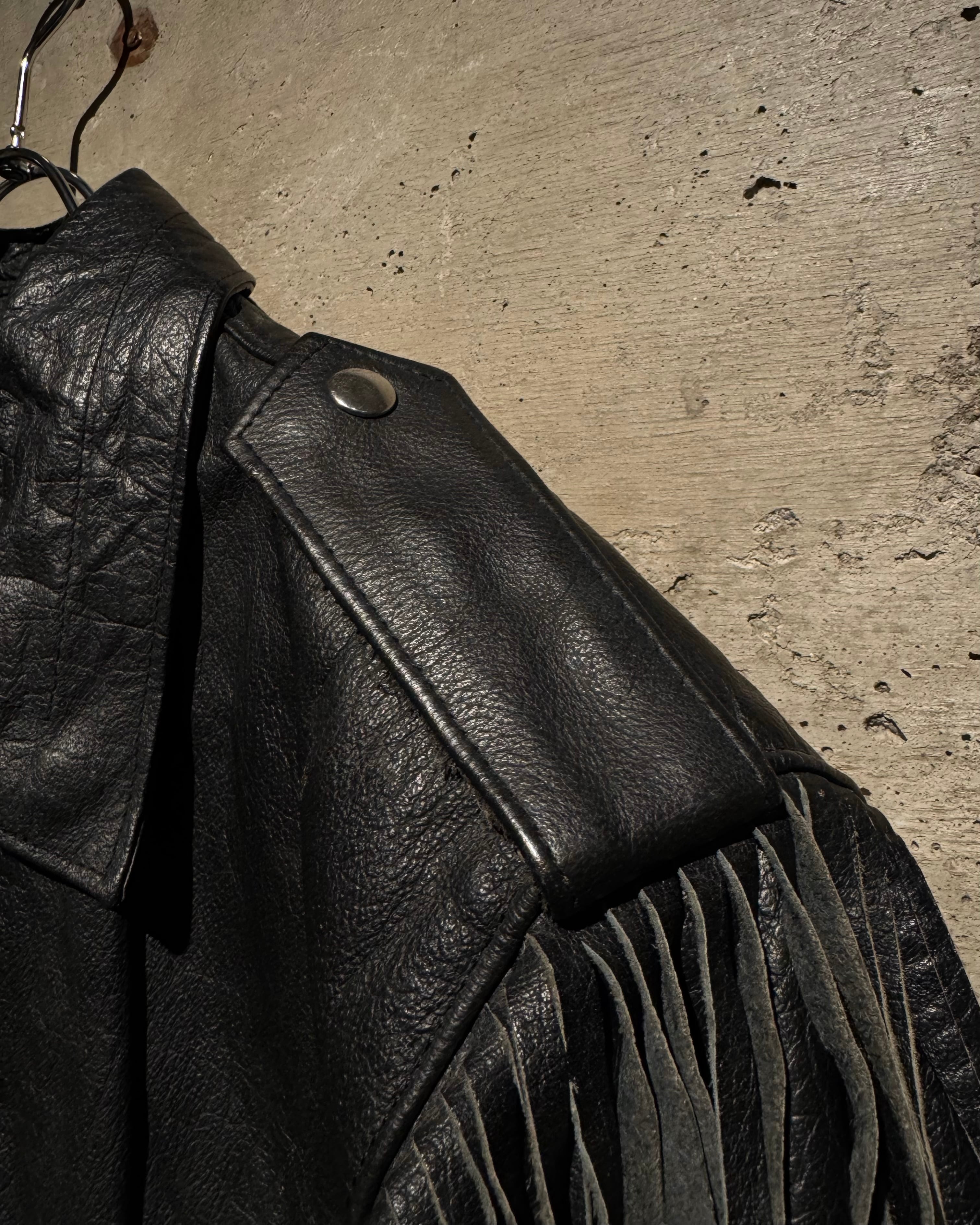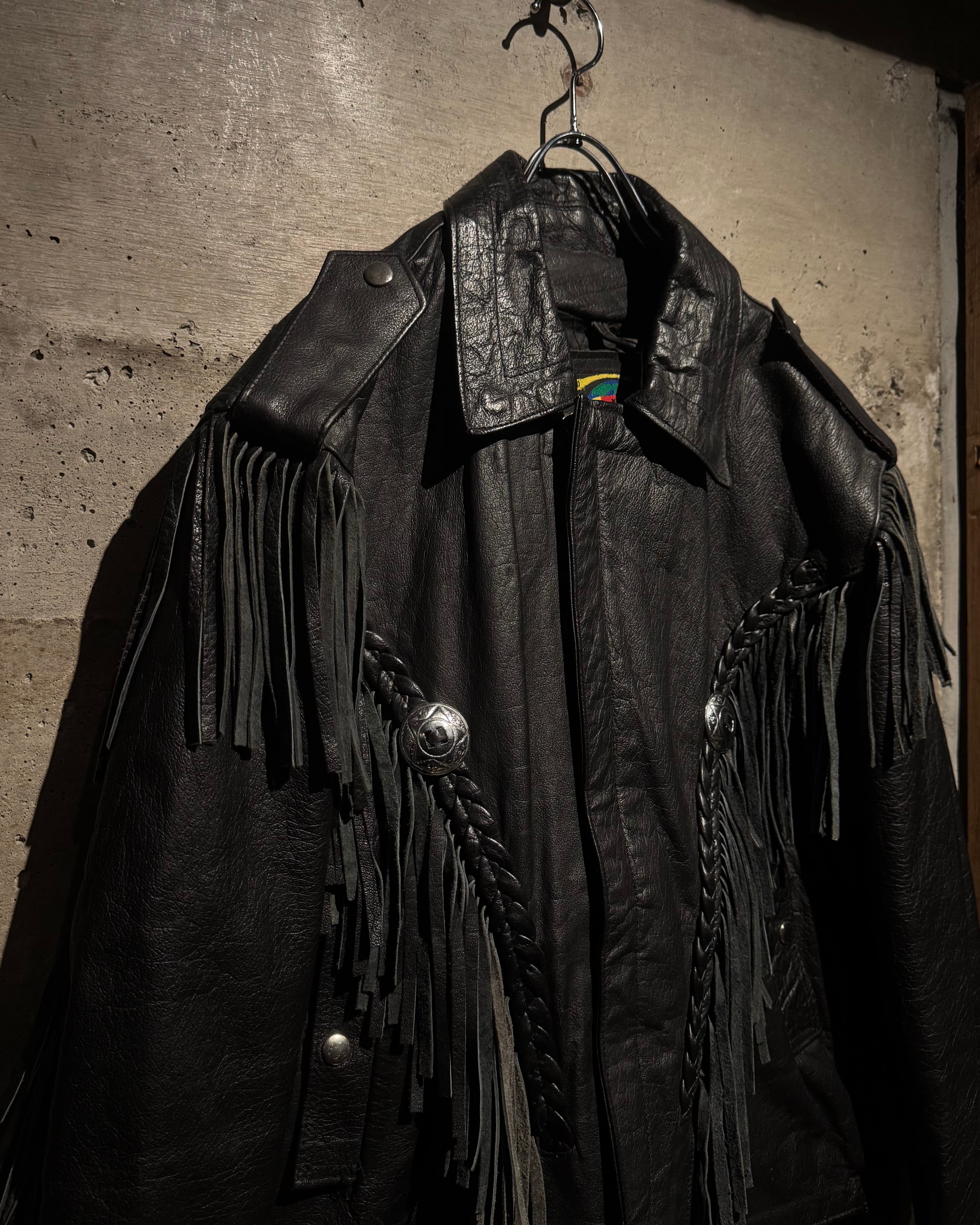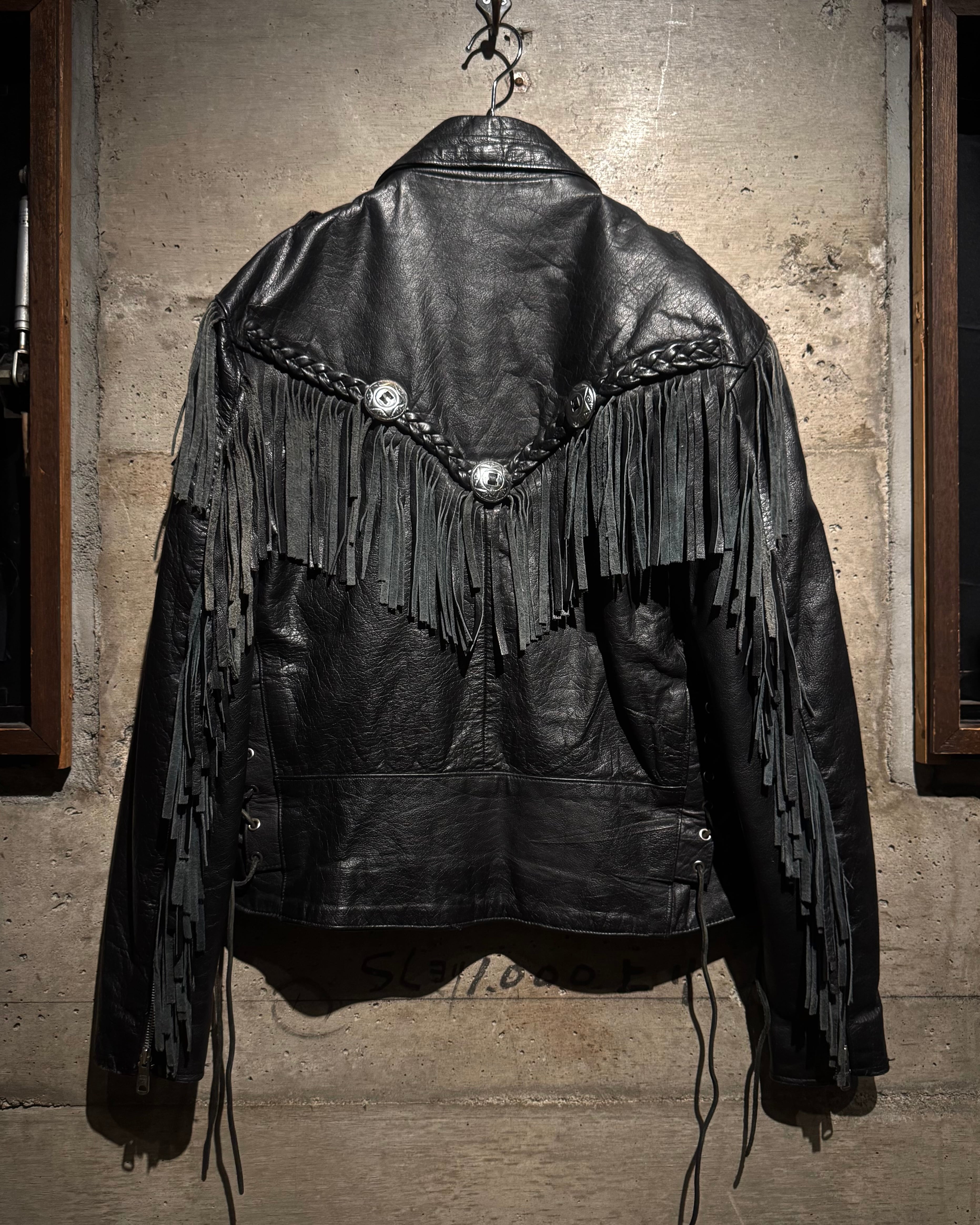 重厚なブラックレザーをボディに使用し、フロントから袖、背面にかけて施された大胆なフリンジ、レザーブレードとコンチョボタンを組み合わせたウエスタンディテールが抜群の存在感を放ちます。