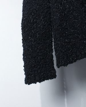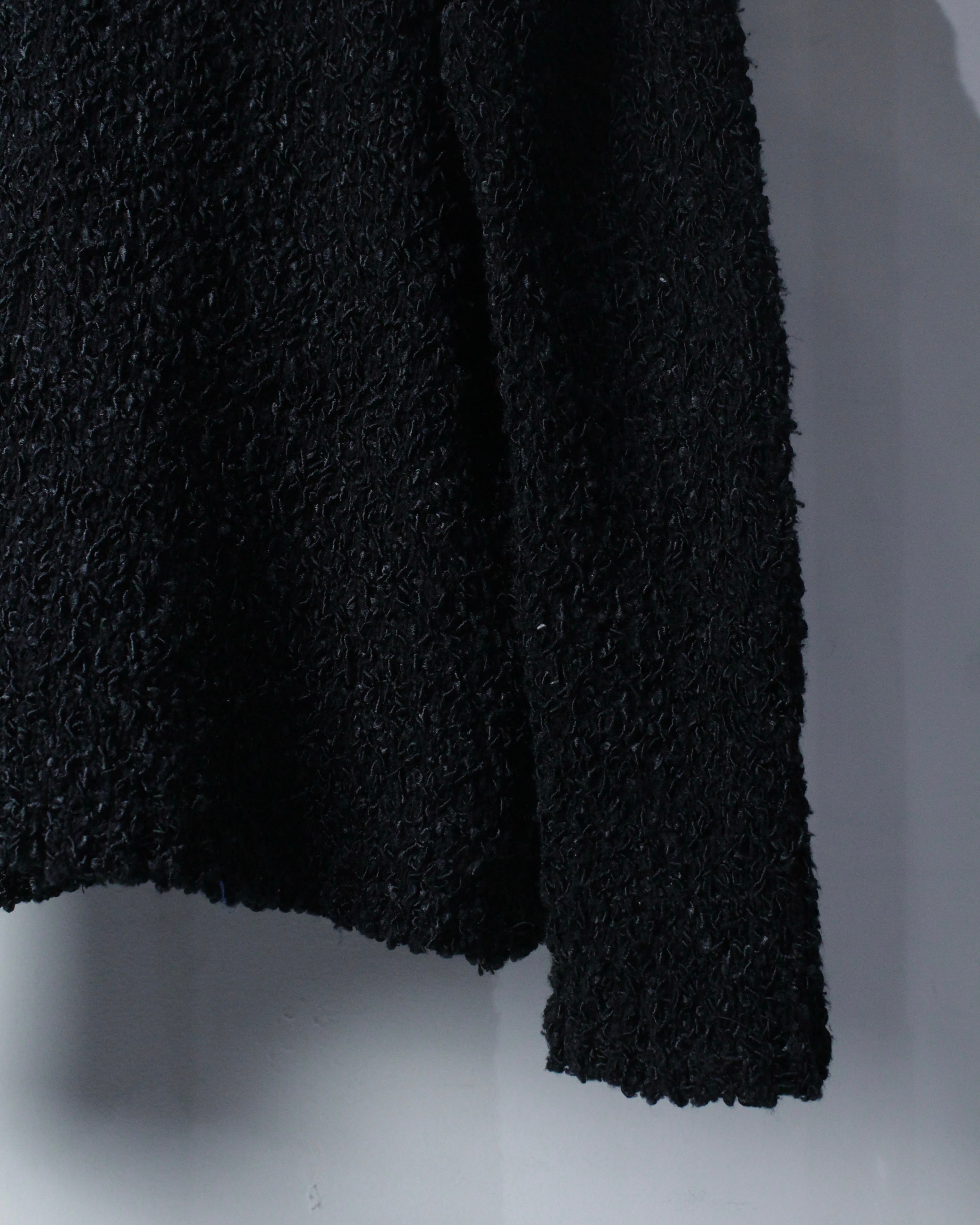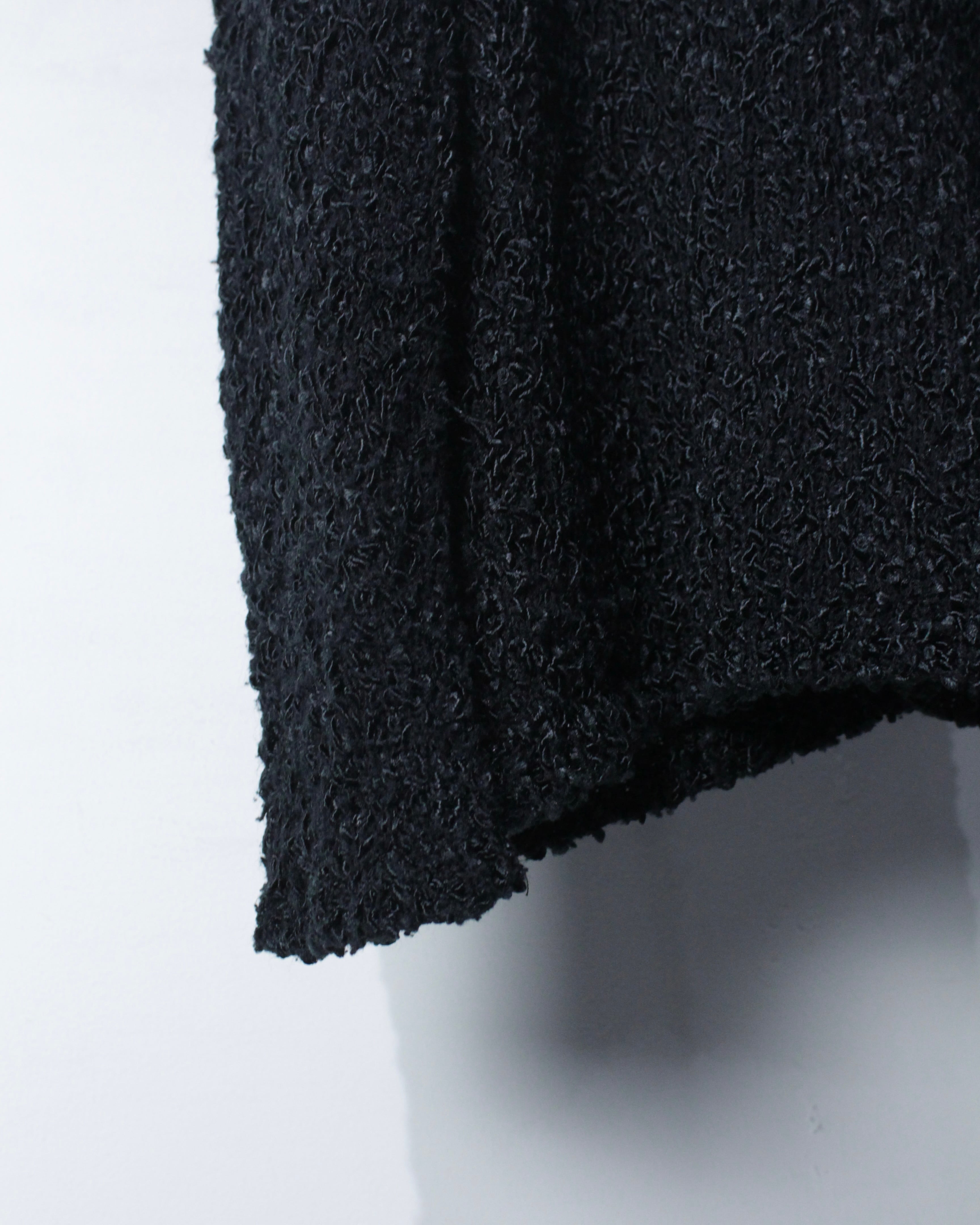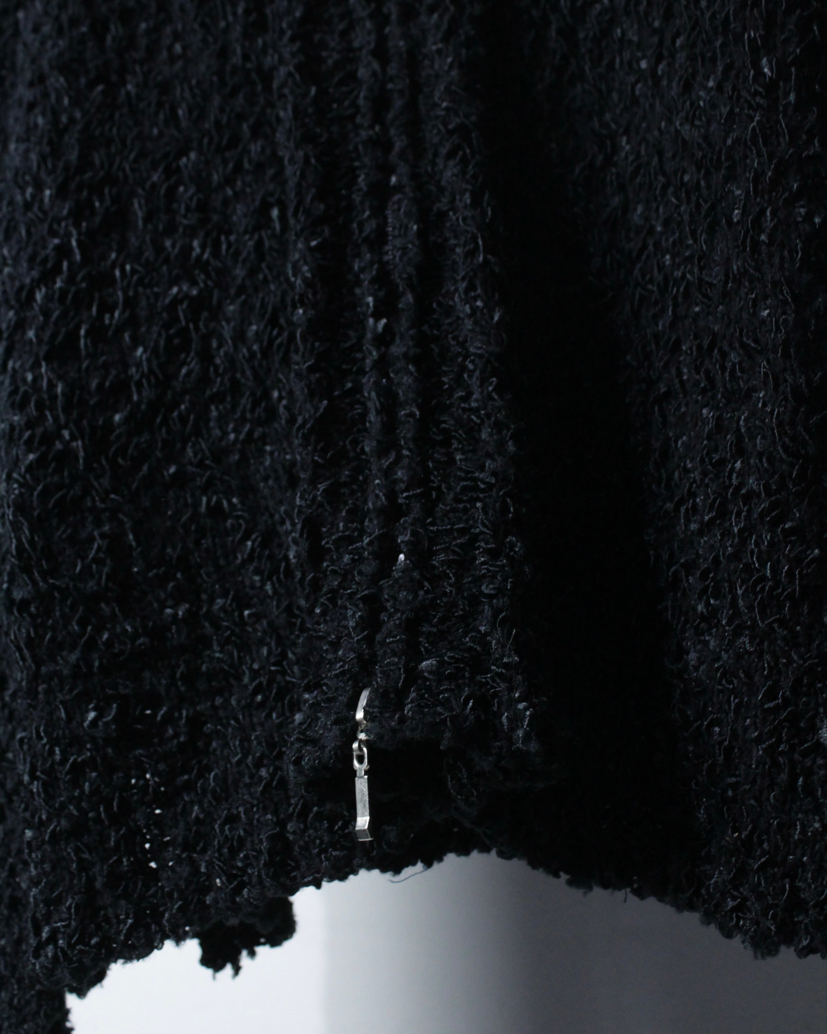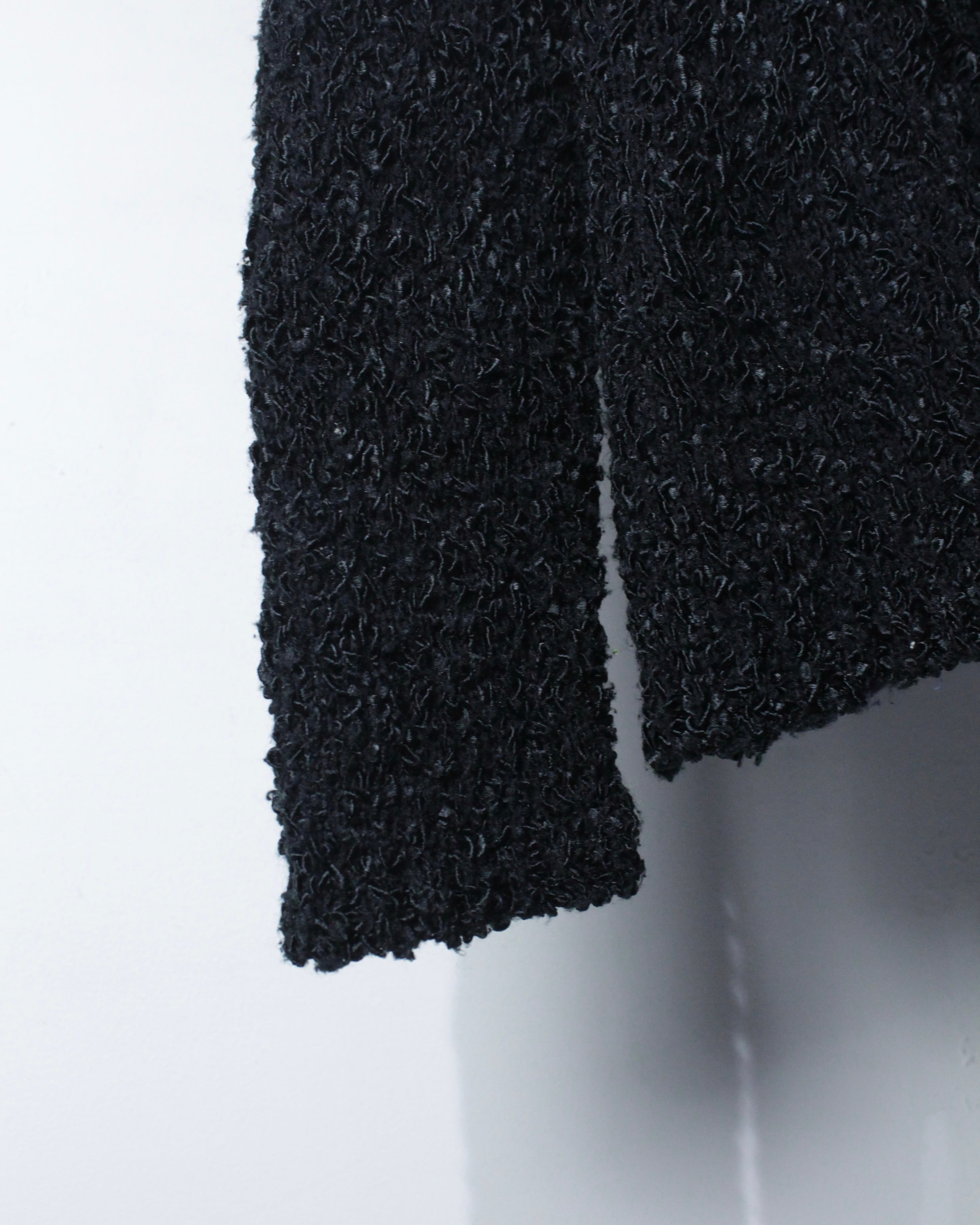 ボディには立体的な毛足を持つニットファブリックを採用。凹凸のある独特な編み地が奥行きのある表情を生み出し、ブラック単色でありながらしっかりとした存在感を放っています。
