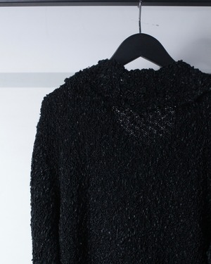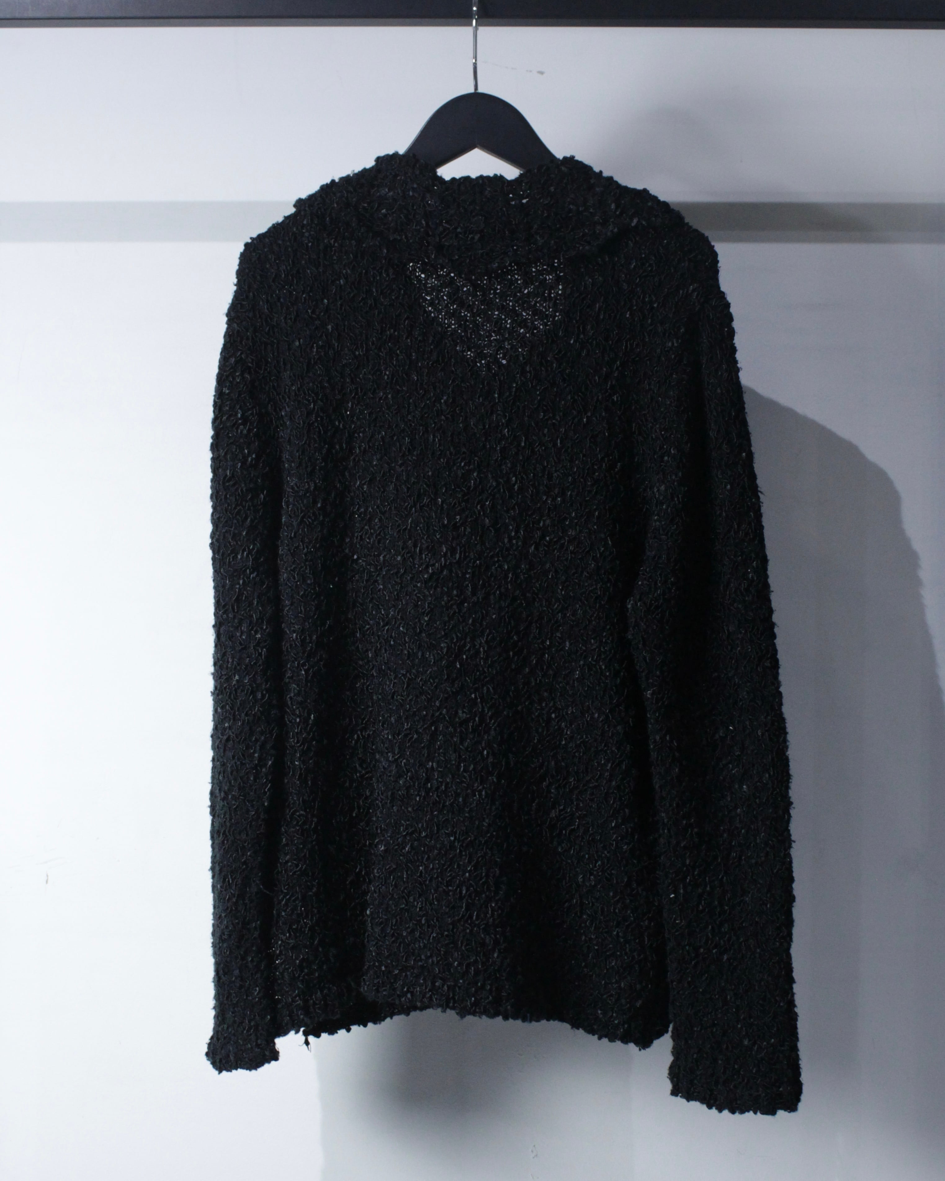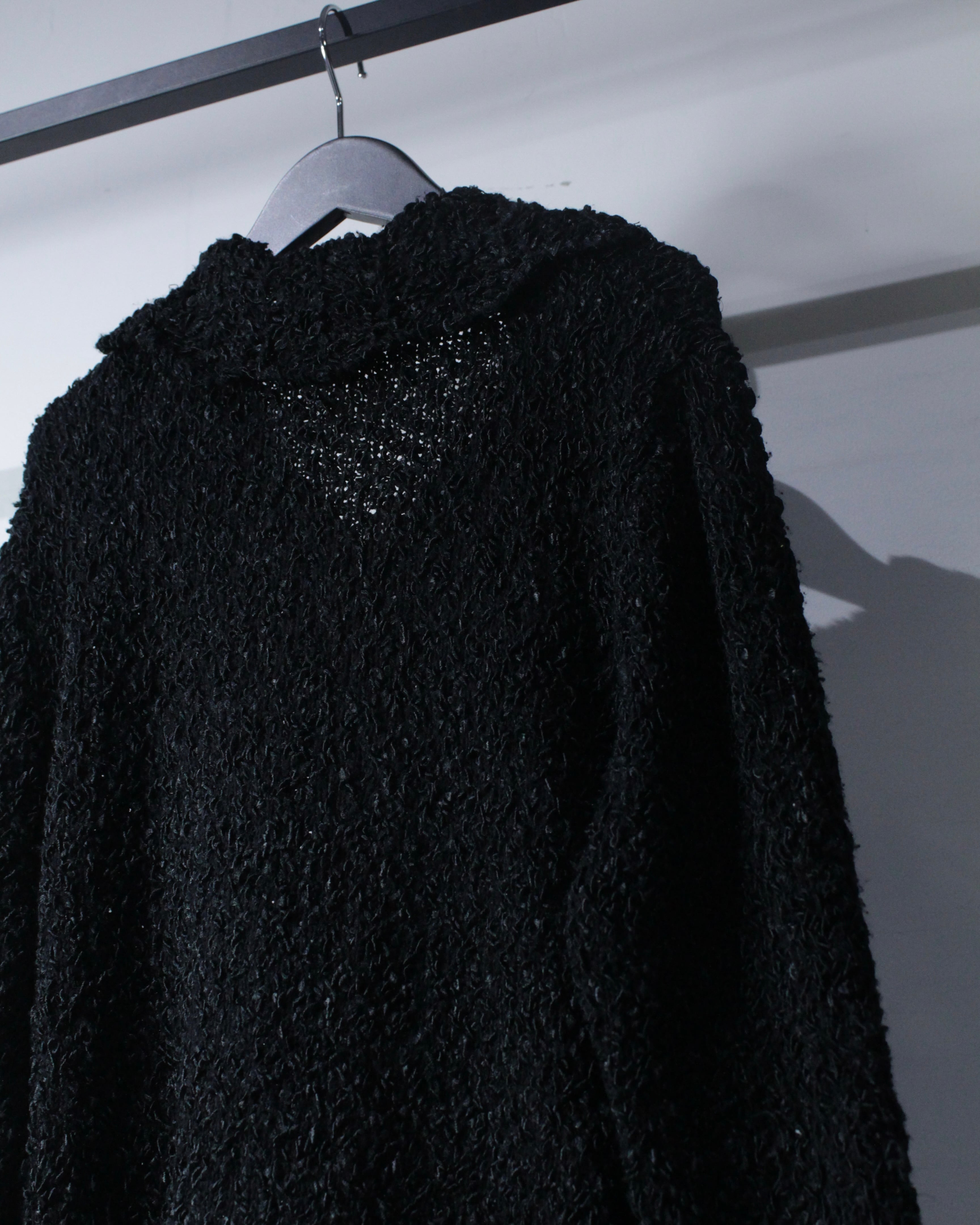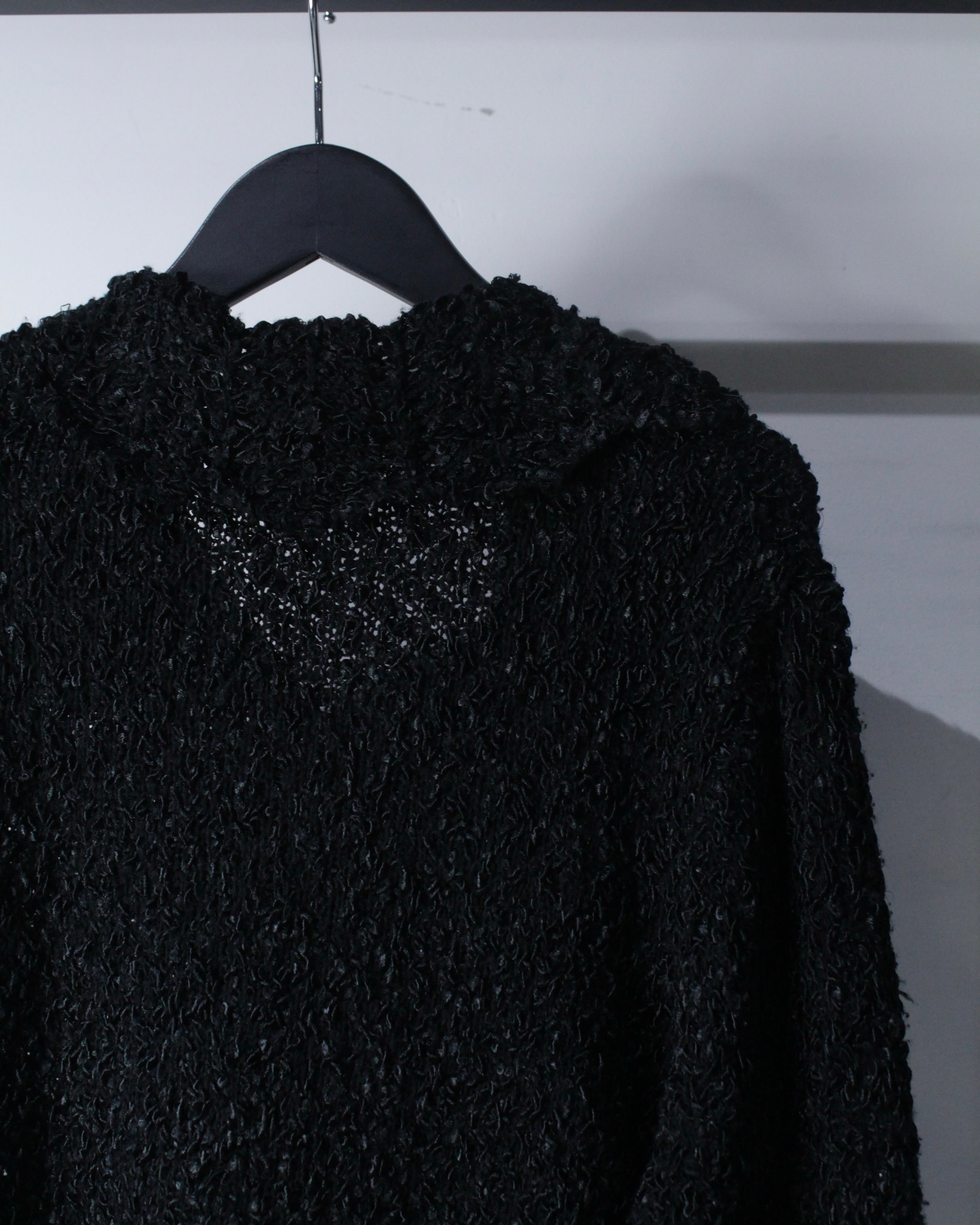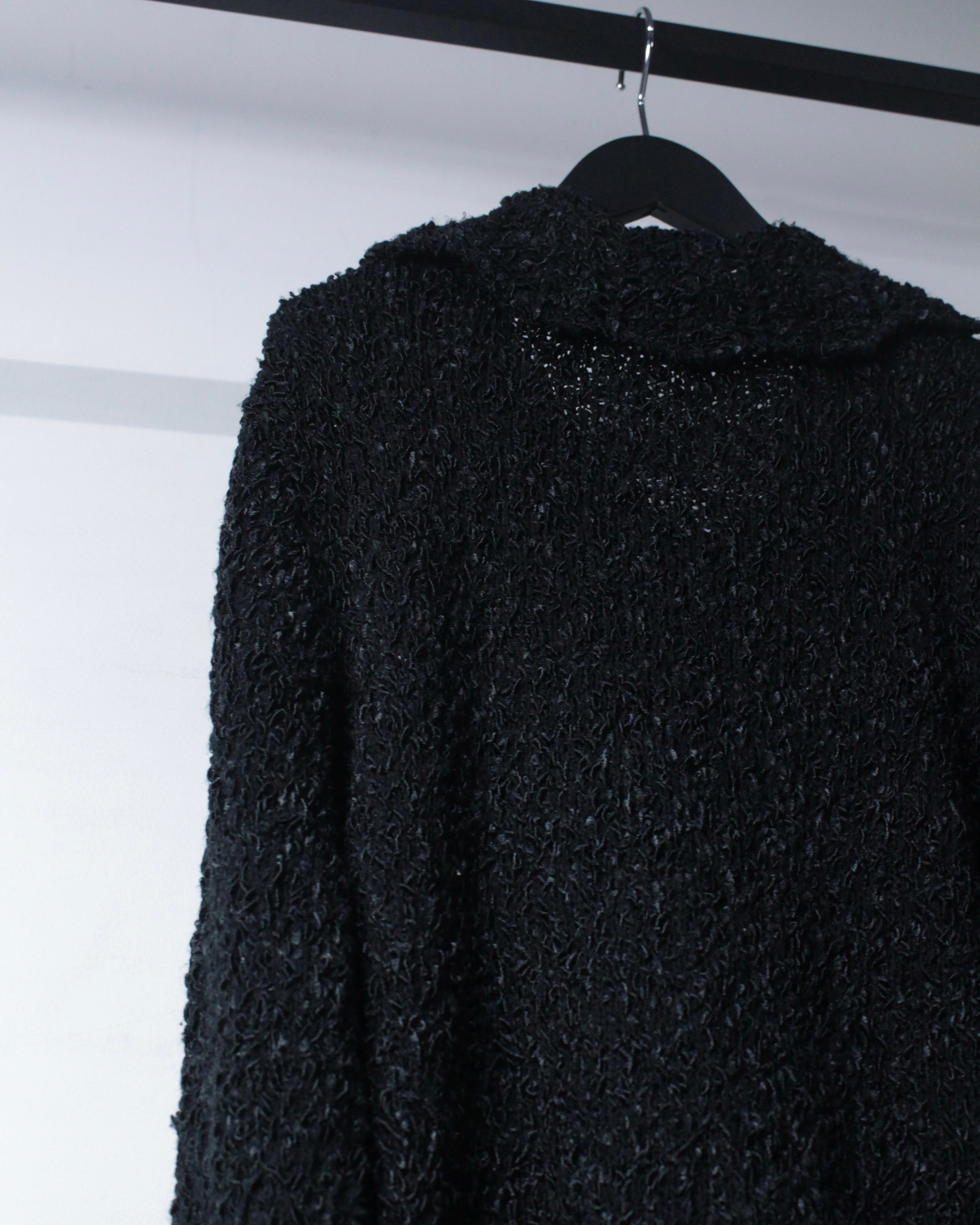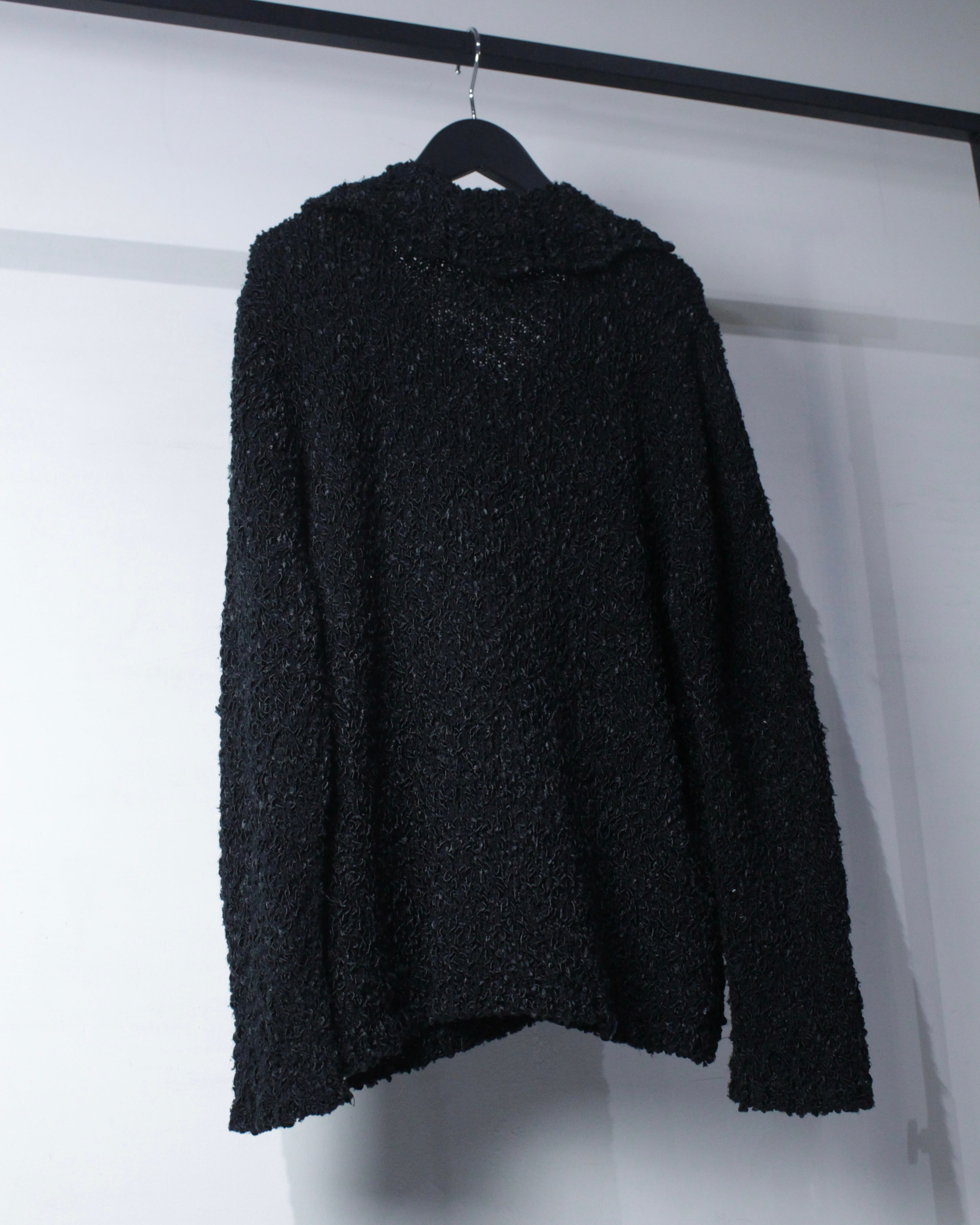 ボディには立体的な毛足を持つニットファブリックを採用。凹凸のある独特な編み地が奥行きのある表情を生み出し、ブラック単色でありながらしっかりとした存在感を放っています。