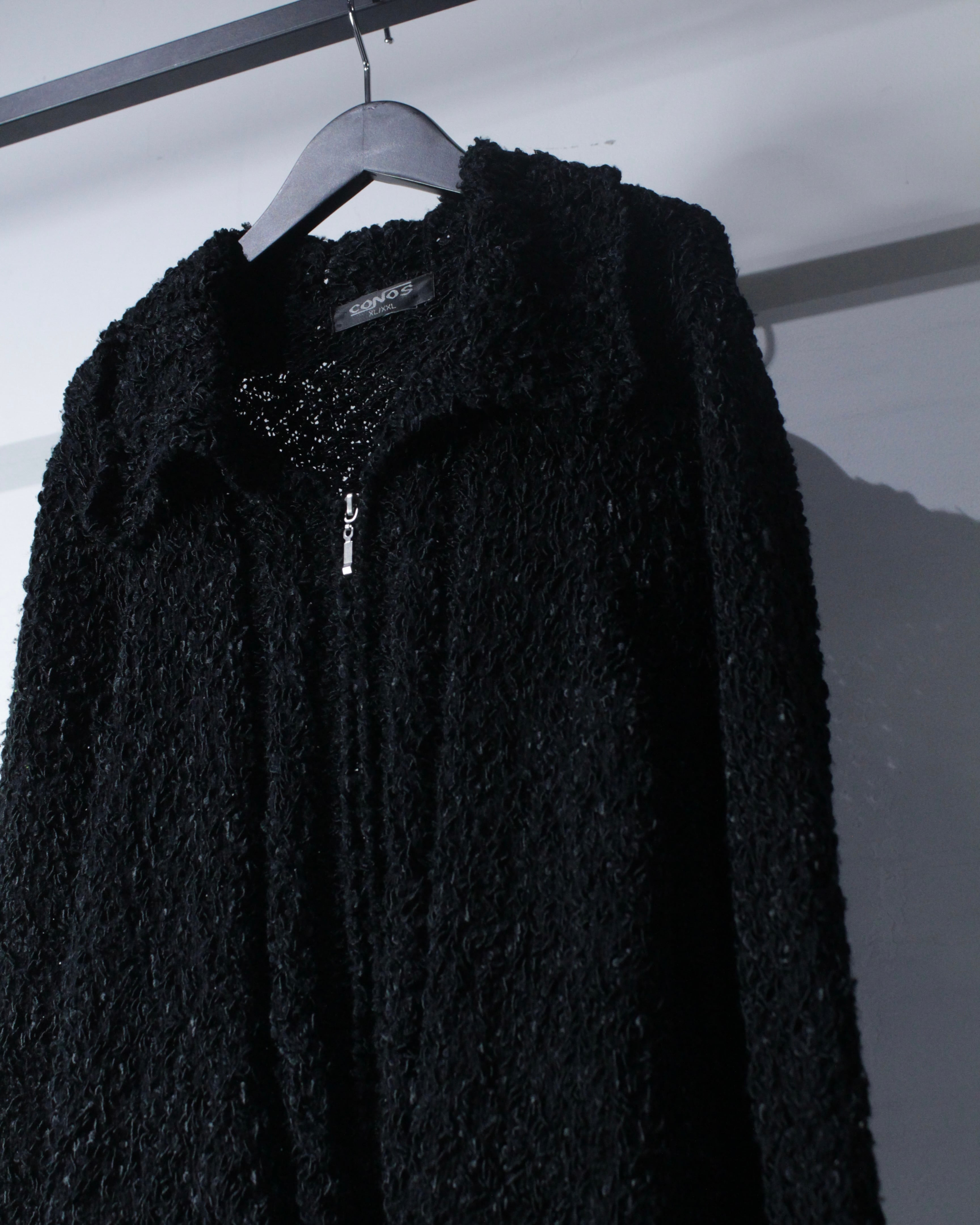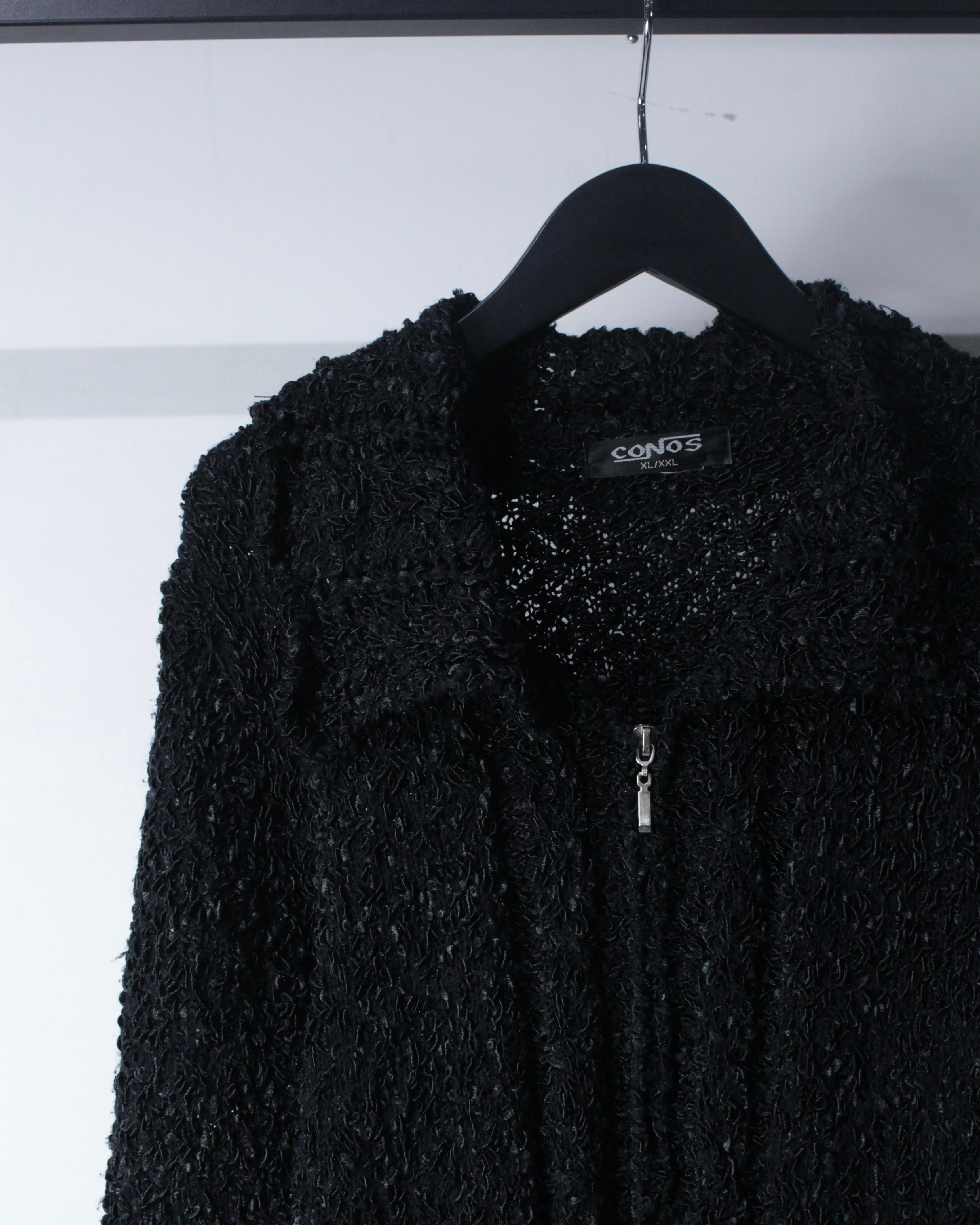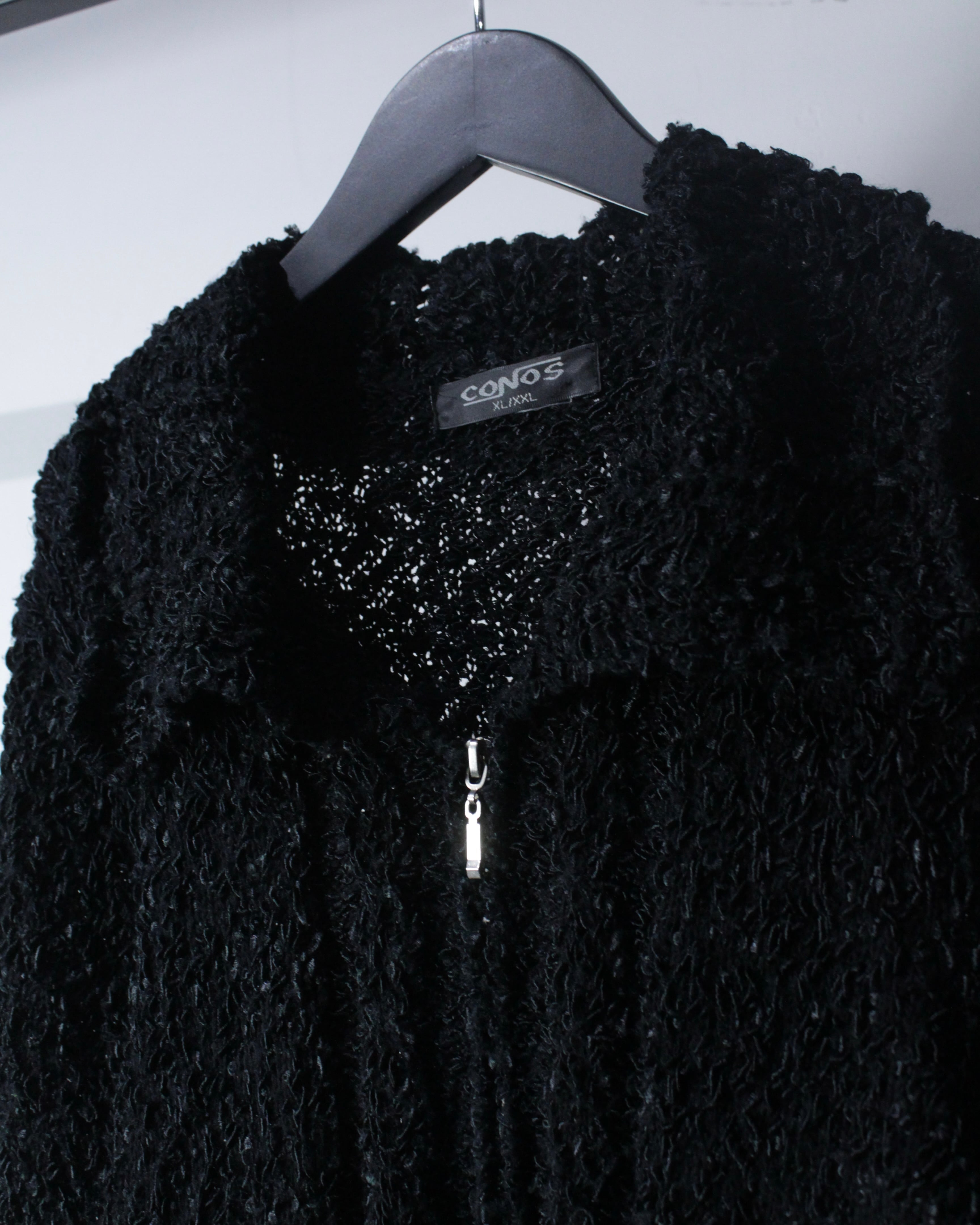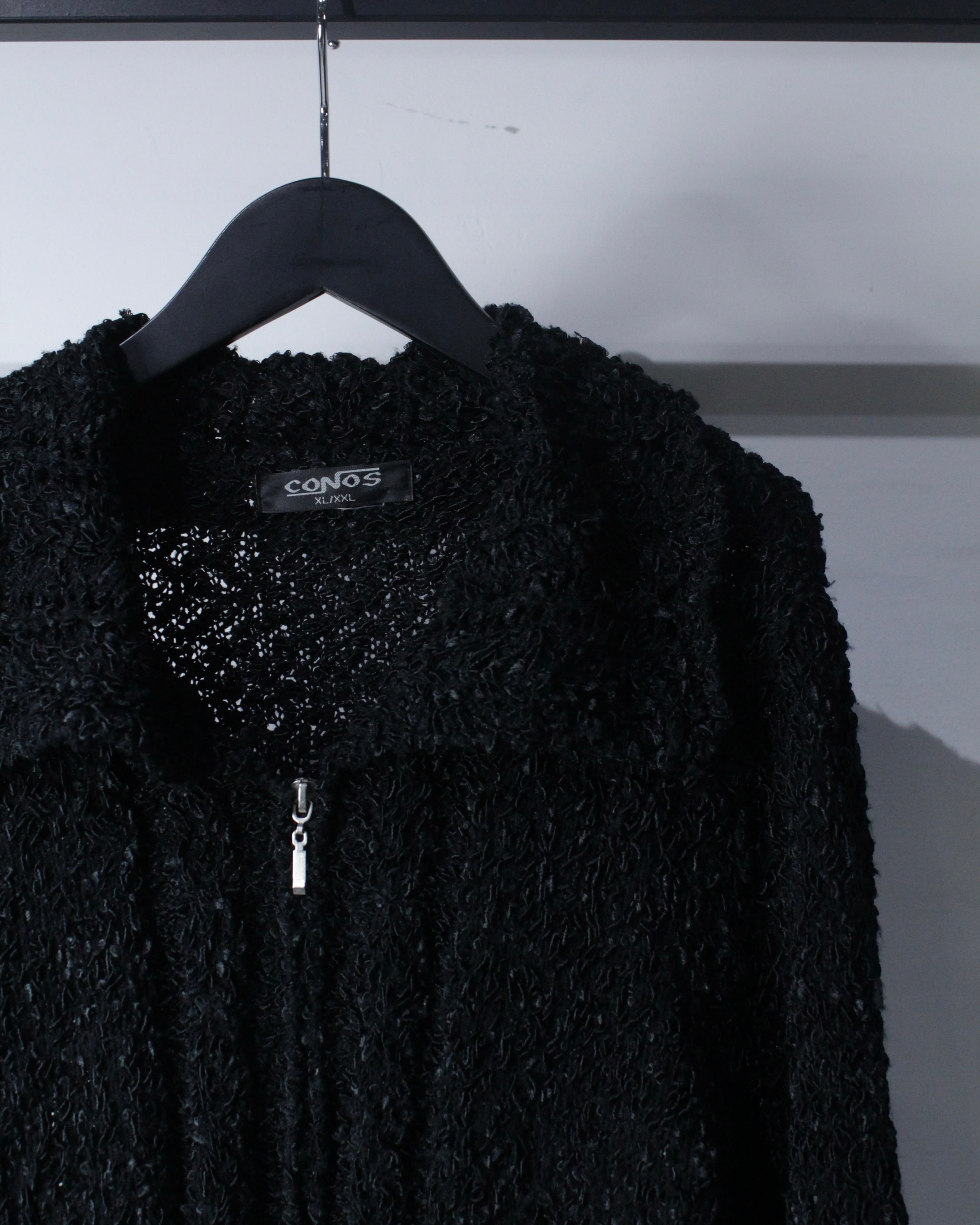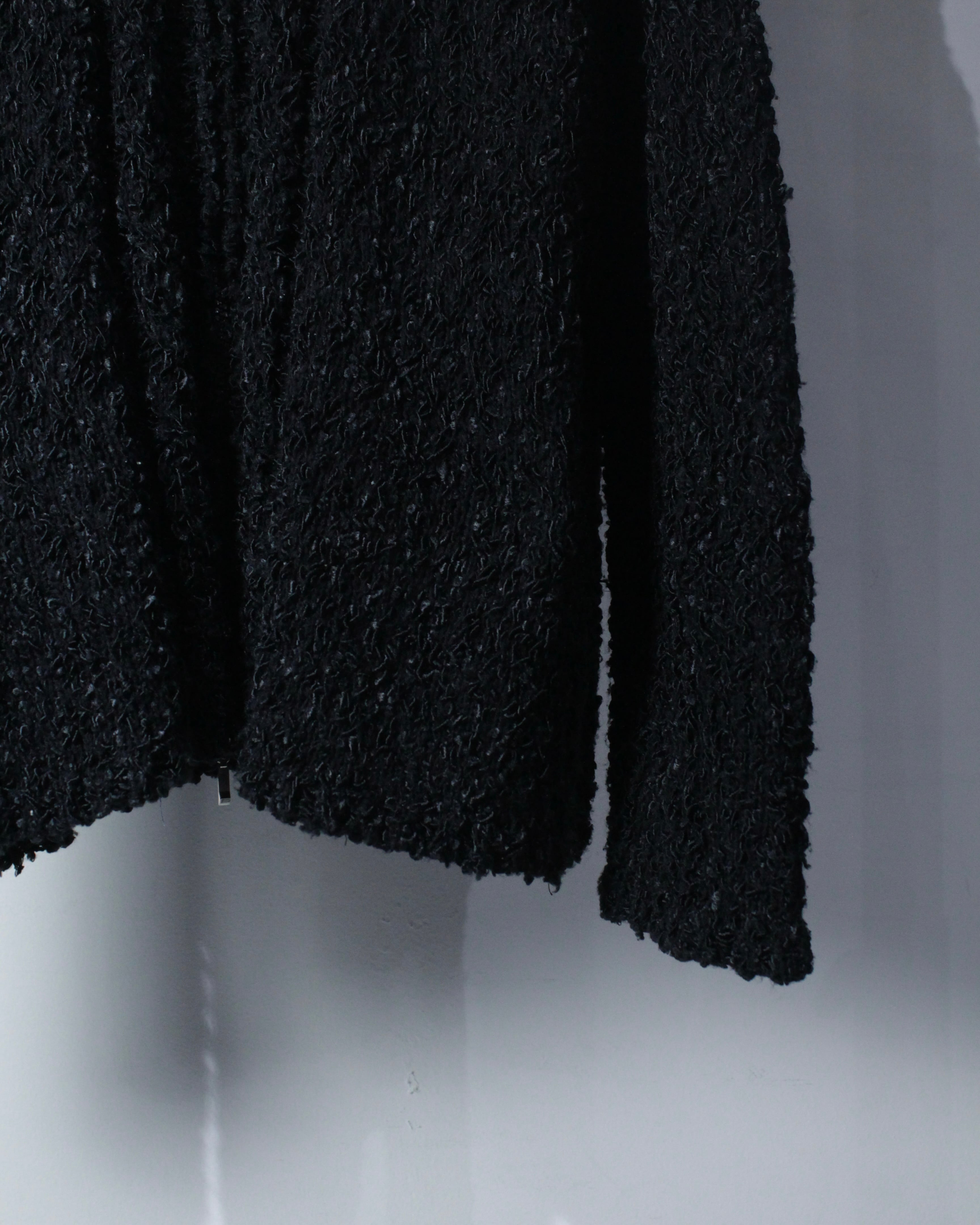 ブラックカラーで統一された、ミニマルな佇まいが魅力のジップアップニットジャケット。