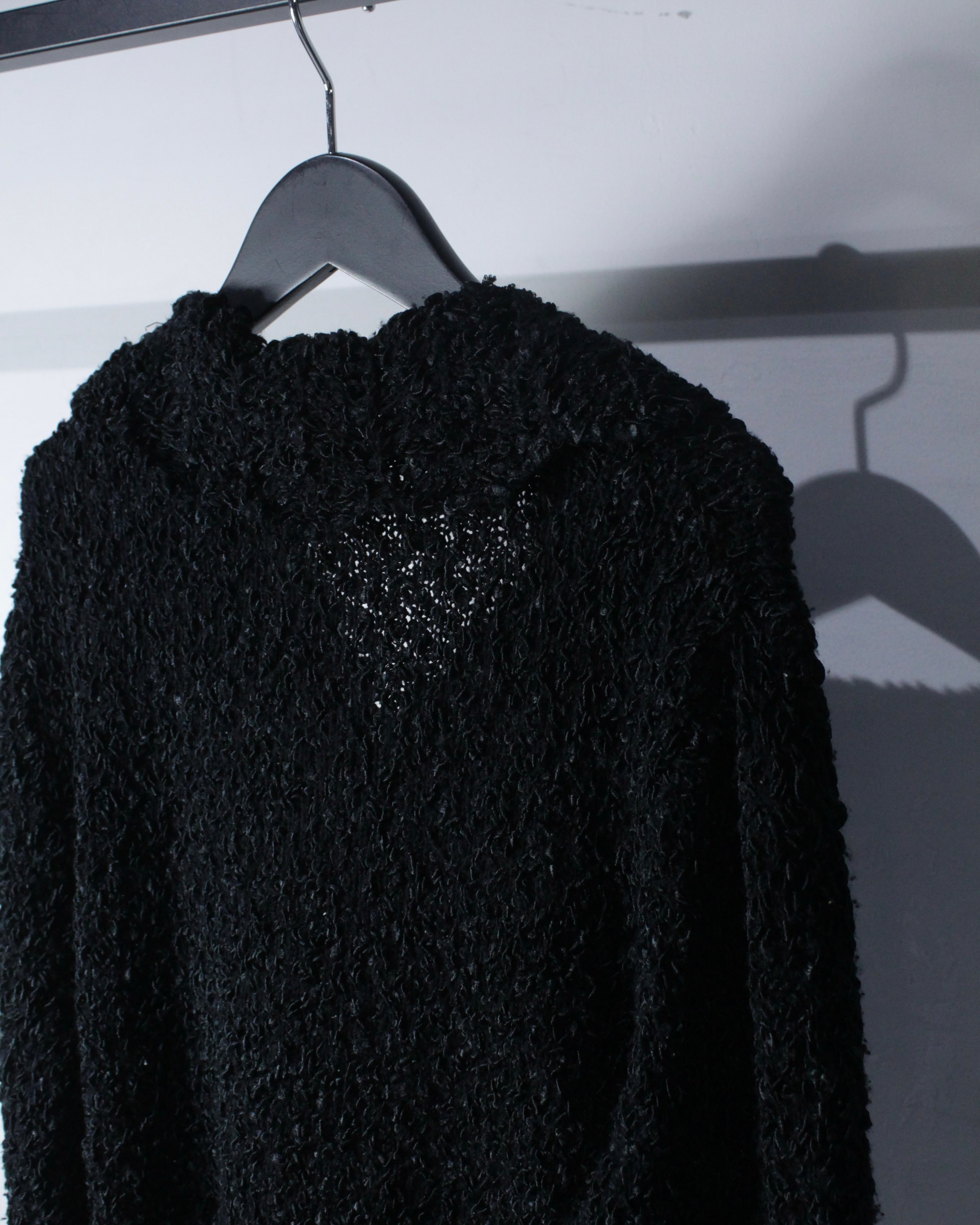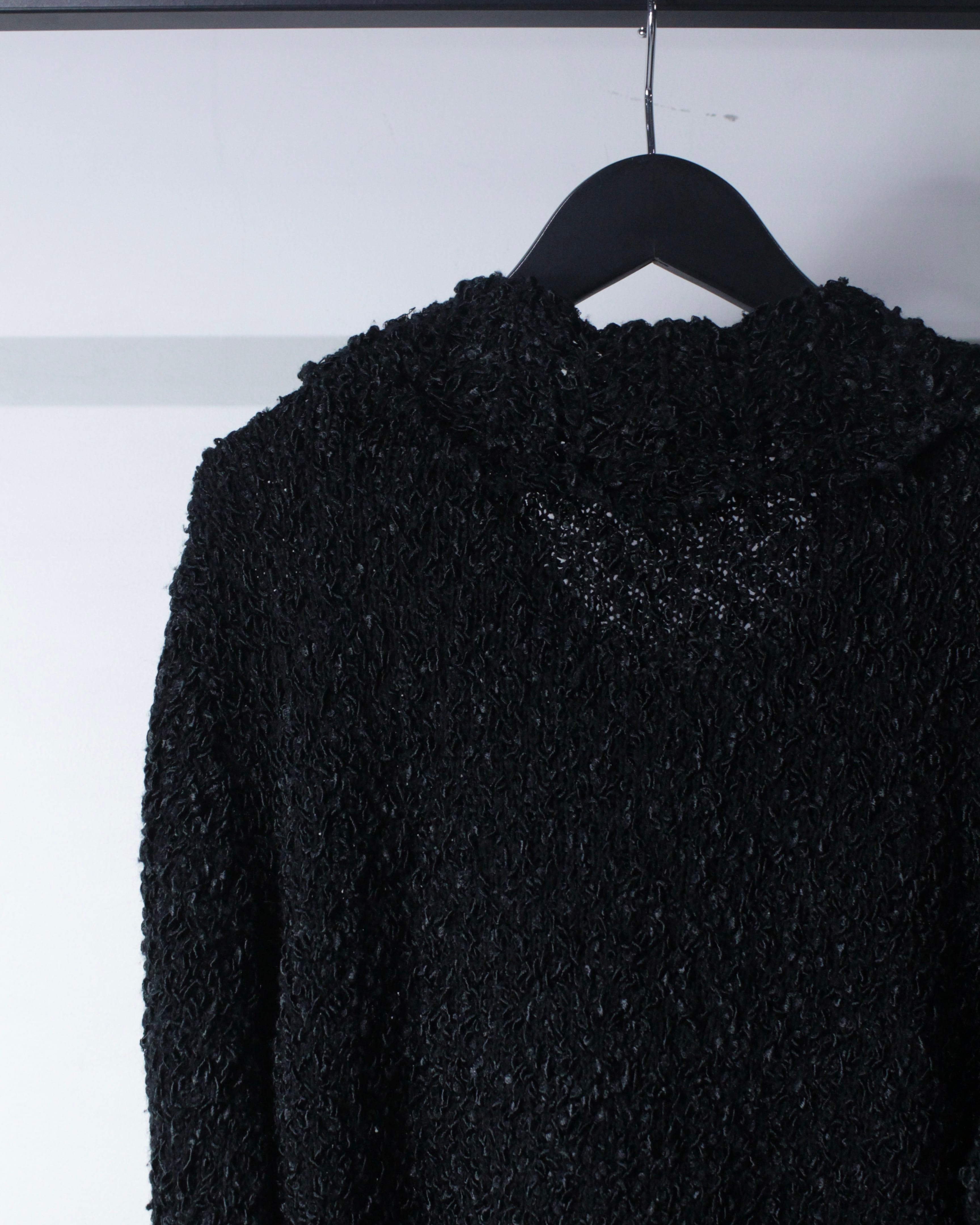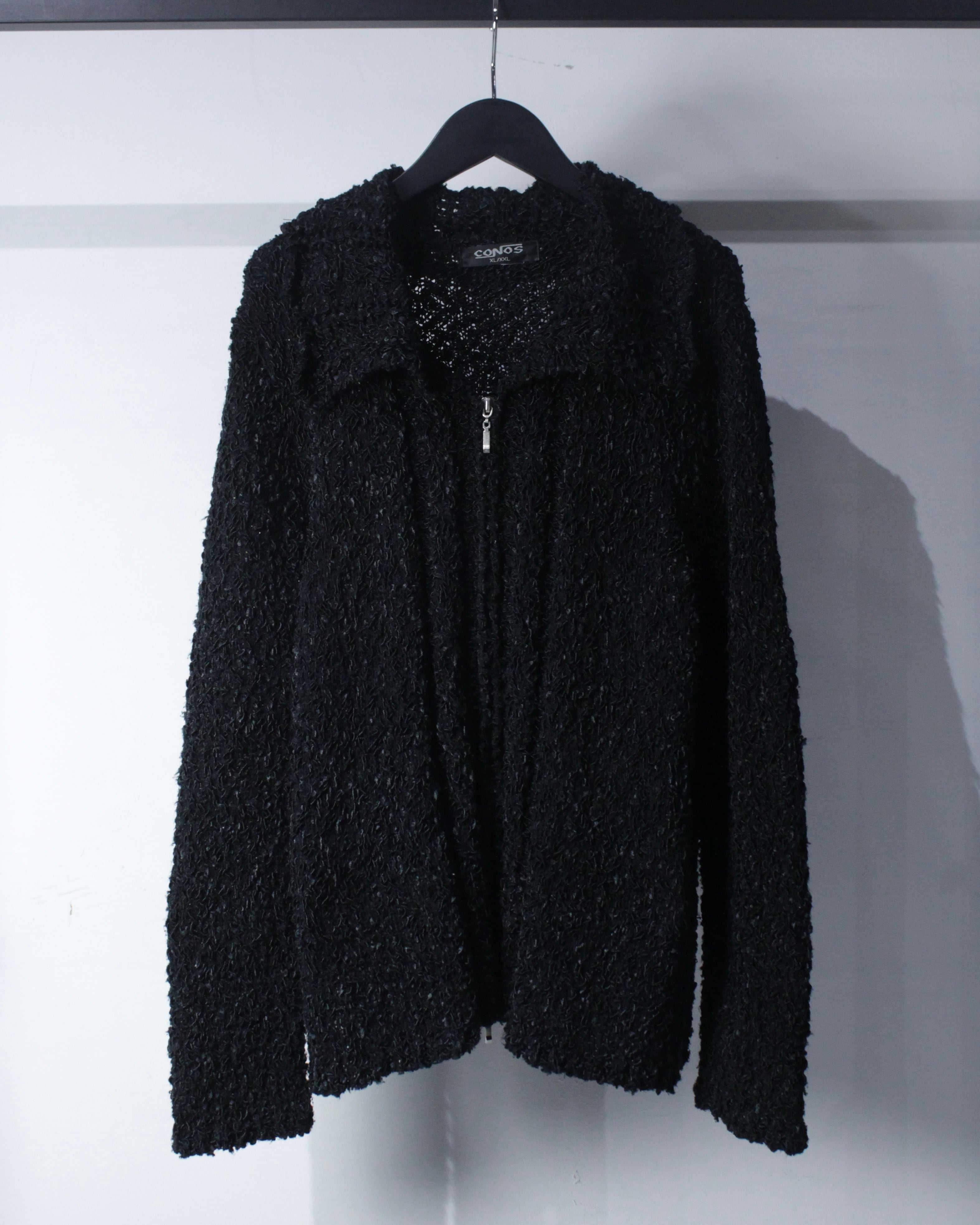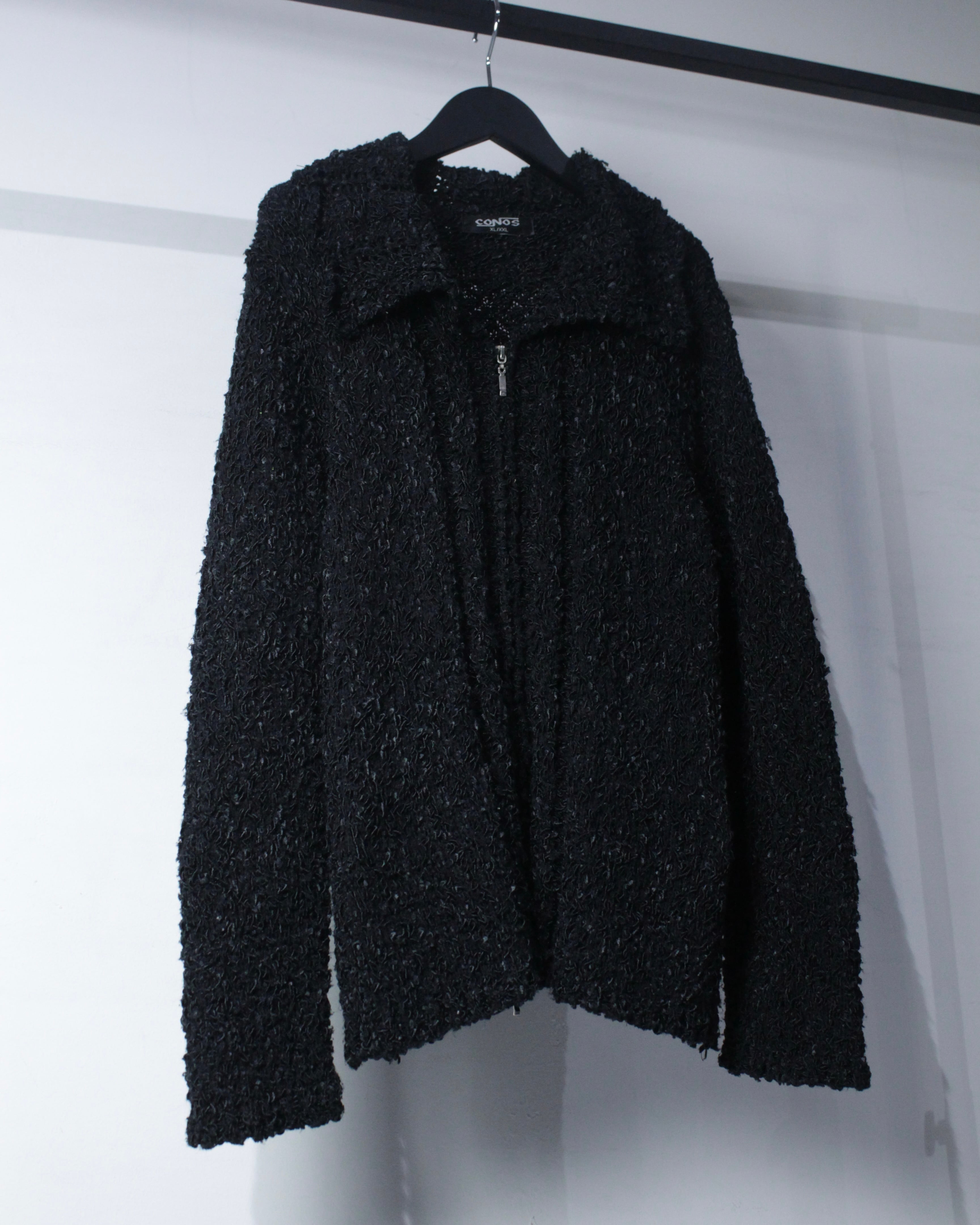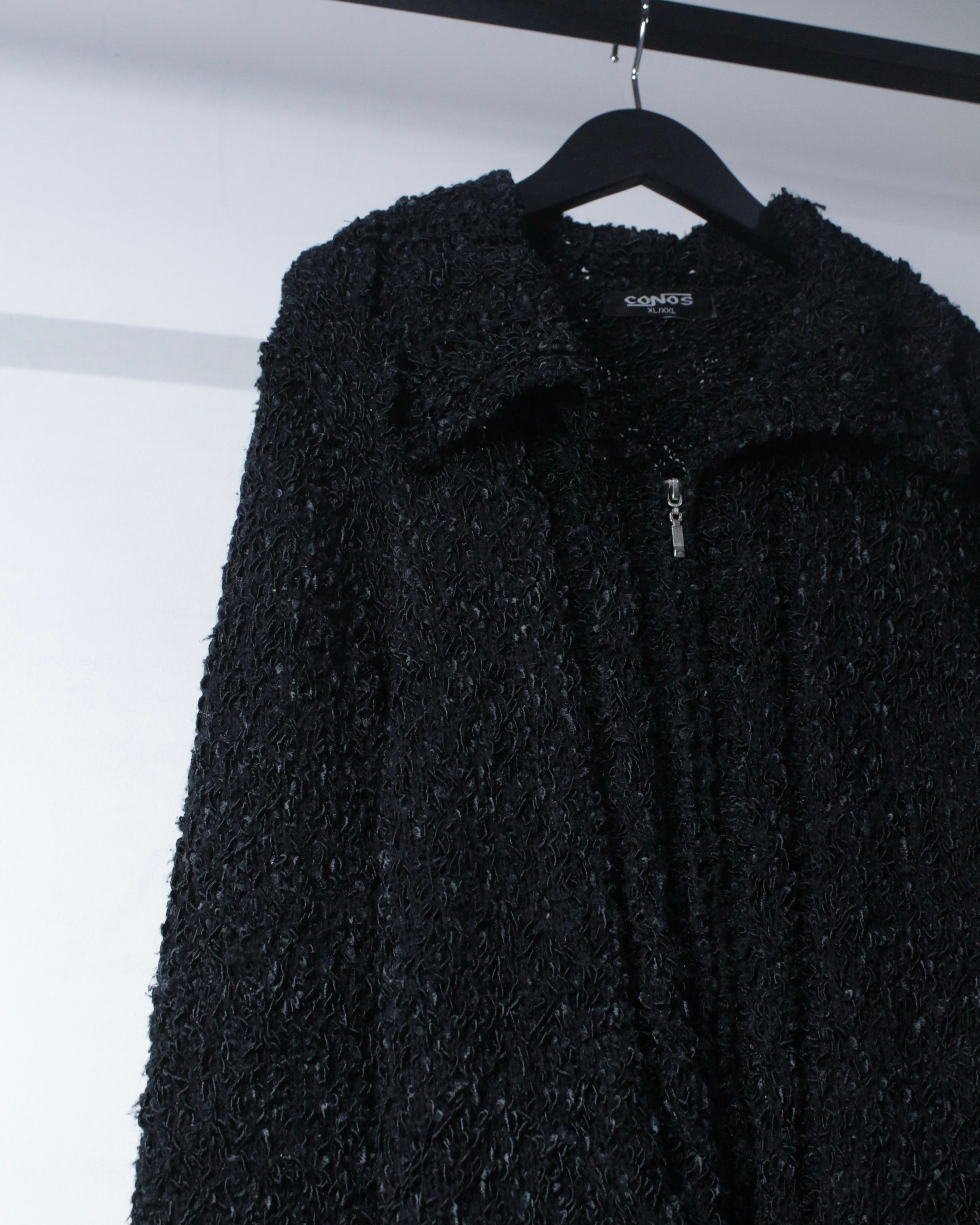ブラックカラーで統一された、ミニマルな佇まいが魅力のジップアップニットジャケット。