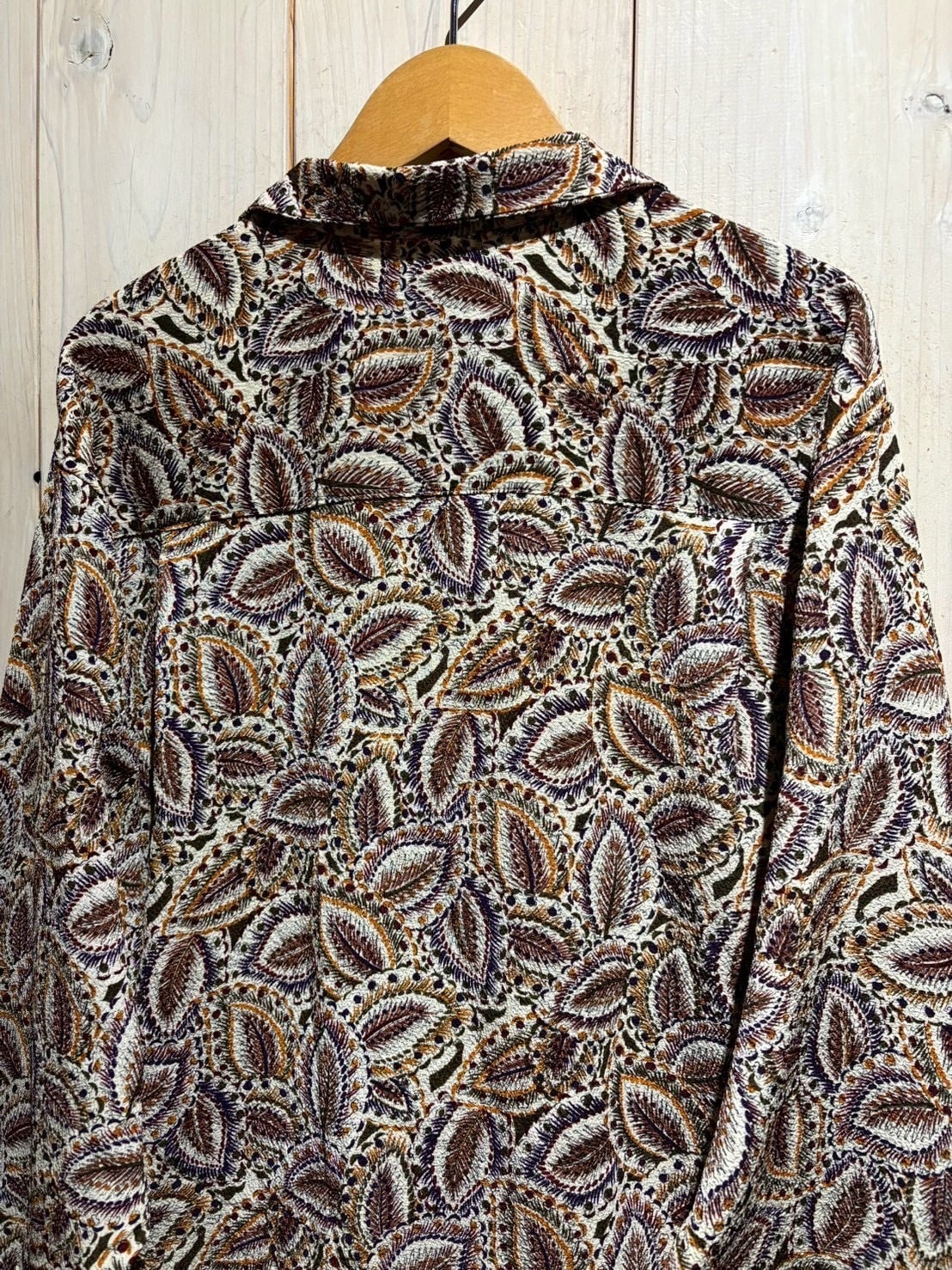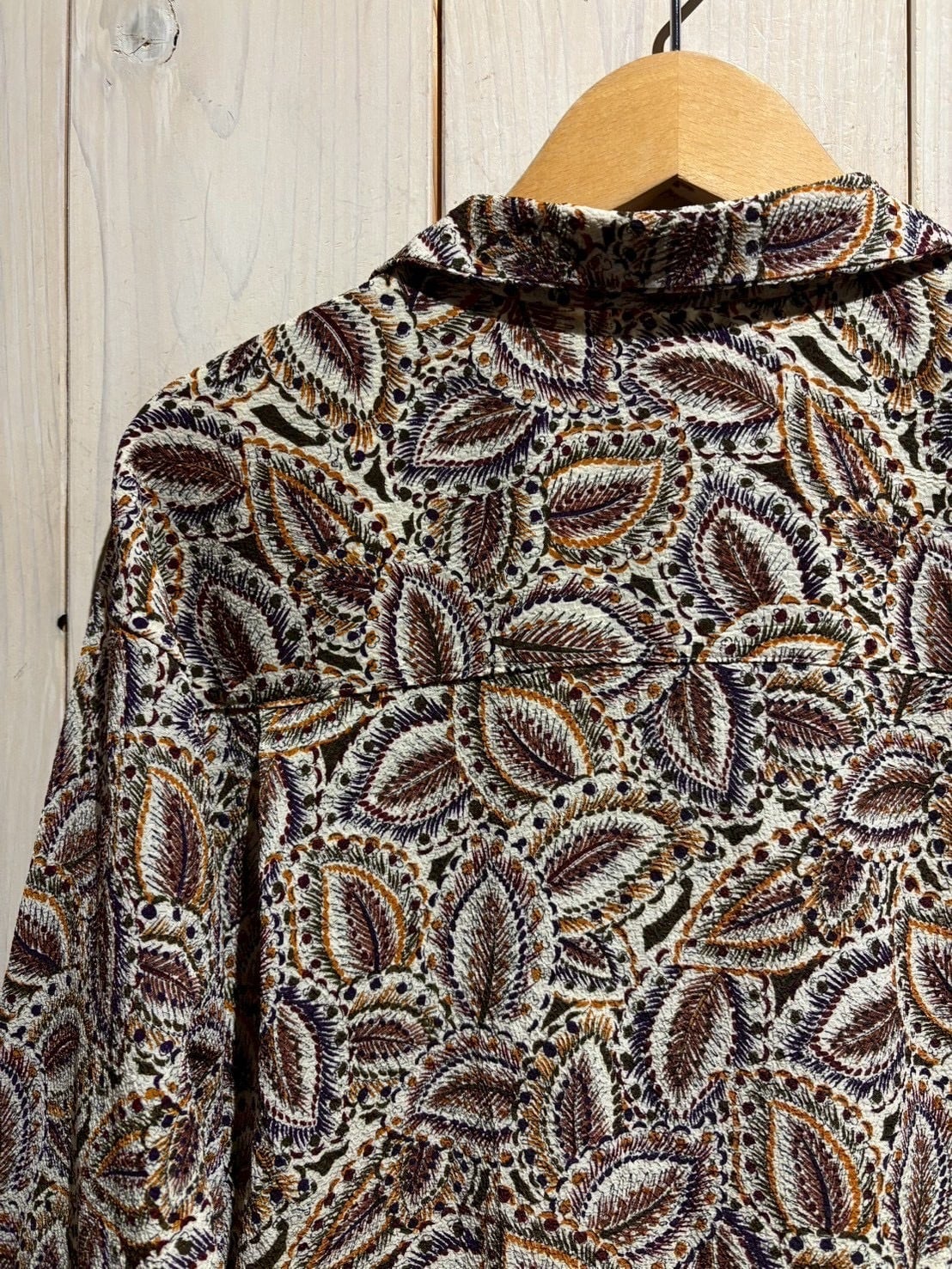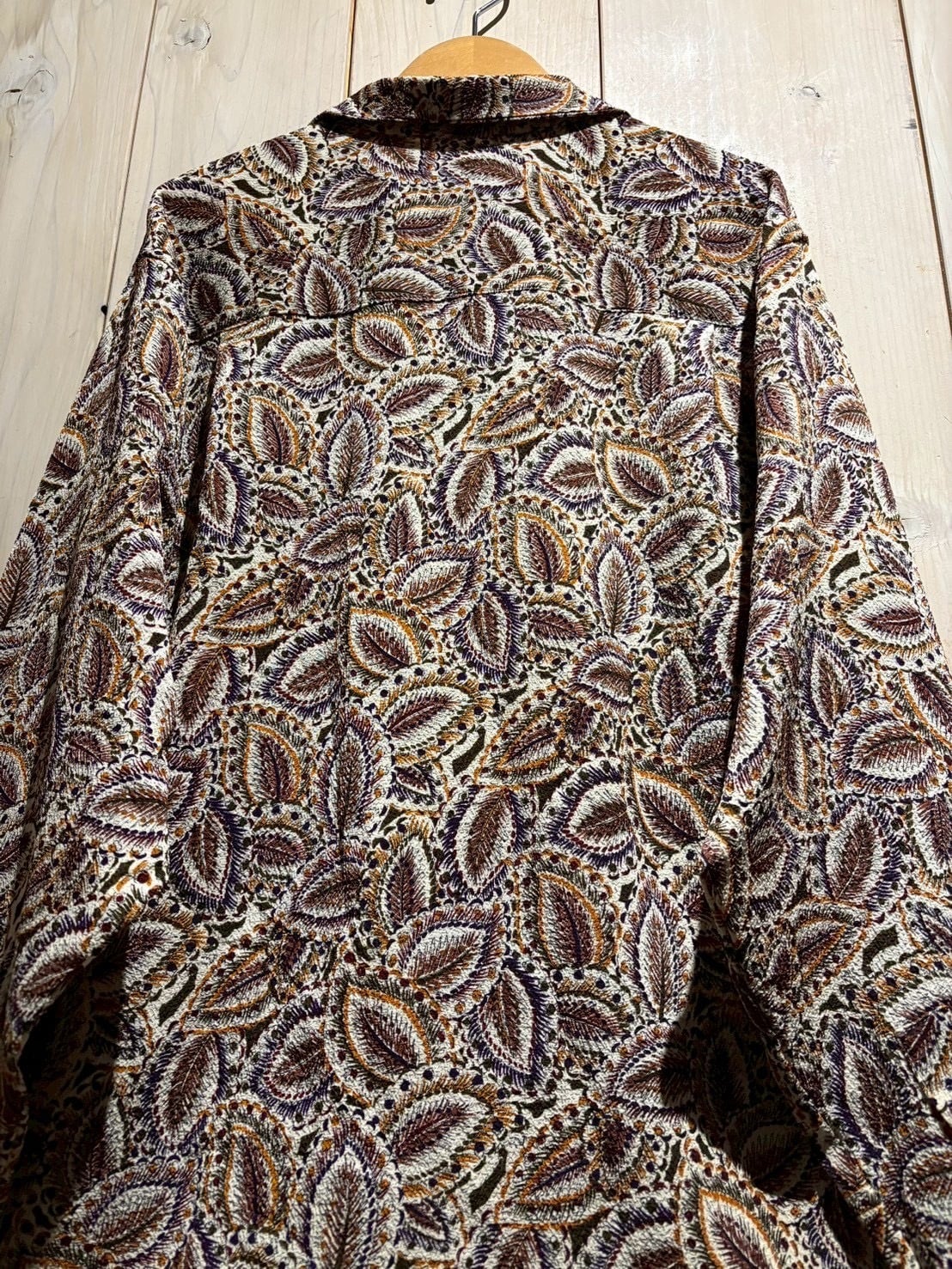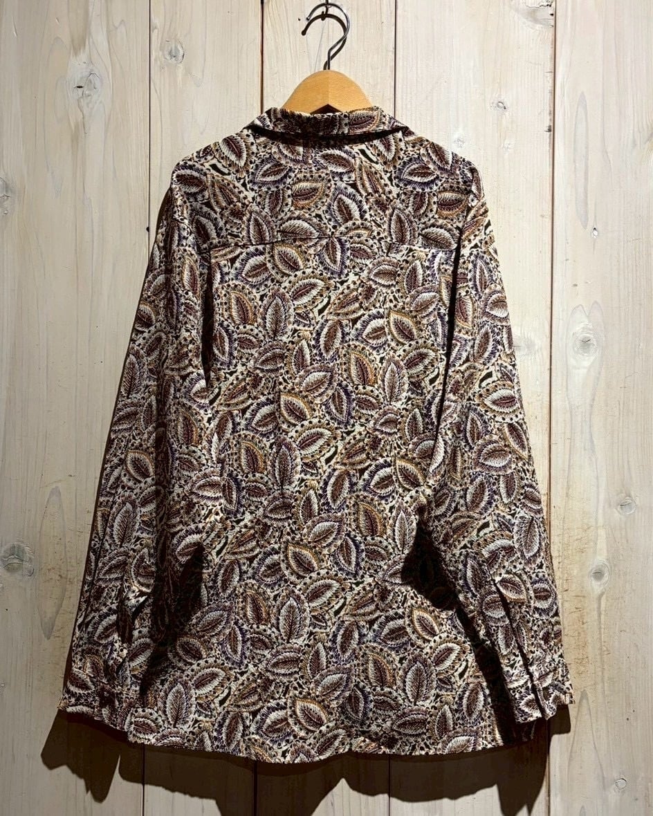 生成りがかったナチュラルなボディをベースに、ブラウン、バーガンディ、パープル、マスタードといった深みあるカラーリングでペイズリー柄を全面に配置。当時らしい、存在感のあるデザインに仕上がっています。