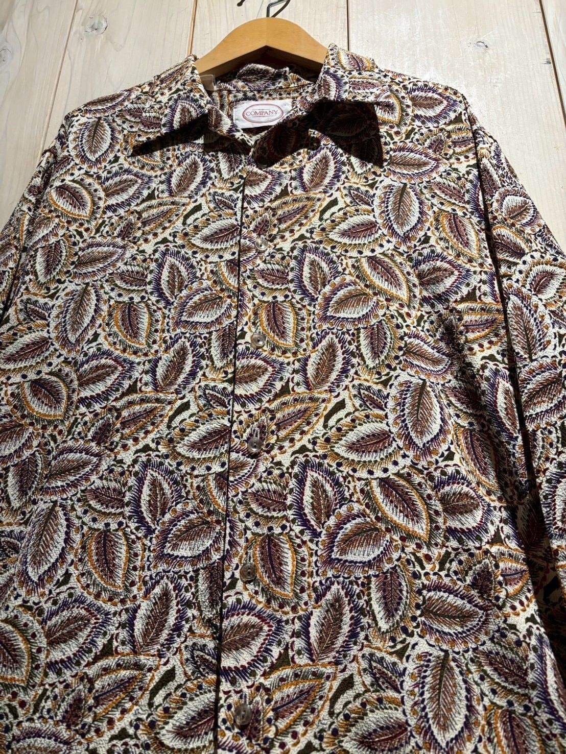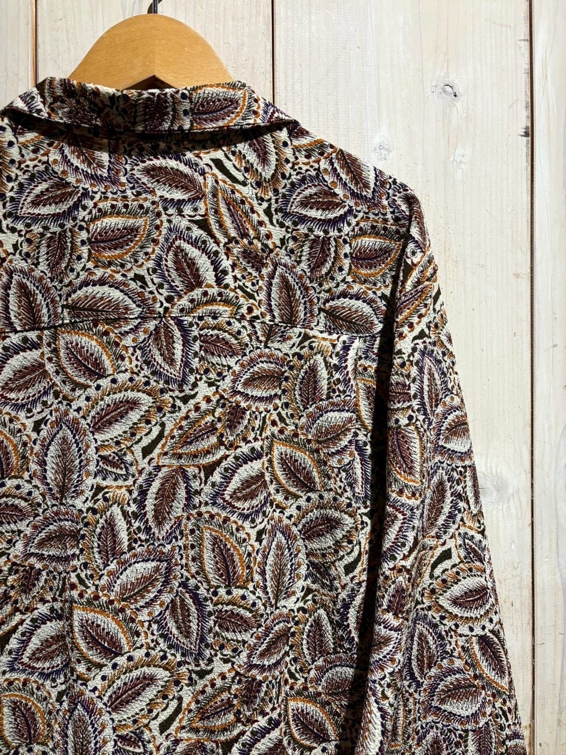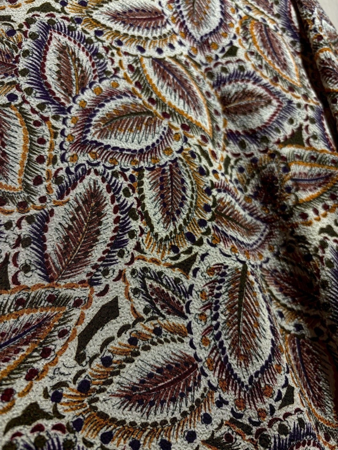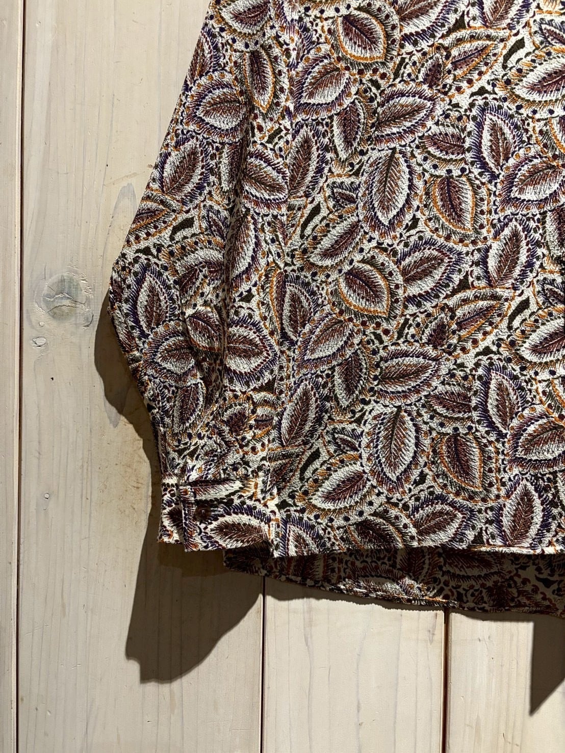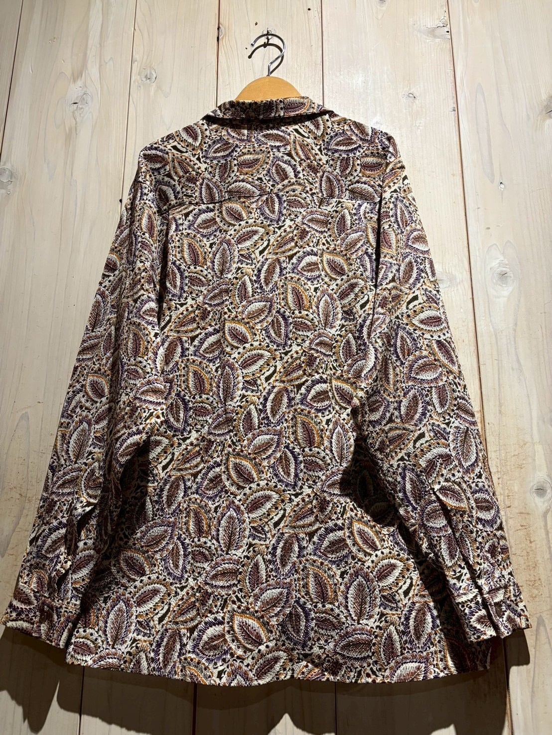 生成りがかったナチュラルなボディをベースに、ブラウン、バーガンディ、パープル、マスタードといった深みあるカラーリングでペイズリー柄を全面に配置。当時らしい、存在感のあるデザインに仕上がっています。