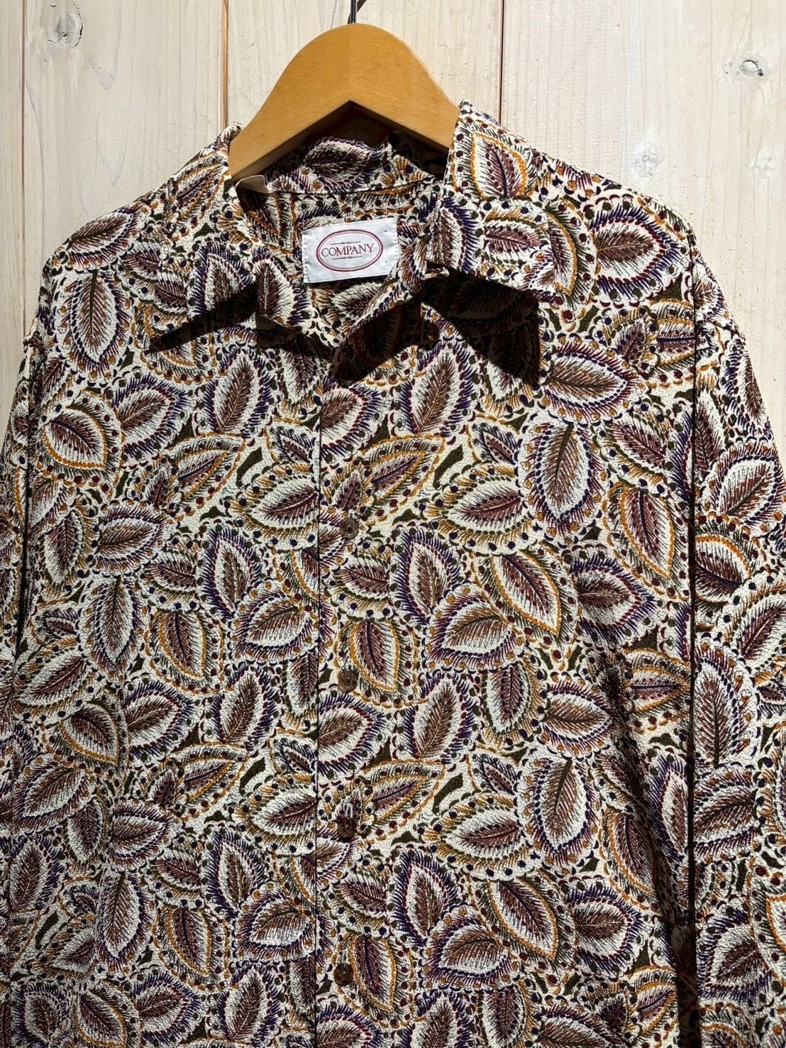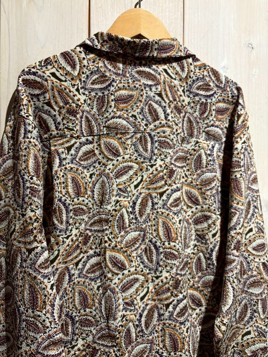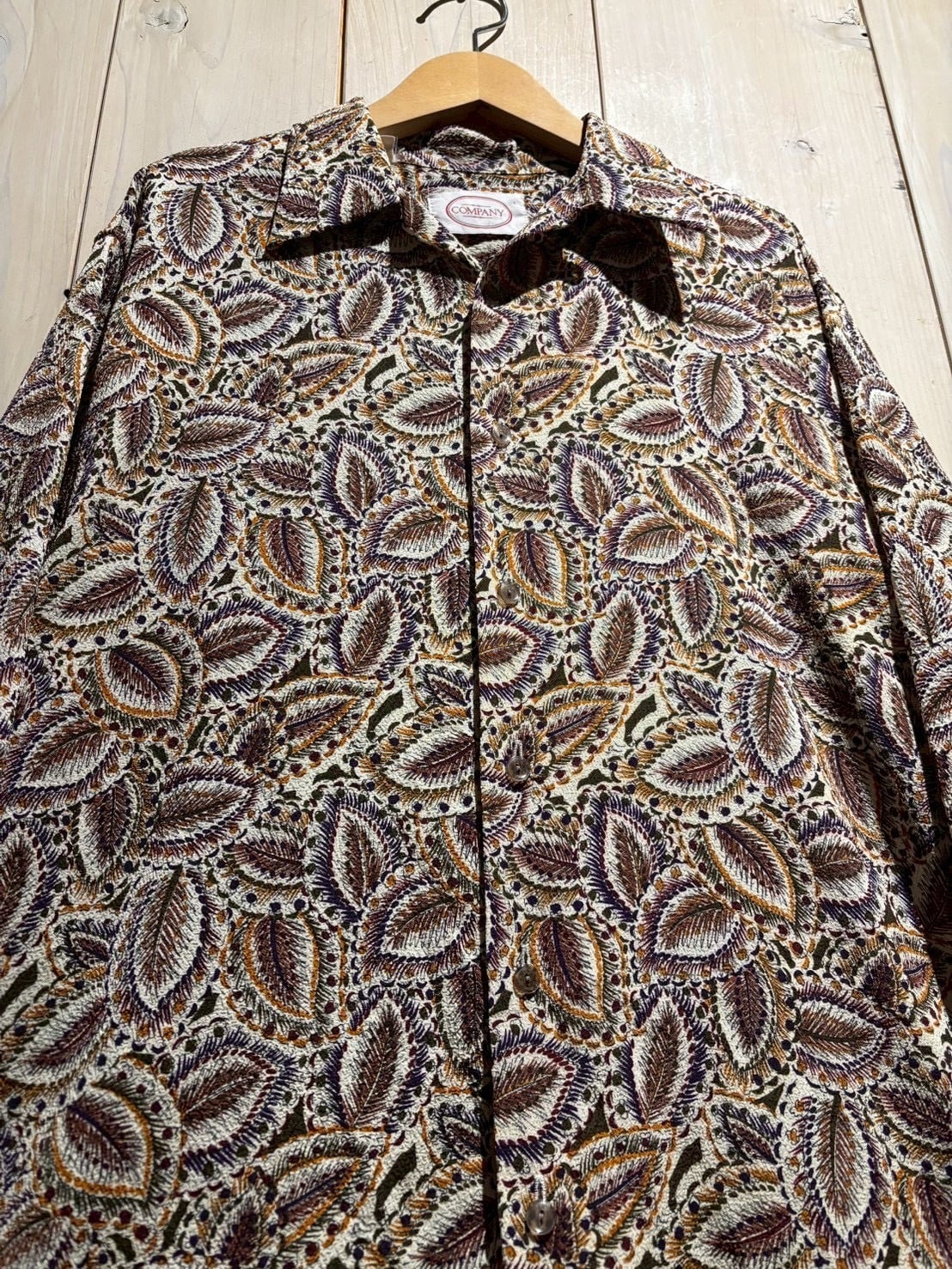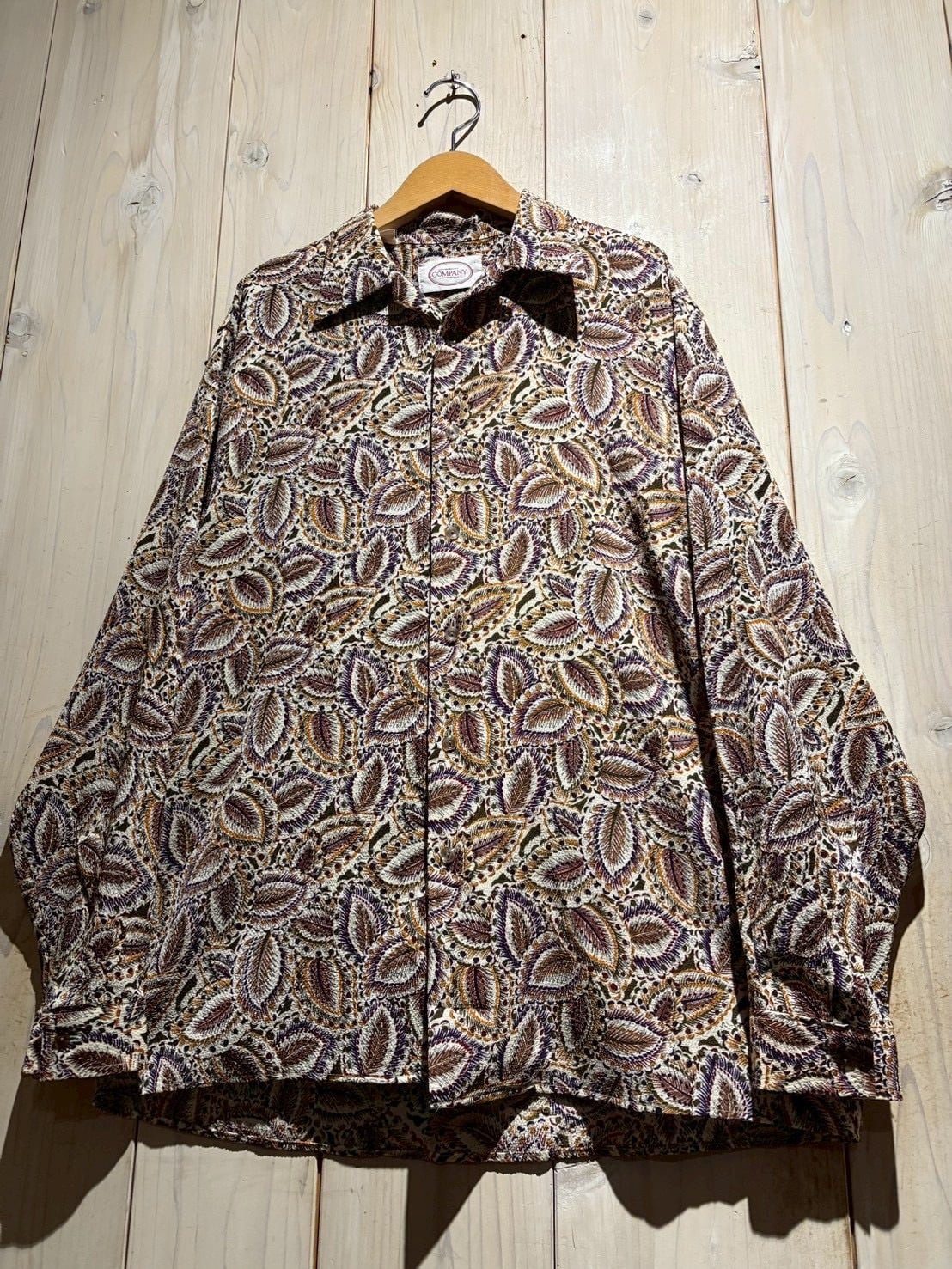 生成りがかったナチュラルなボディをベースに、ブラウン、バーガンディ、パープル、マスタードといった深みあるカラーリングでペイズリー柄を全面に配置。当時らしい、存在感のあるデザインに仕上がっています。