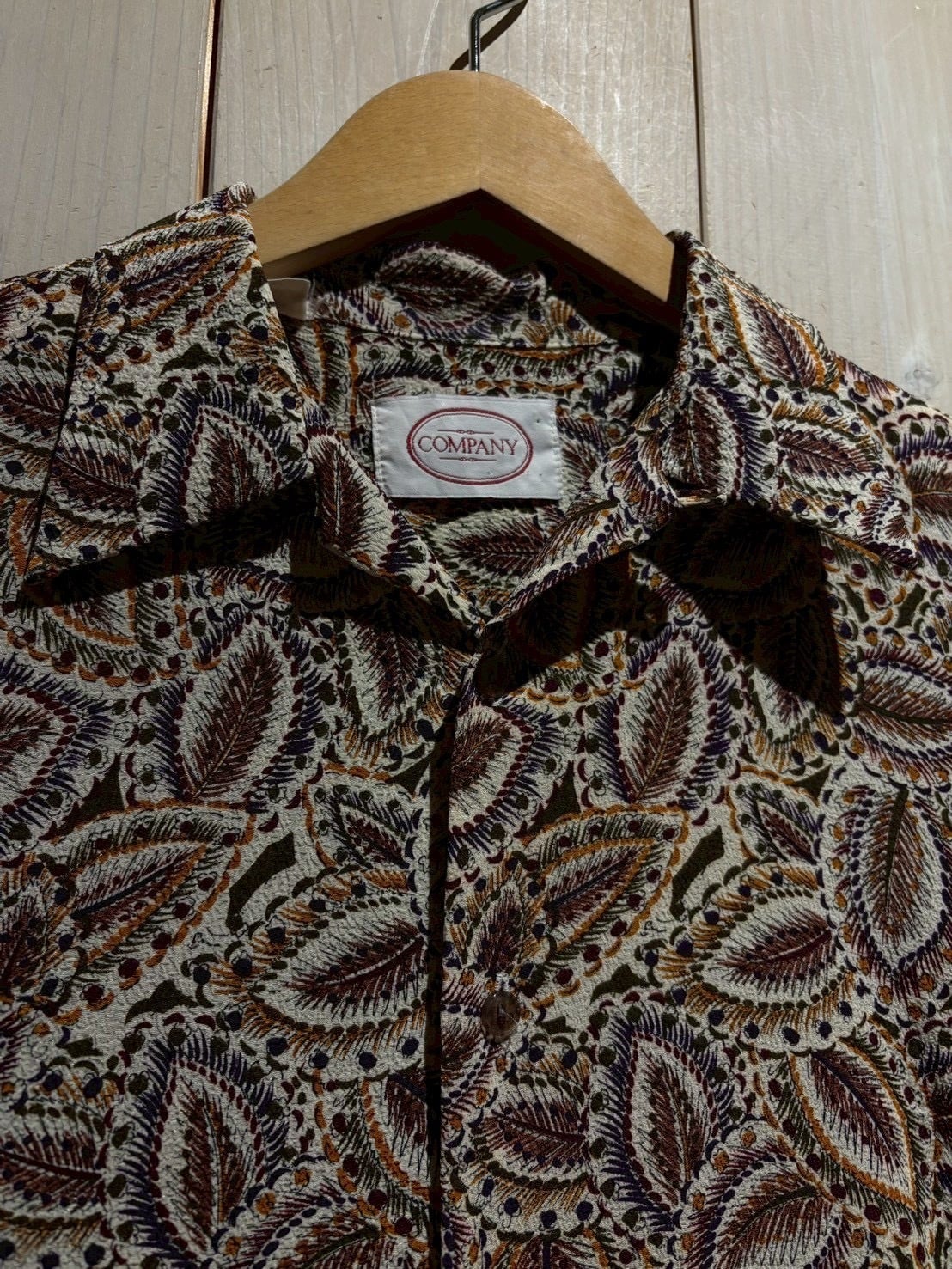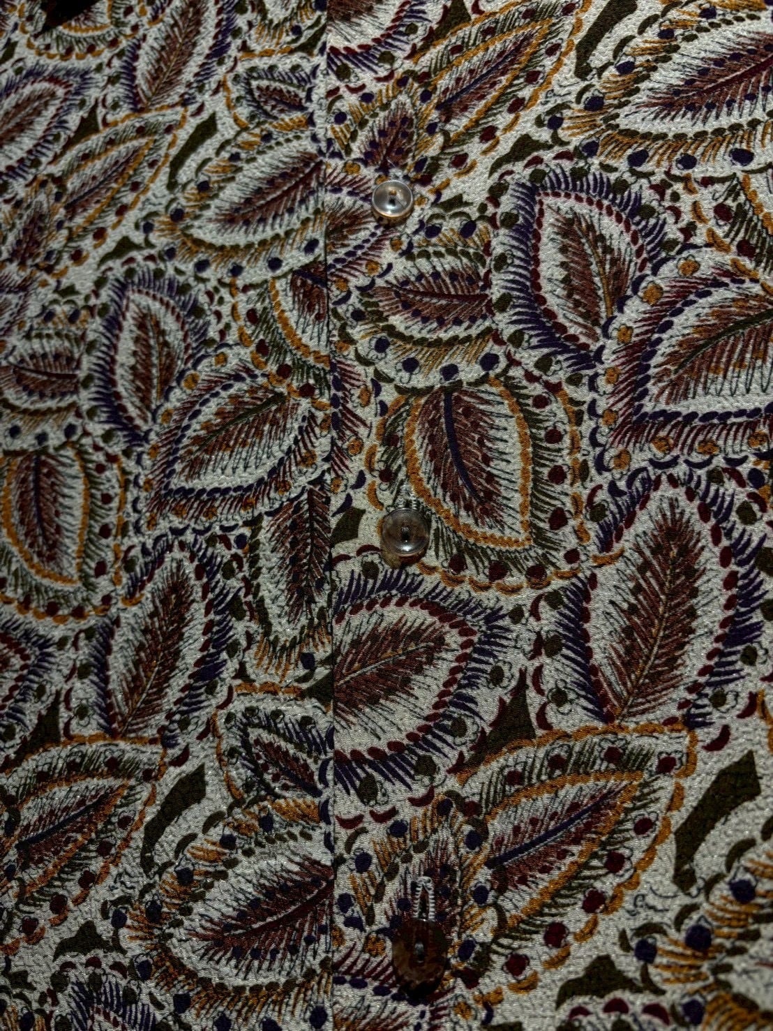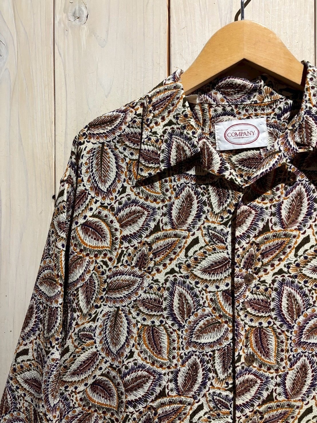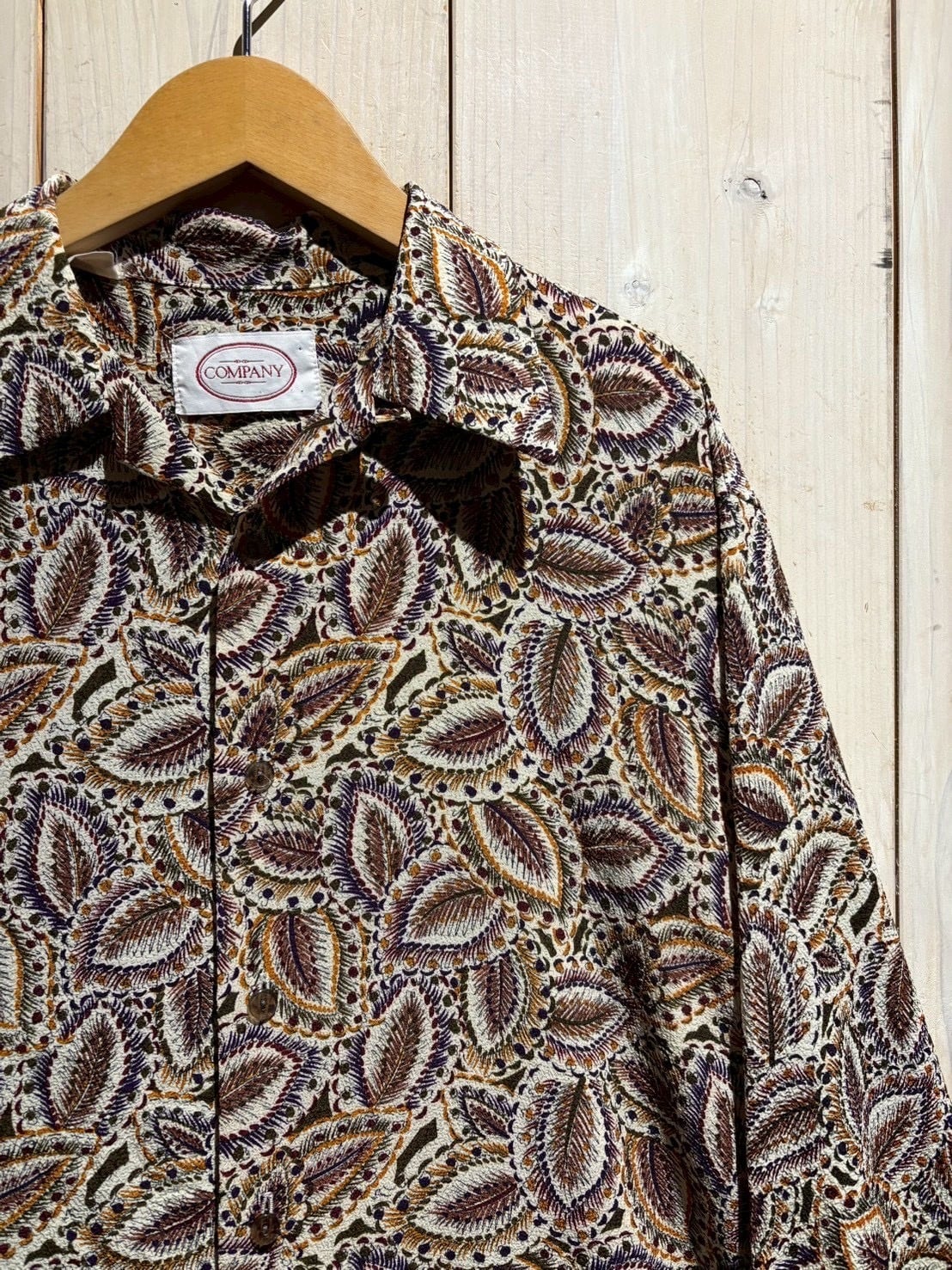 生成りがかったナチュラルなボディをベースに、ブラウン、バーガンディ、パープル、マスタードといった深みあるカラーリングでペイズリー柄を全面に配置。当時らしい、存在感のあるデザインに仕上がっています。