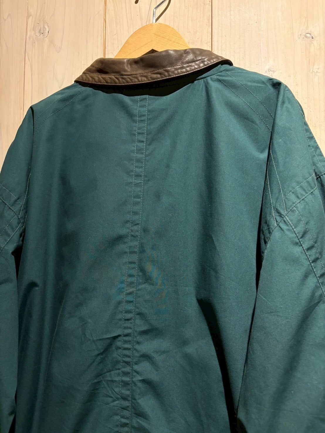 襟元にはブラウンのレザーを切り替え。深みのあるグリーンのボディとのコントラストが美しく、渋さを演出しています。