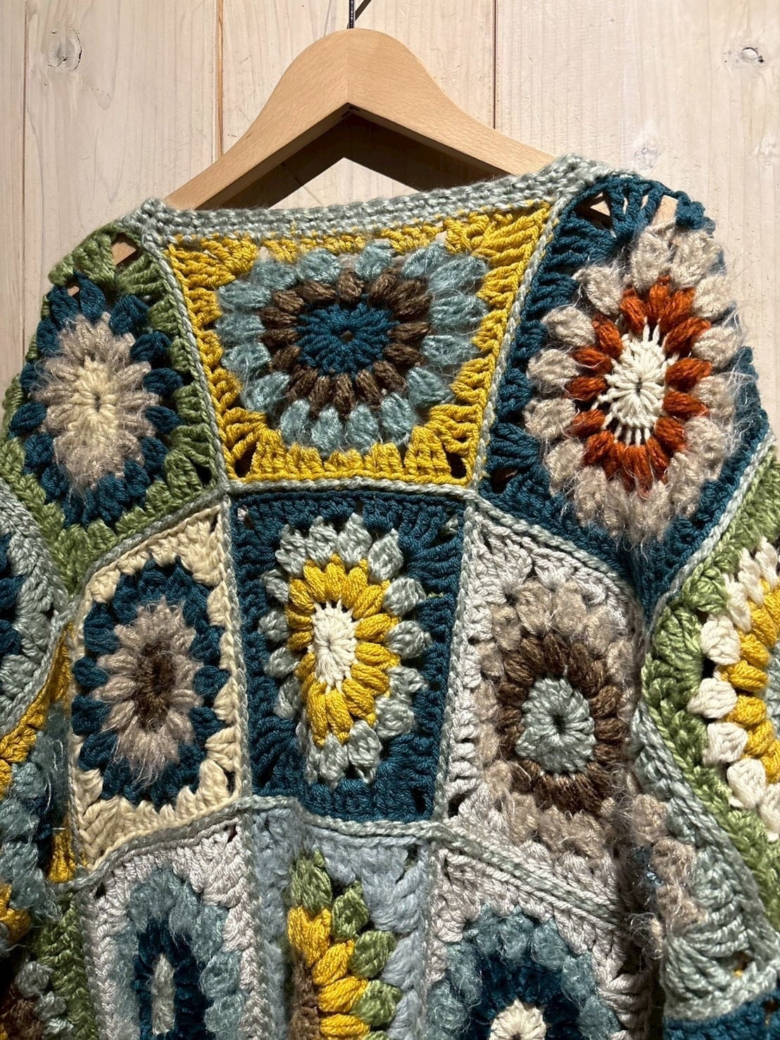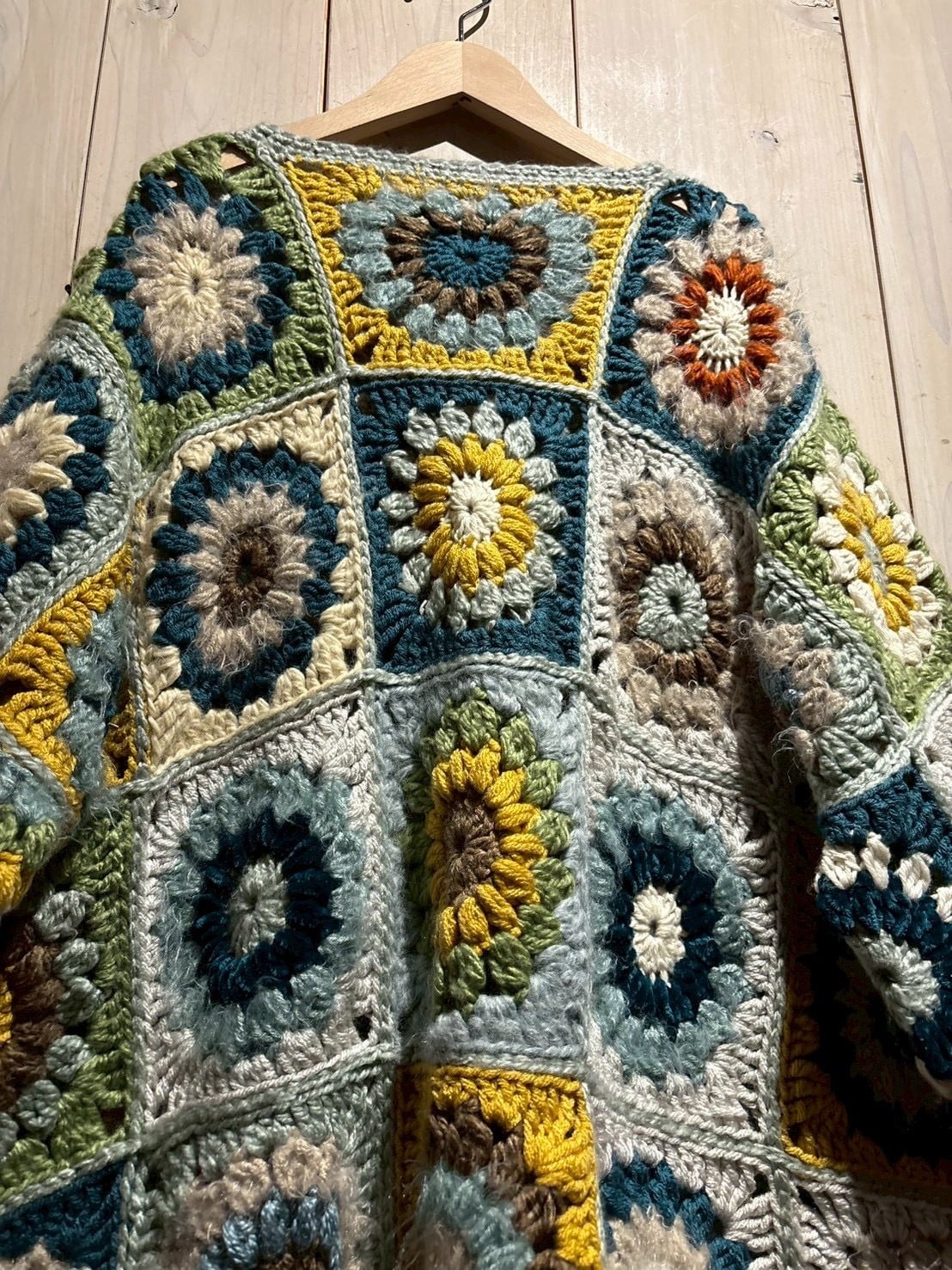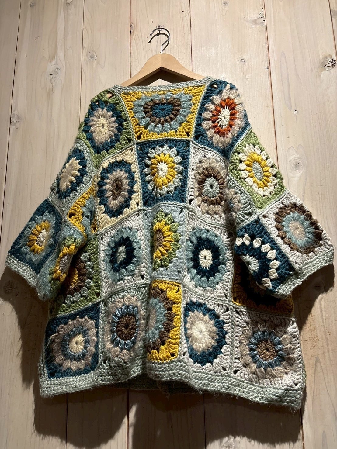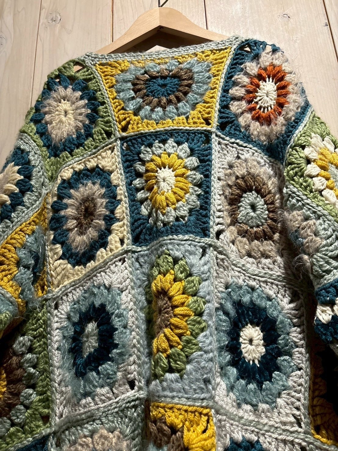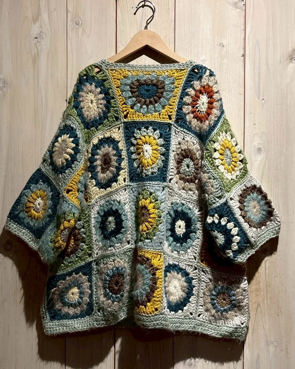 フロントからバックまで全面に施されたグラニースクエアのデザインが魅力で、ブルー、グリーン、イエロー、ブラウンなどの多彩なカラーリングで編み上げられた円状のモチーフをパッチワークのように組み合わせ、存在感のある仕上がりに。