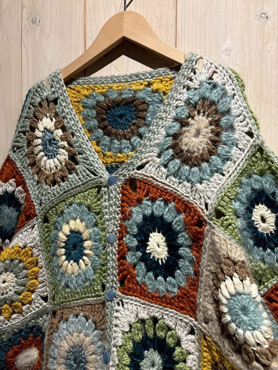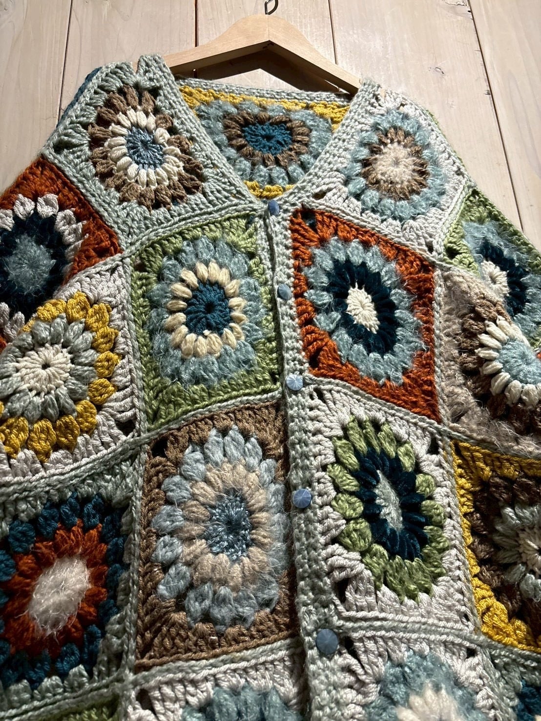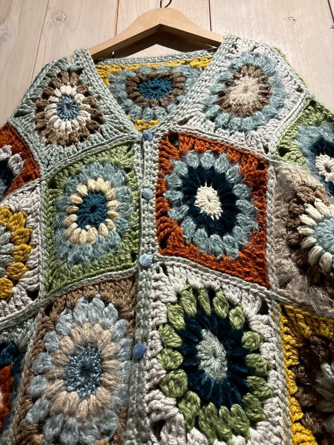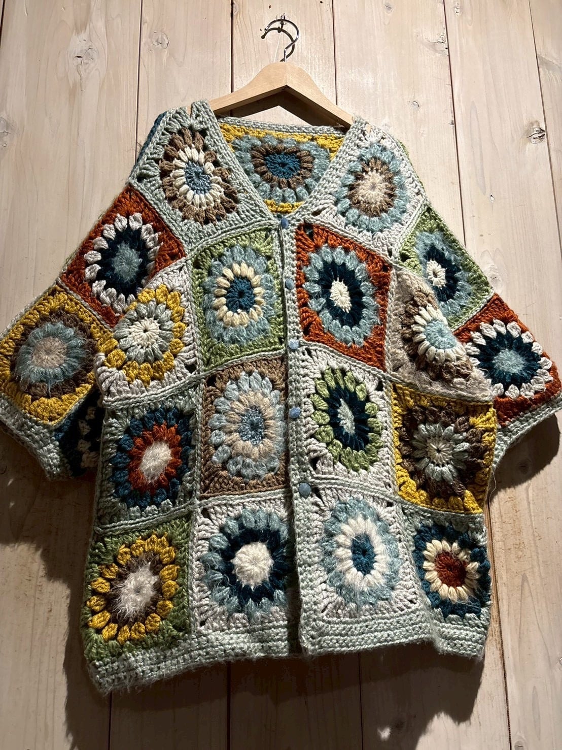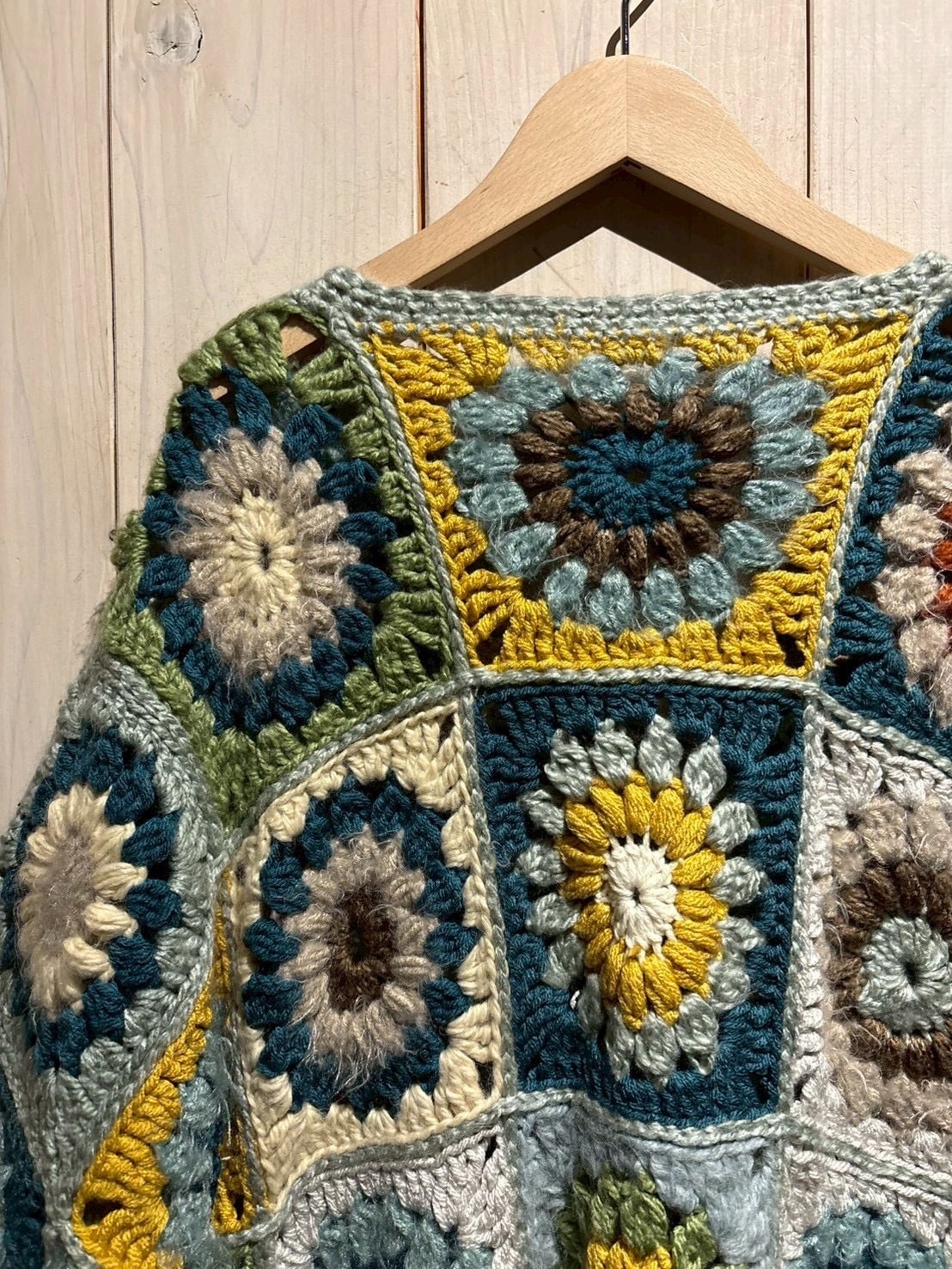 フロントからバックまで全面に施されたグラニースクエアのデザインが魅力で、ブルー、グリーン、イエロー、ブラウンなどの多彩なカラーリングで編み上げられた円状のモチーフをパッチワークのように組み合わせ、存在感のある仕上がりに。
