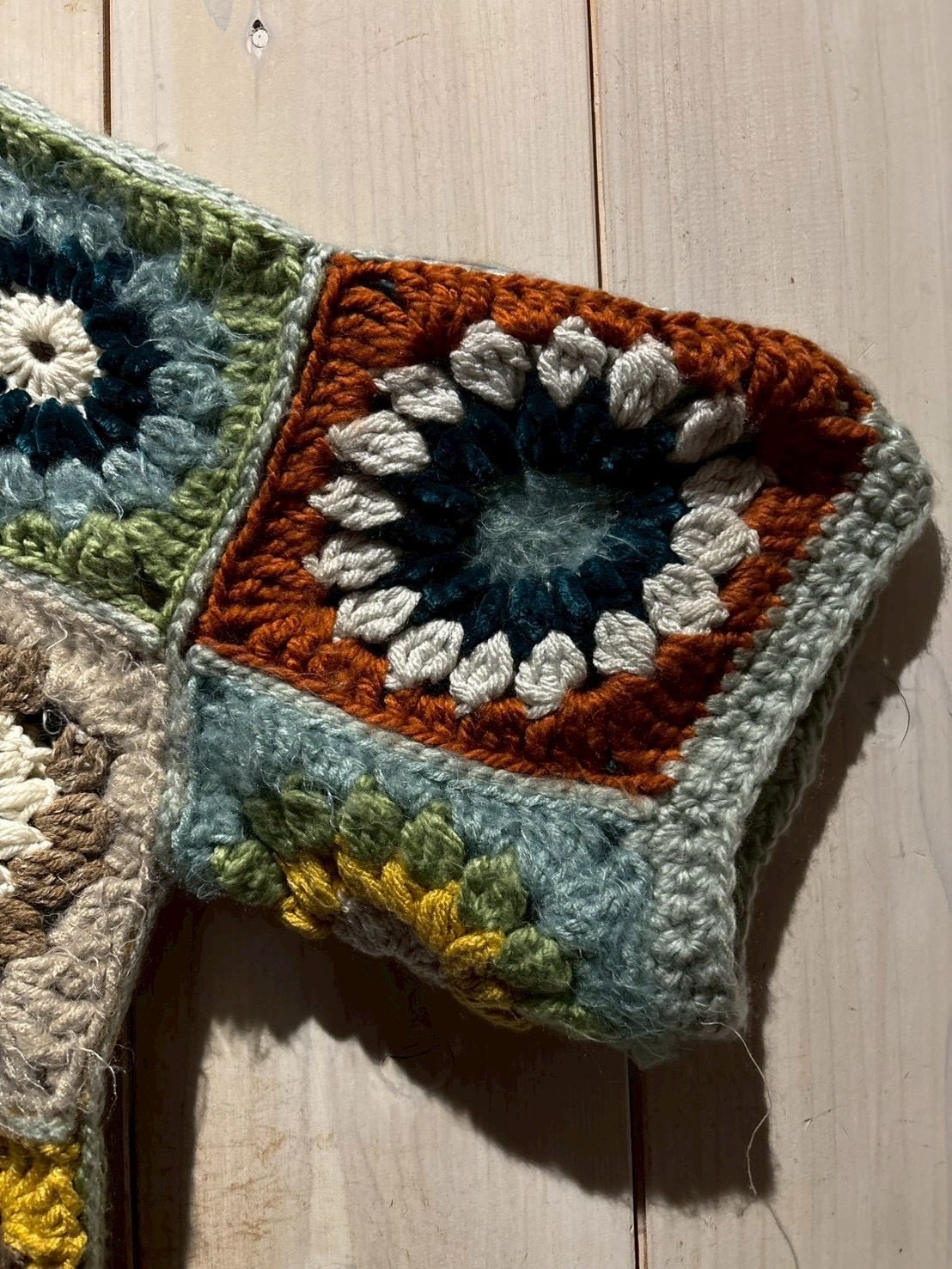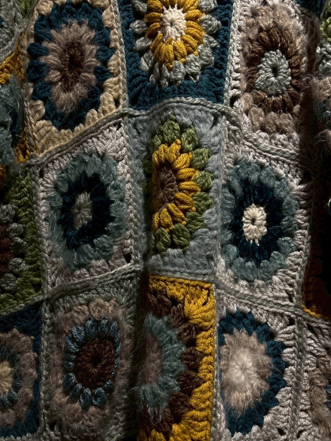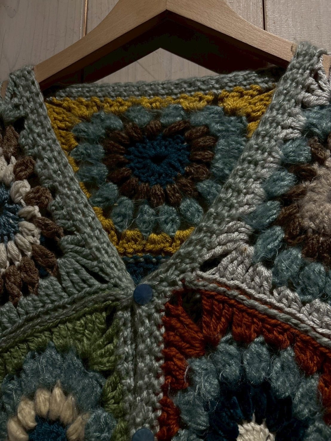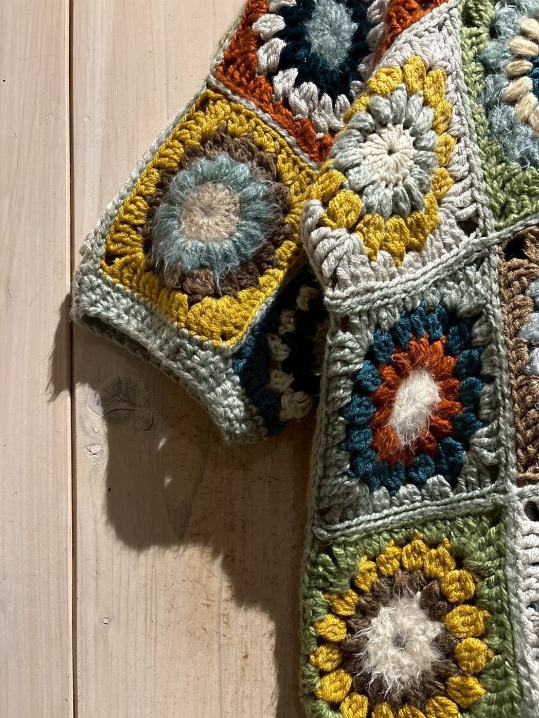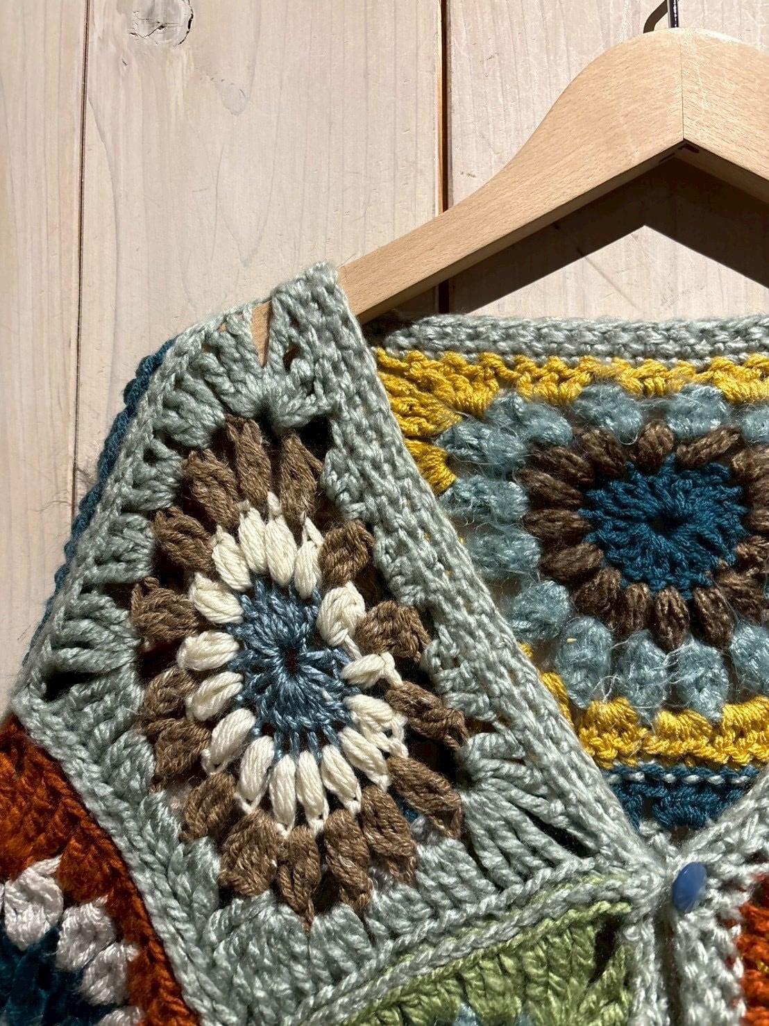 フロントからバックまで全面に施されたグラニースクエアのデザインが魅力で、ブルー、グリーン、イエロー、ブラウンなどの多彩なカラーリングで編み上げられた円状のモチーフをパッチワークのように組み合わせ、存在感のある仕上がりに。