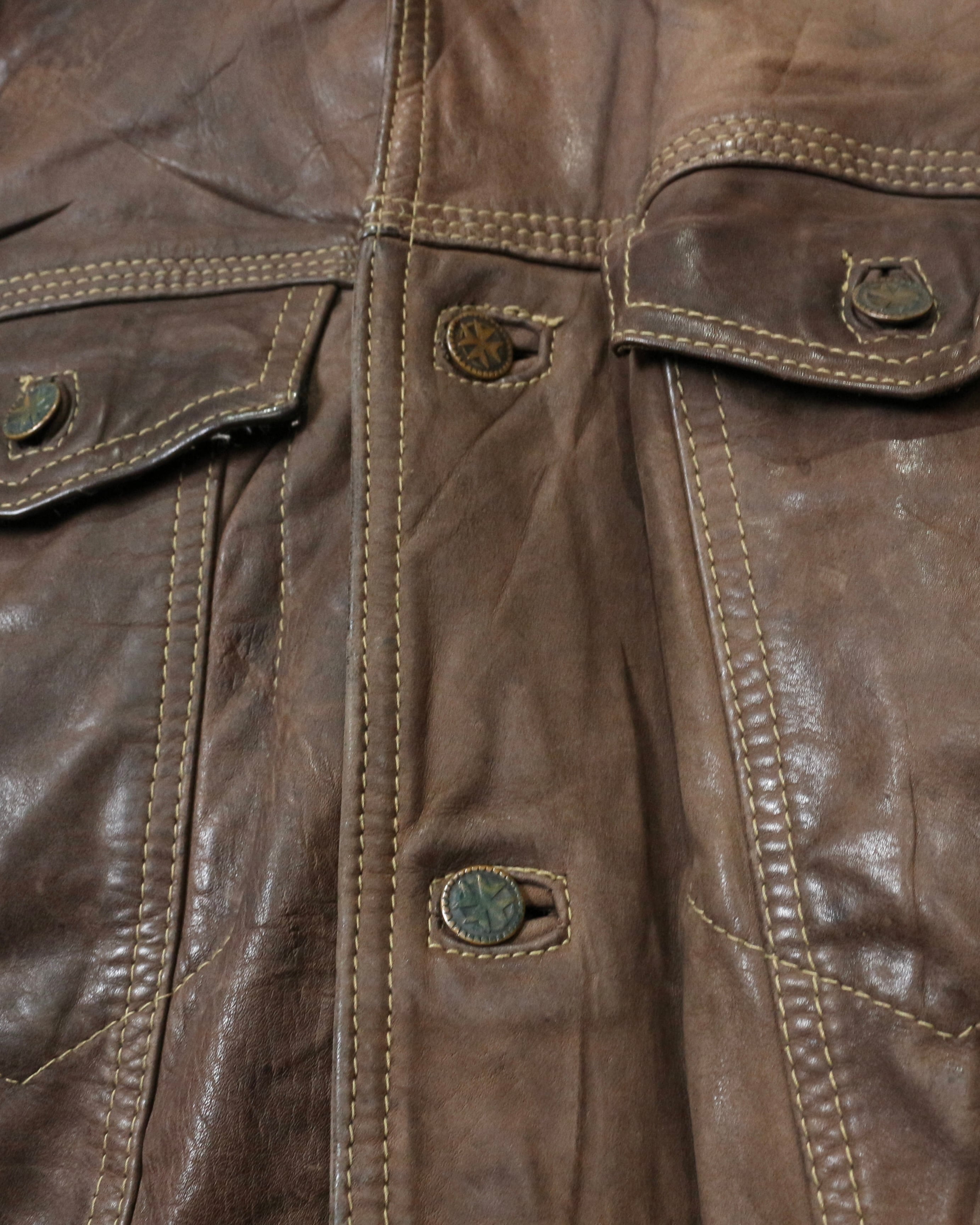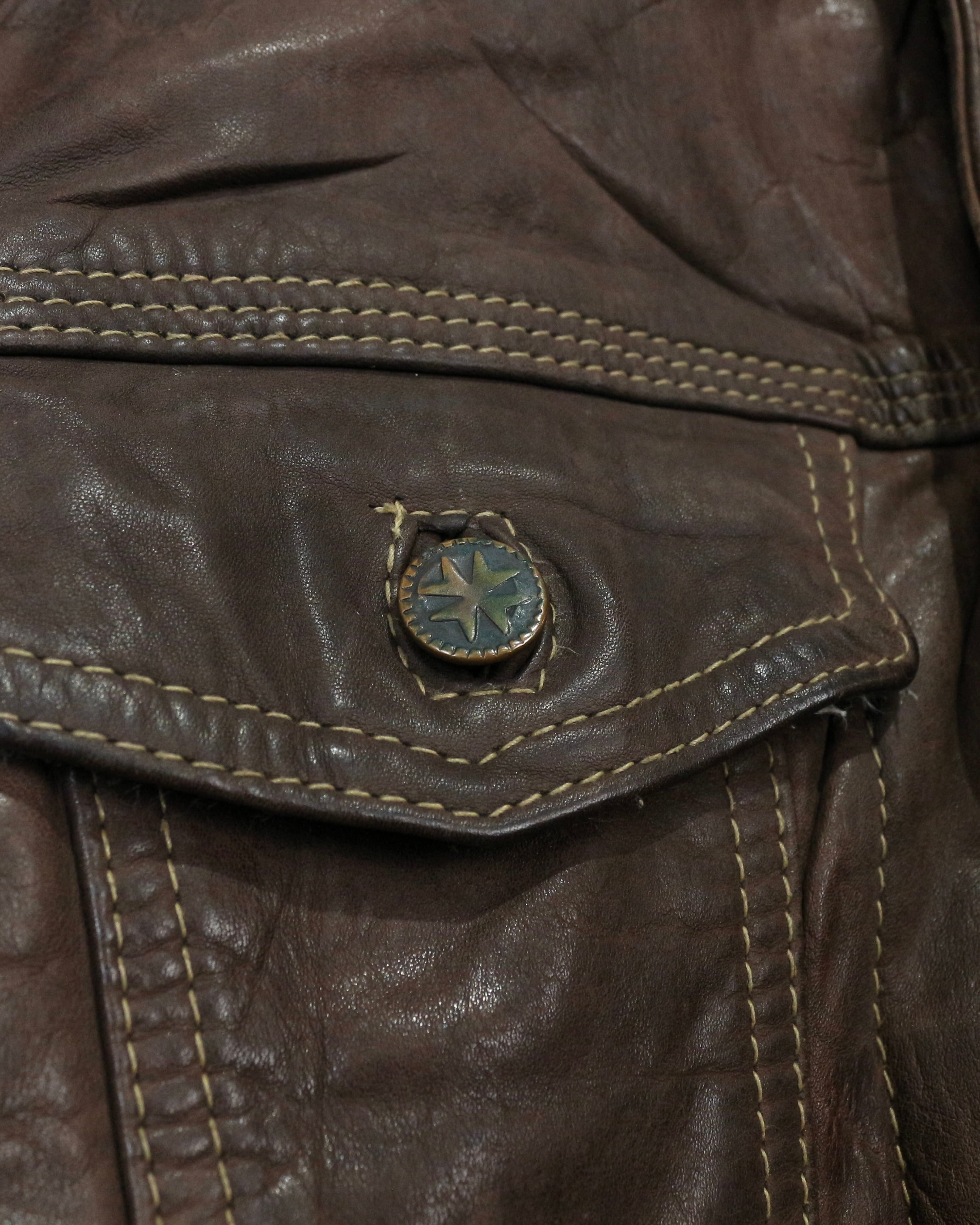 フロントはクラシックなボタン仕様。胸元にはフラップポケットを配置し、トラッカージャケットの王道ディテールを踏襲。随所に施されたトリプルステッチや立体的な切り替えがレザーの質感を際立たせ、丁寧な作り込みを感じさせますね。