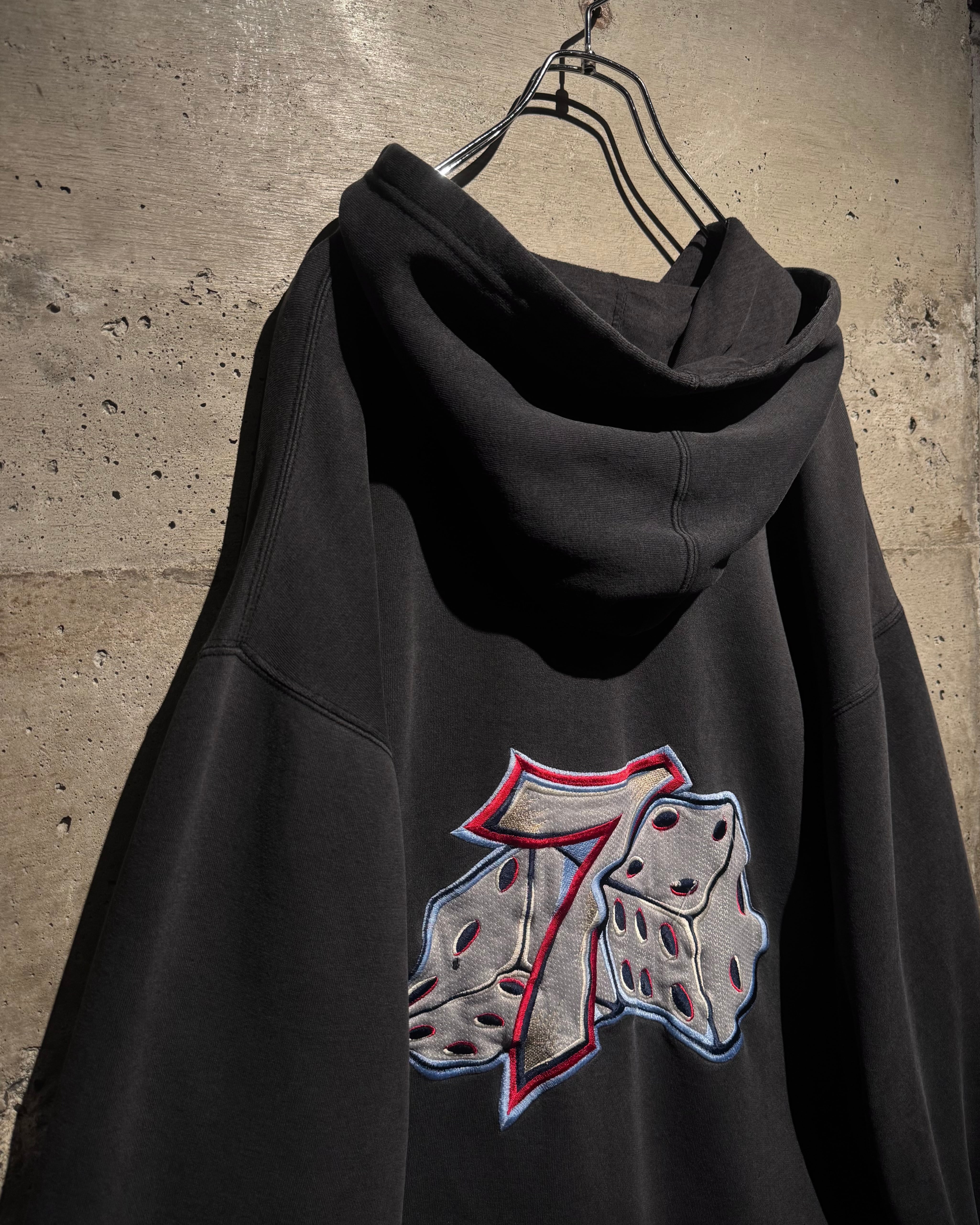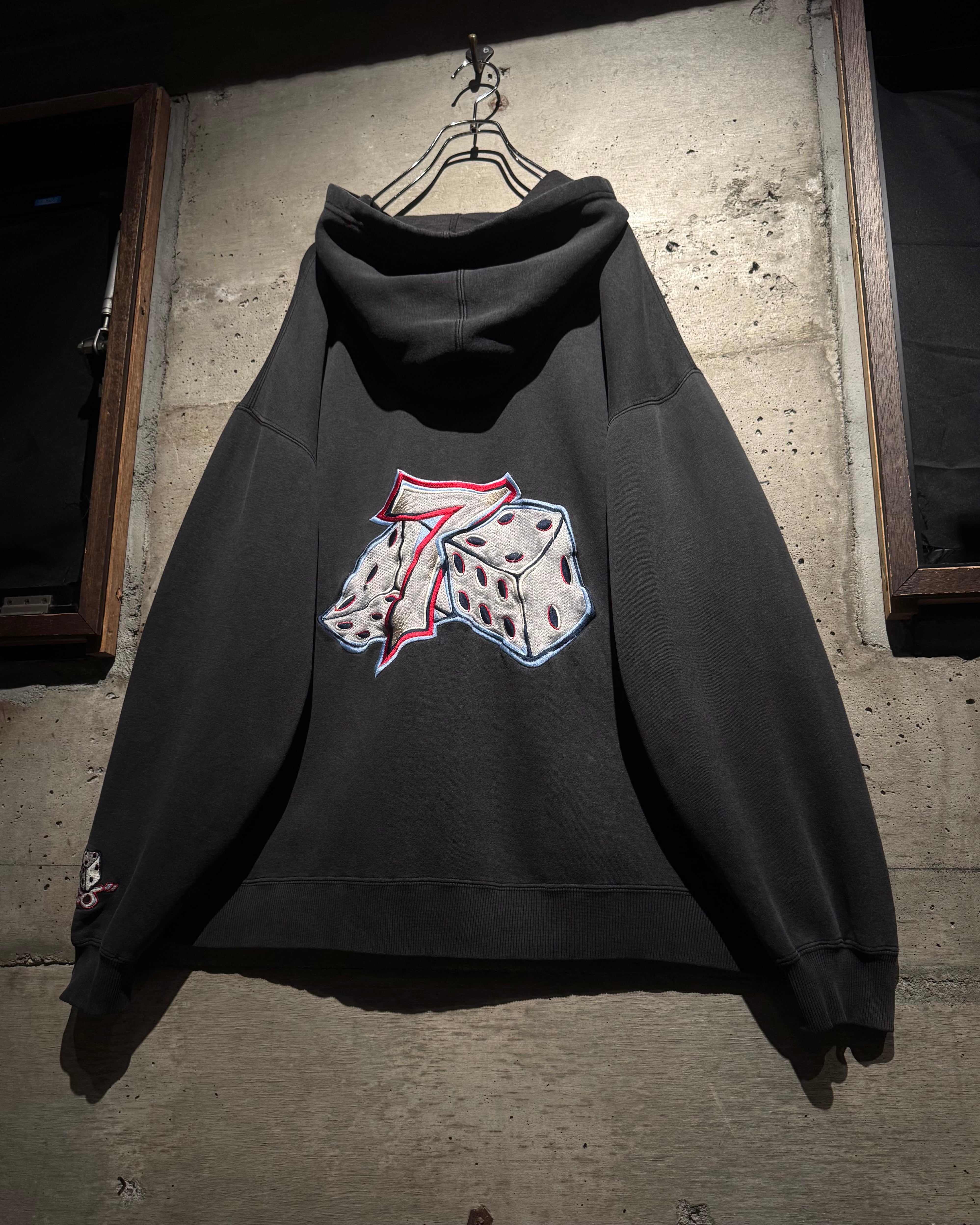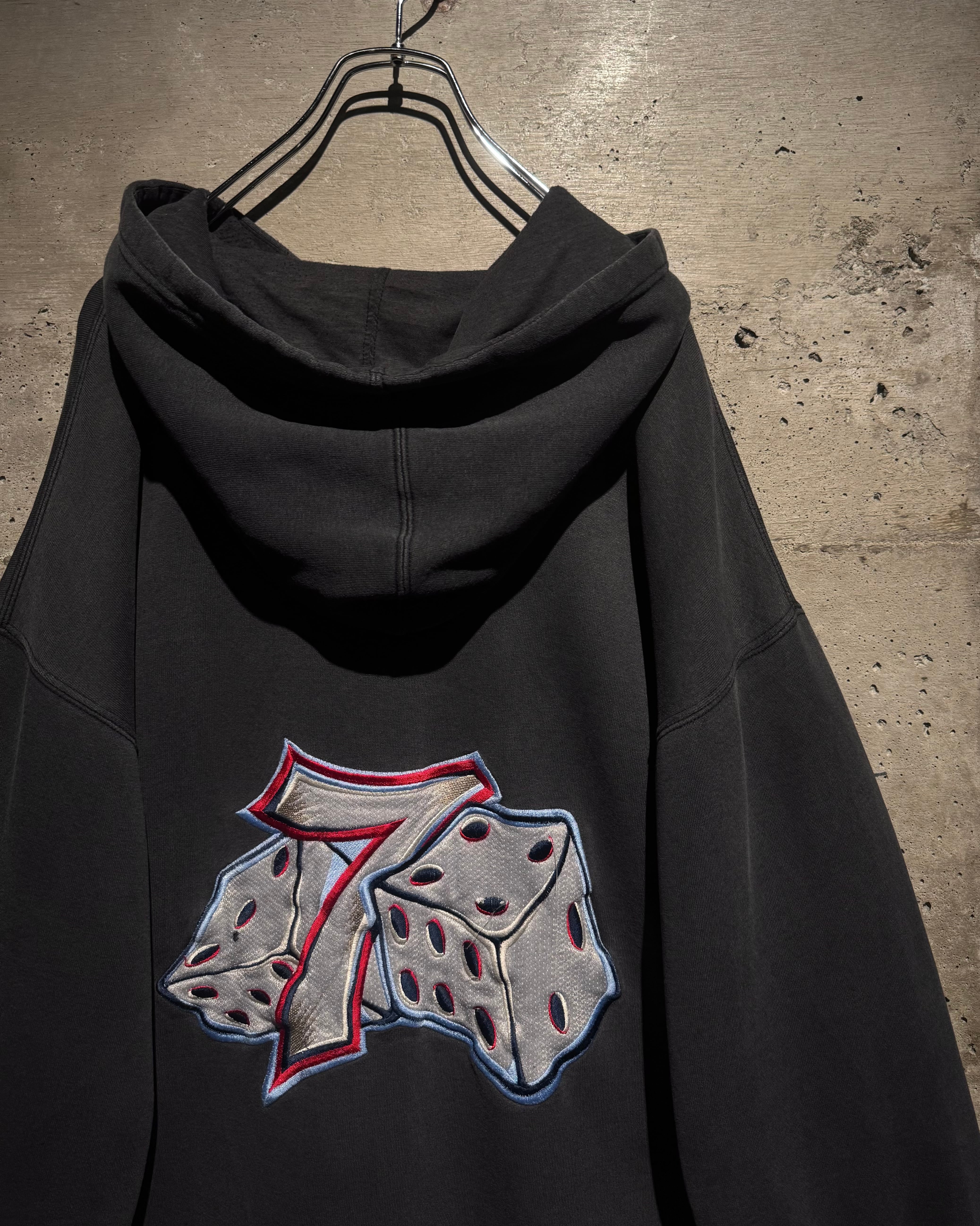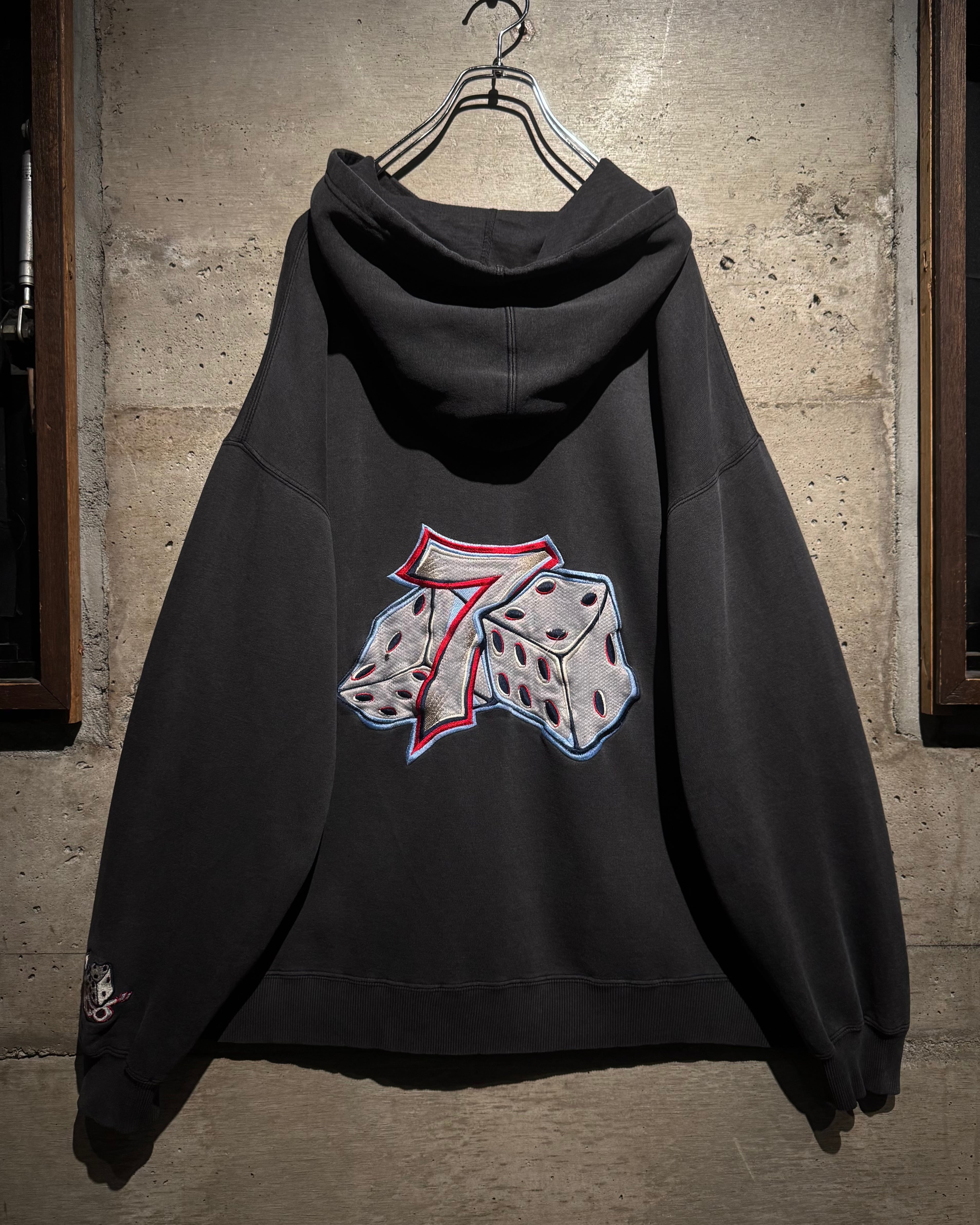 フロントにはナンバリング「7」、バックにはブランドを象徴するサイコロモチーフを大胆に配置。スケートカルチャーやレイヴシーンとリンクした、当時らしいアイコニックなデザイン。