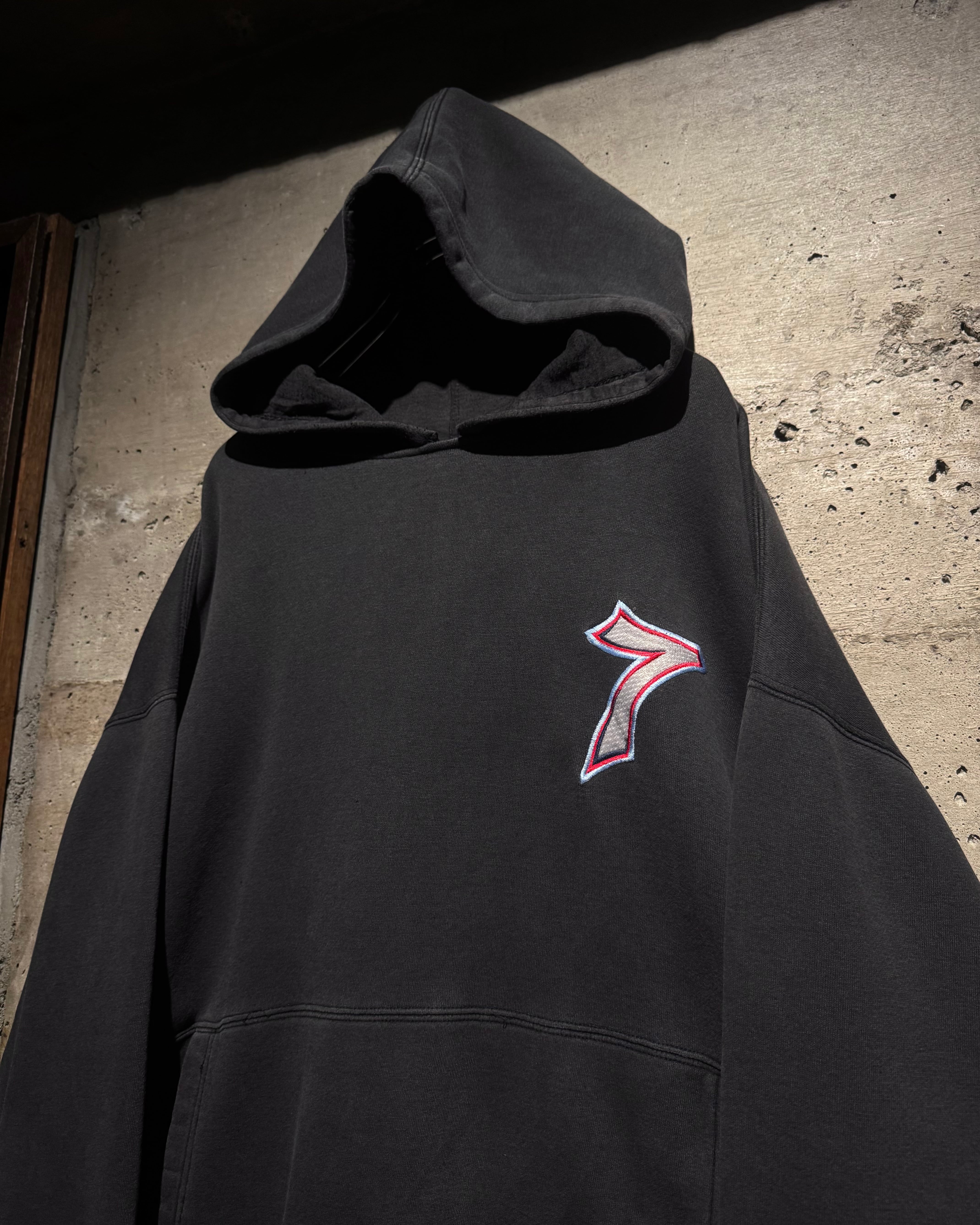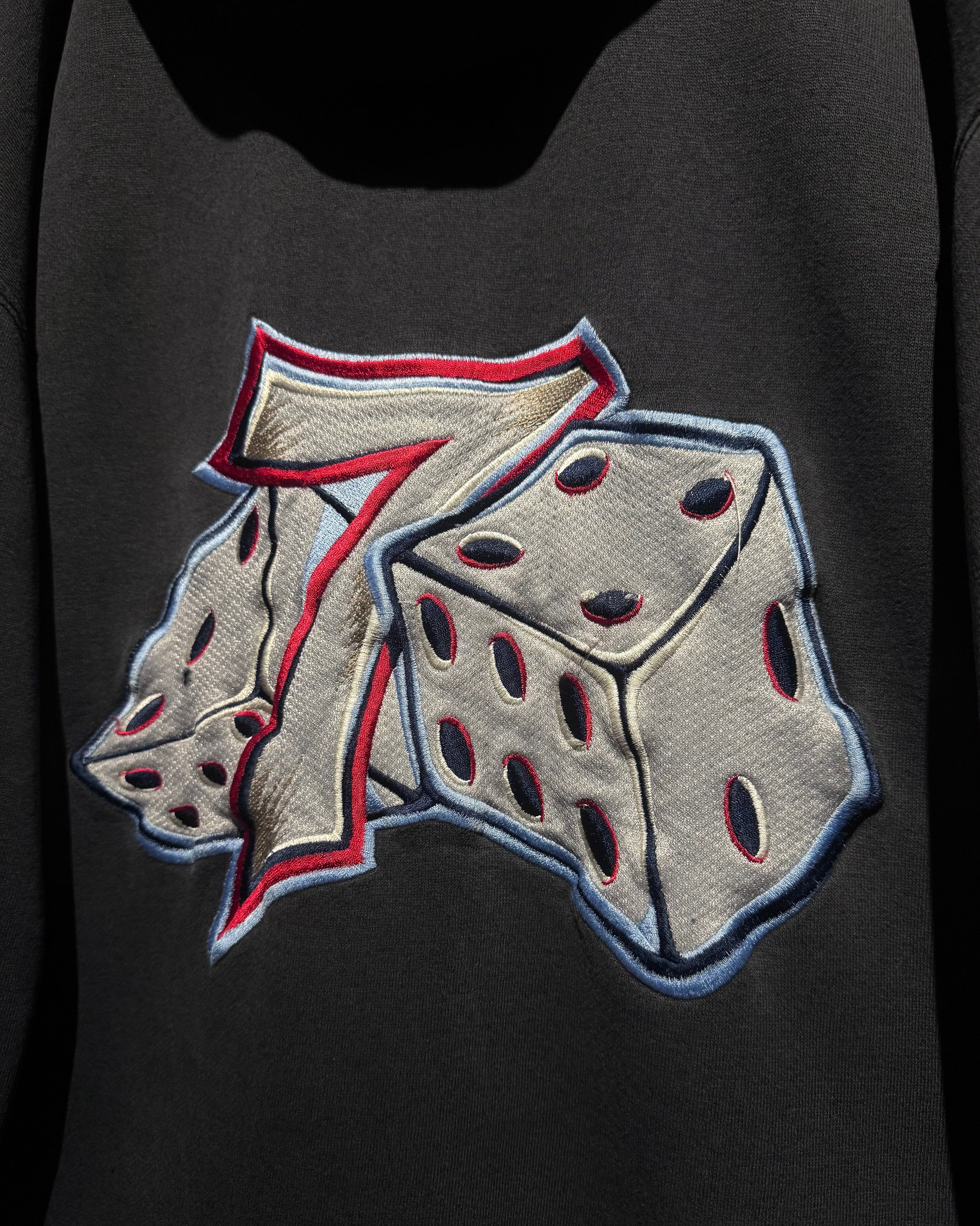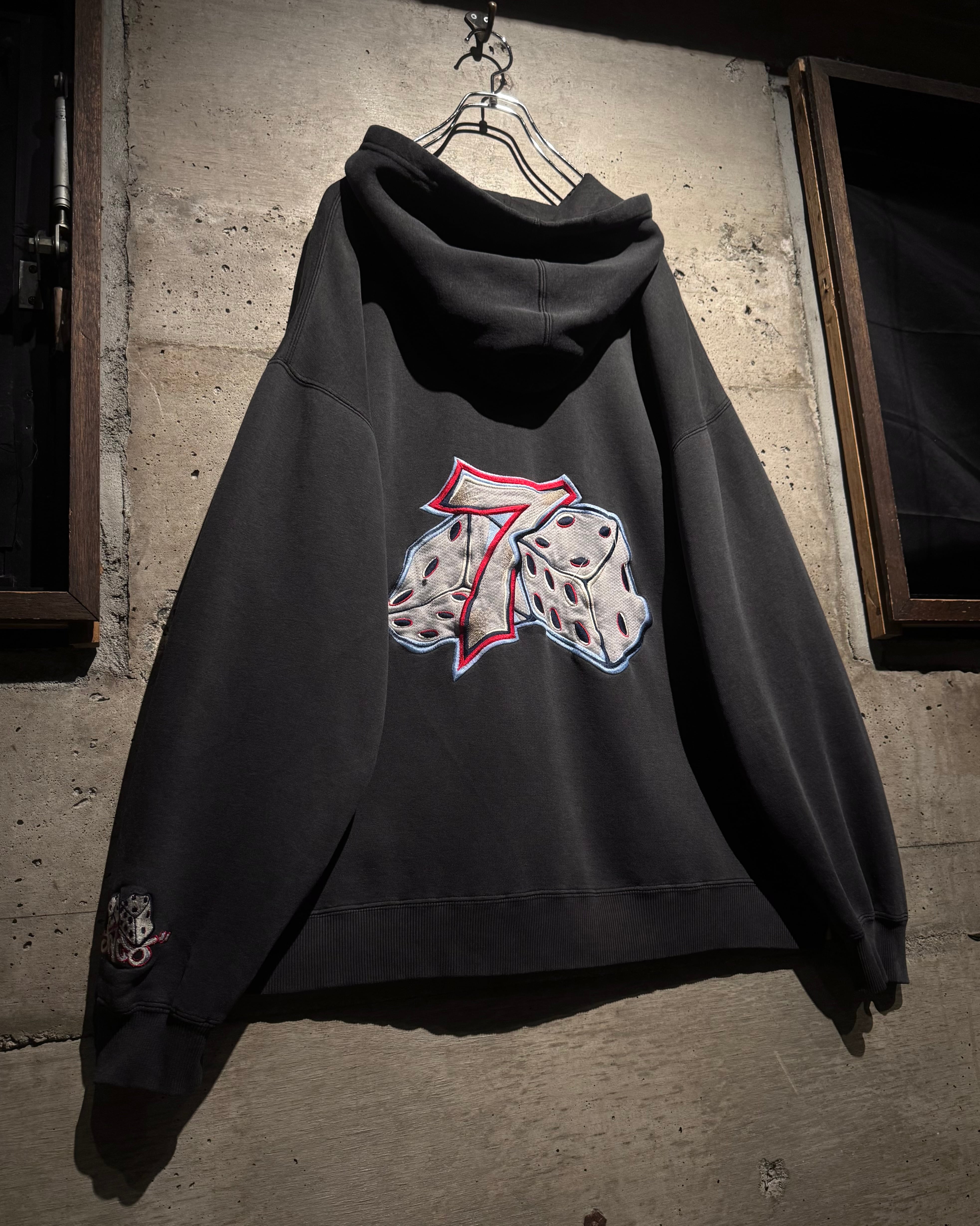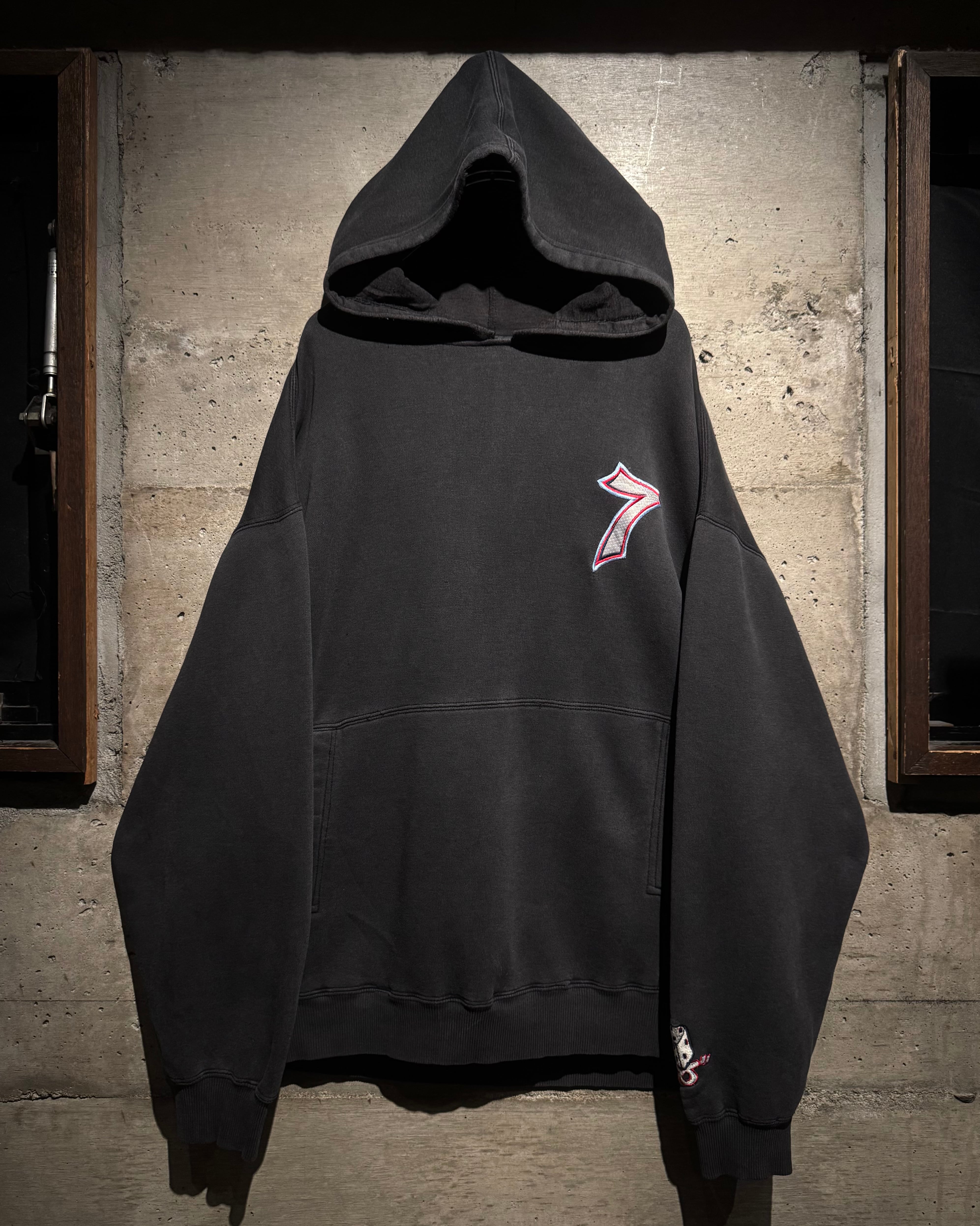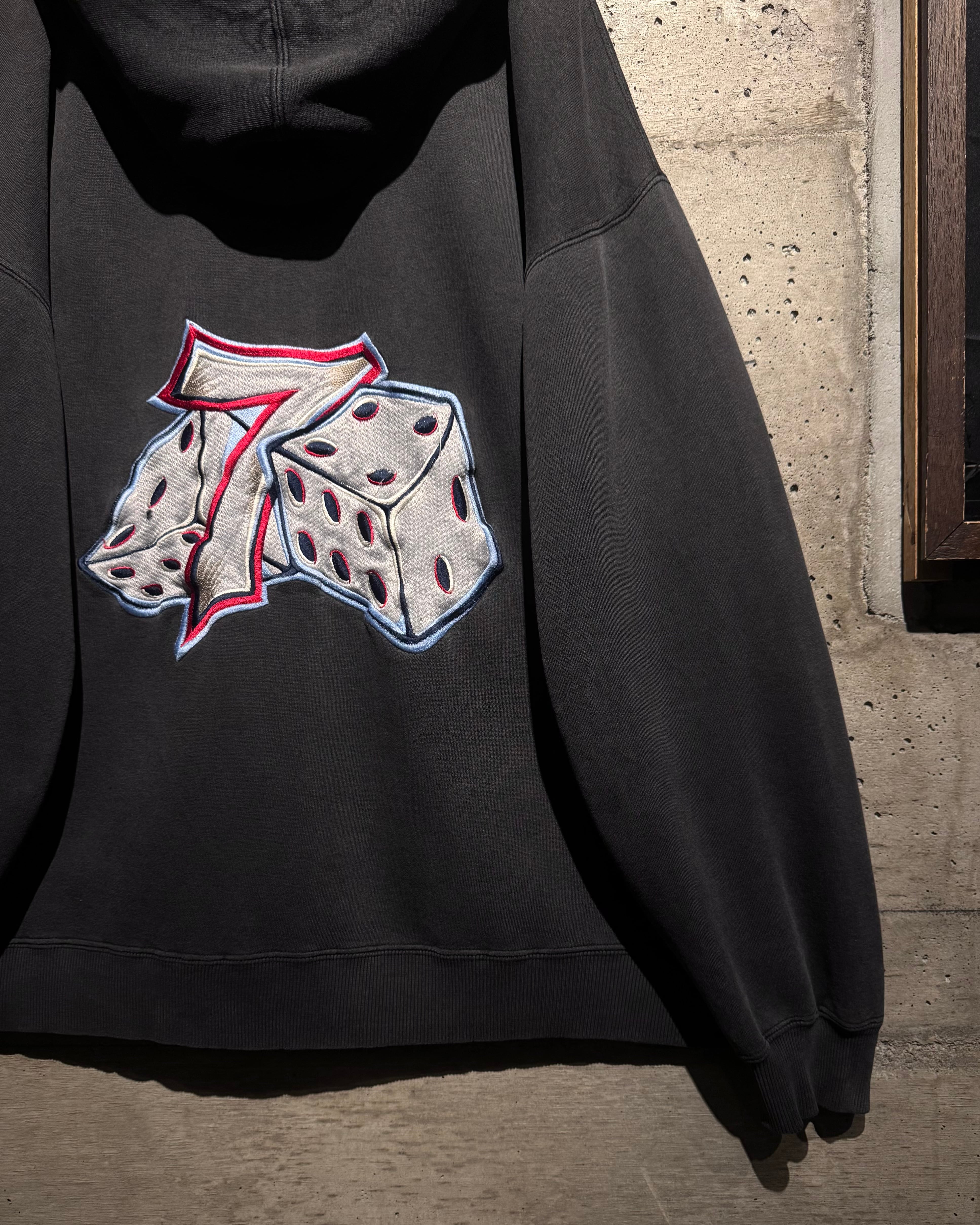 フロントにはナンバリング「7」、バックにはブランドを象徴するサイコロモチーフを大胆に配置。スケートカルチャーやレイヴシーンとリンクした、当時らしいアイコニックなデザイン。