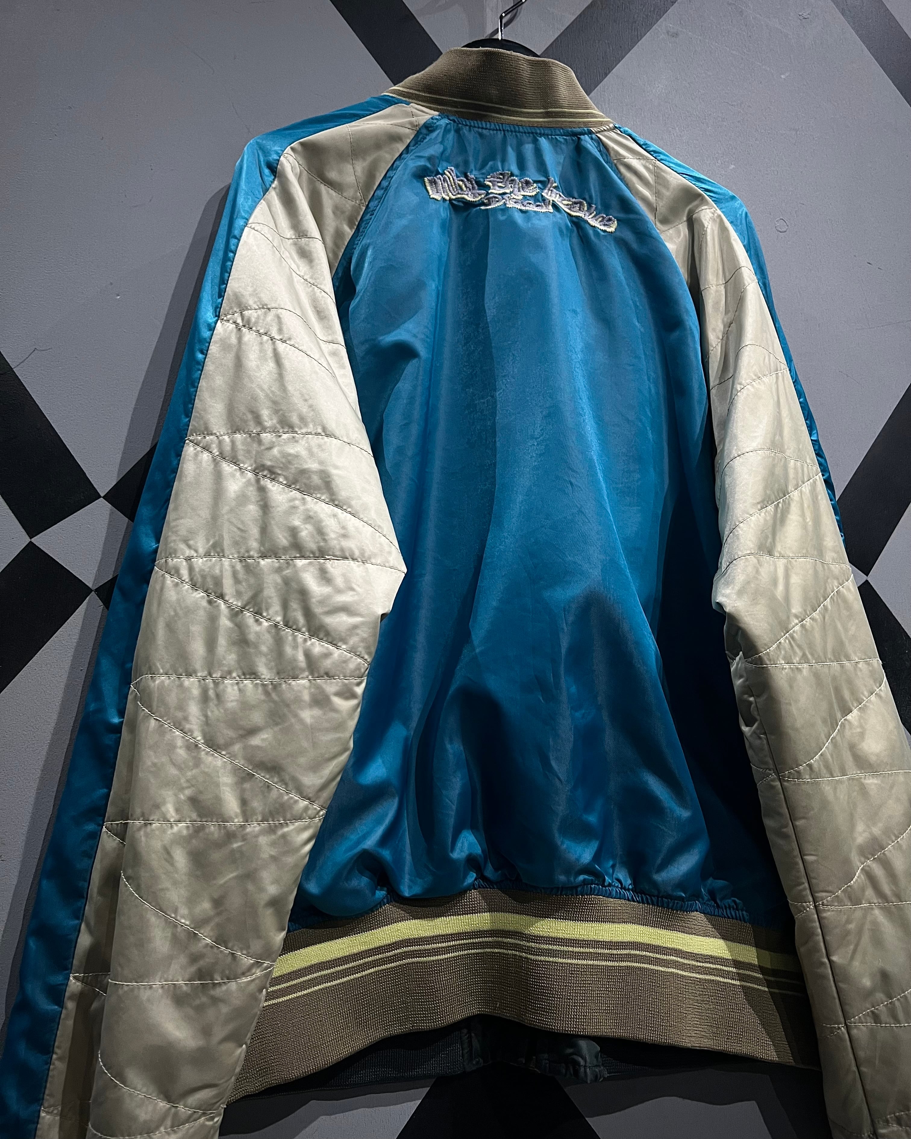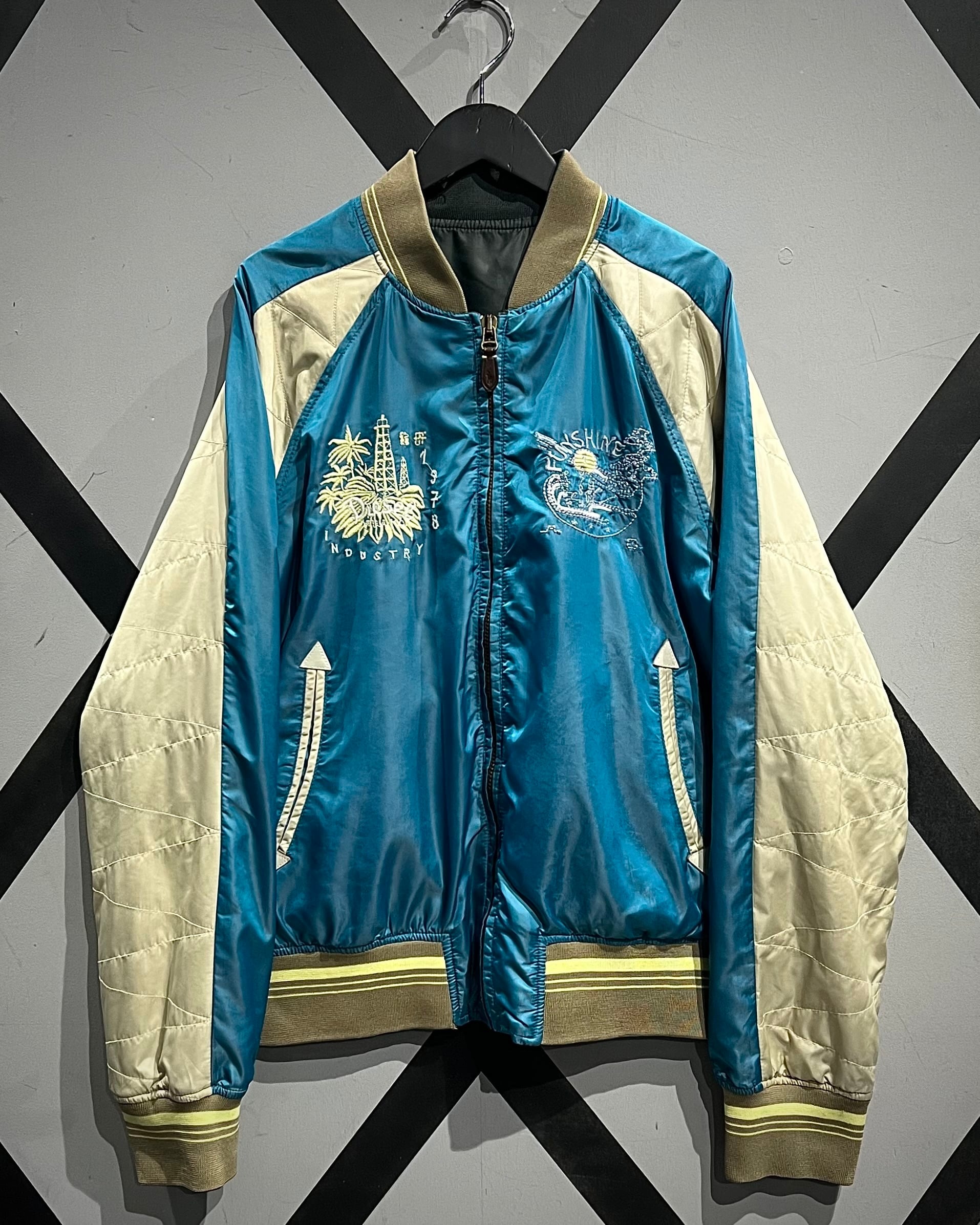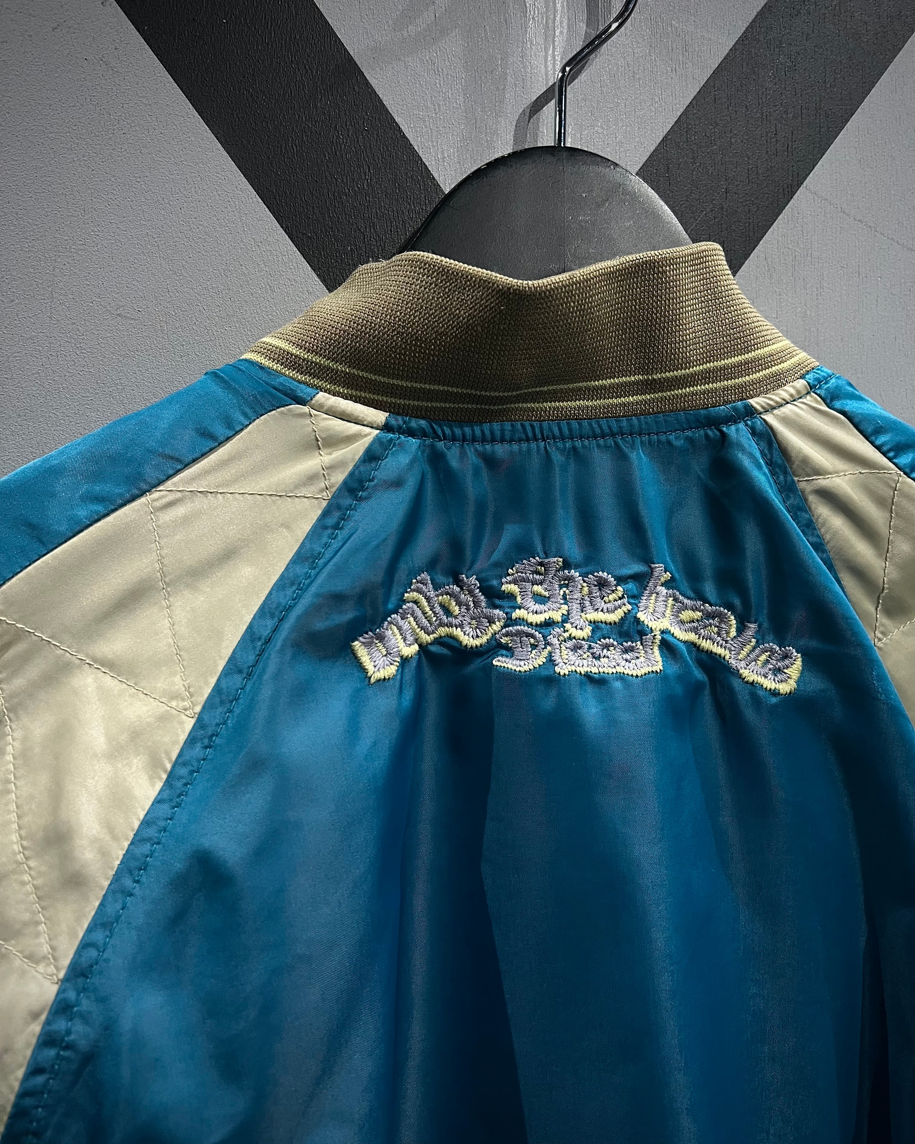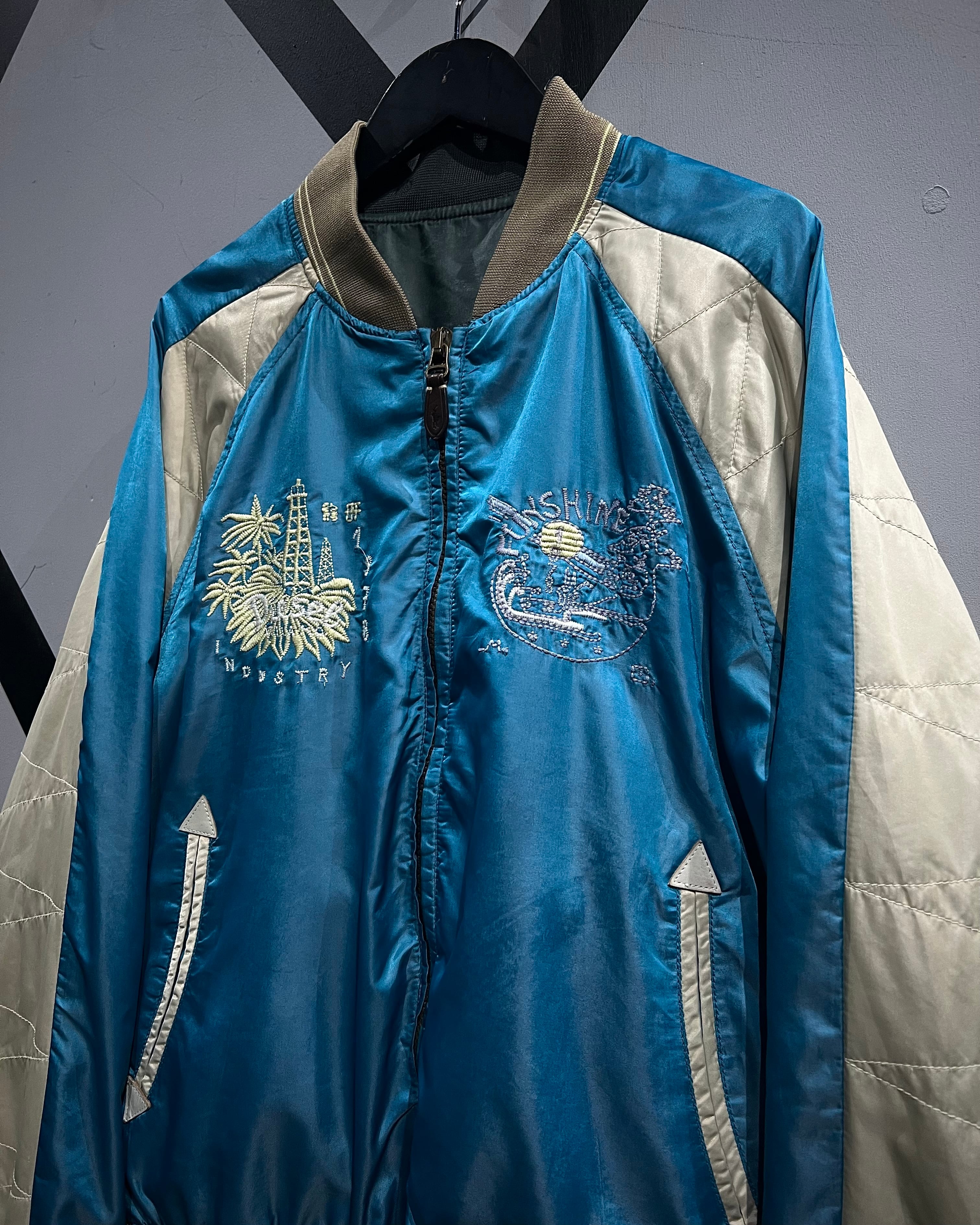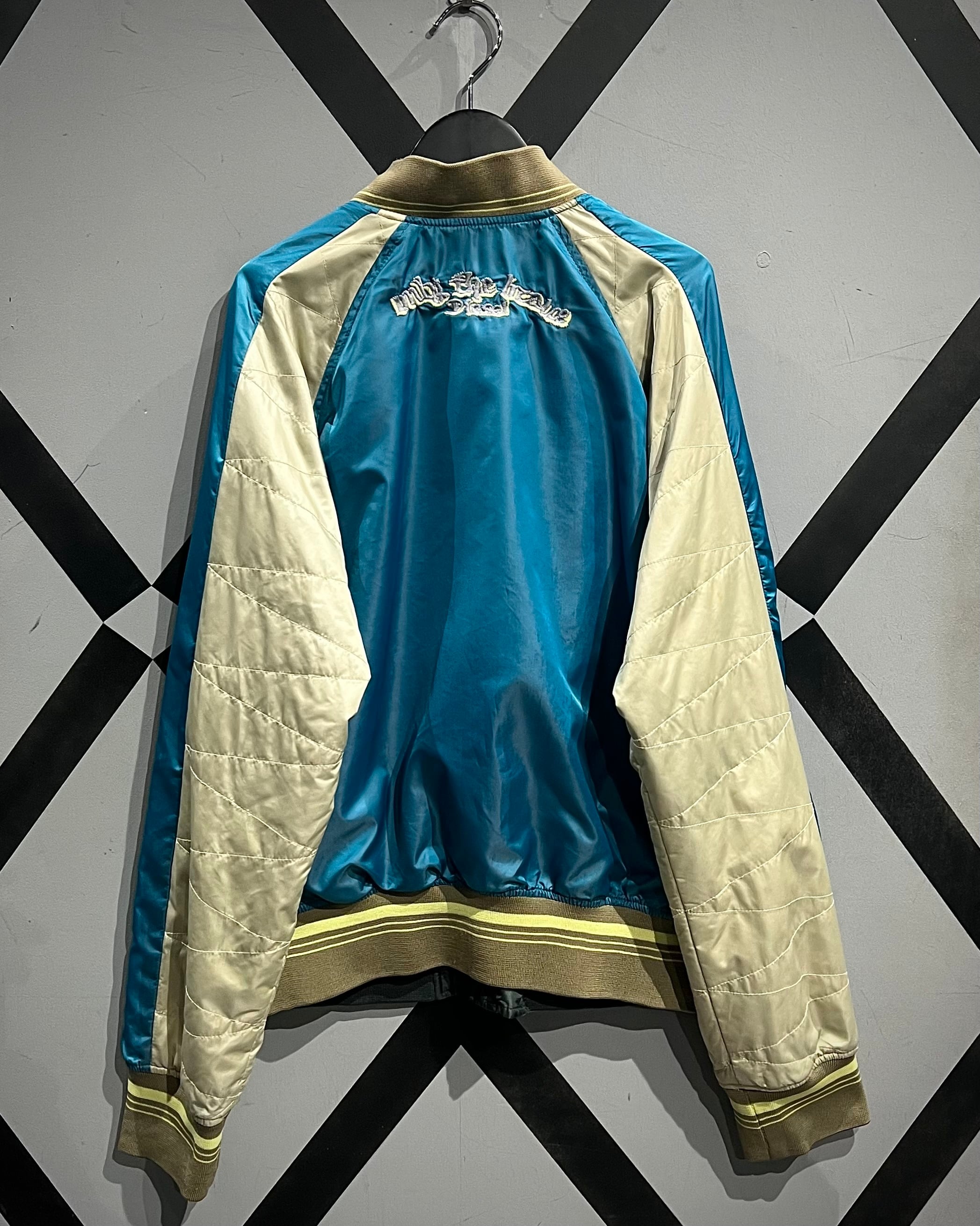 表面は艶やかなサテン生地を用いたブルーボディに、アイボリーの切り替えスリーブを配した存在感のある配色。胸元には灯台や椰子の木などをモチーフにしたスーベニアらしい刺繍が施され、オリエンタルなムードとストリート感が絶妙に混ざり合うデザインとなっています。