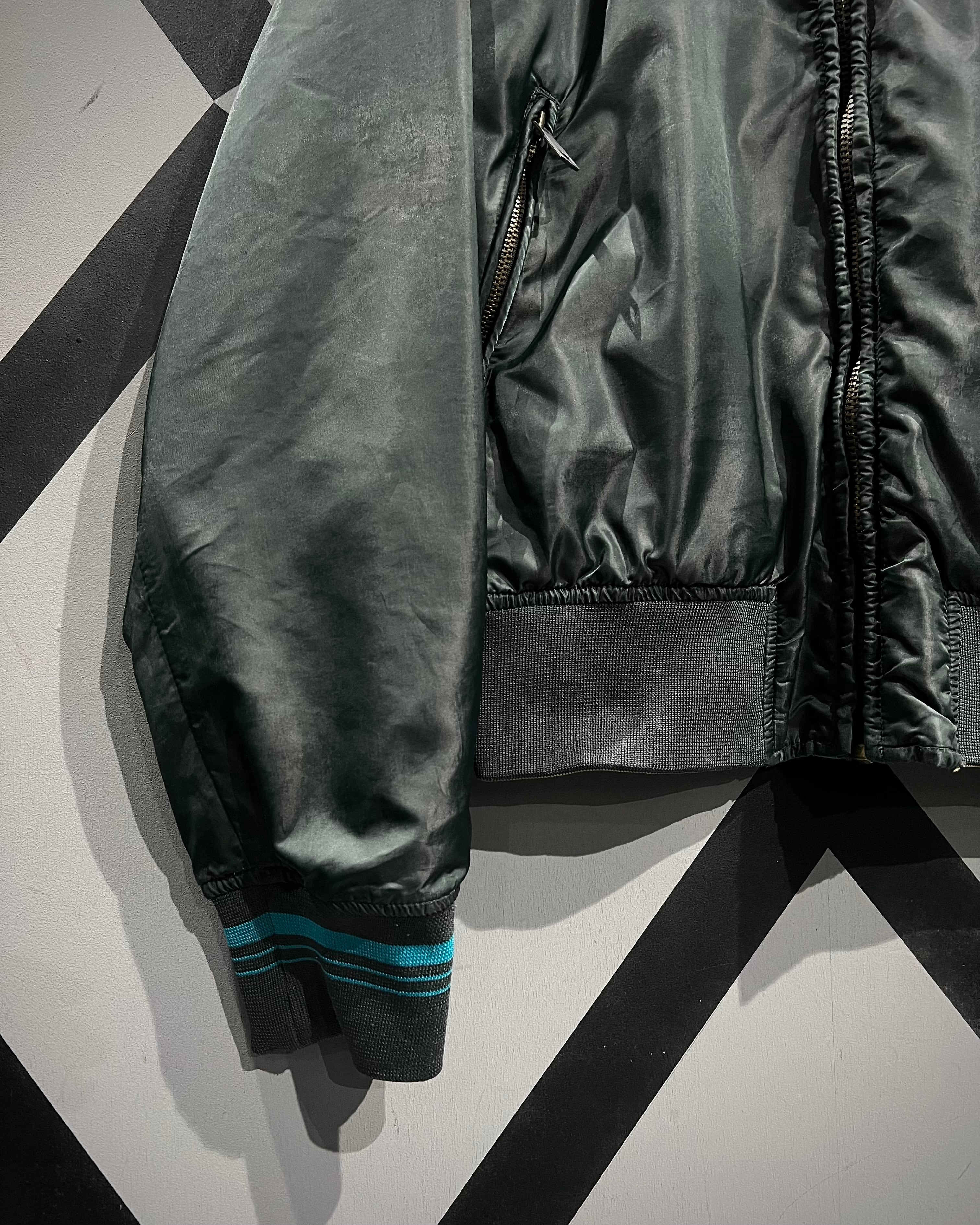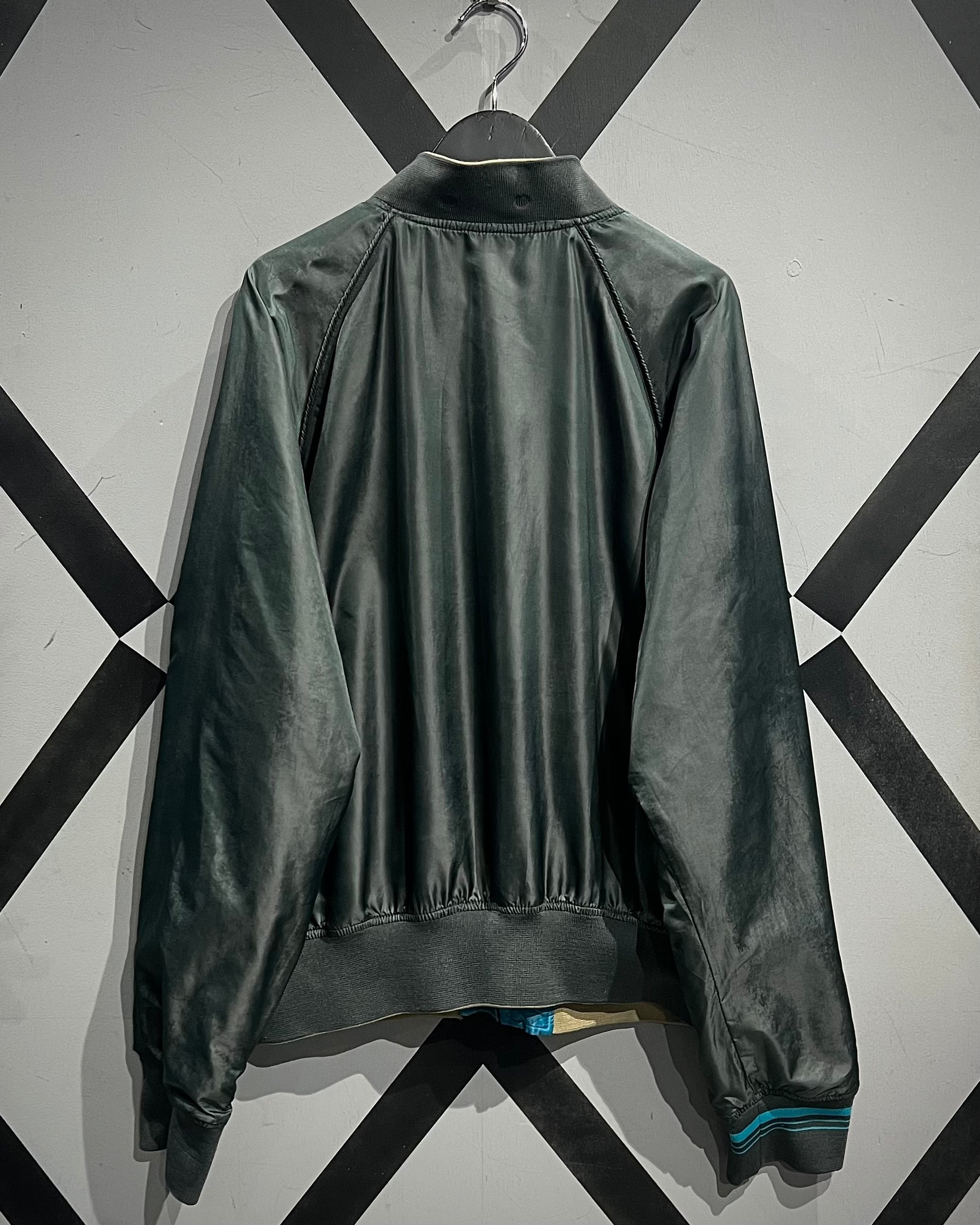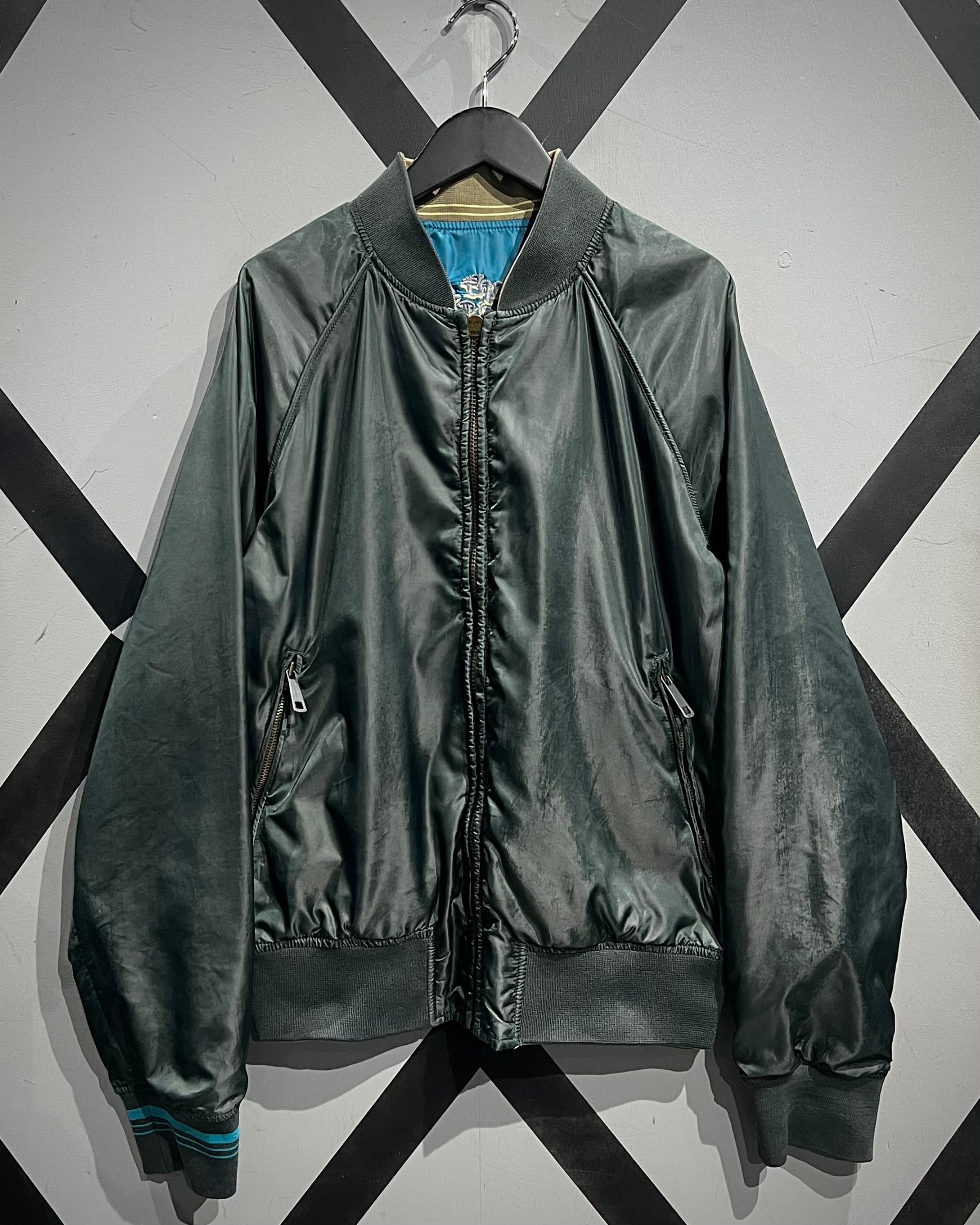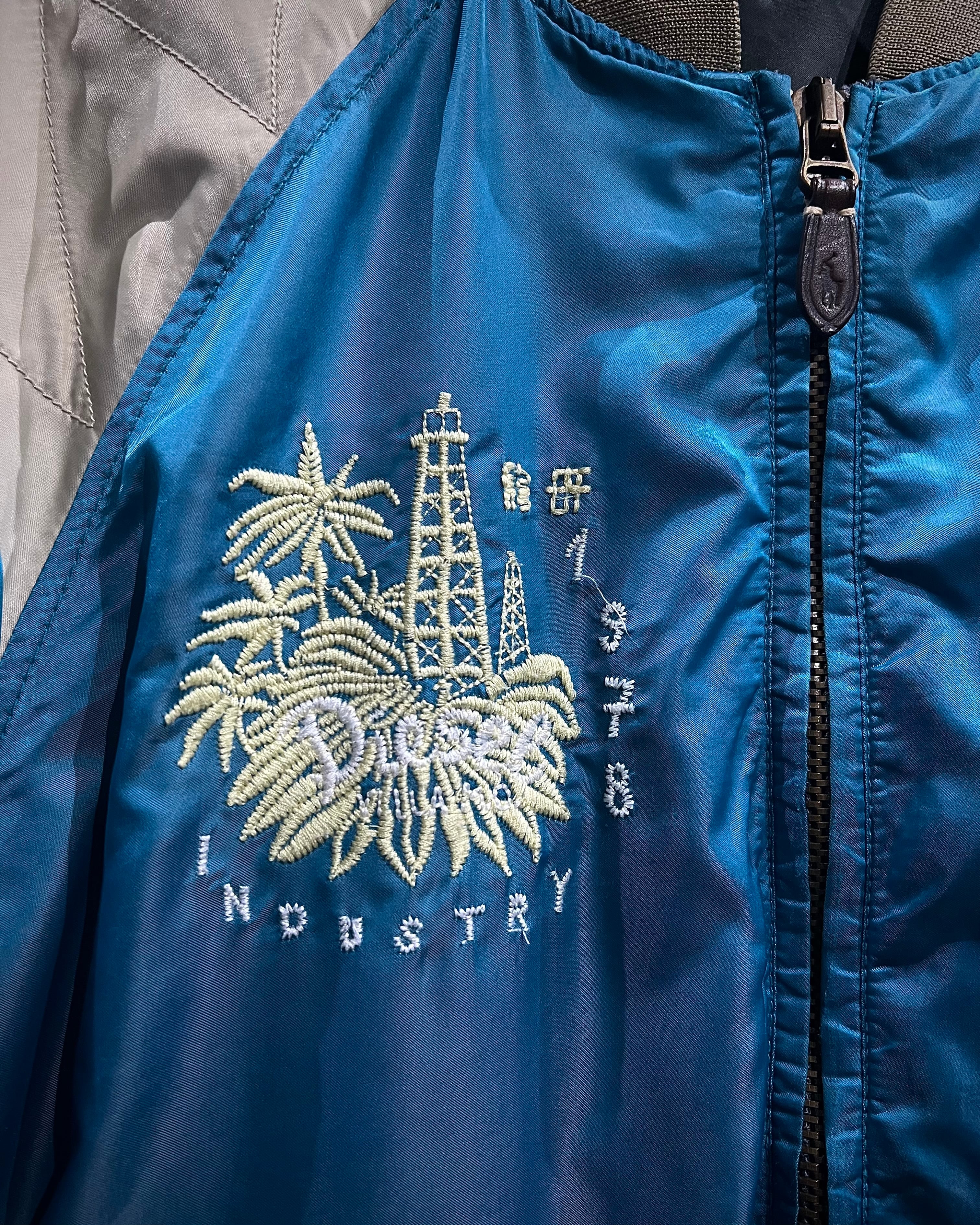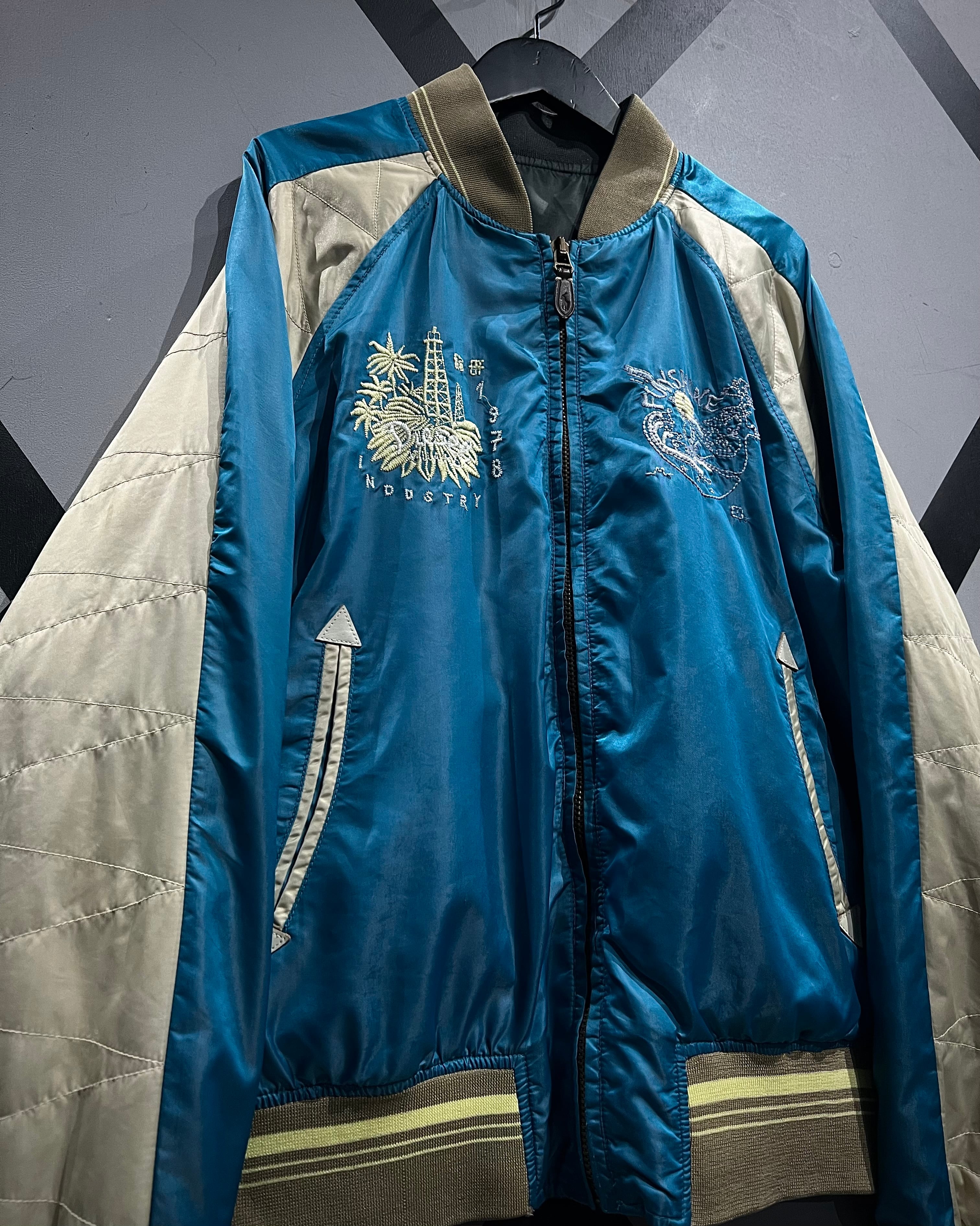 表面は艶やかなサテン生地を用いたブルーボディに、アイボリーの切り替えスリーブを配した存在感のある配色。胸元には灯台や椰子の木などをモチーフにしたスーベニアらしい刺繍が施され、オリエンタルなムードとストリート感が絶妙に混ざり合うデザインとなっています。