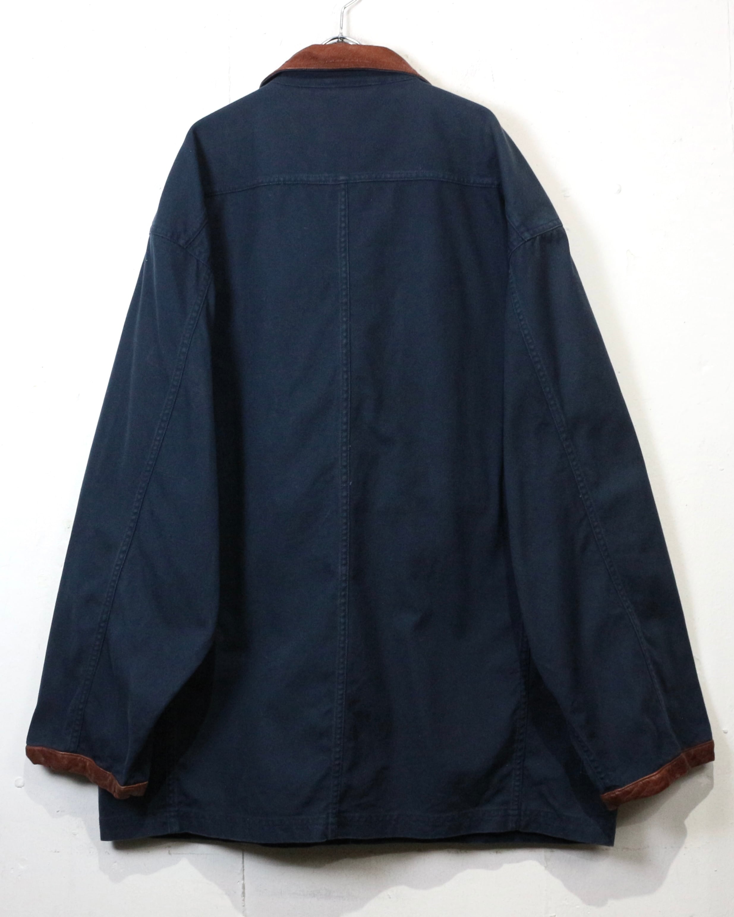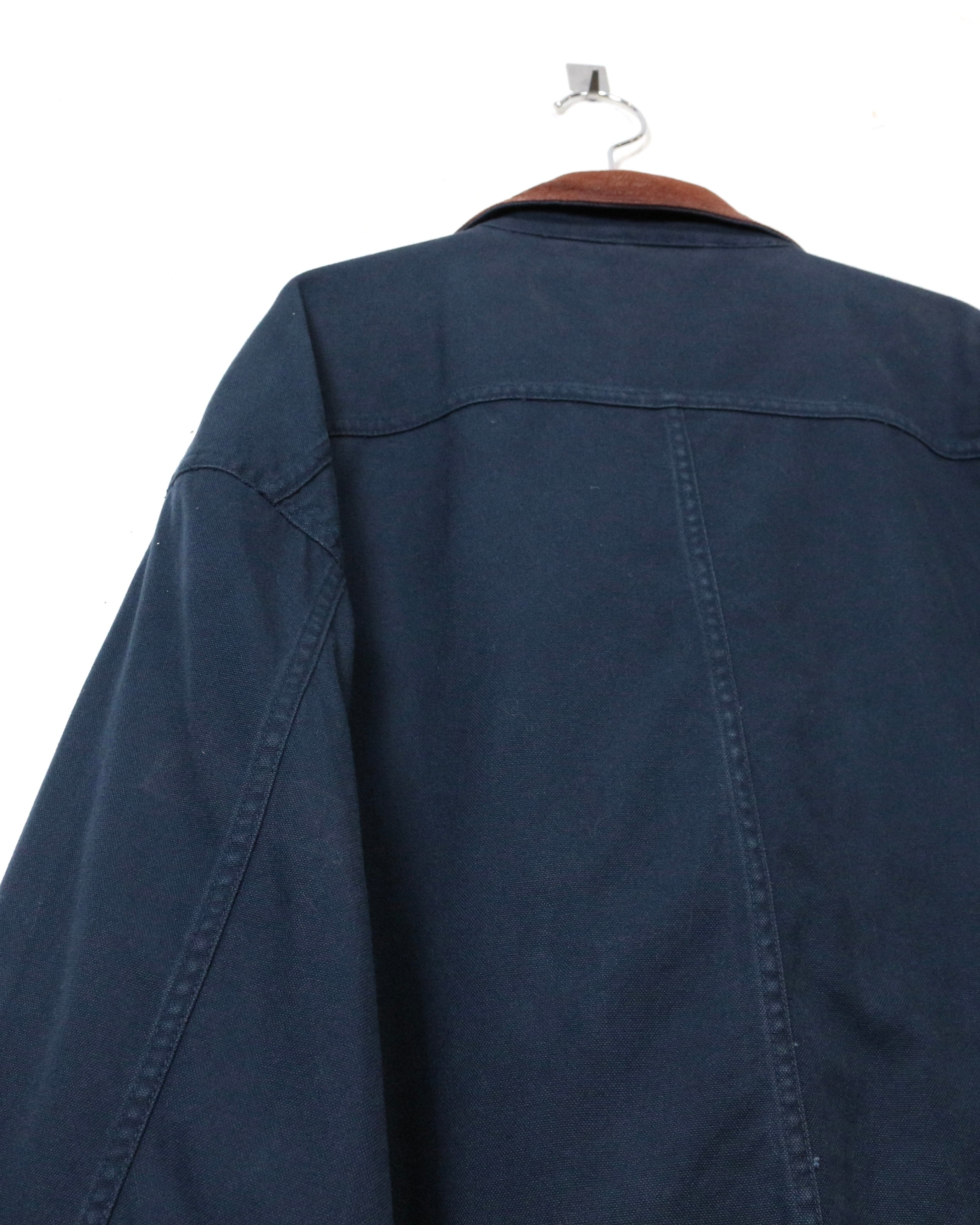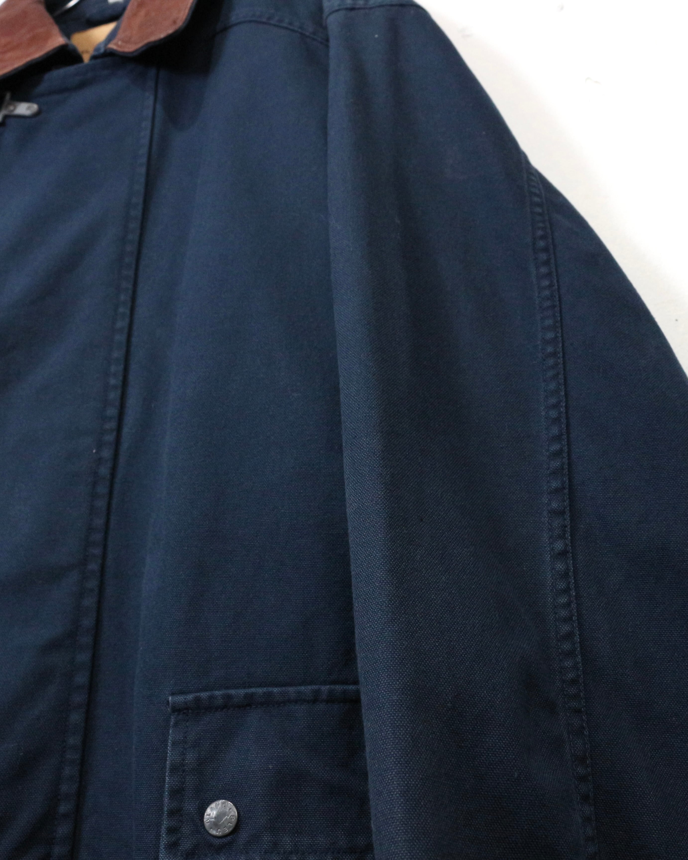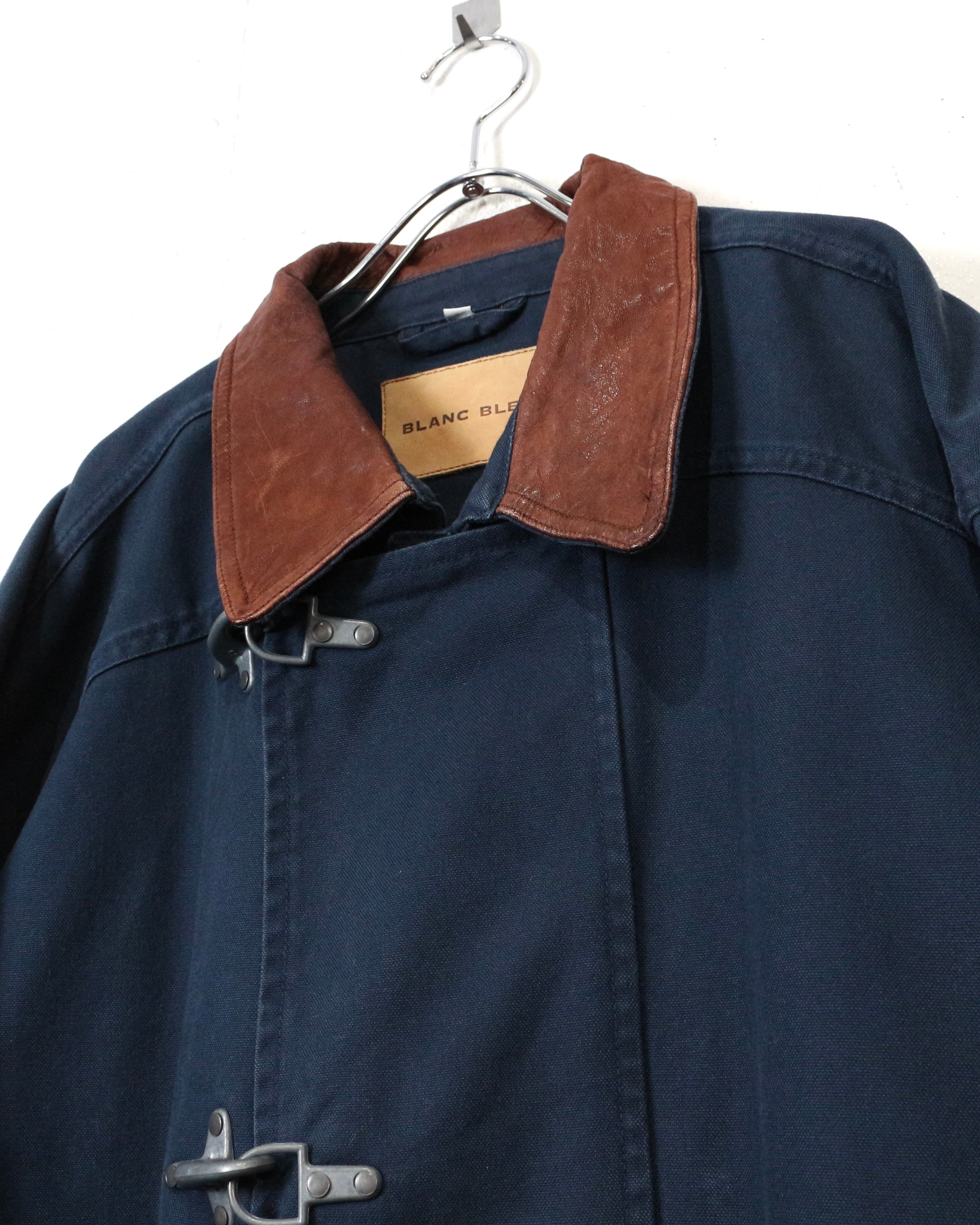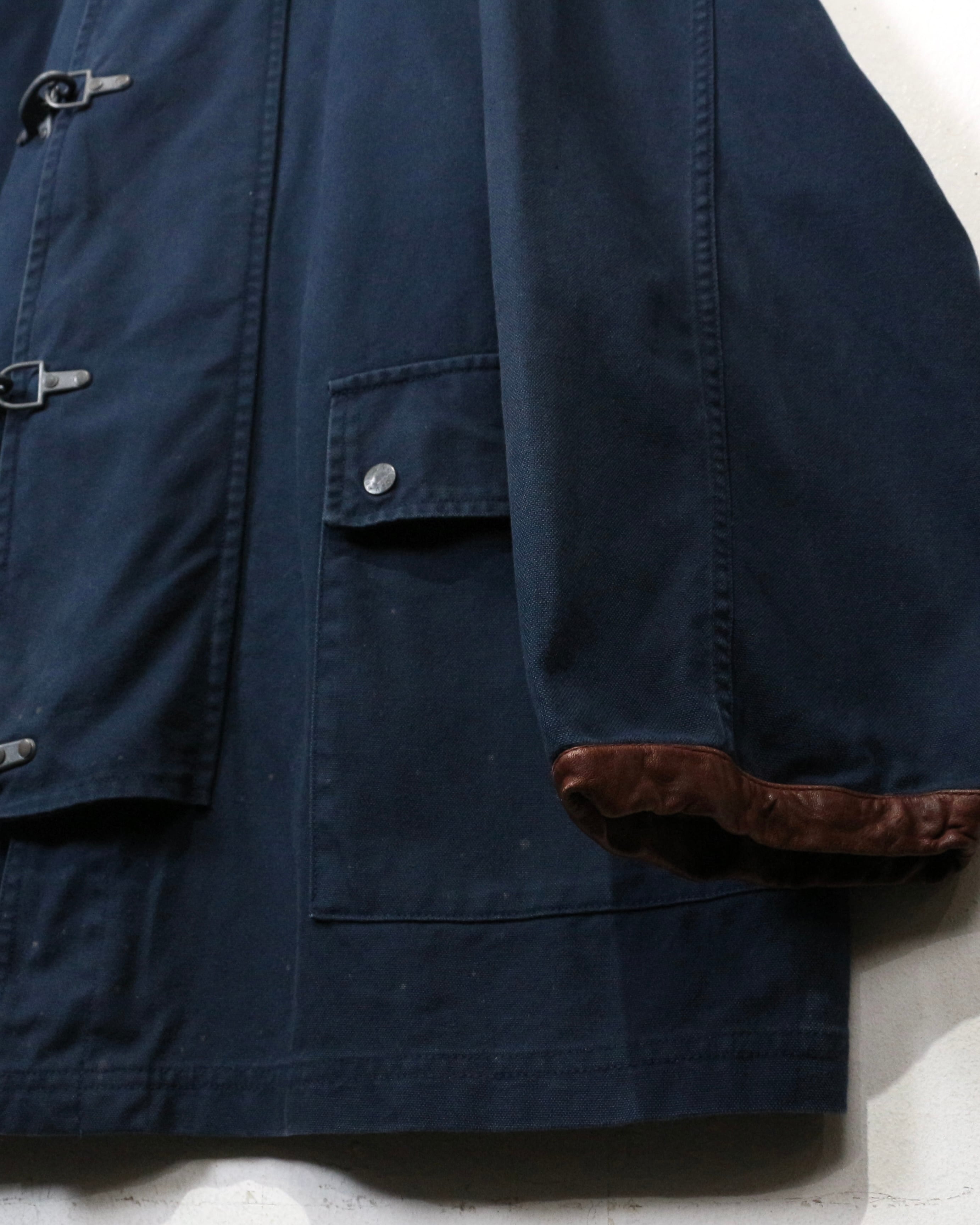 深みのあるネイビーカラーのボディに対して、襟元と袖口にはブラウンレザーを切り替え。経年による風合いが感じられるレザーがアクセントとなり、タフさと上品さを兼ね備えた絶妙なバランスに。