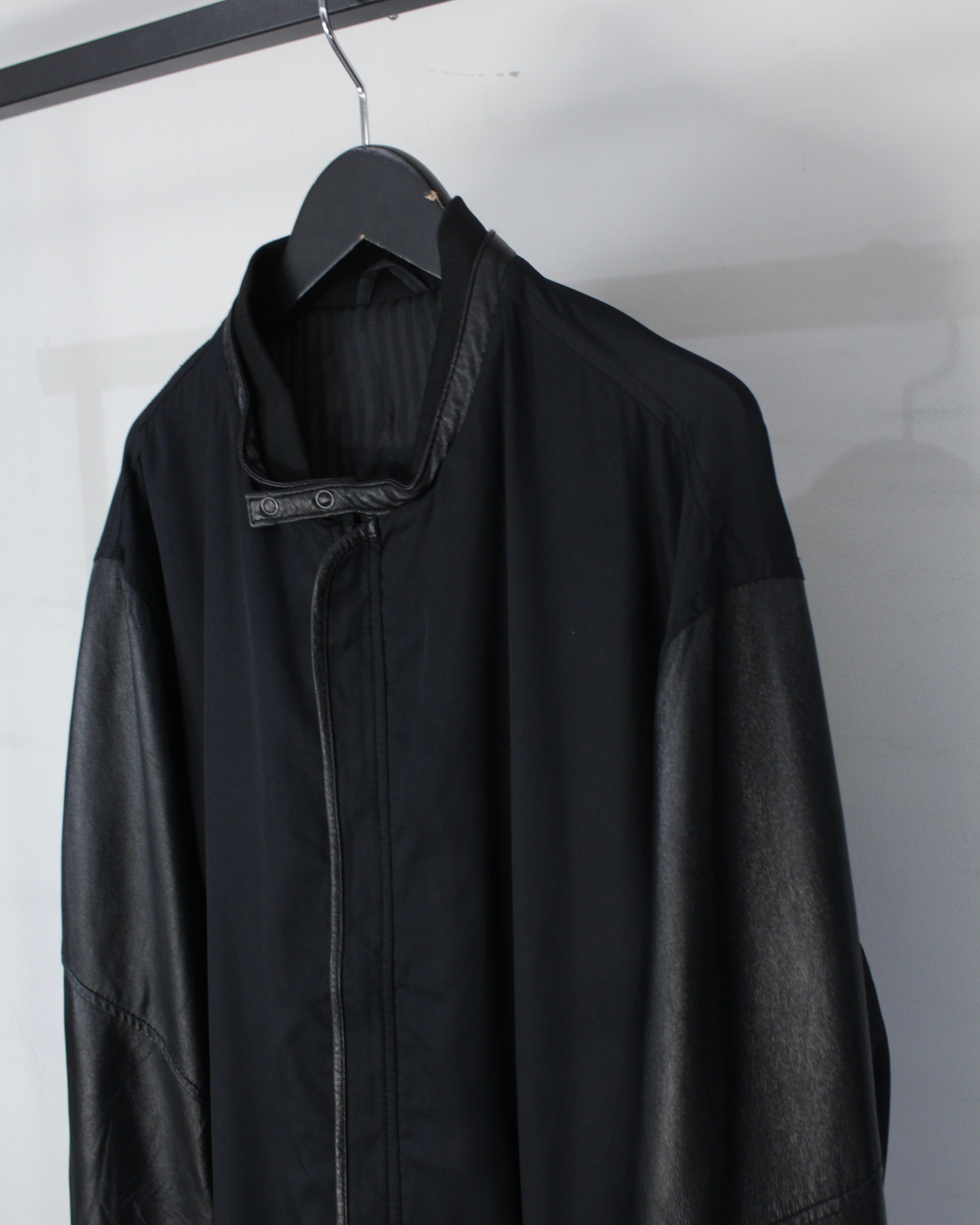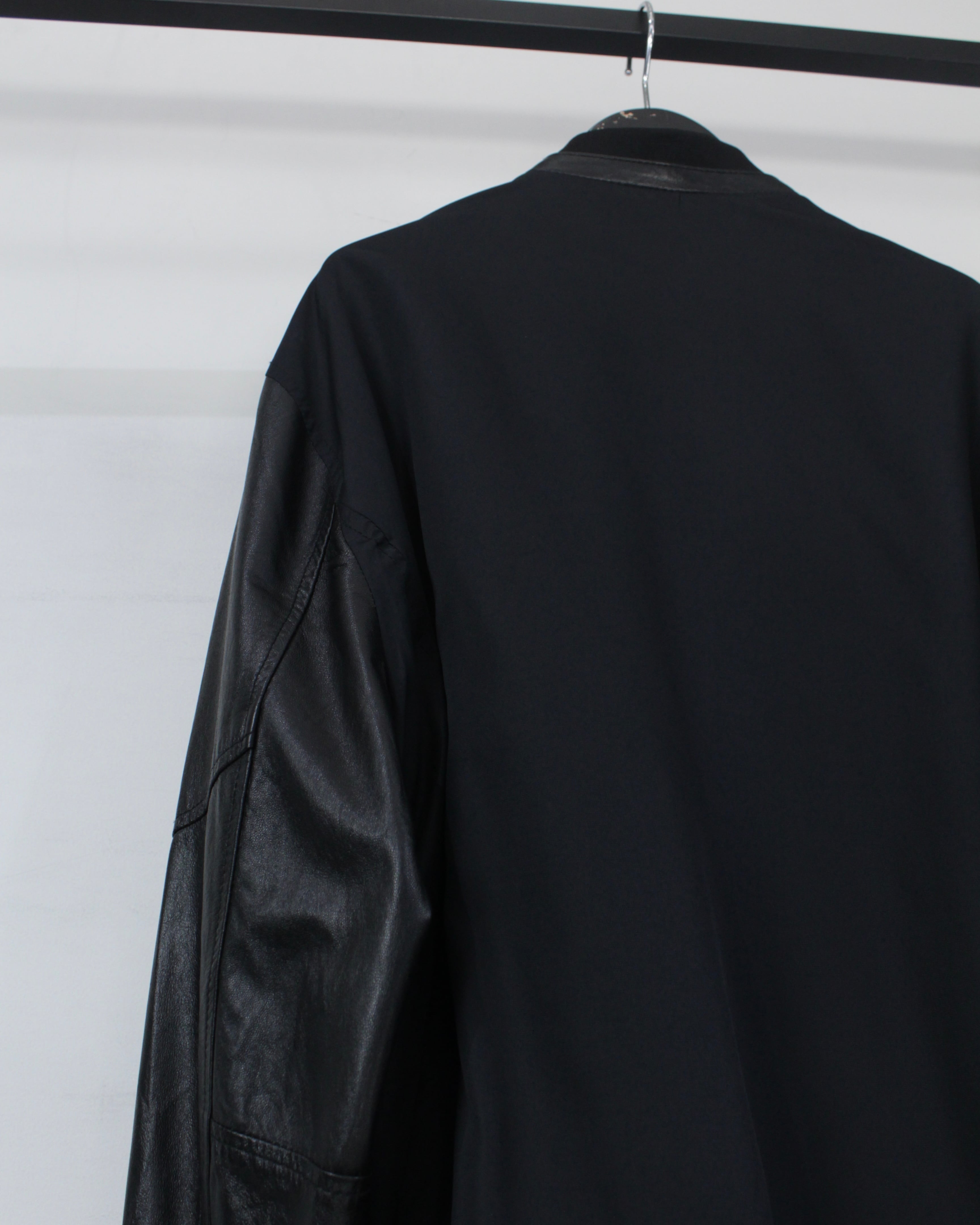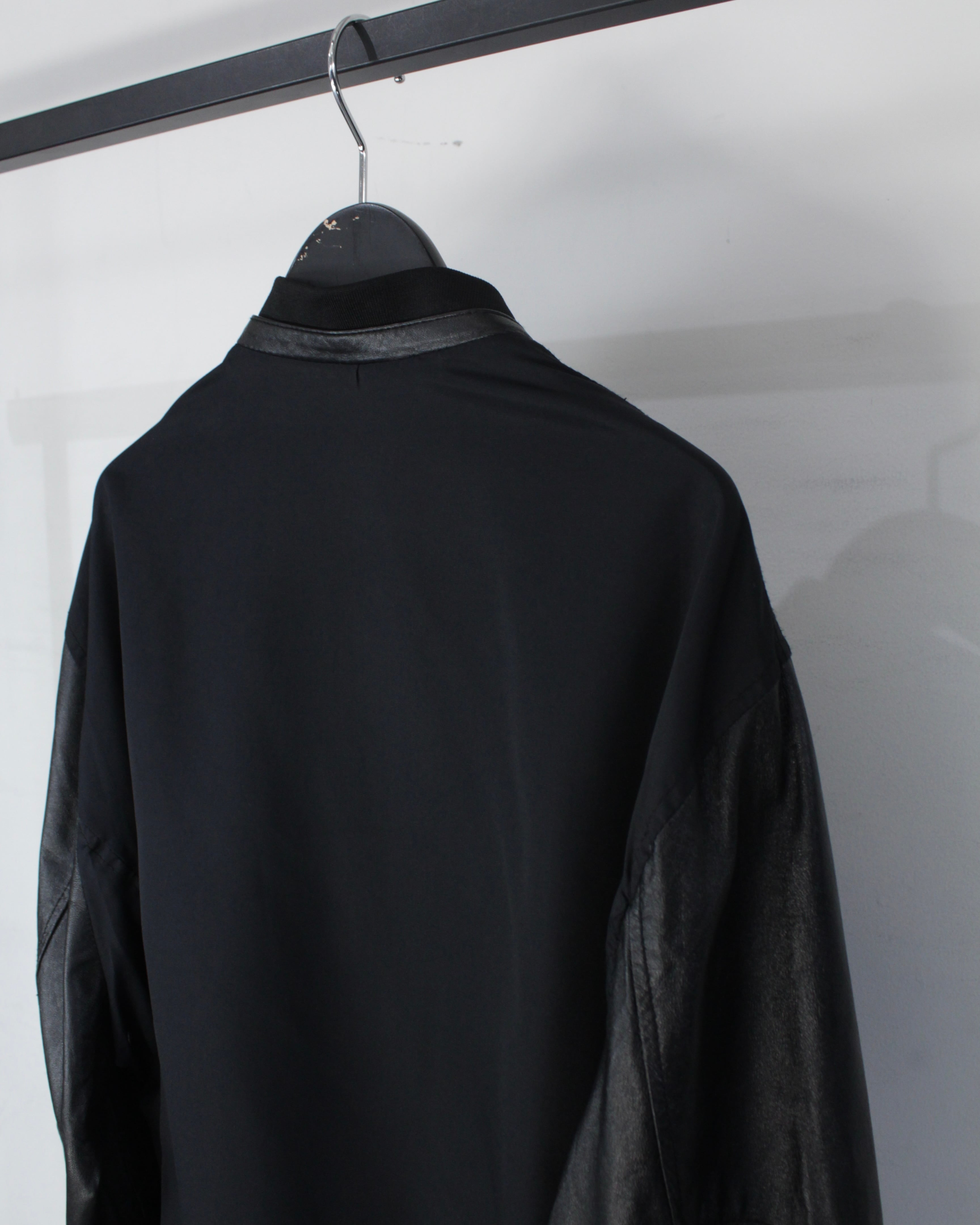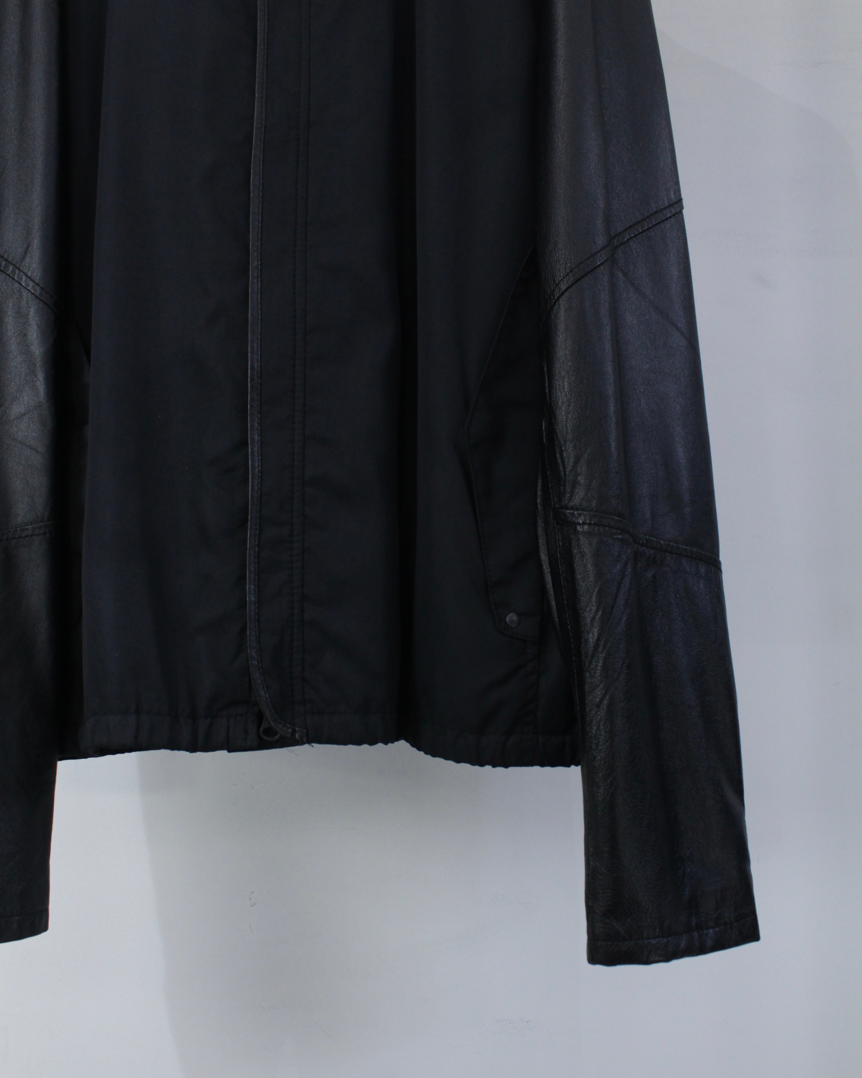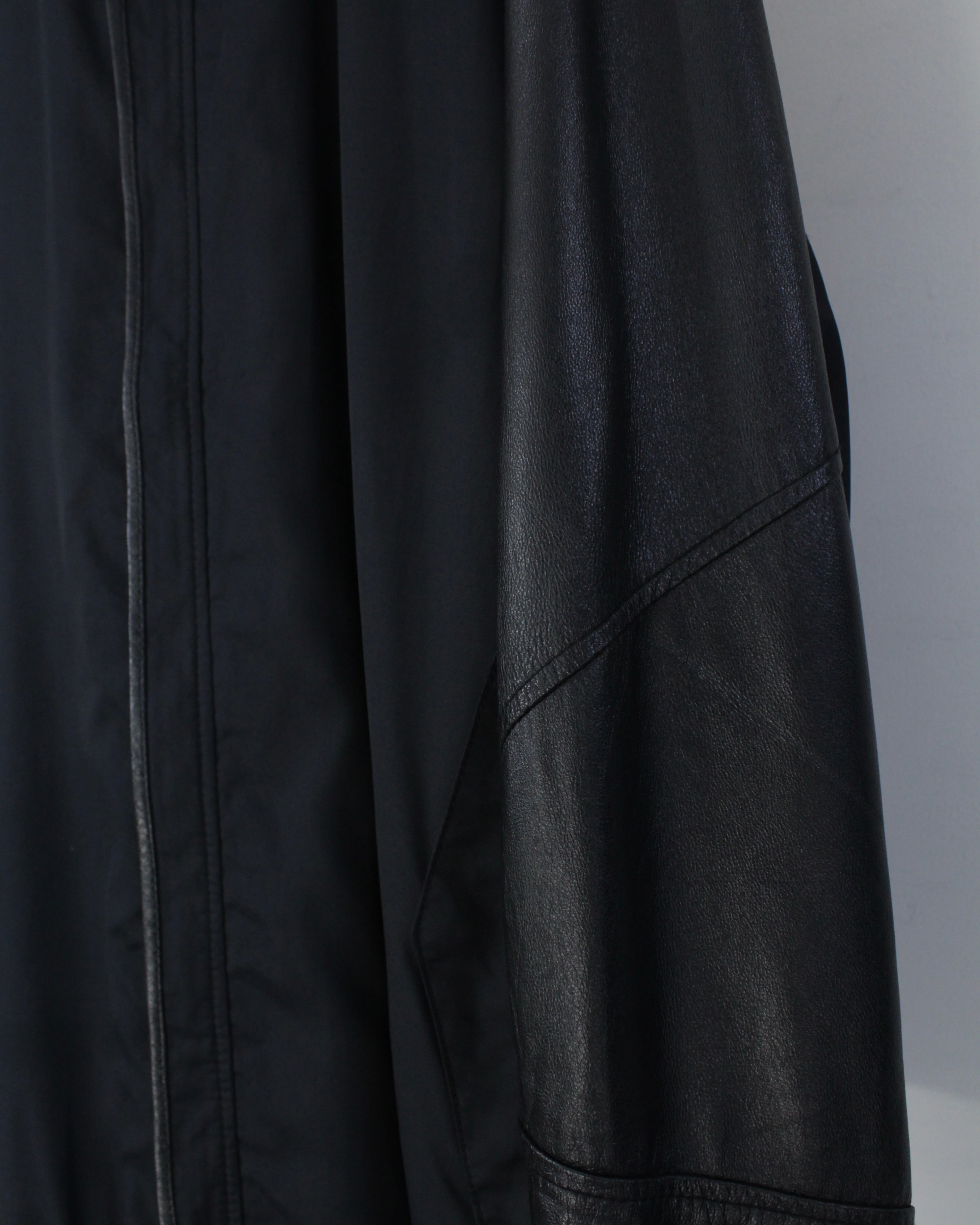 ボディには軽やかなファブリックをベースに、袖部分には滑らかなブラックレザーを切り替えたデザイン。マットな質感のボディとレザー特有の鈍い艶が美しい対比を生み出し、シンプルなブラックワントーンながら奥行きのある表情を演出しています。