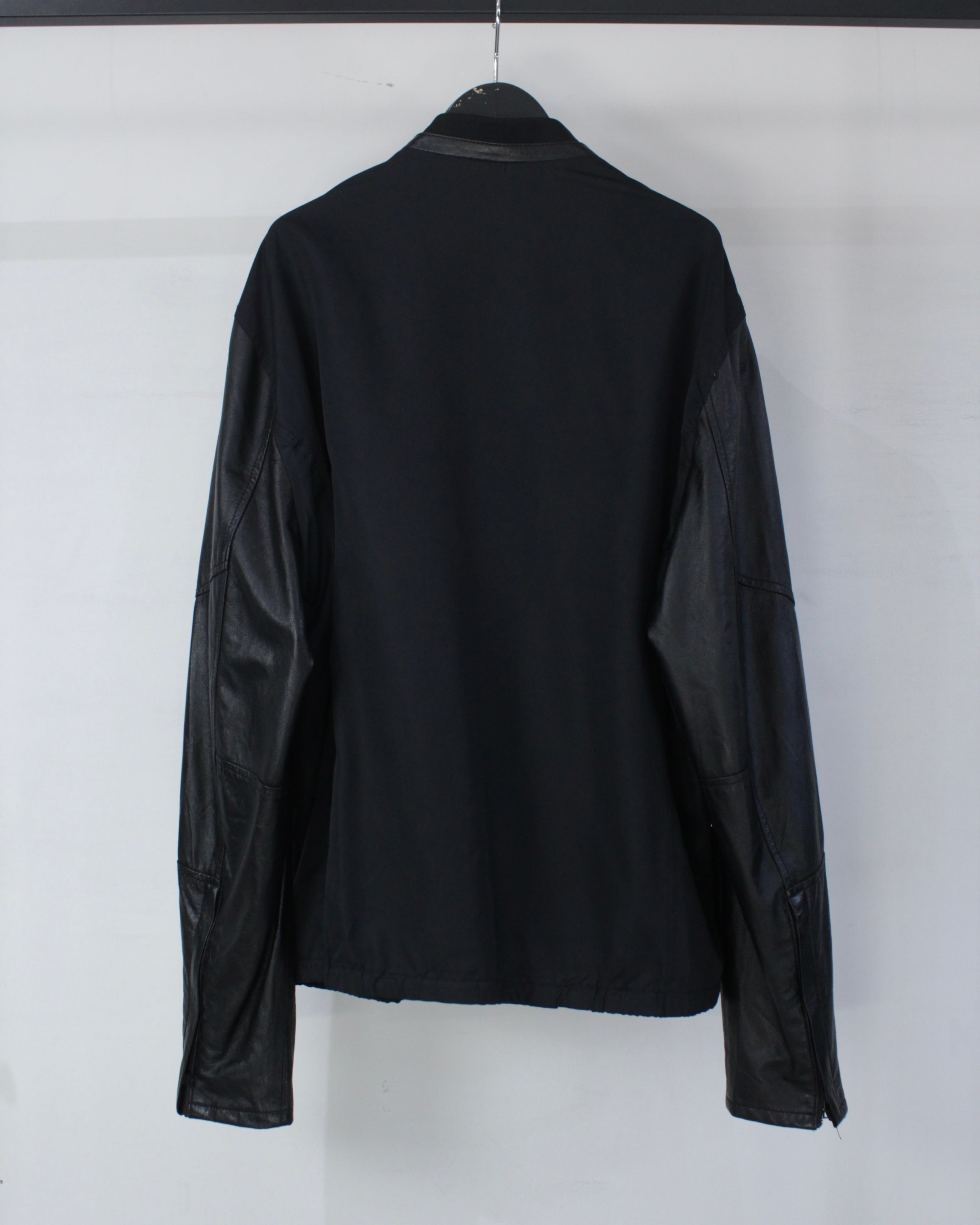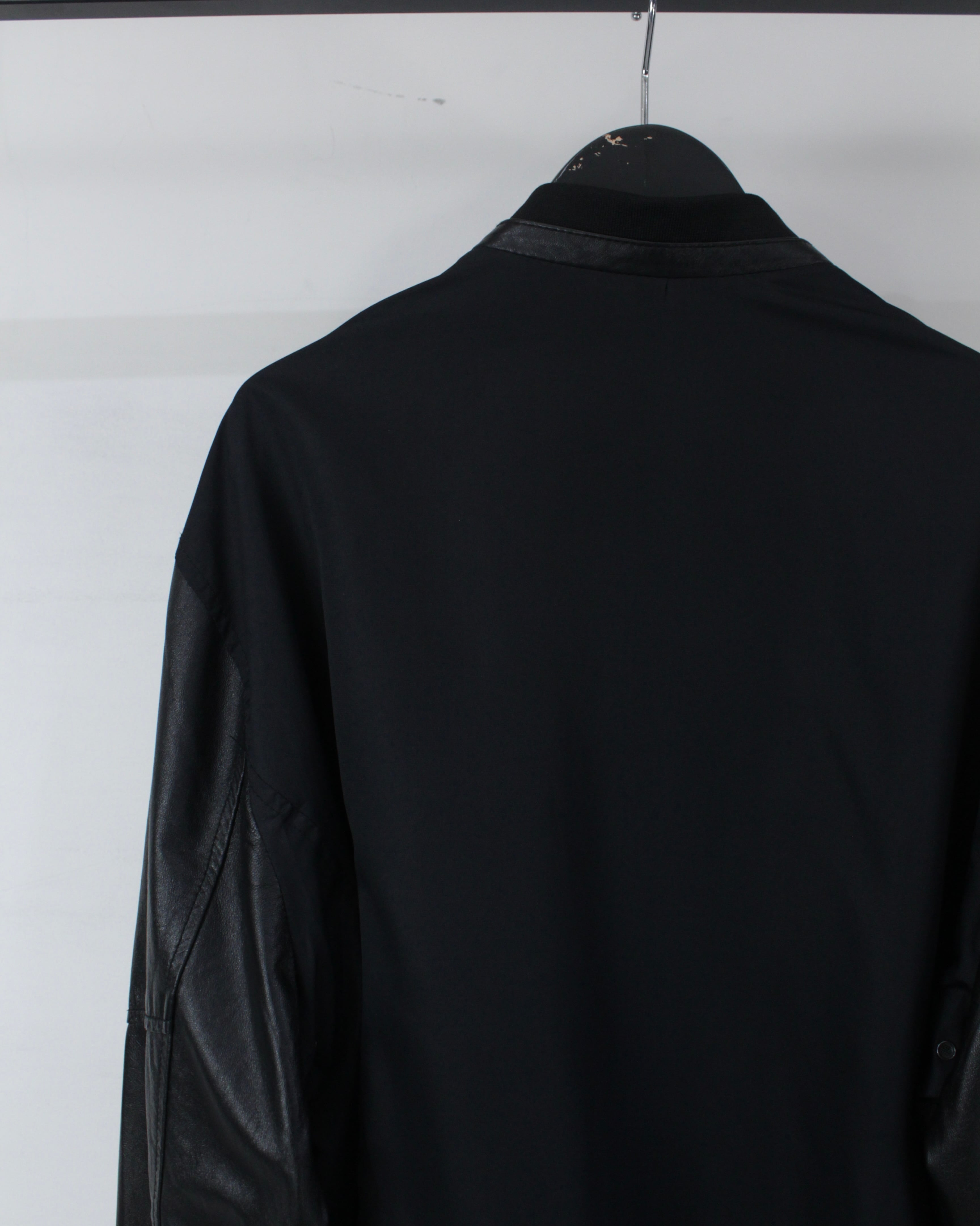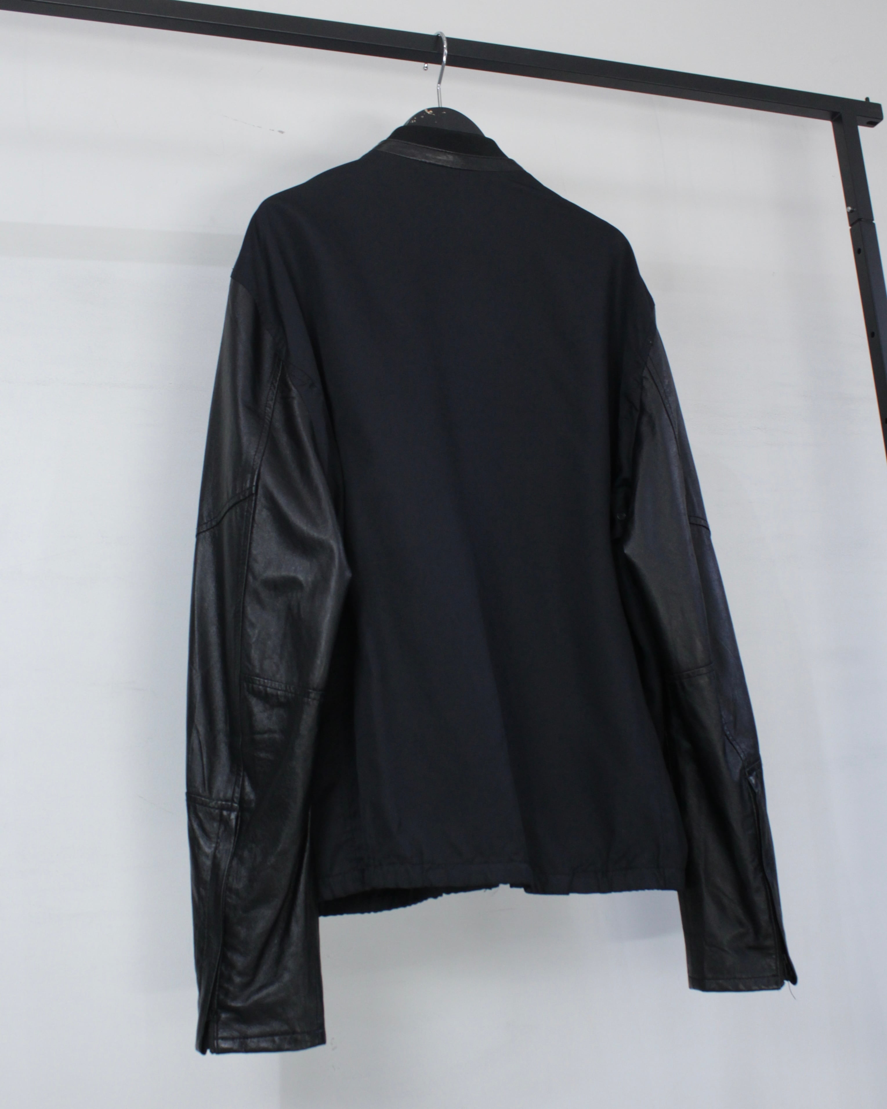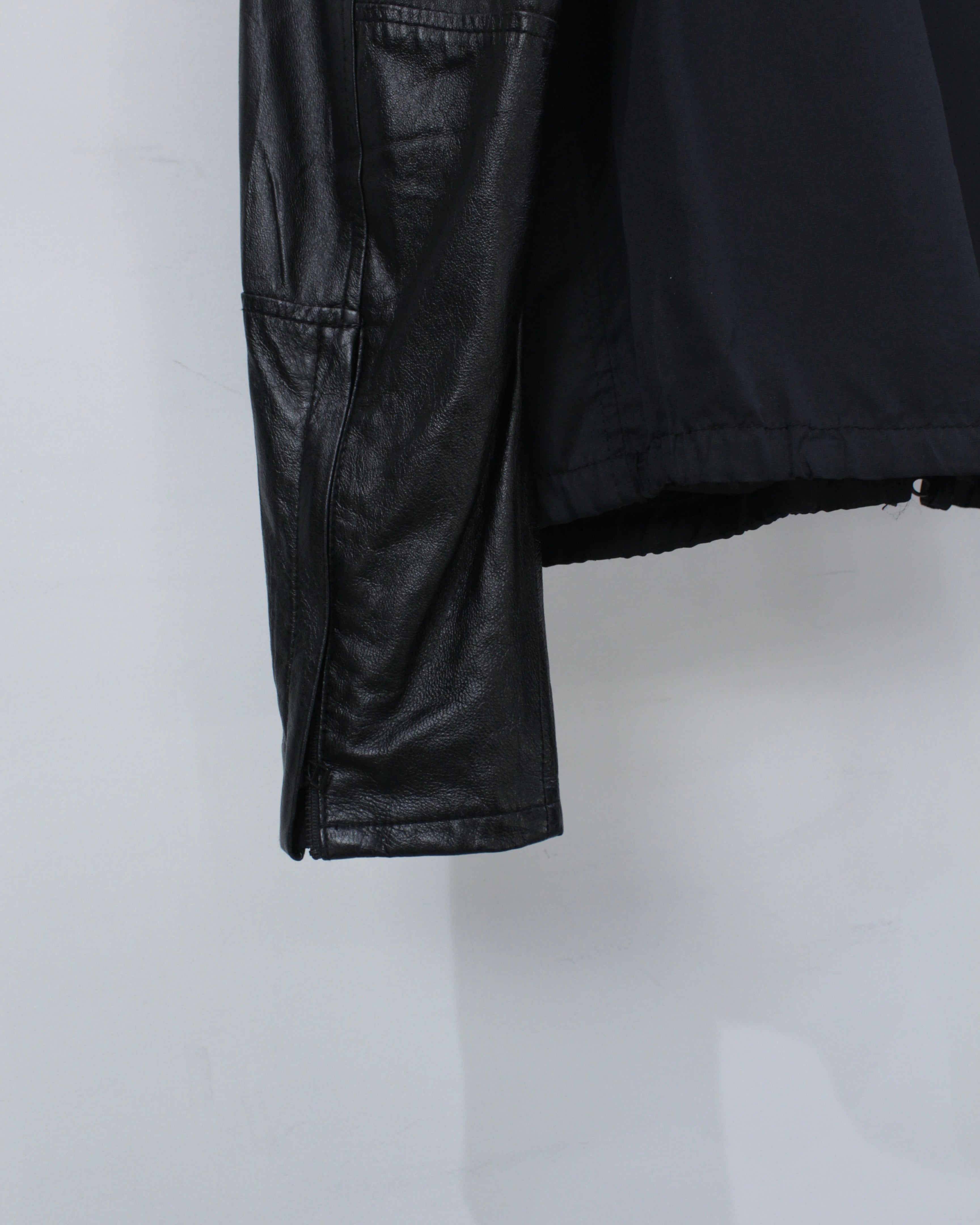 ボディには軽やかなファブリックをベースに、袖部分には滑らかなブラックレザーを切り替えたデザイン。マットな質感のボディとレザー特有の鈍い艶が美しい対比を生み出し、シンプルなブラックワントーンながら奥行きのある表情を演出しています。