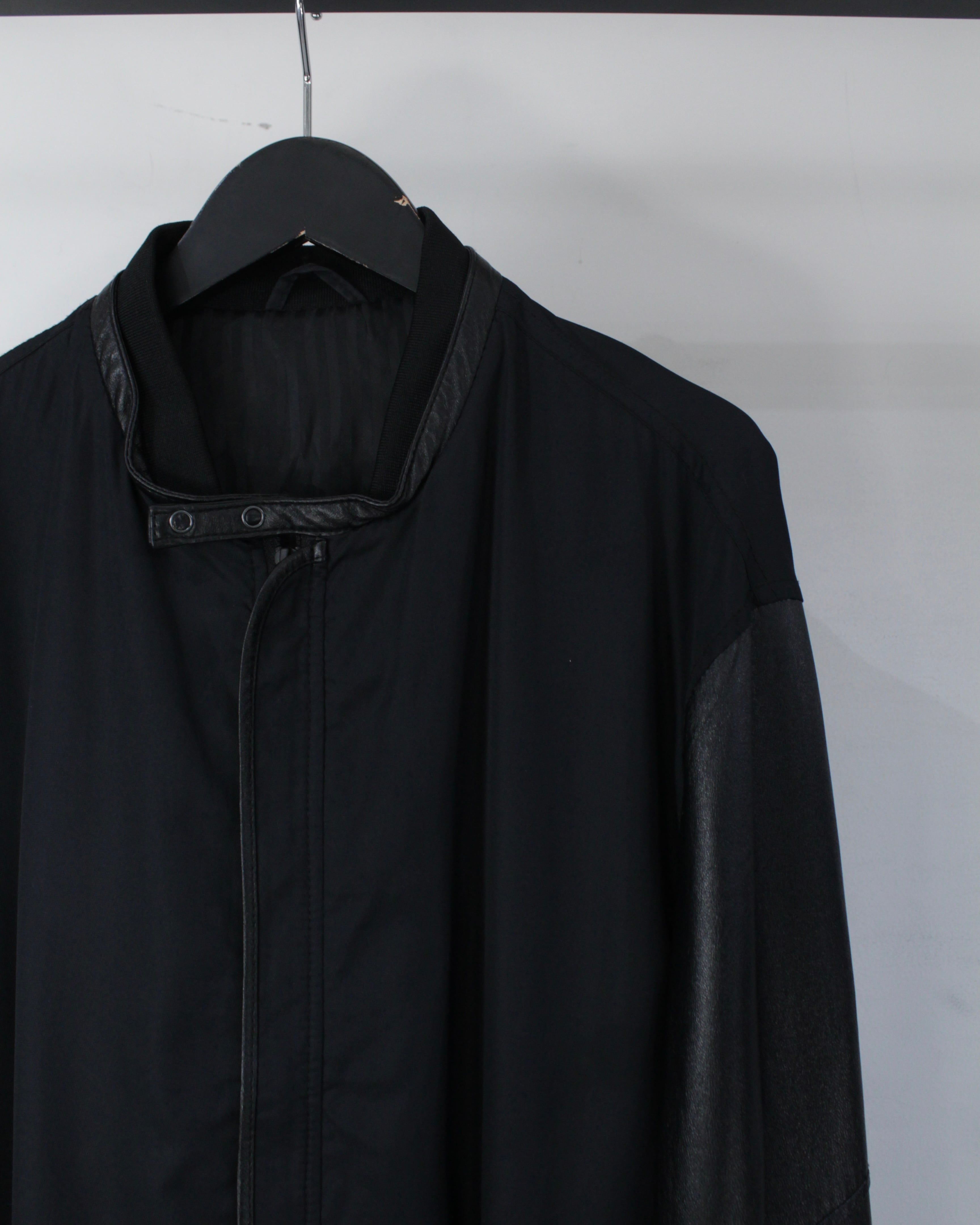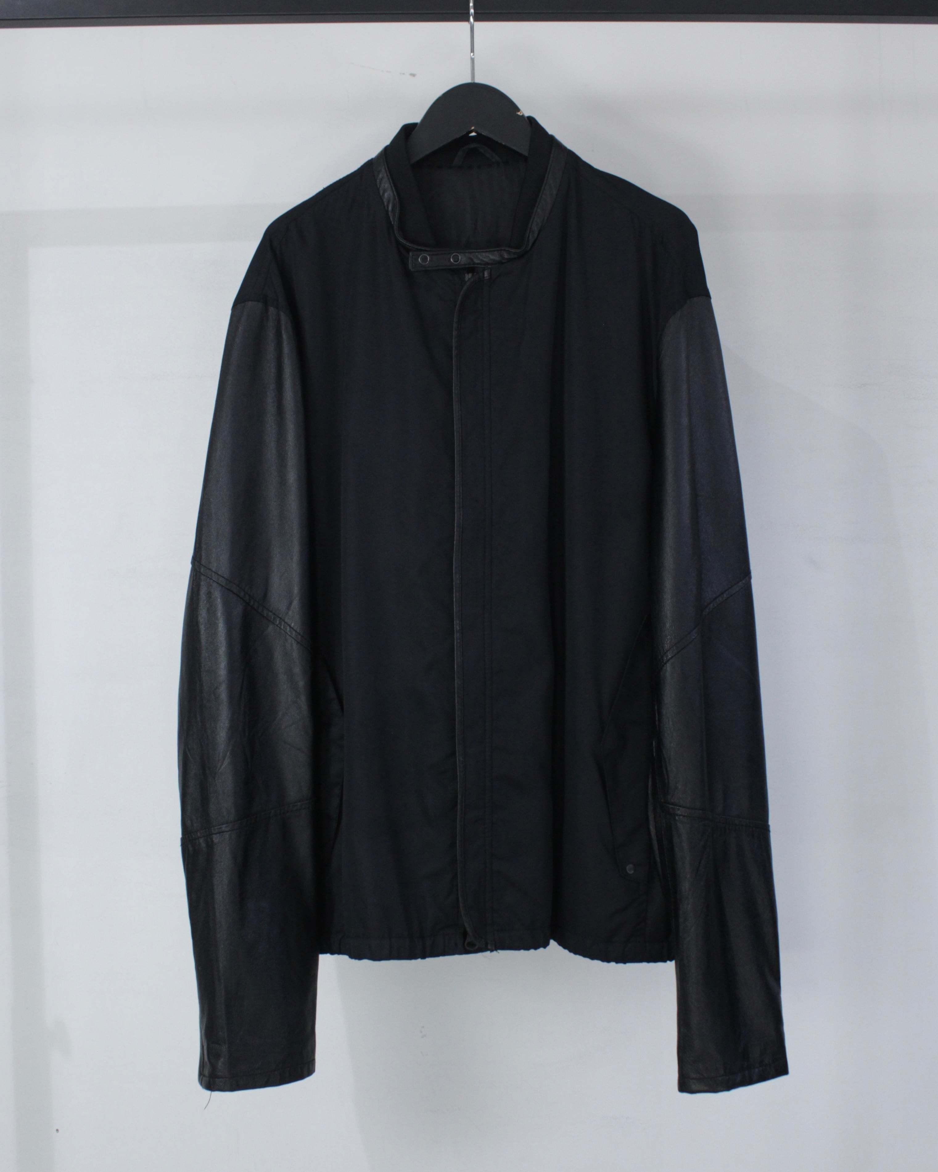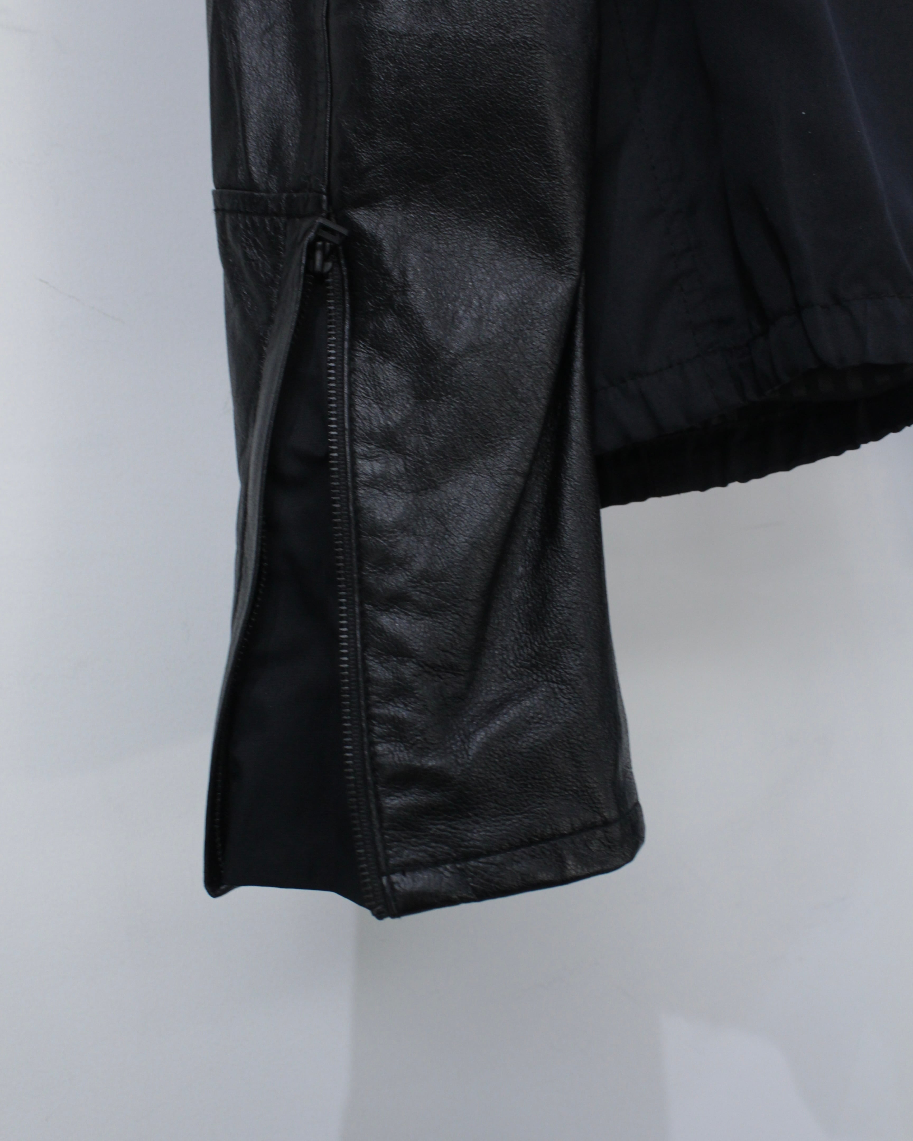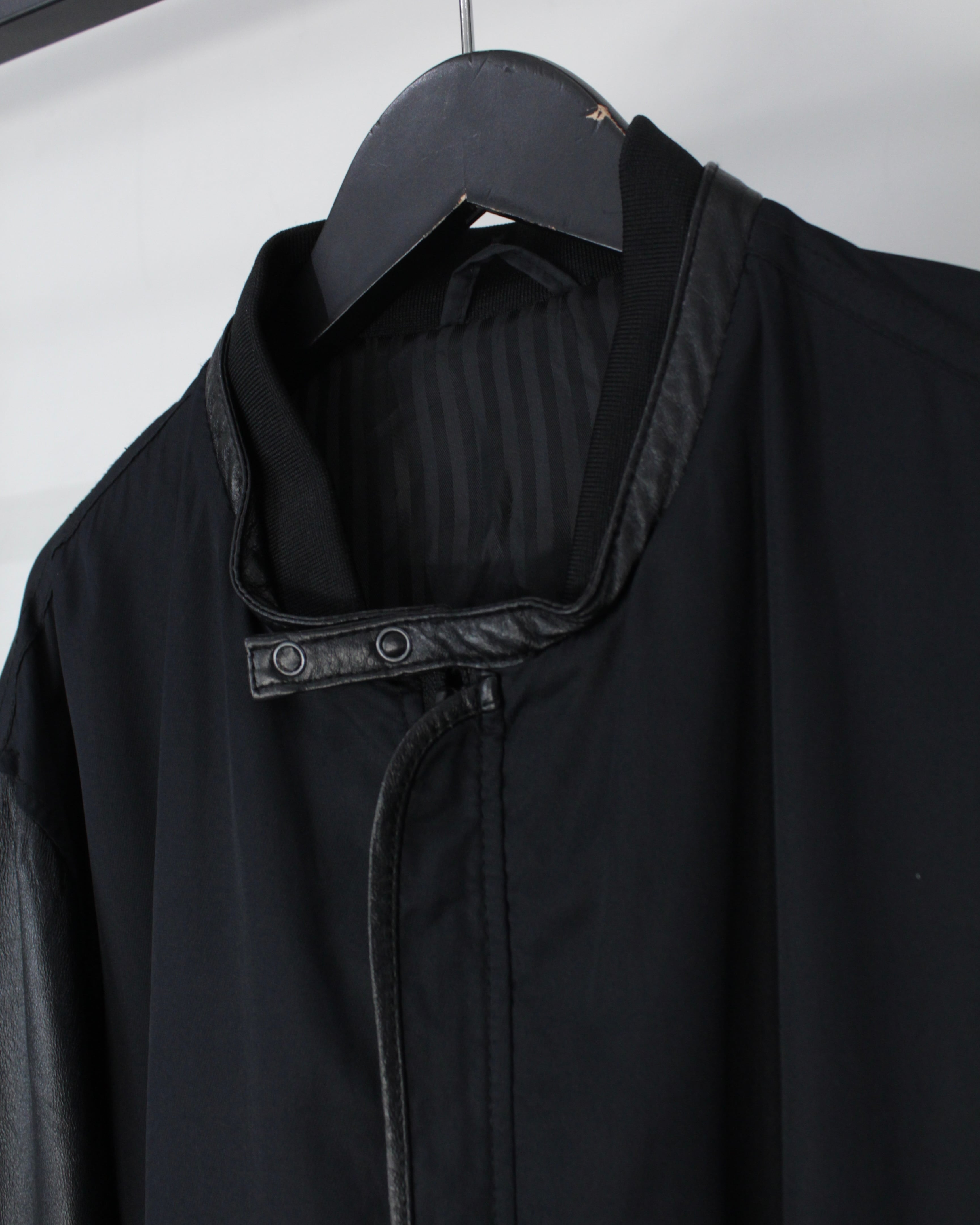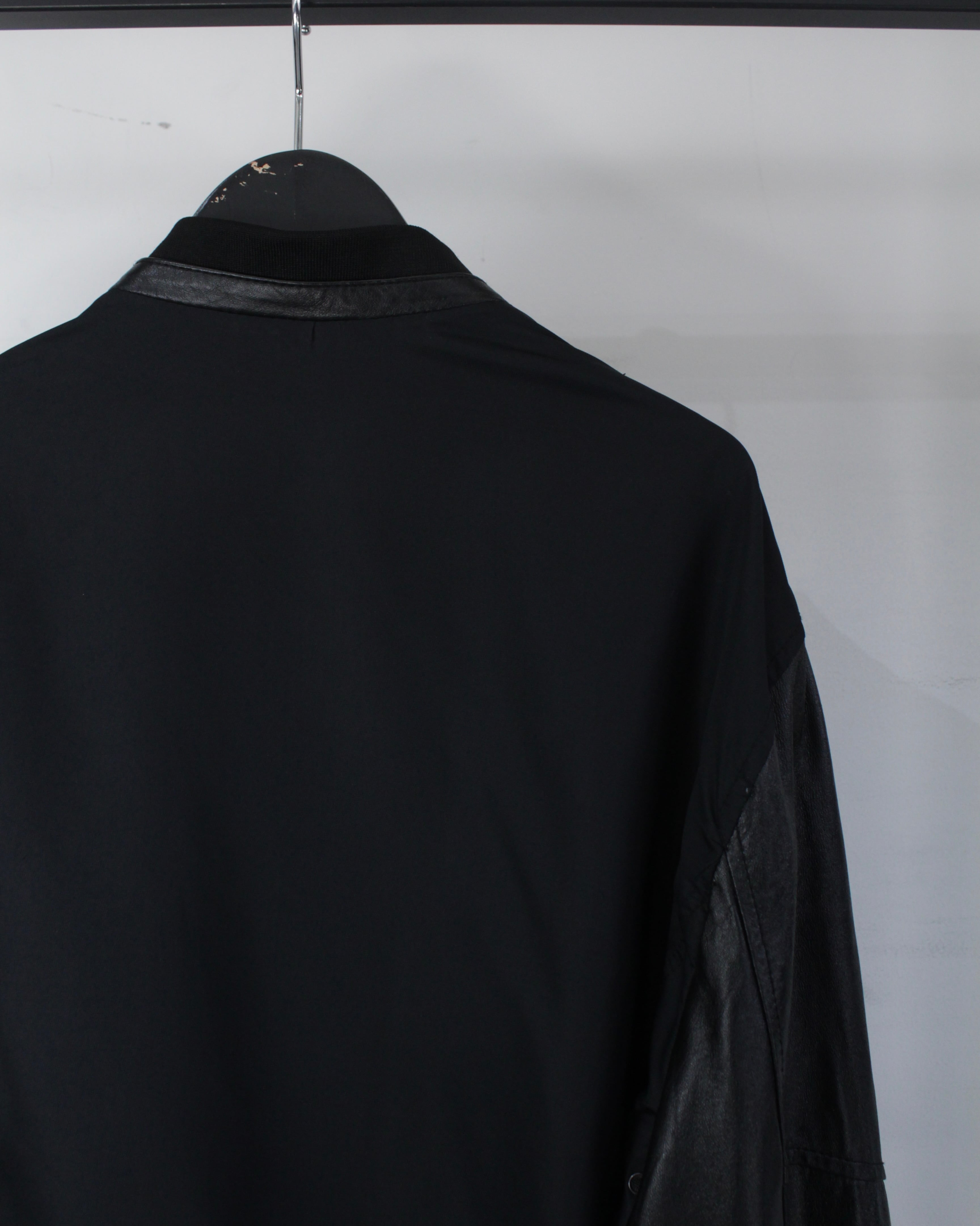 ボディには軽やかなファブリックをベースに、袖部分には滑らかなブラックレザーを切り替えたデザイン。マットな質感のボディとレザー特有の鈍い艶が美しい対比を生み出し、シンプルなブラックワントーンながら奥行きのある表情を演出しています。