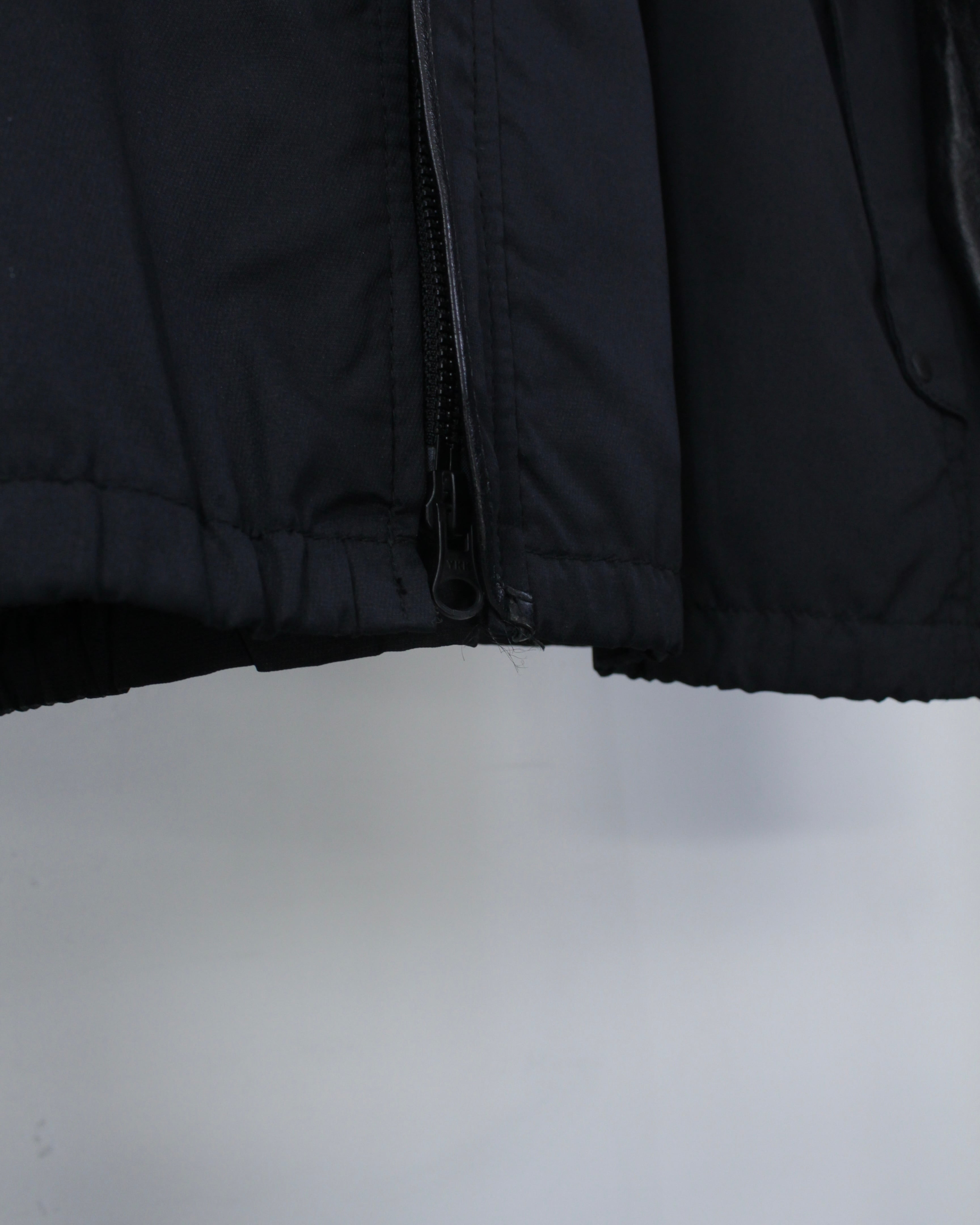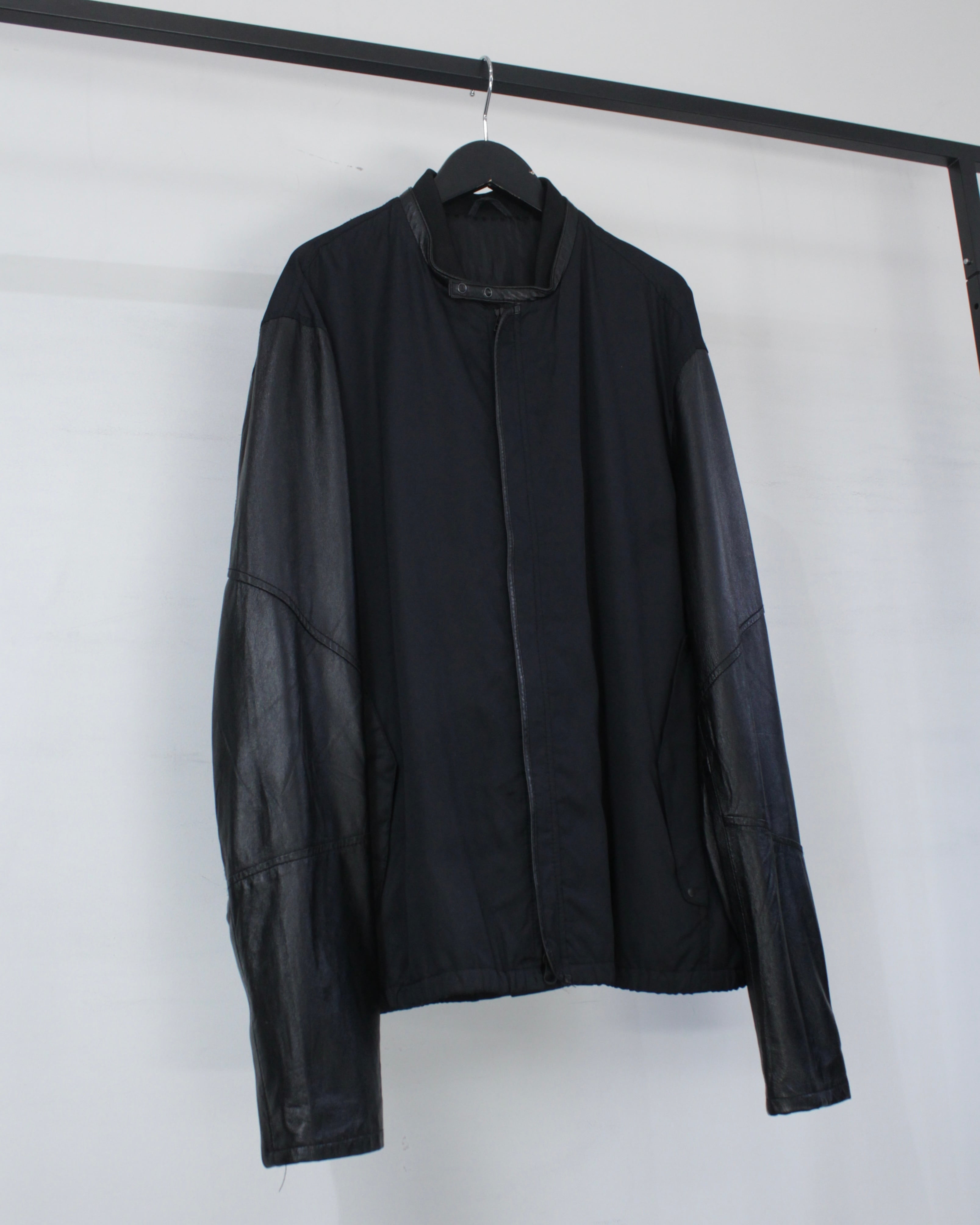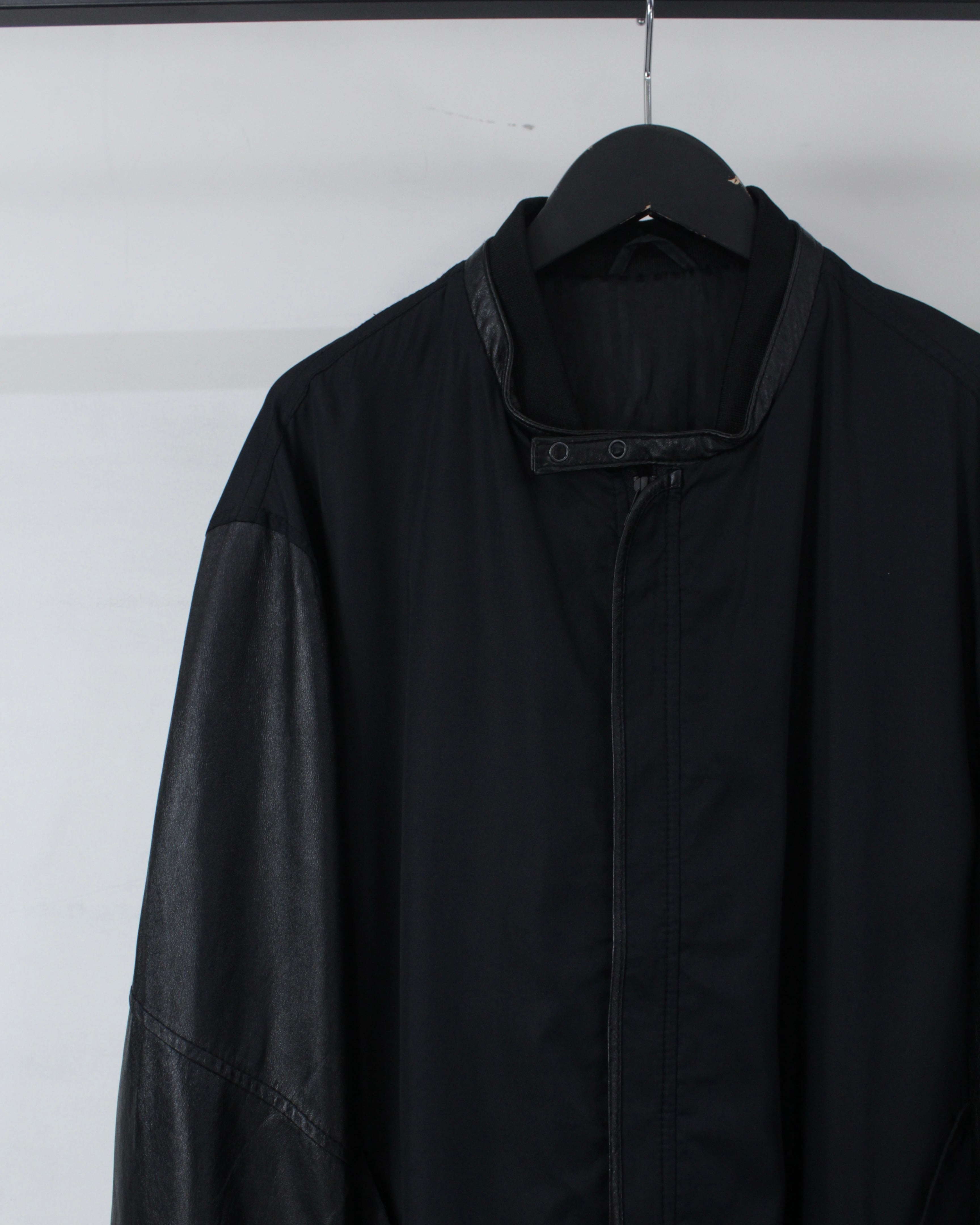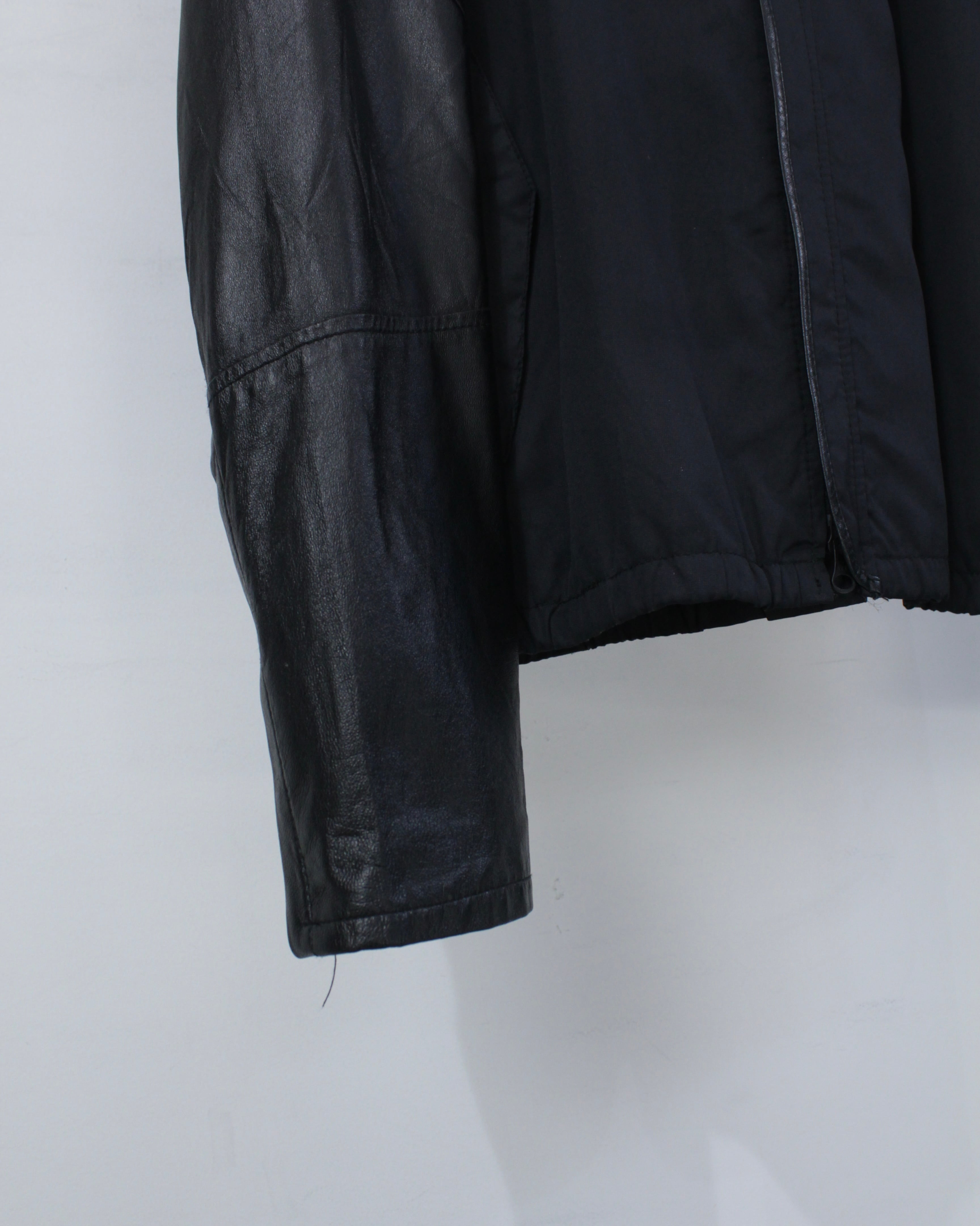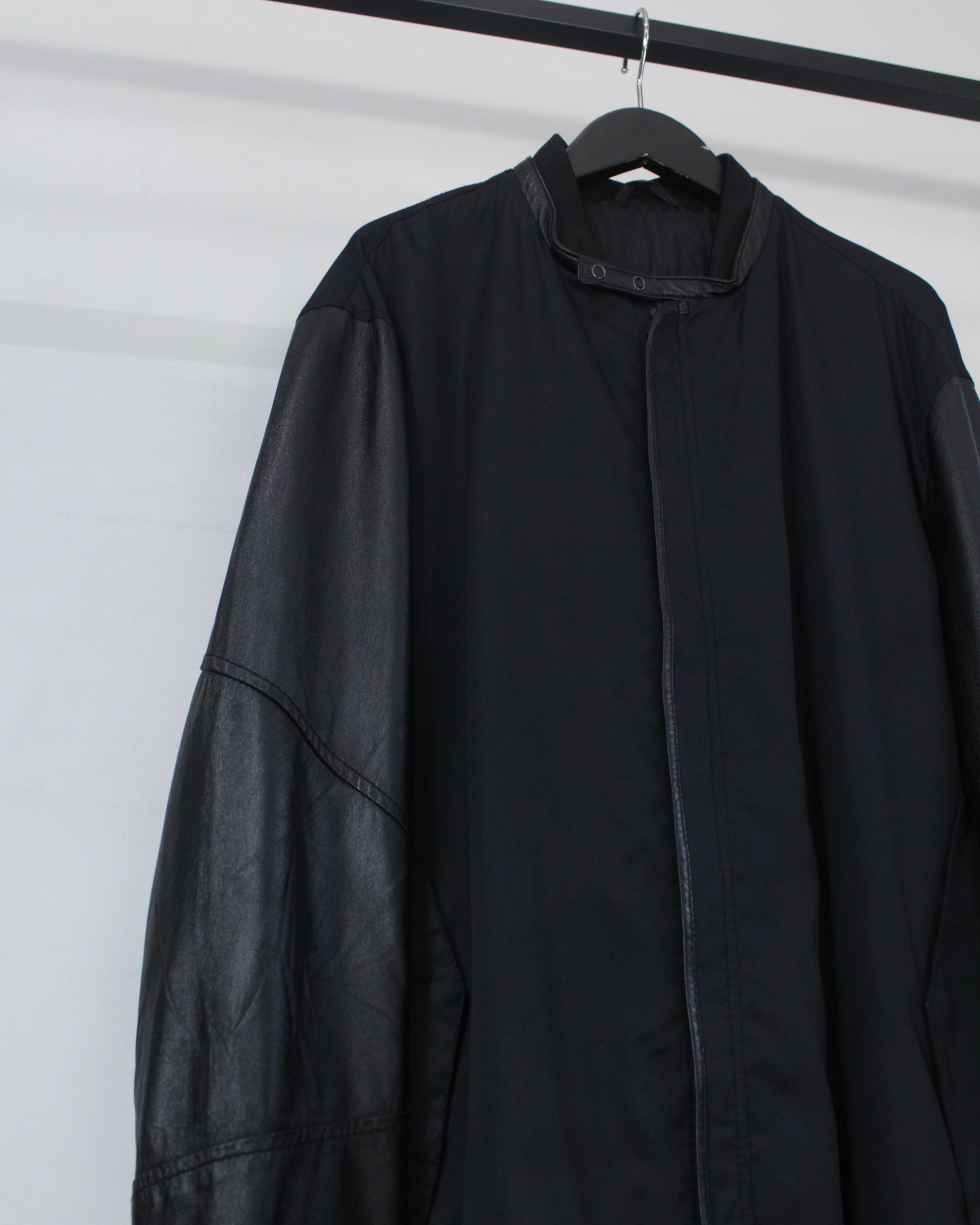 ボディには軽やかなファブリックをベースに、袖部分には滑らかなブラックレザーを切り替えたデザイン。マットな質感のボディとレザー特有の鈍い艶が美しい対比を生み出し、シンプルなブラックワントーンながら奥行きのある表情を演出しています。