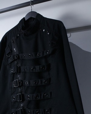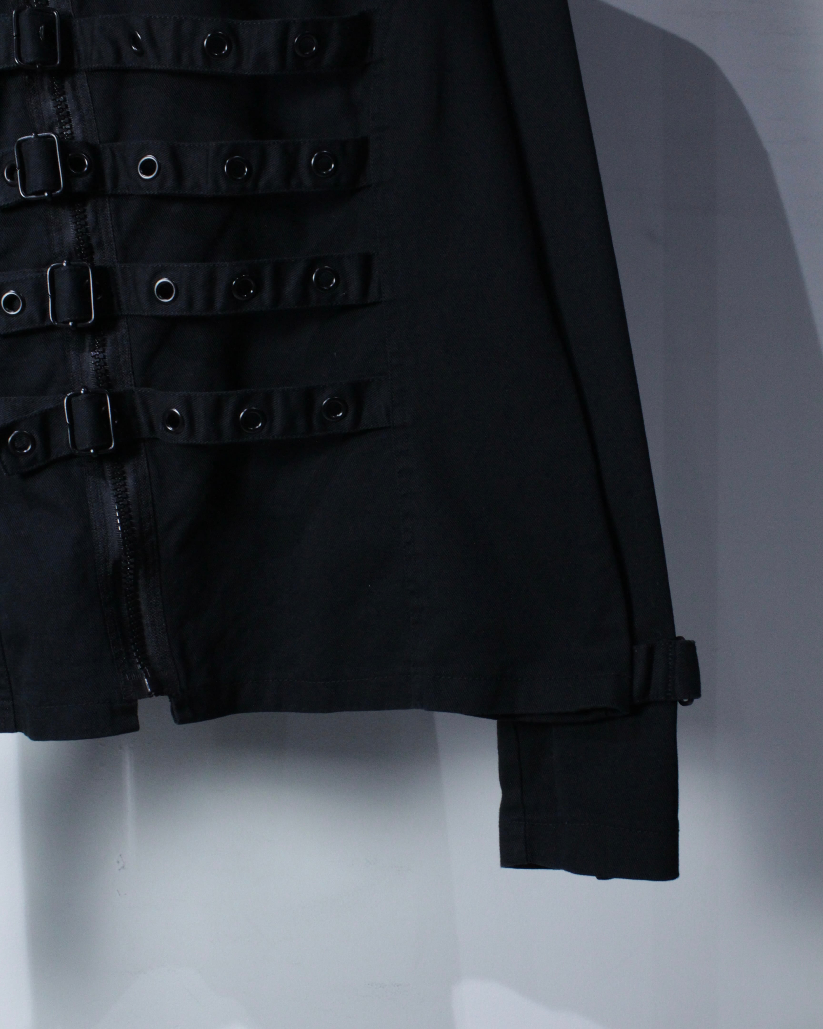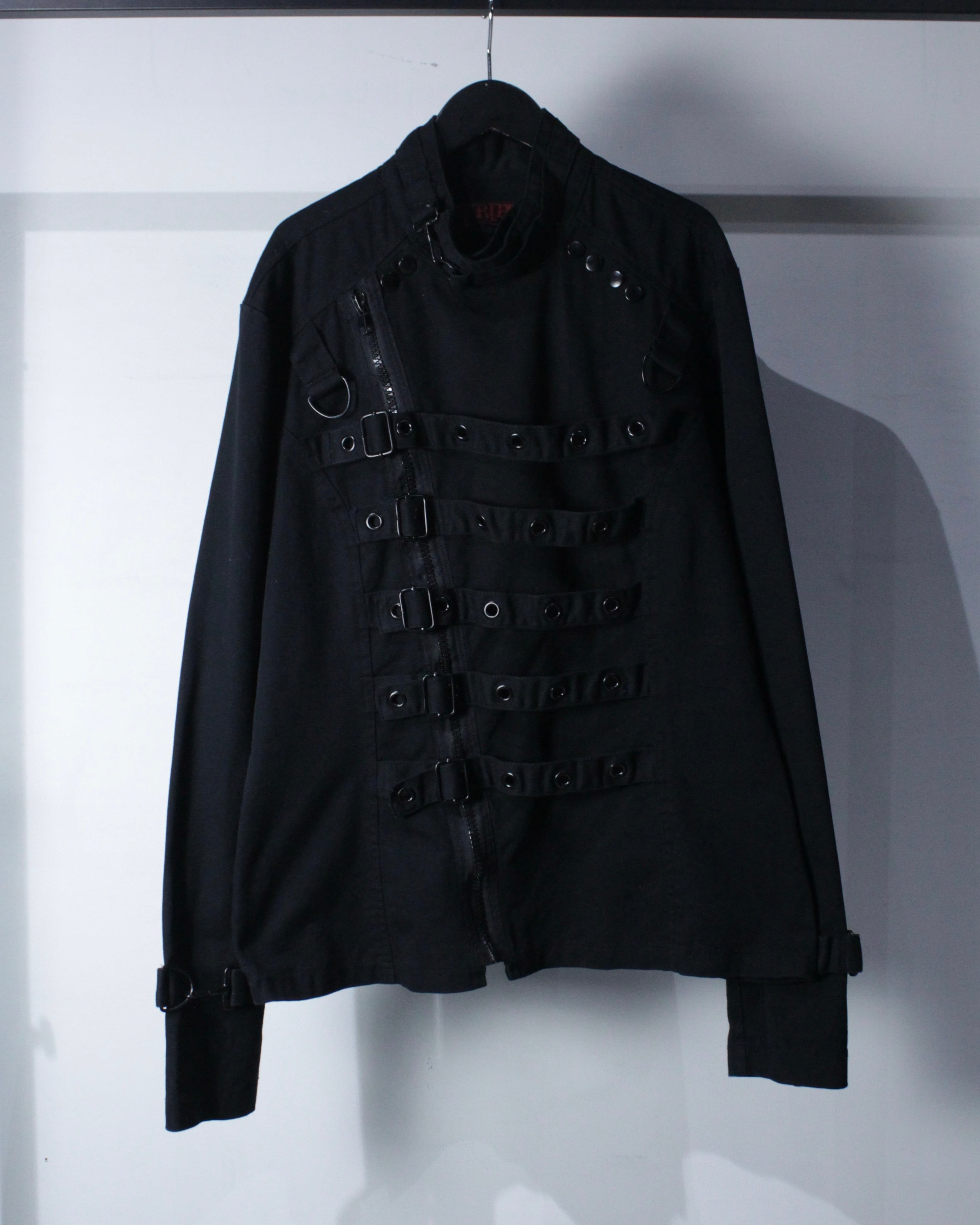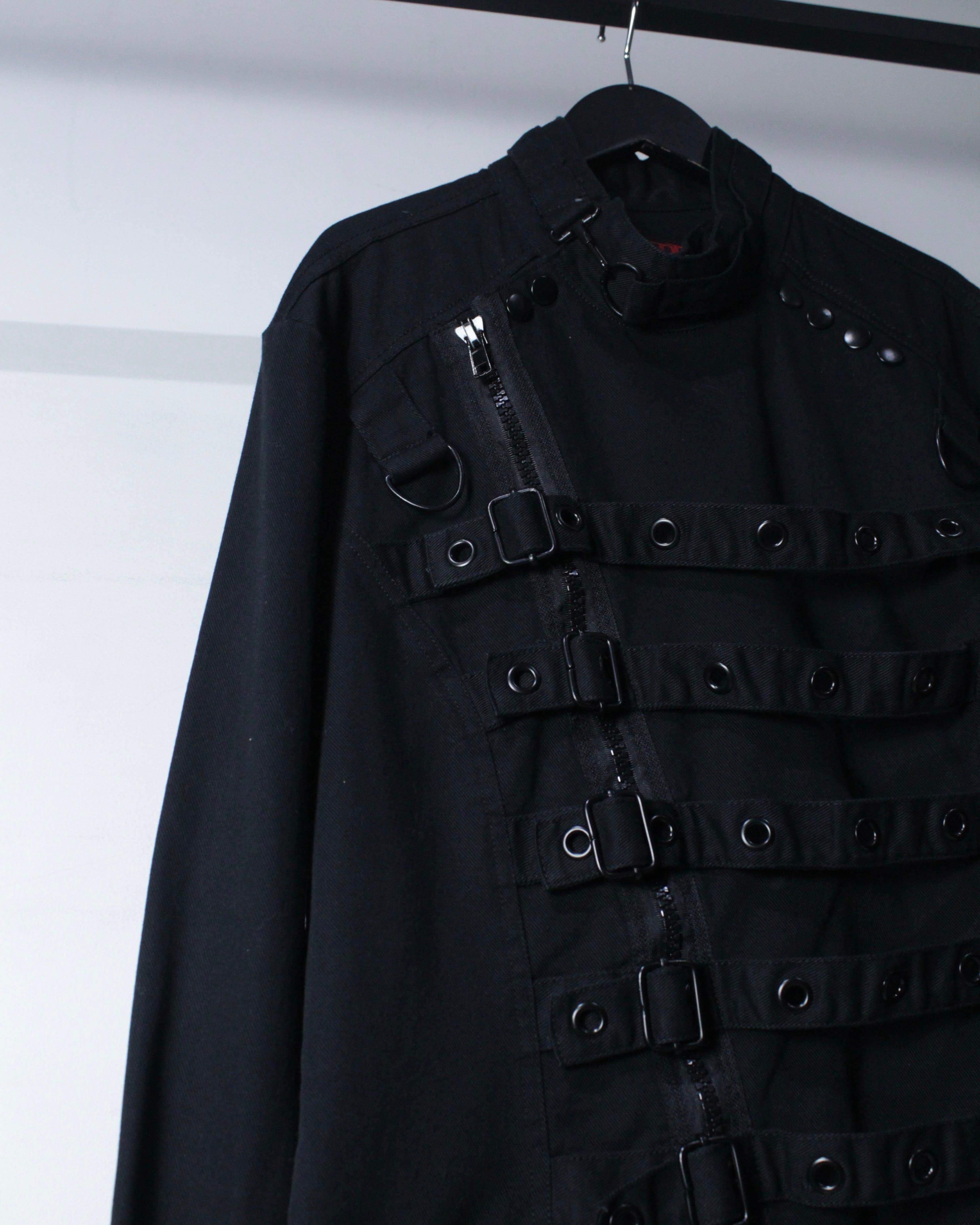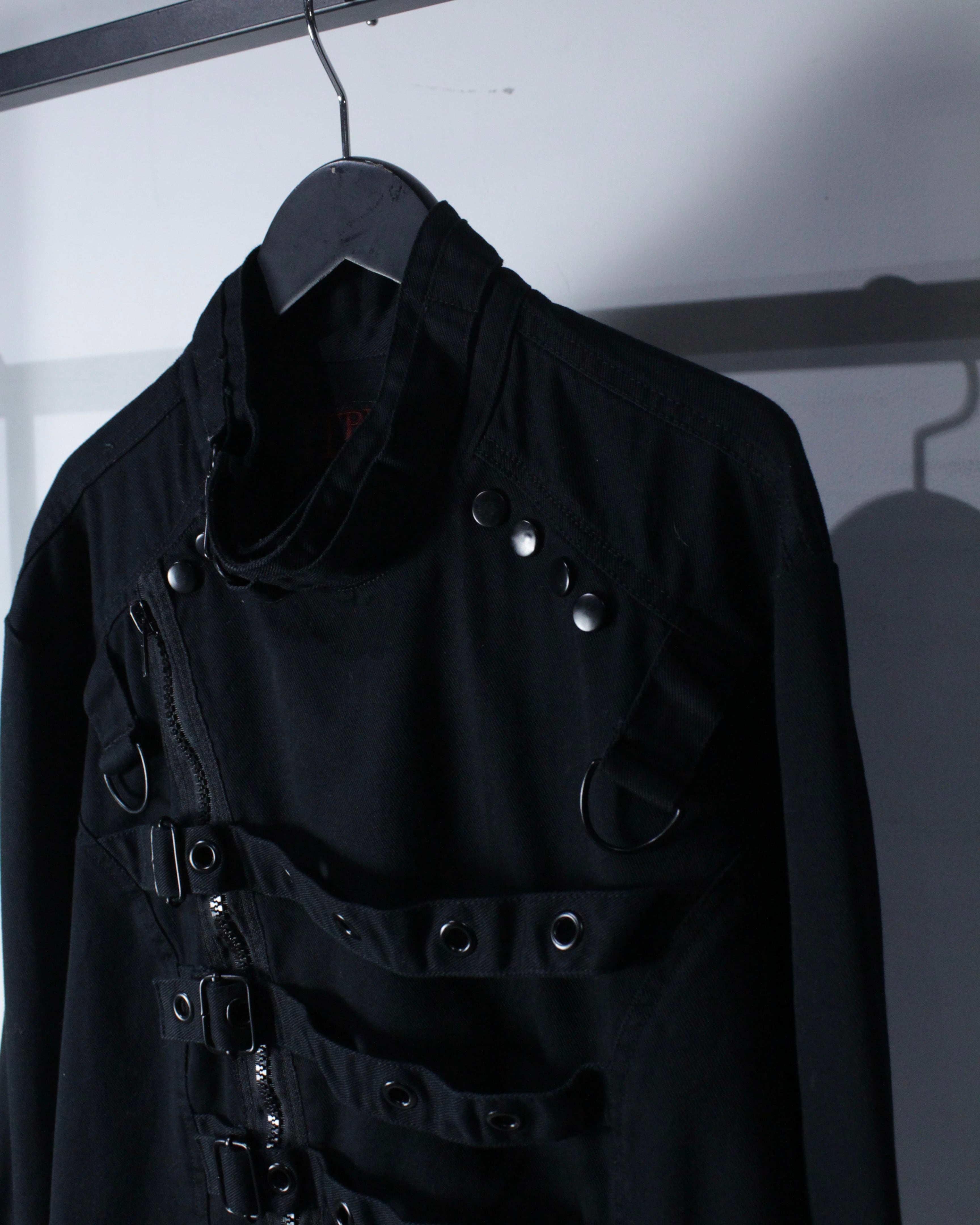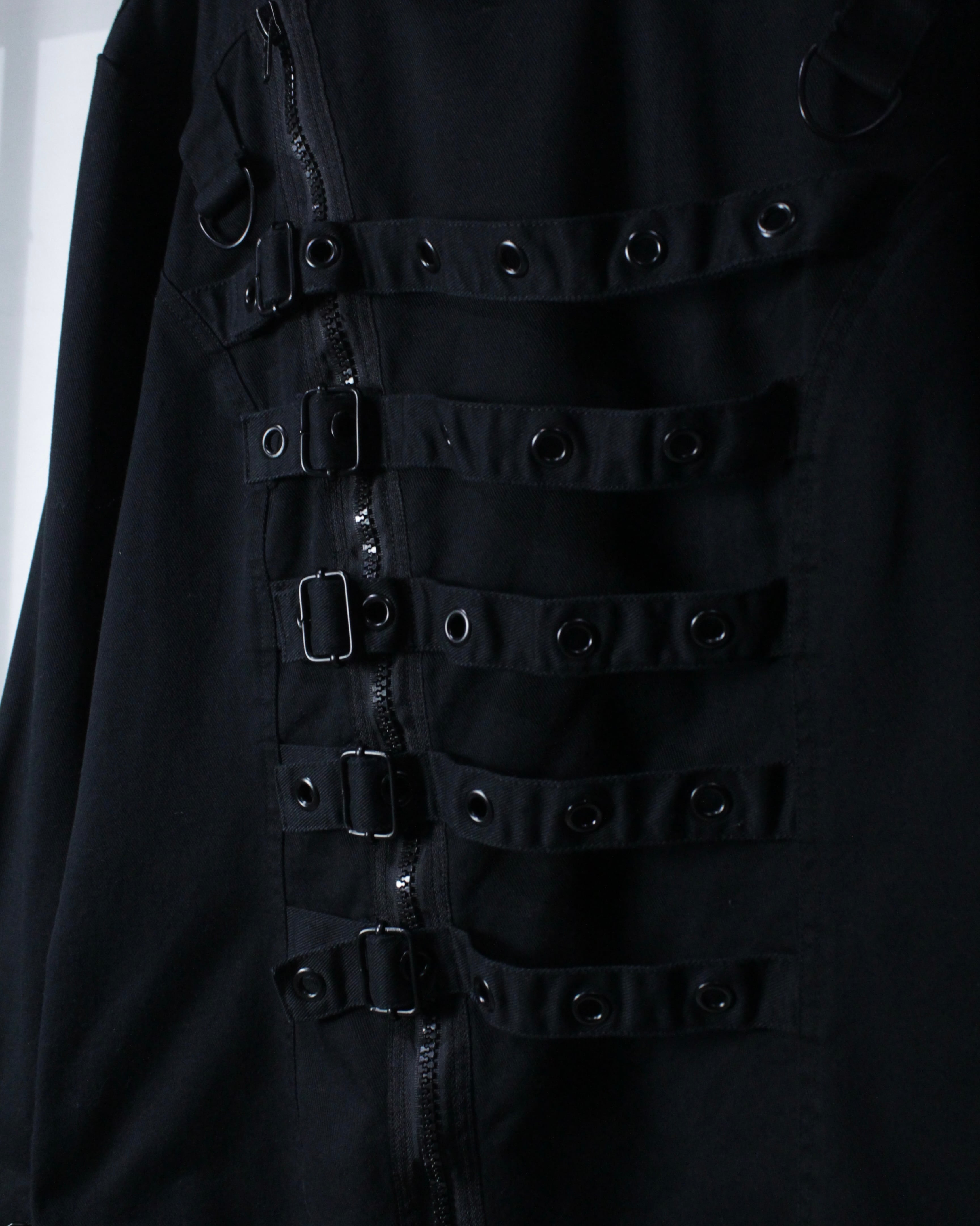 フロントは大胆に配置されたオフセットジップを軸に、複数のベルトストラップ、メタルバックル、ハトメ、DカンといったTRIPPらしいアイコニックなディテールを搭載。インパクトの強いデザインでありながら、全体をブラックで統一することでモードな雰囲気を漂わせています。