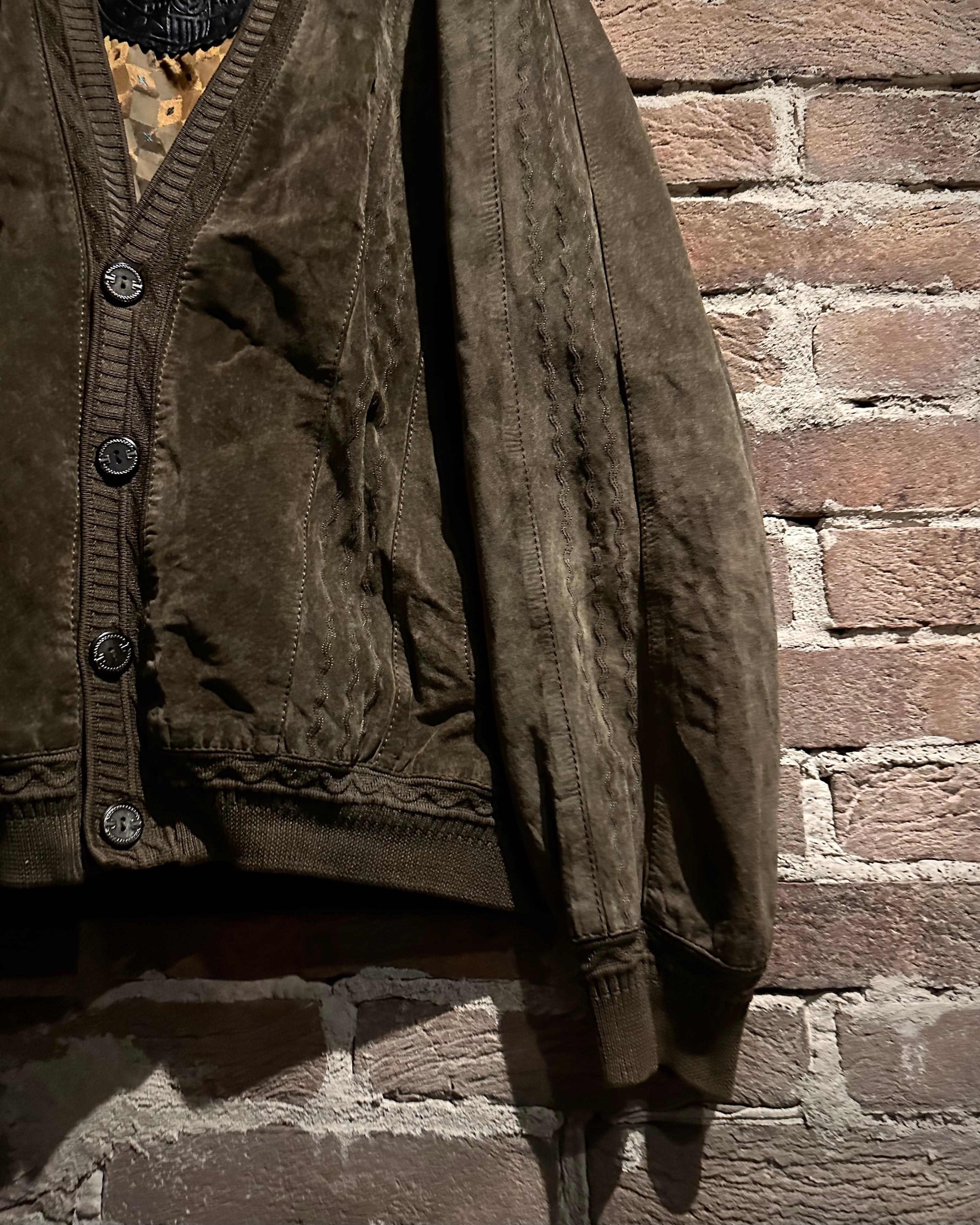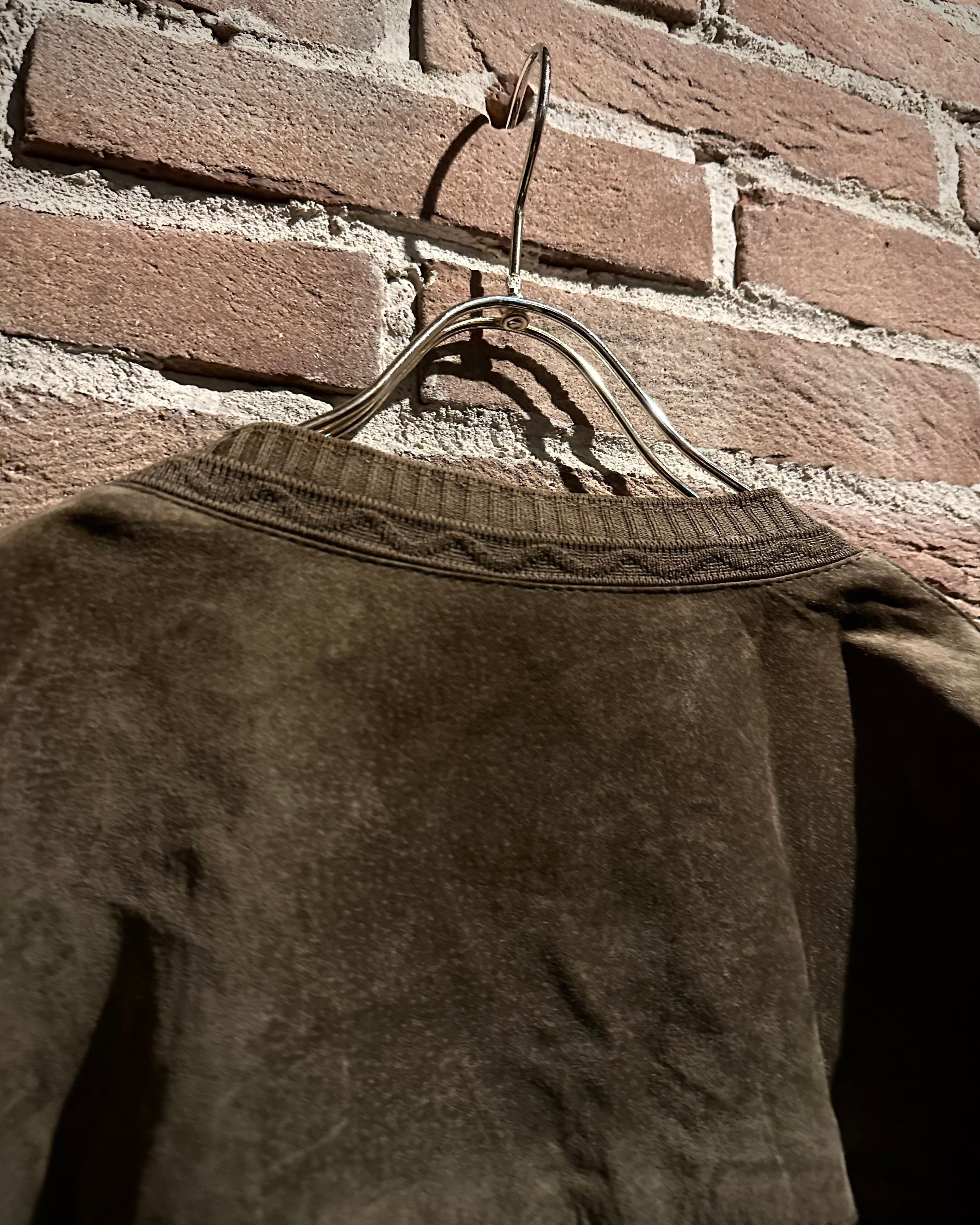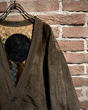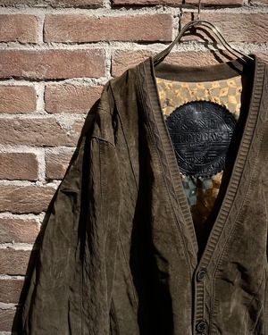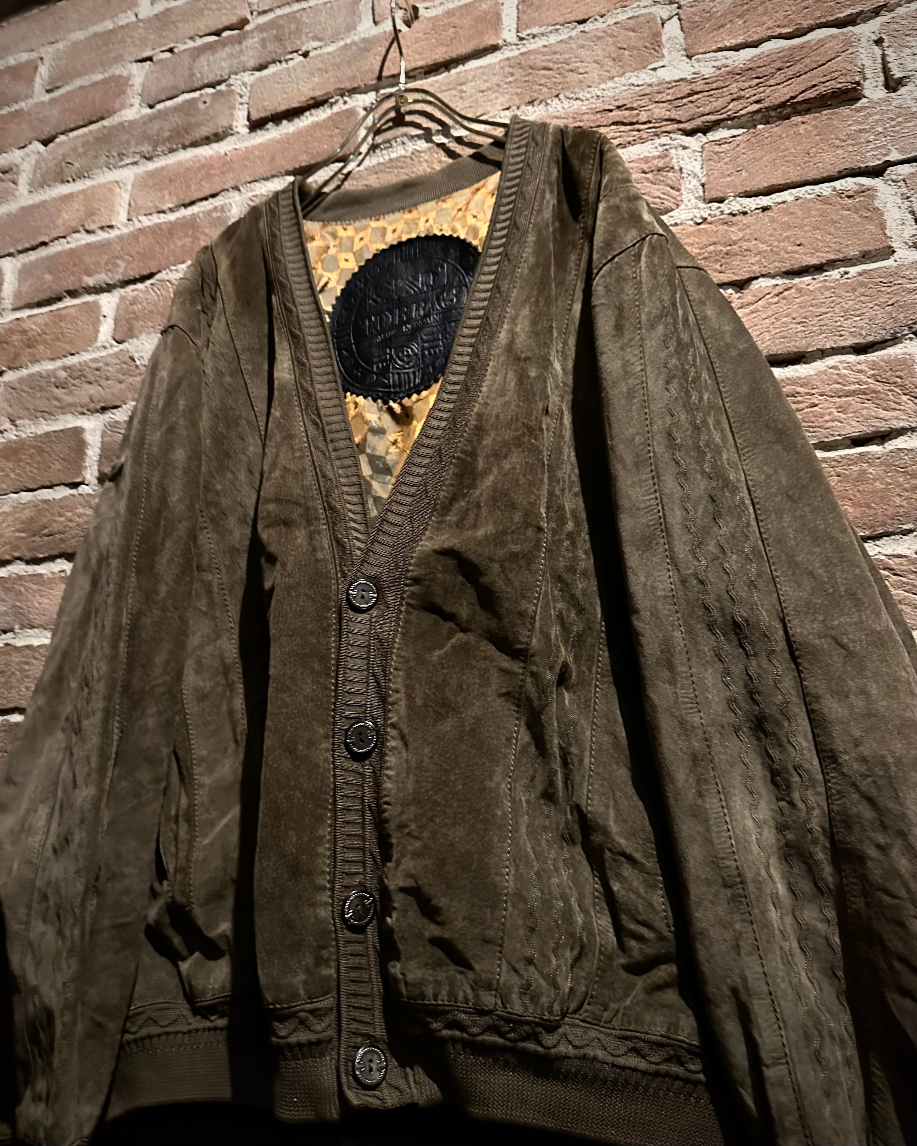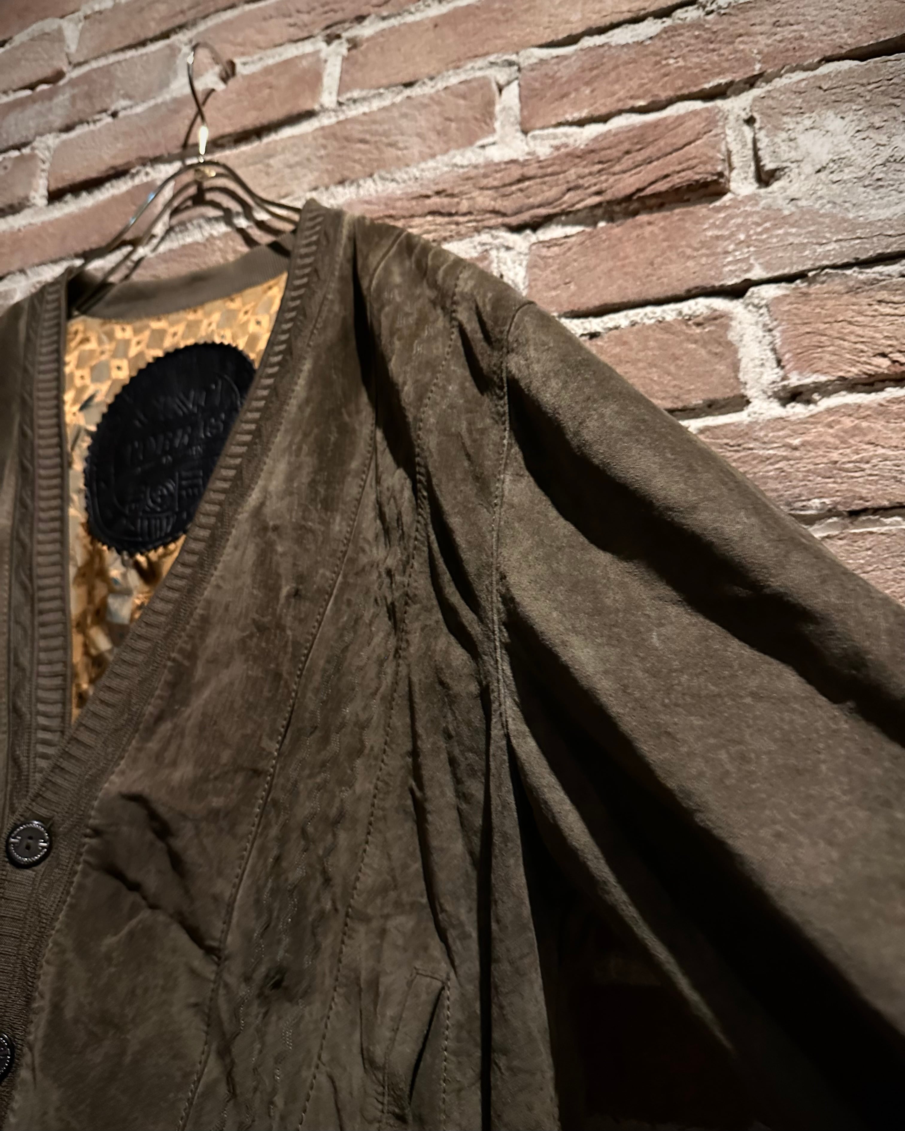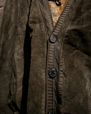 こちらはスエードレザーを贅沢に使用したカーディガン型ジャケット。しっとりとした起毛感を持つスエードが醸し出すマットな質感と、深みのあるブラウンカラーが相まって、落ち着きのあるラグジュアリーな雰囲気を纏った1着に仕上がっています。