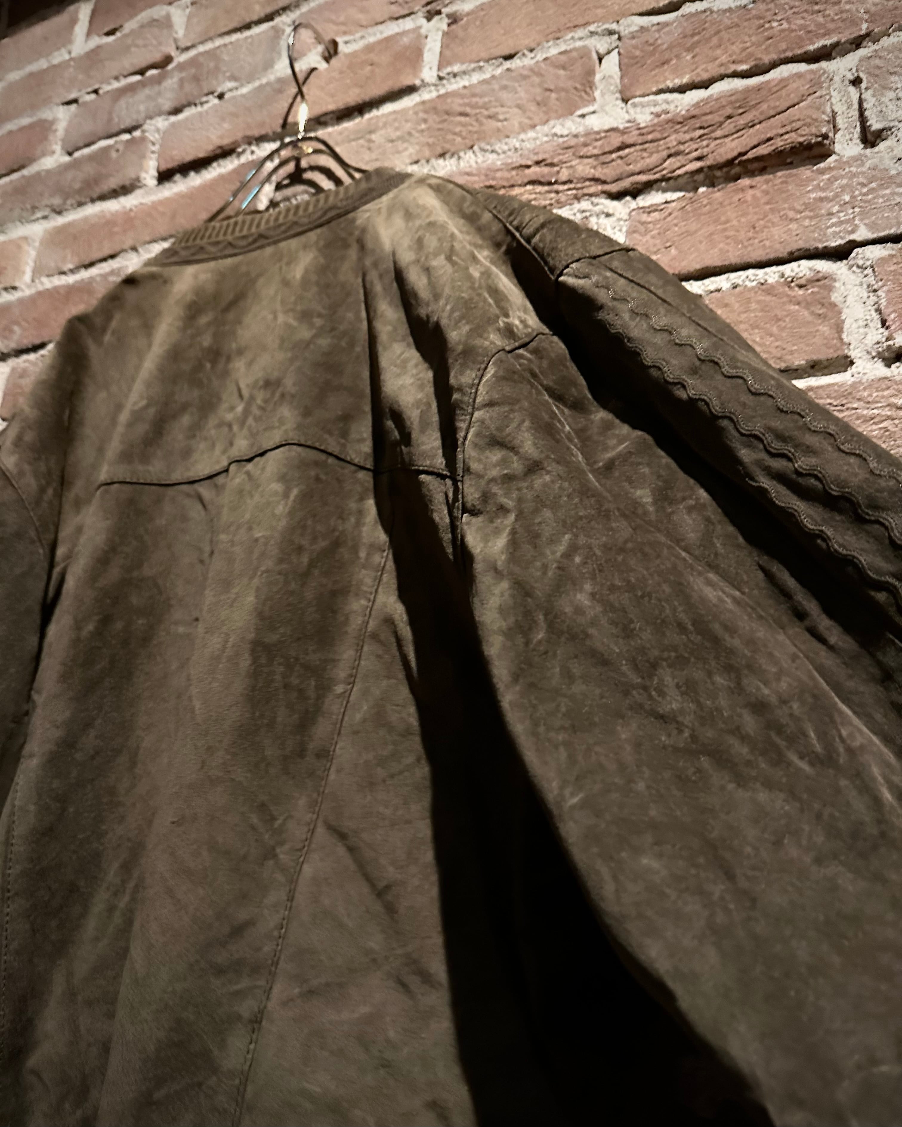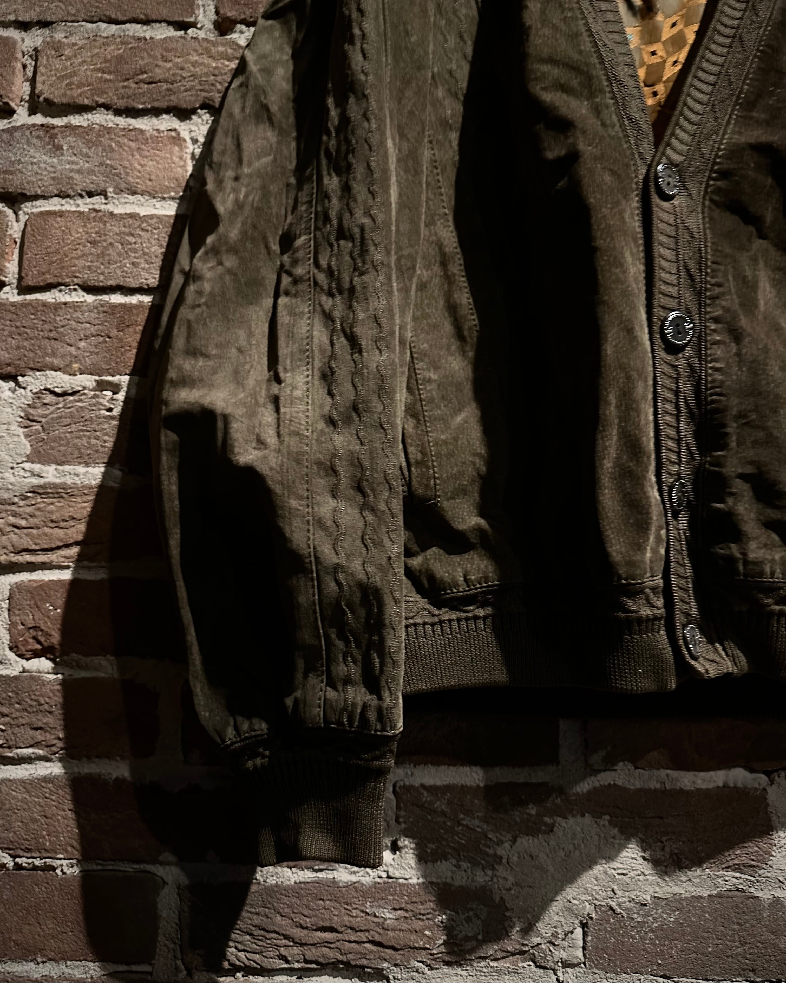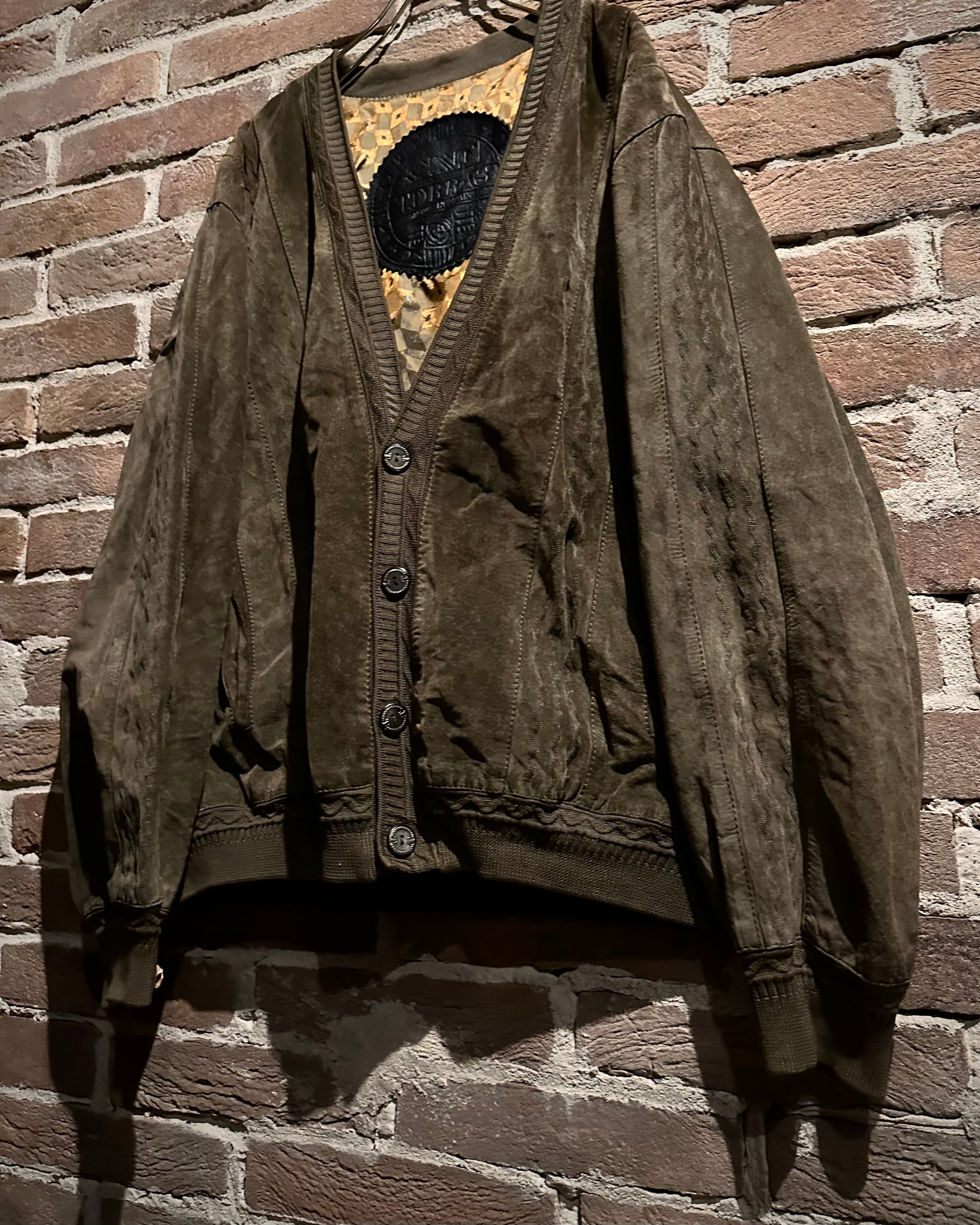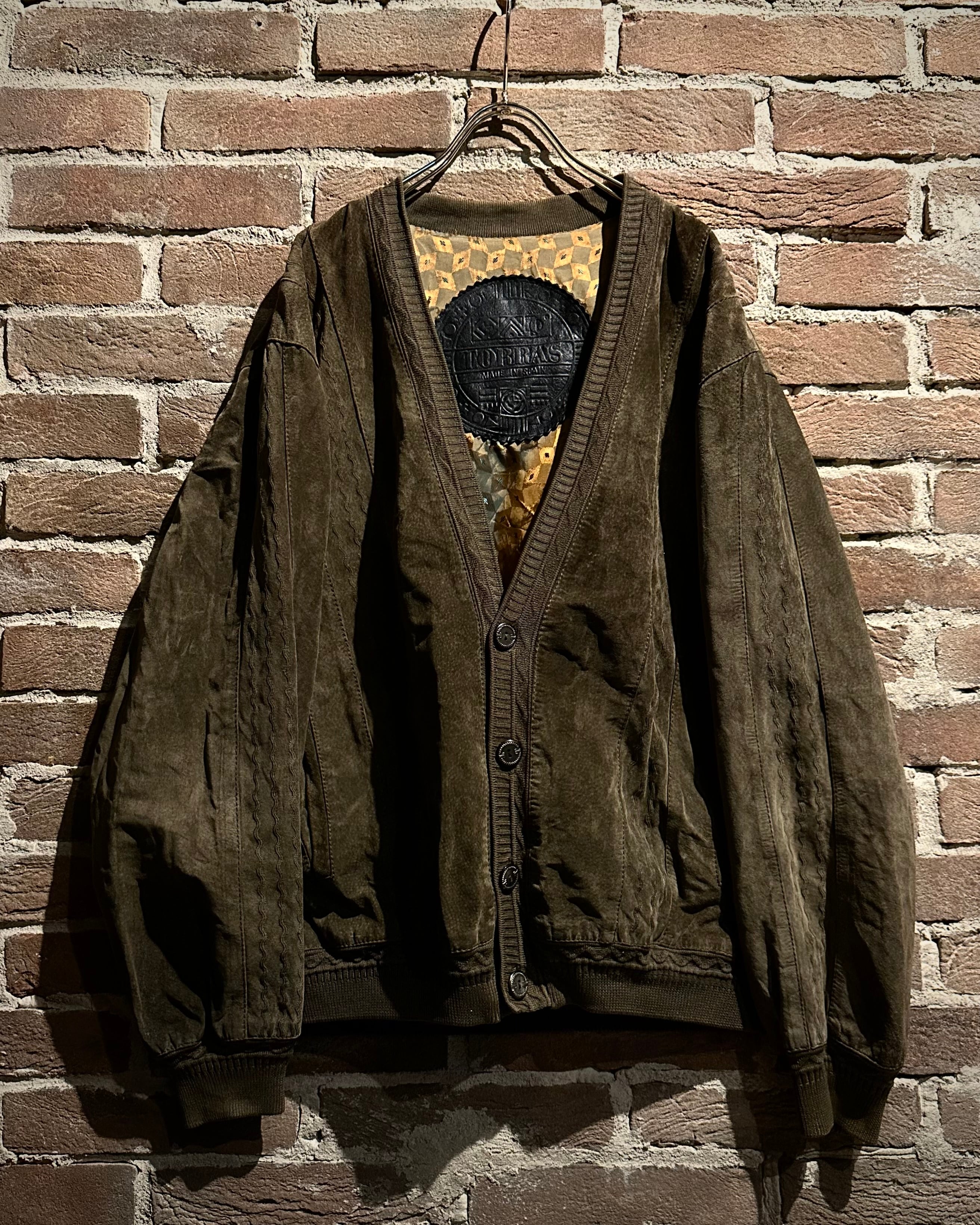 こちらはスエードレザーを贅沢に使用したカーディガン型ジャケット。しっとりとした起毛感を持つスエードが醸し出すマットな質感と、深みのあるブラウンカラーが相まって、落ち着きのあるラグジュアリーな雰囲気を纏った1着に仕上がっています。