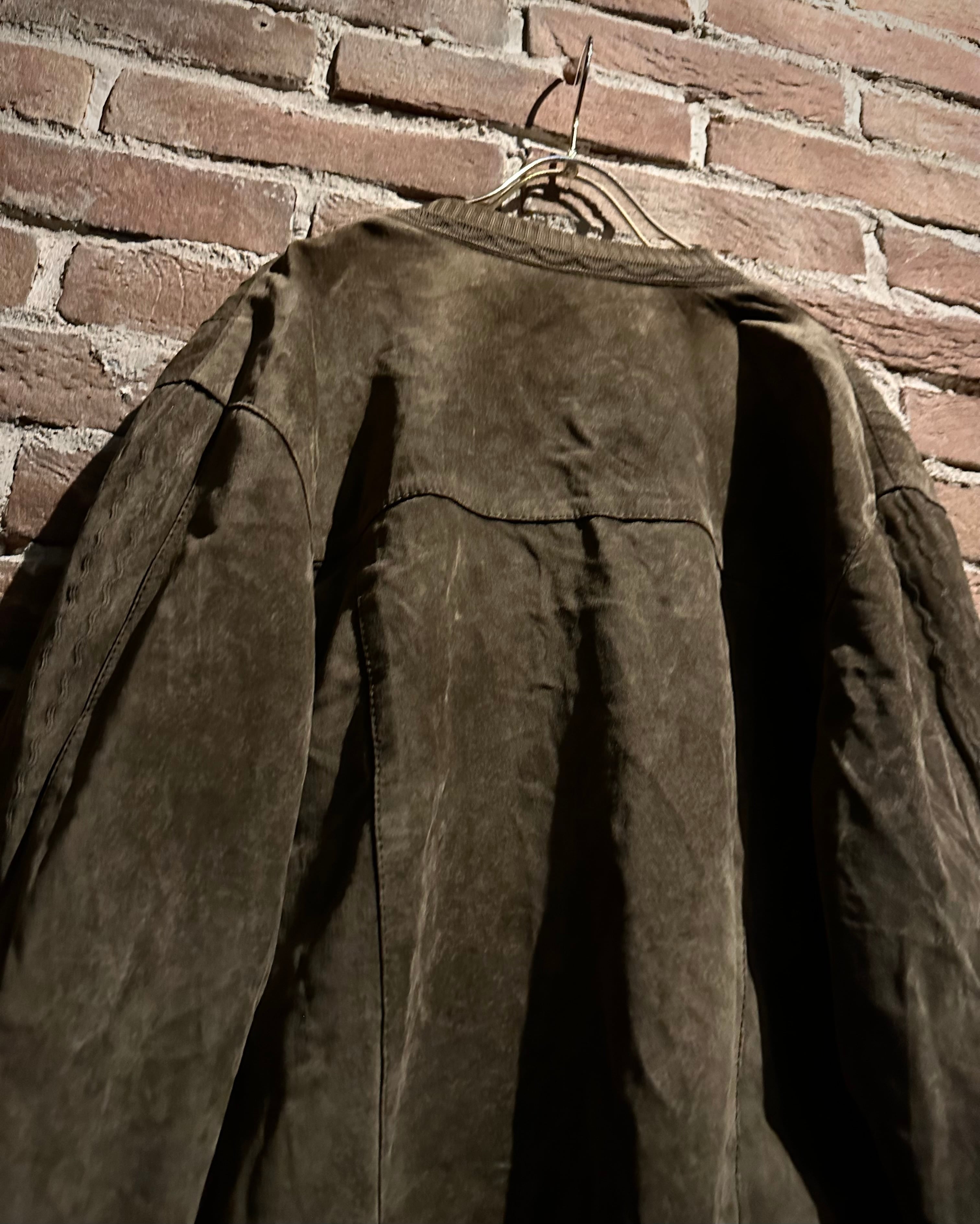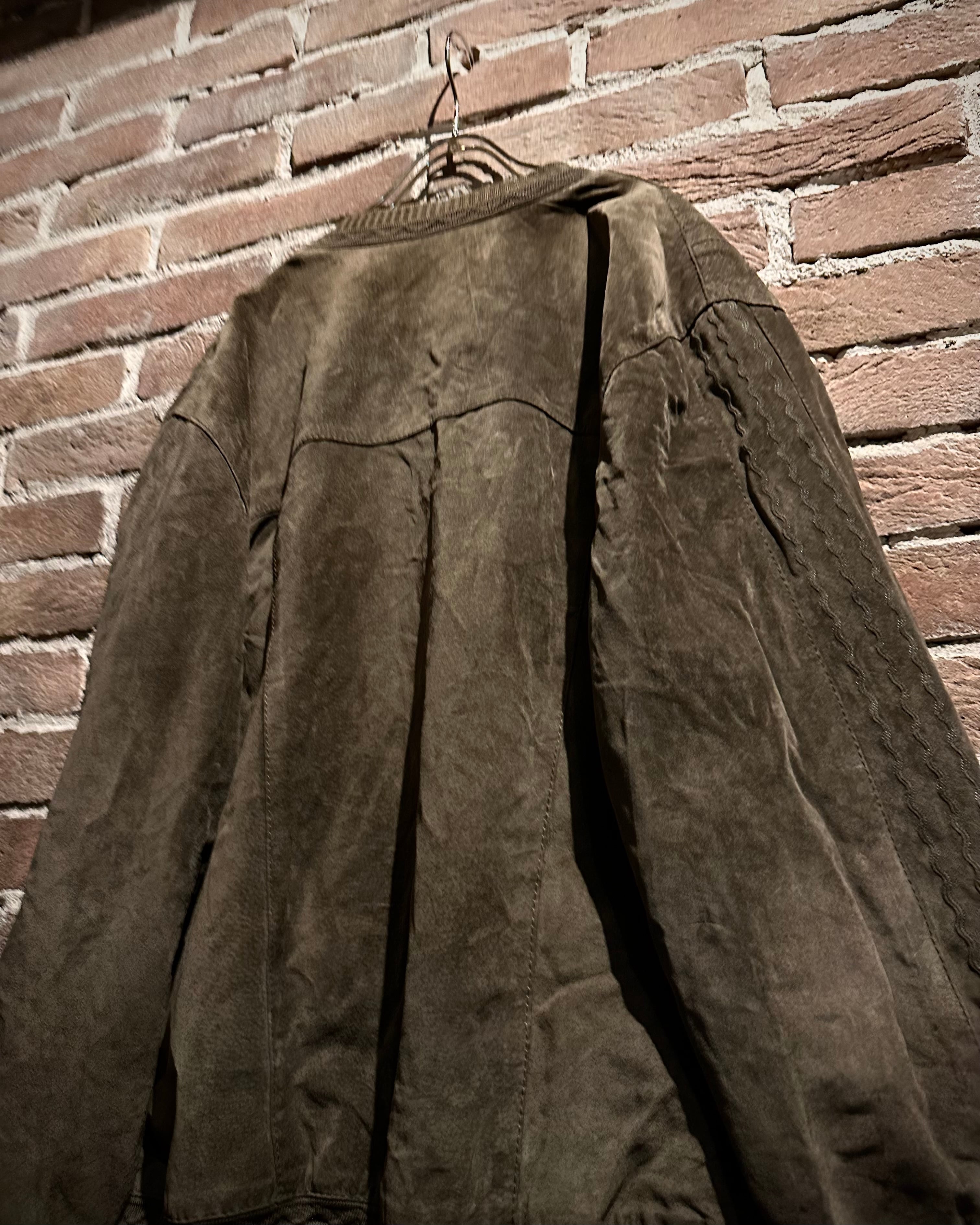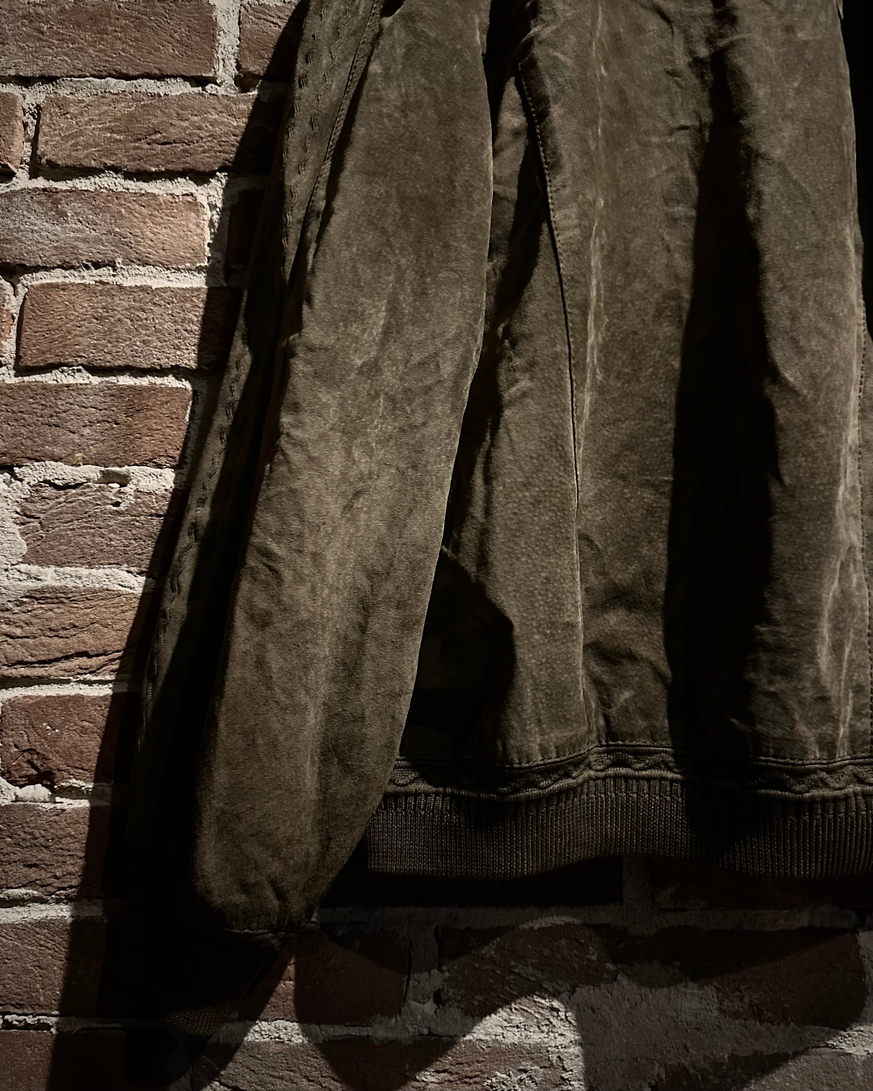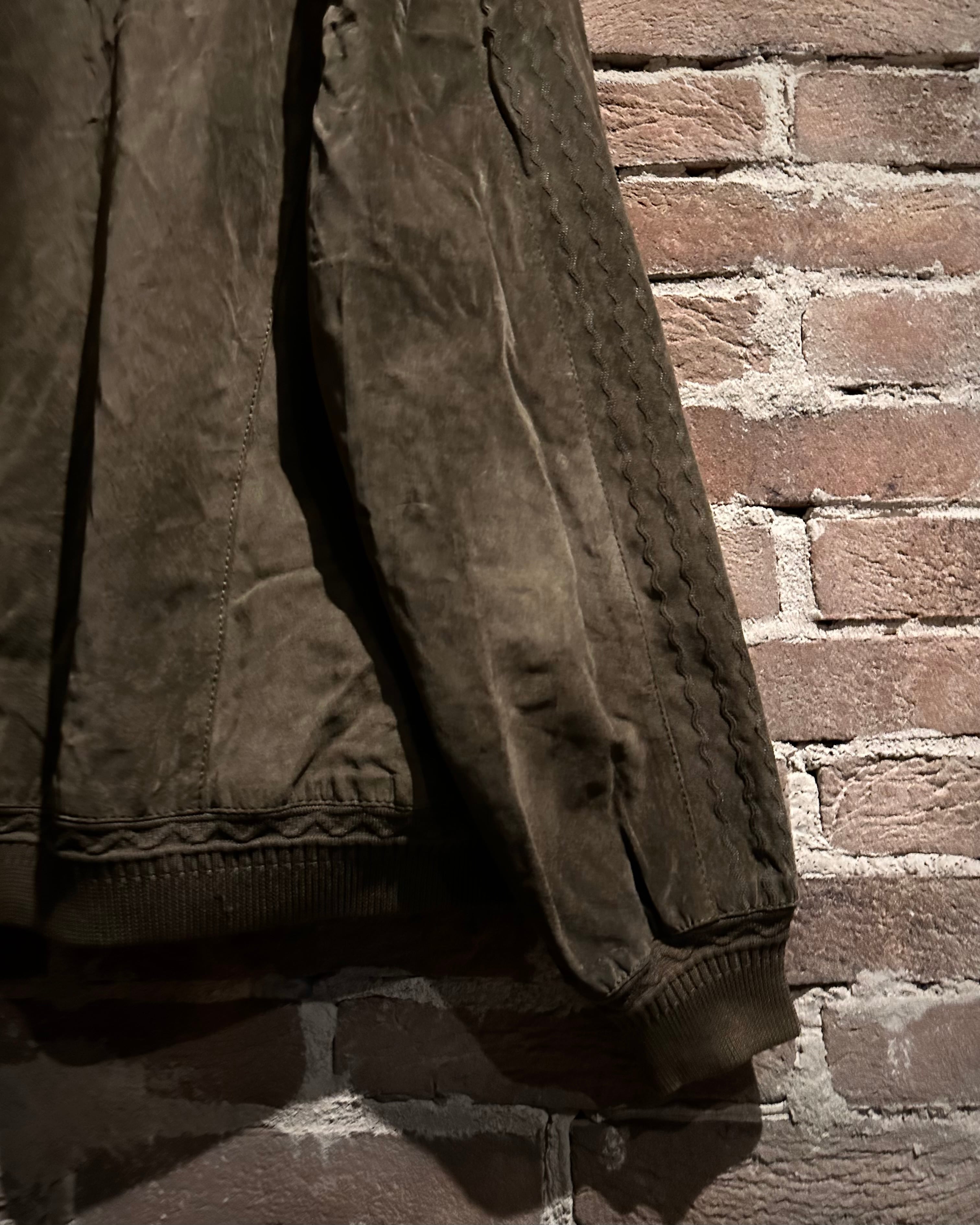 こちらはスエードレザーを贅沢に使用したカーディガン型ジャケット。しっとりとした起毛感を持つスエードが醸し出すマットな質感と、深みのあるブラウンカラーが相まって、落ち着きのあるラグジュアリーな雰囲気を纏った1着に仕上がっています。