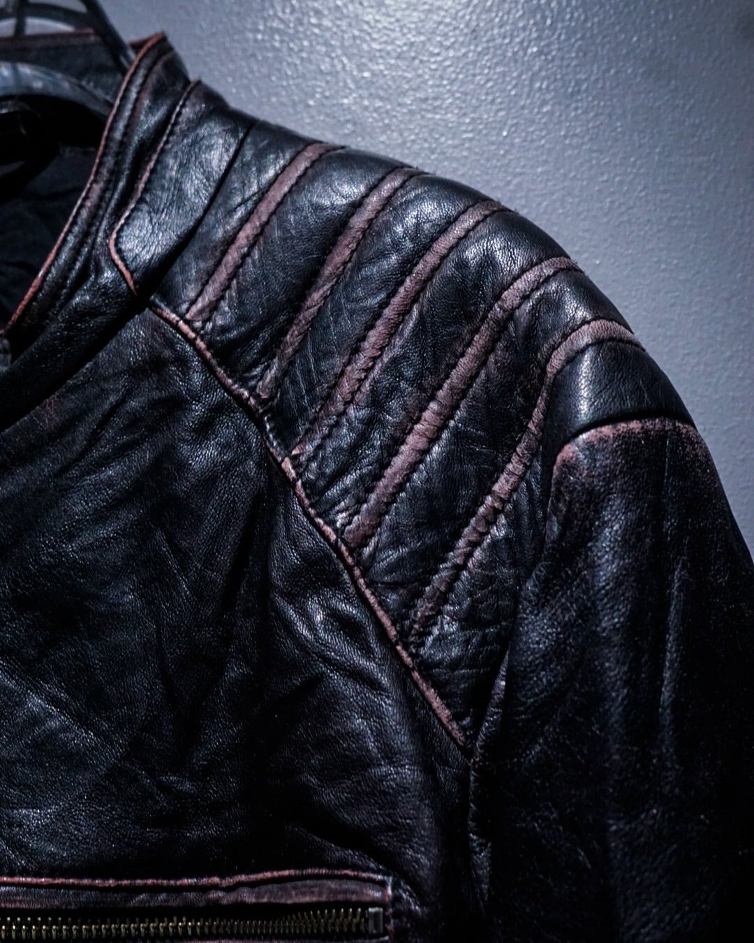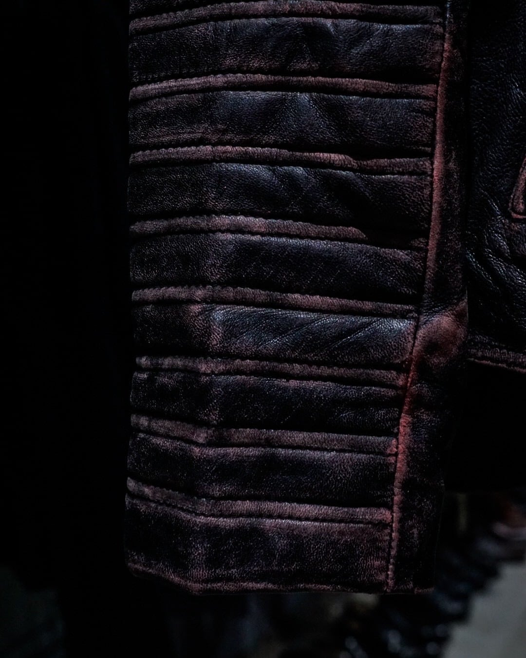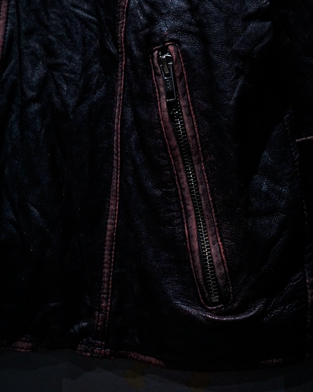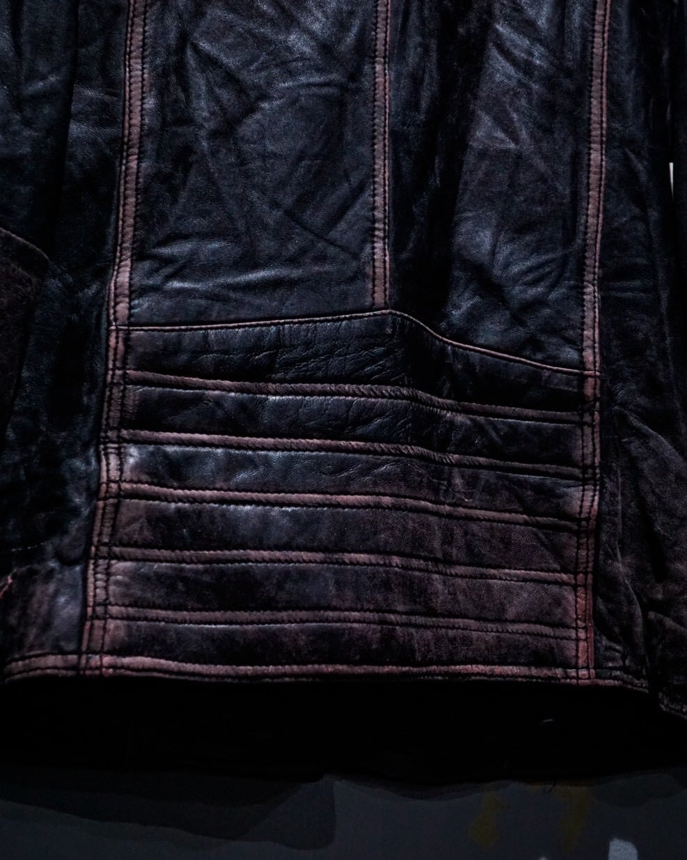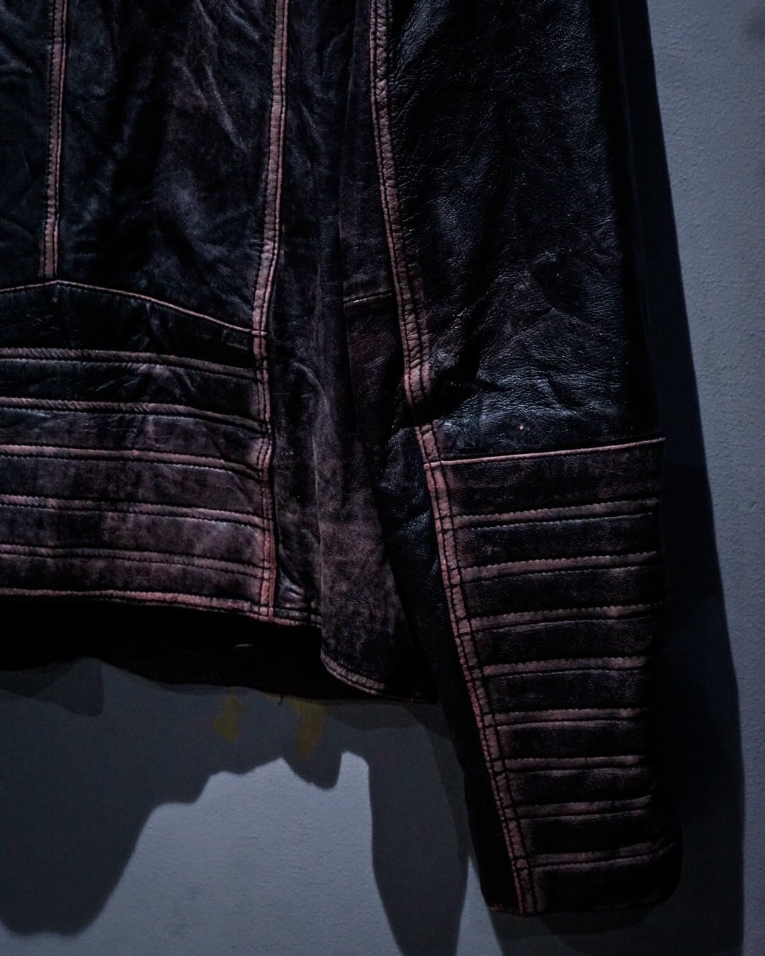 芯地にピンクカラーを仕込みその上から黒を塗装した特殊な仕上げとなっており、着用や経年によって表面のブラックが擦れ、下地のピンクが浮かび上がる独特のエイジングが楽しめる1着。